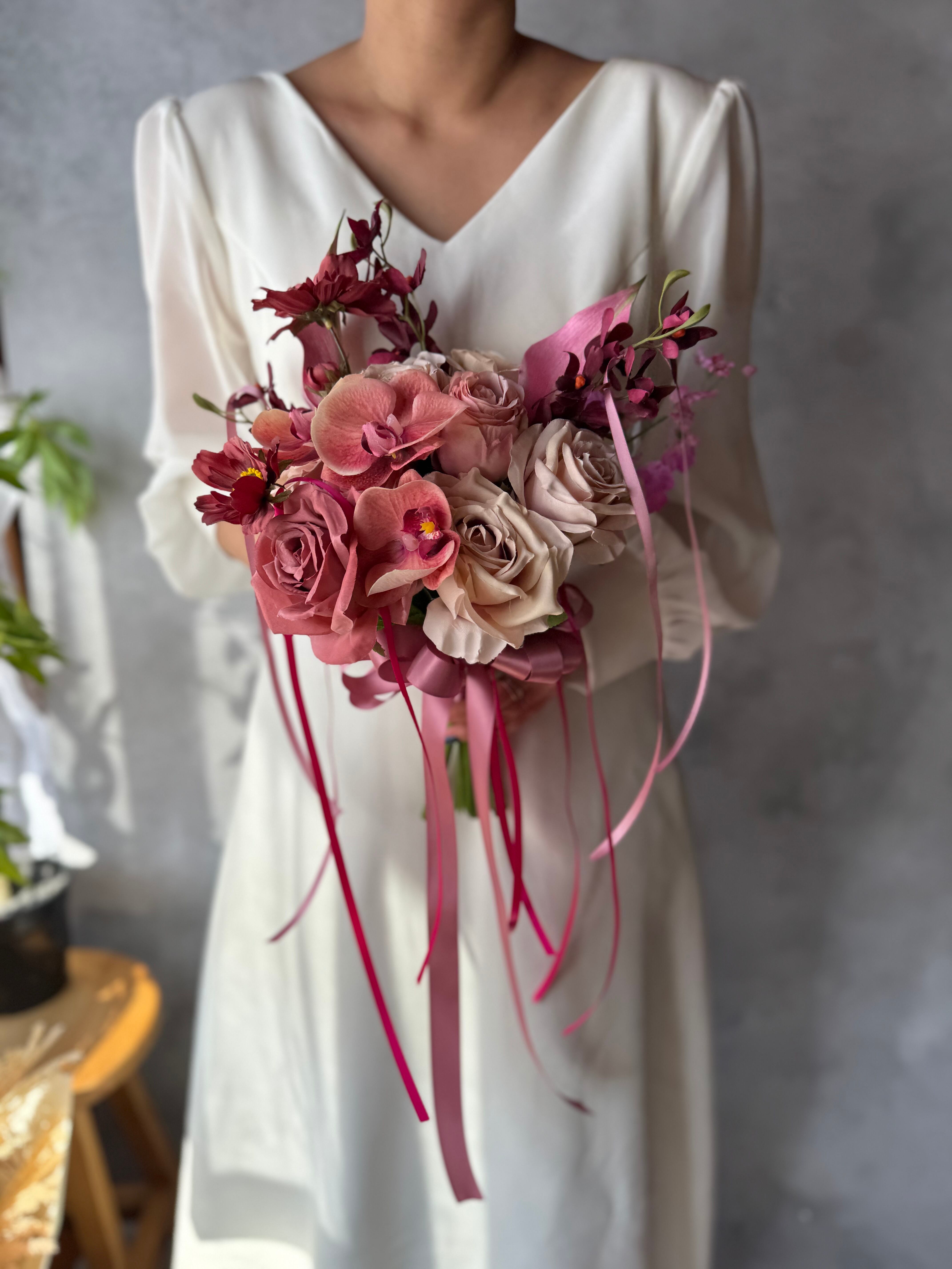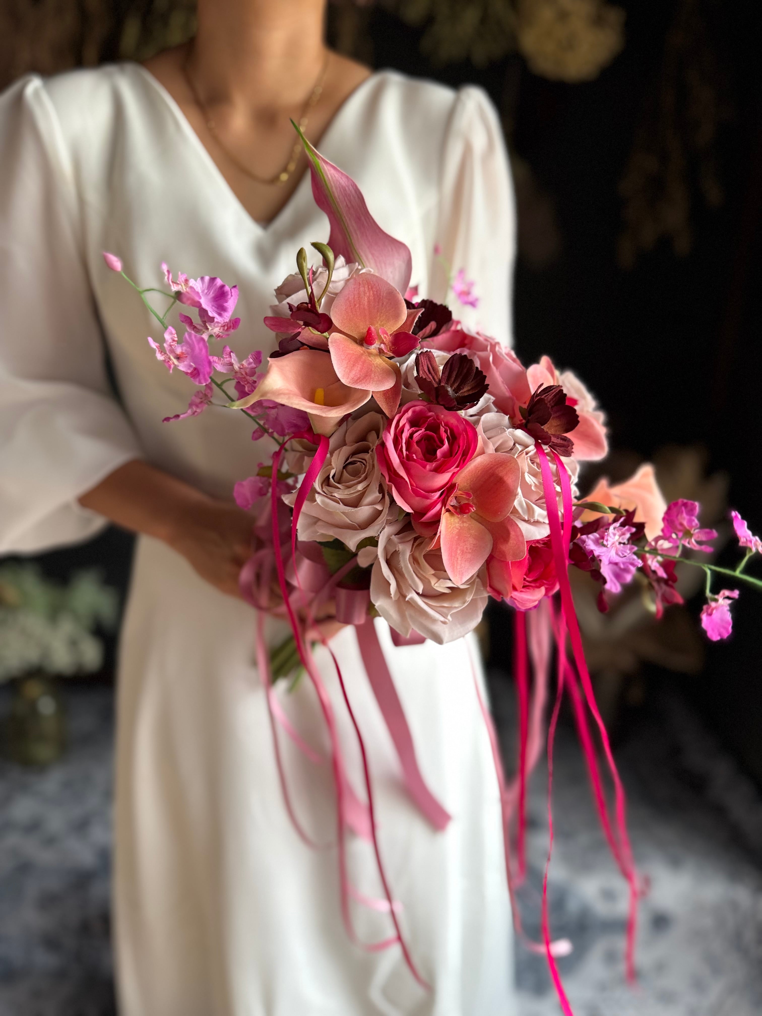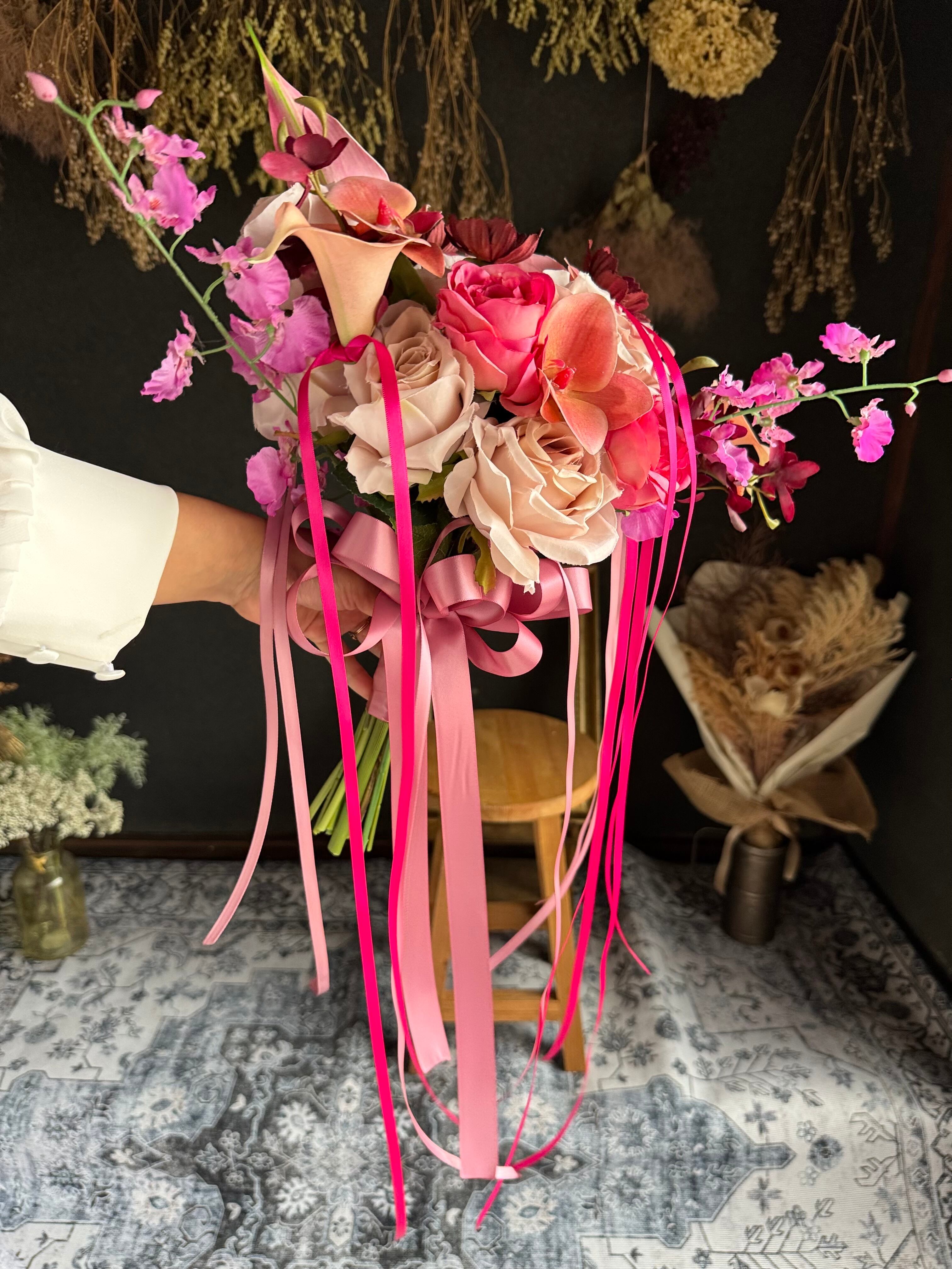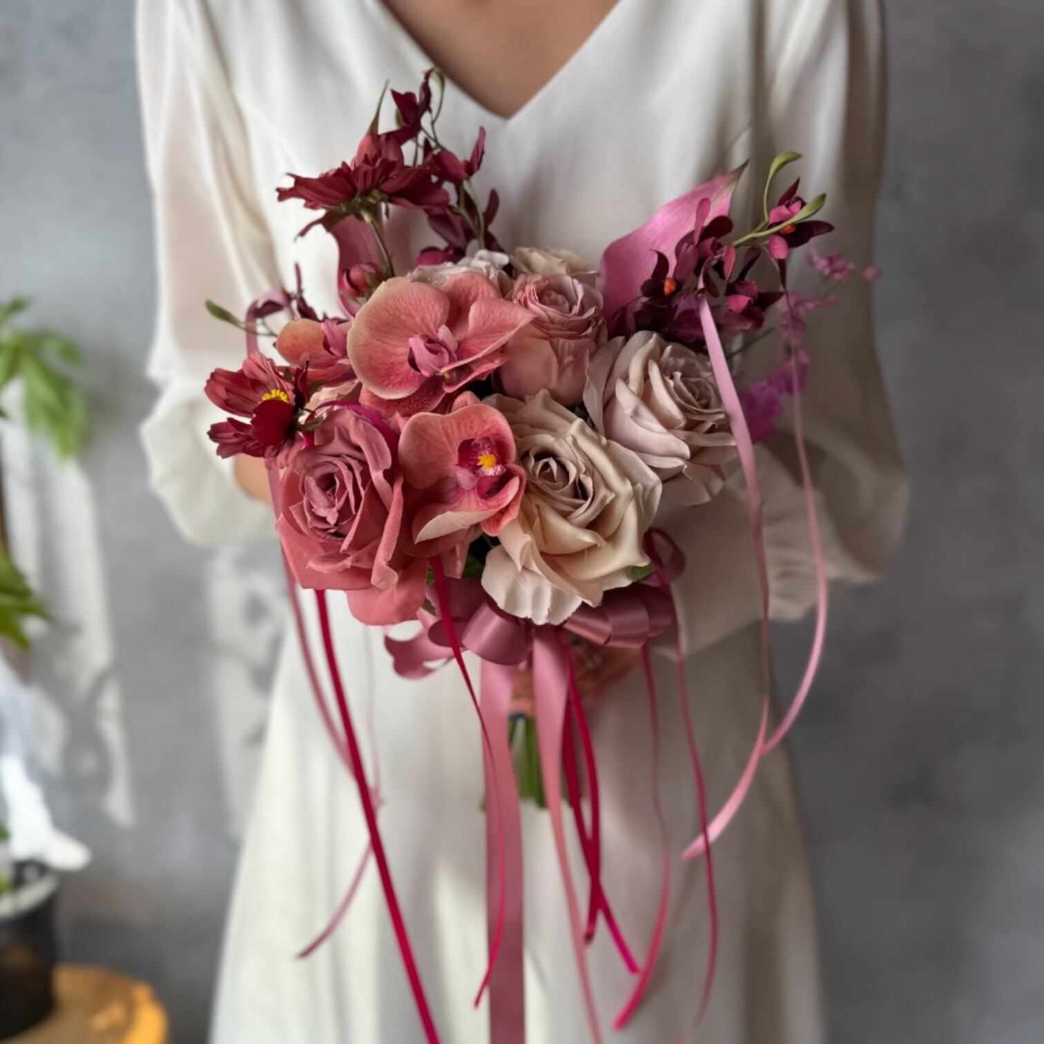 濃淡のピンクにフューシャのリボンを合わせ、大人の可愛らしさと上品さを両立しました。