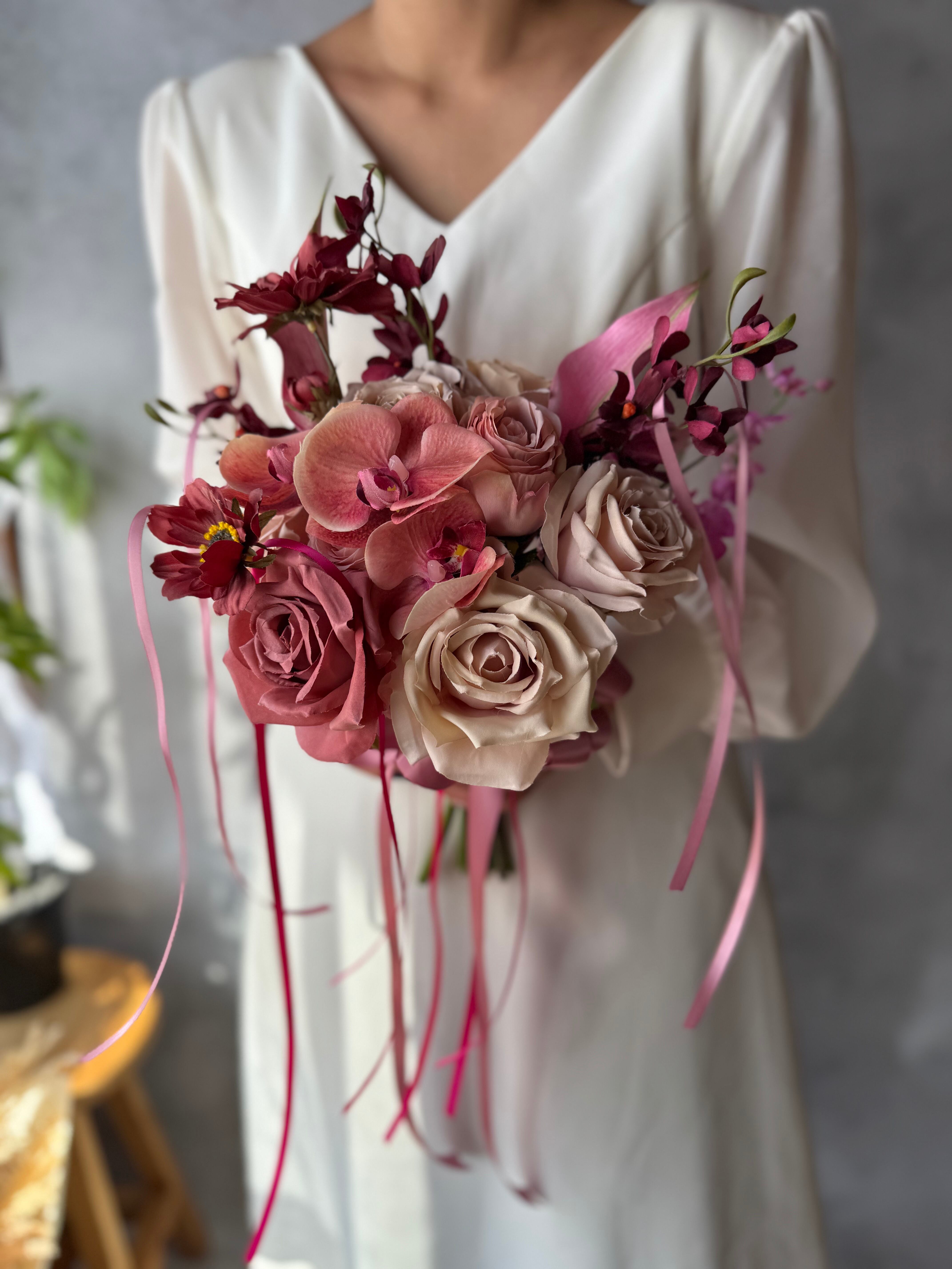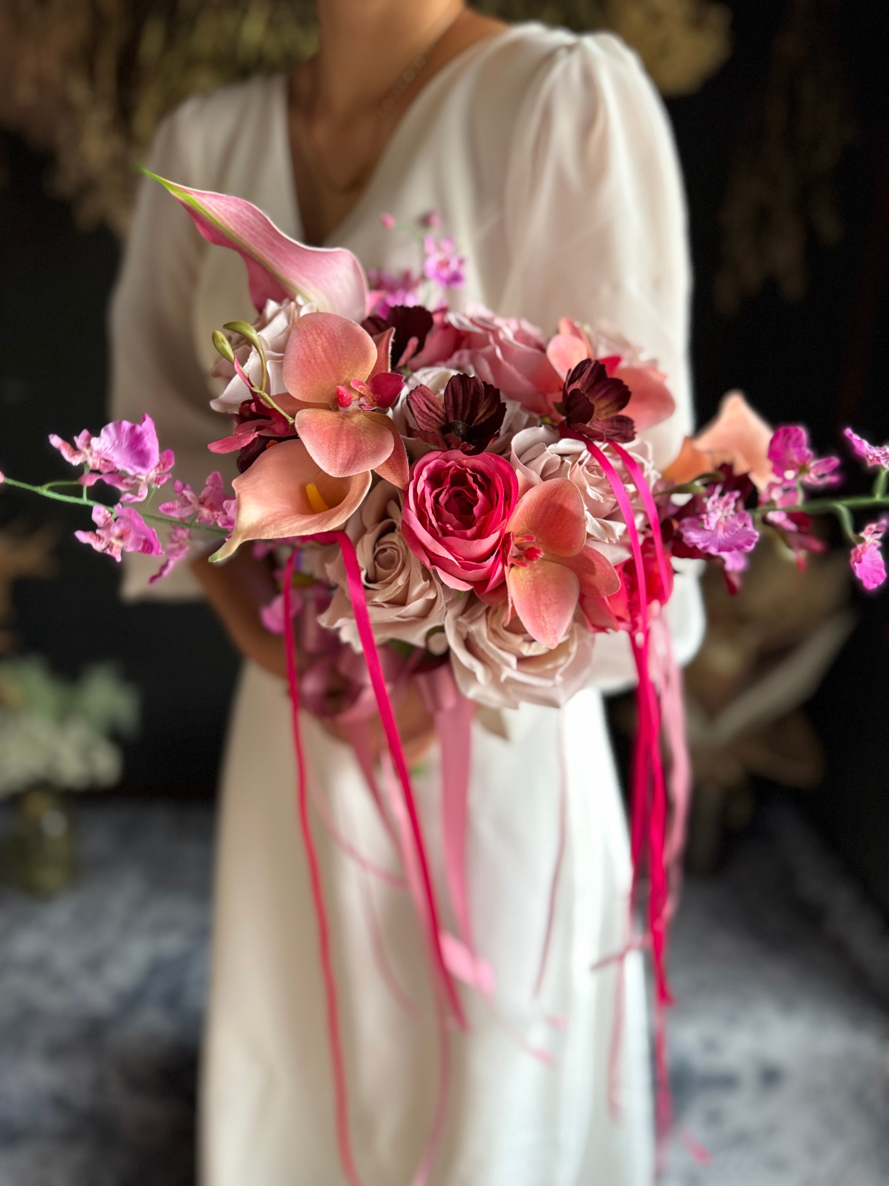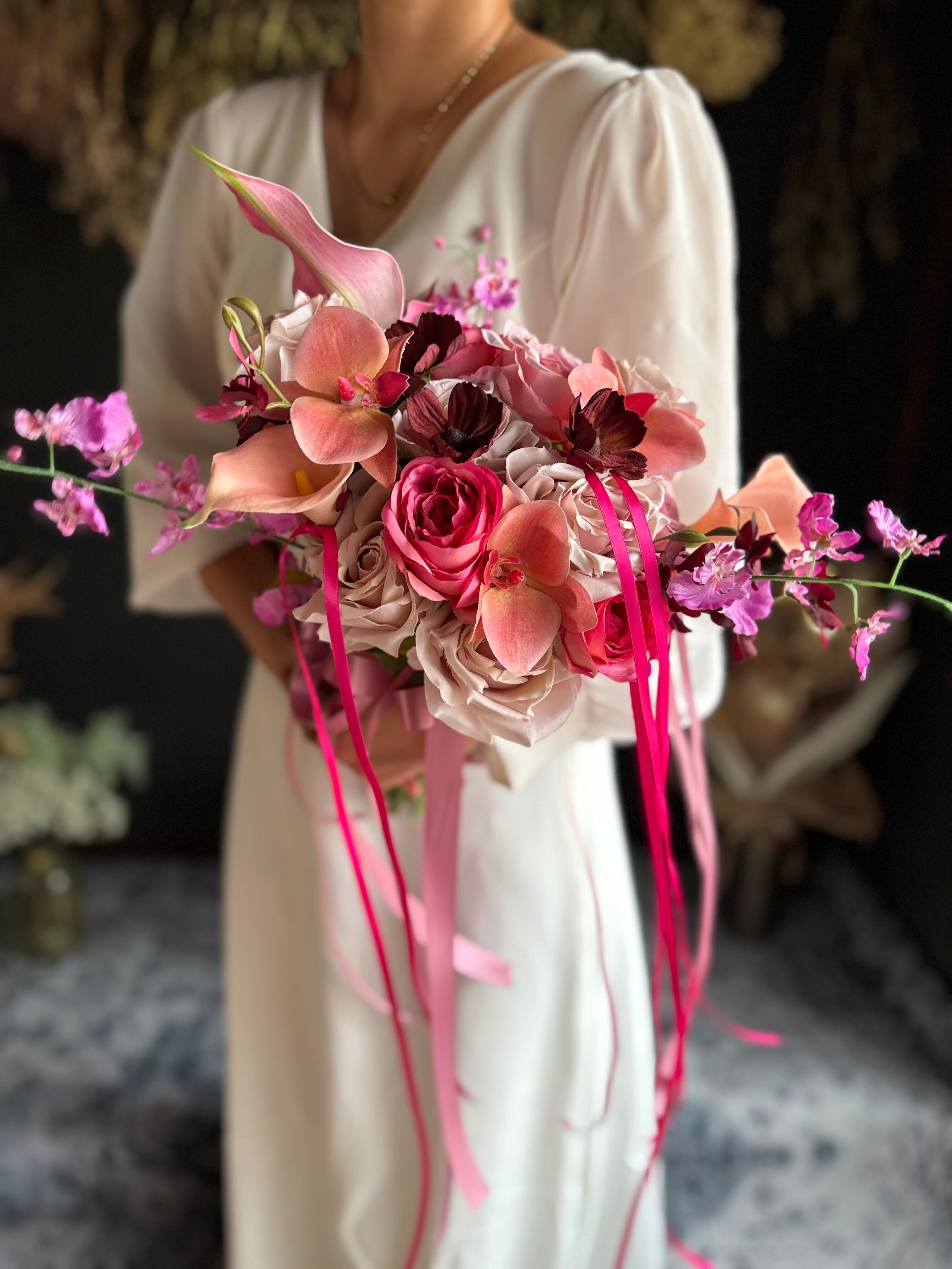 濃淡のピンクにフューシャのリボンを合わせ、大人の可愛らしさと上品さを両立しました。