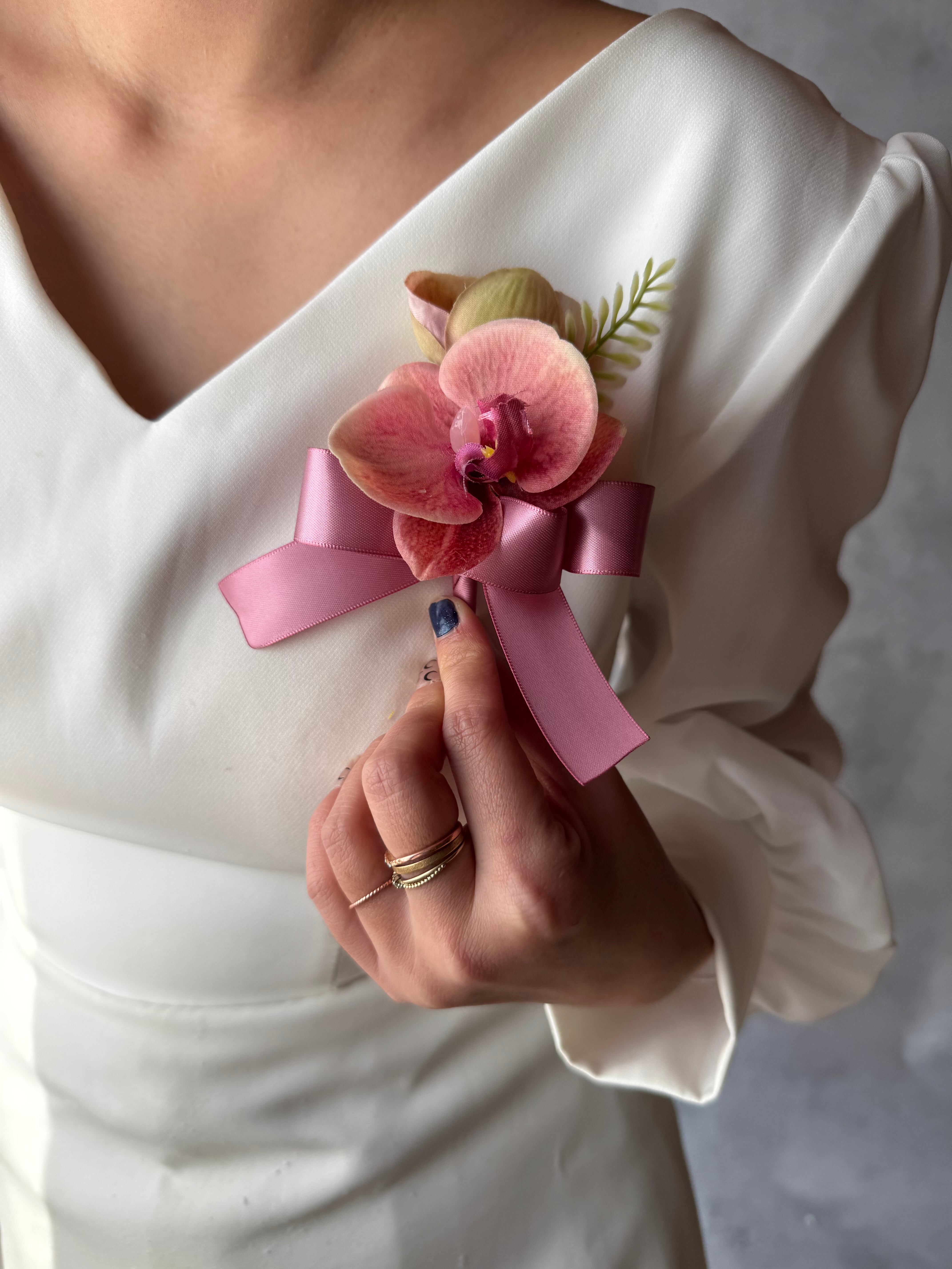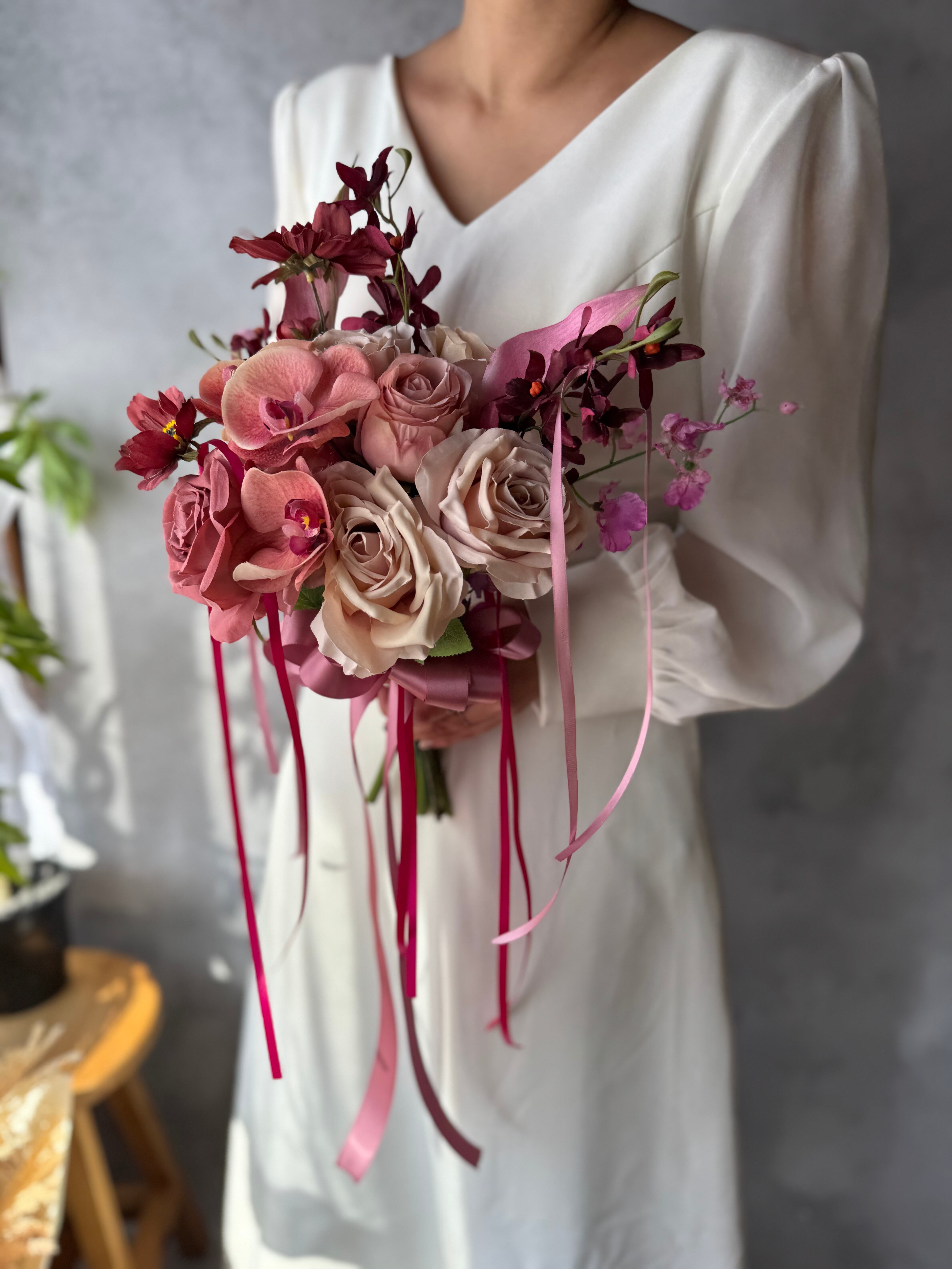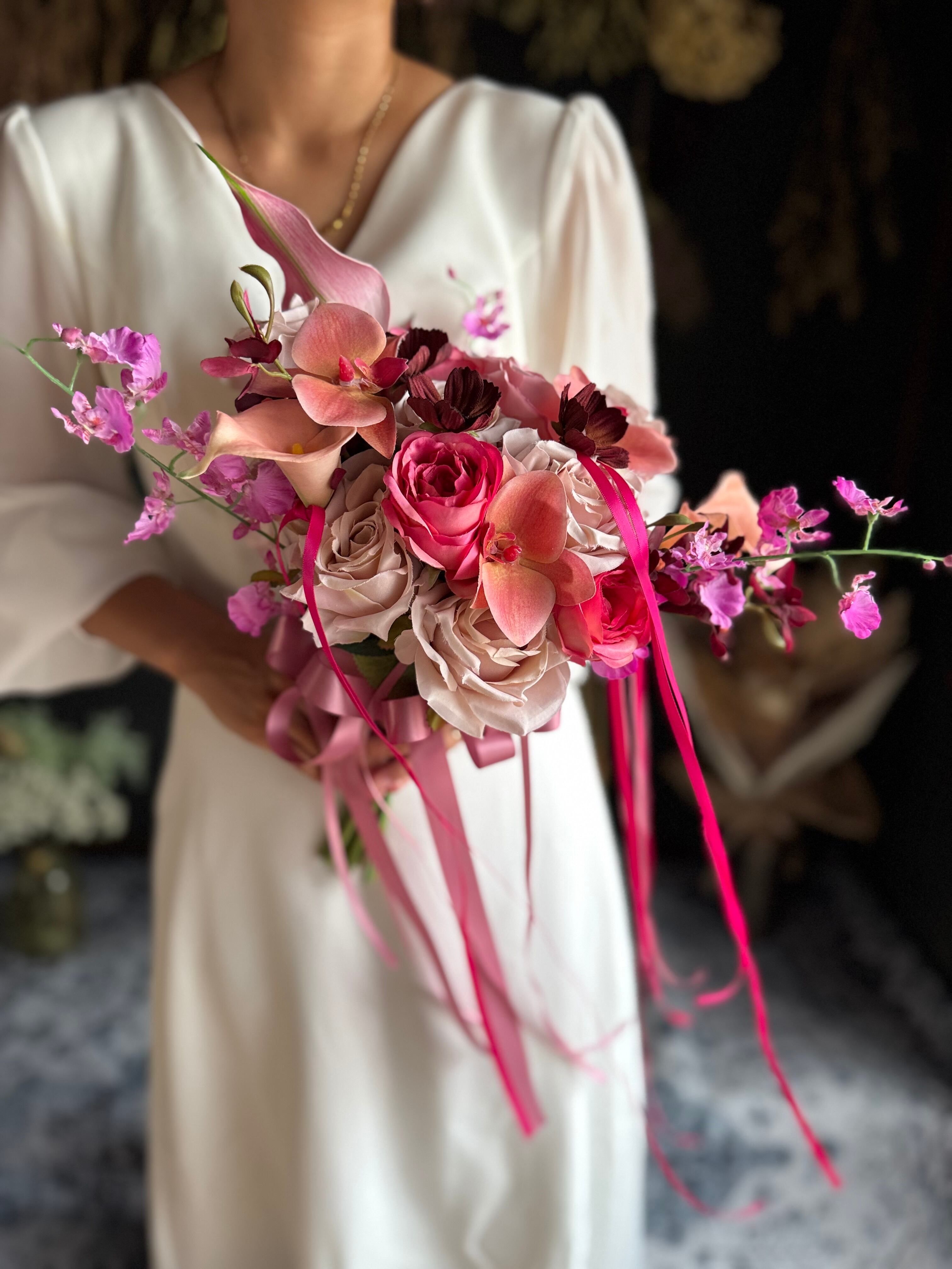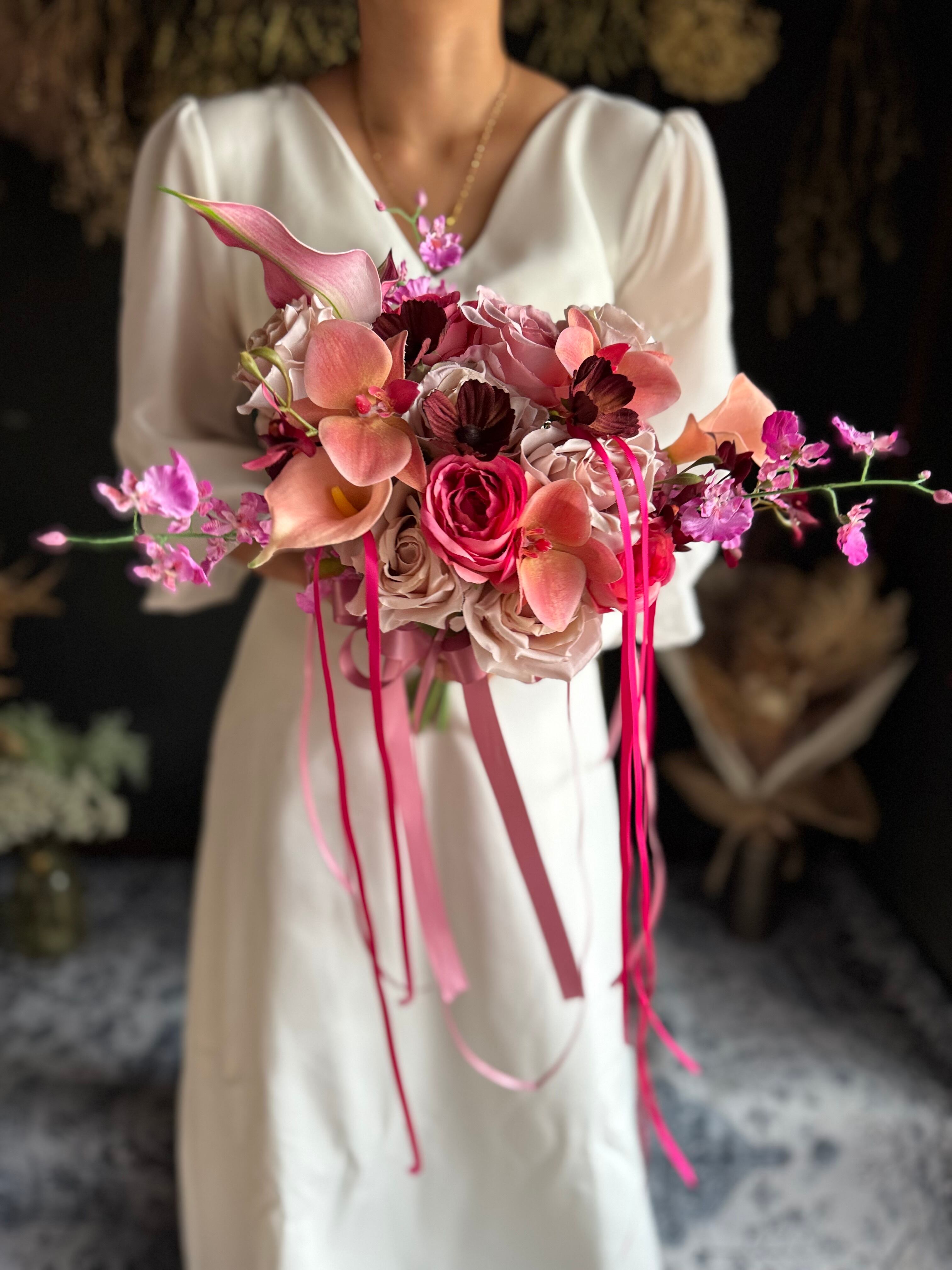 濃淡のピンクにフューシャのリボンを合わせ、大人の可愛らしさと上品さを両立しました。