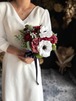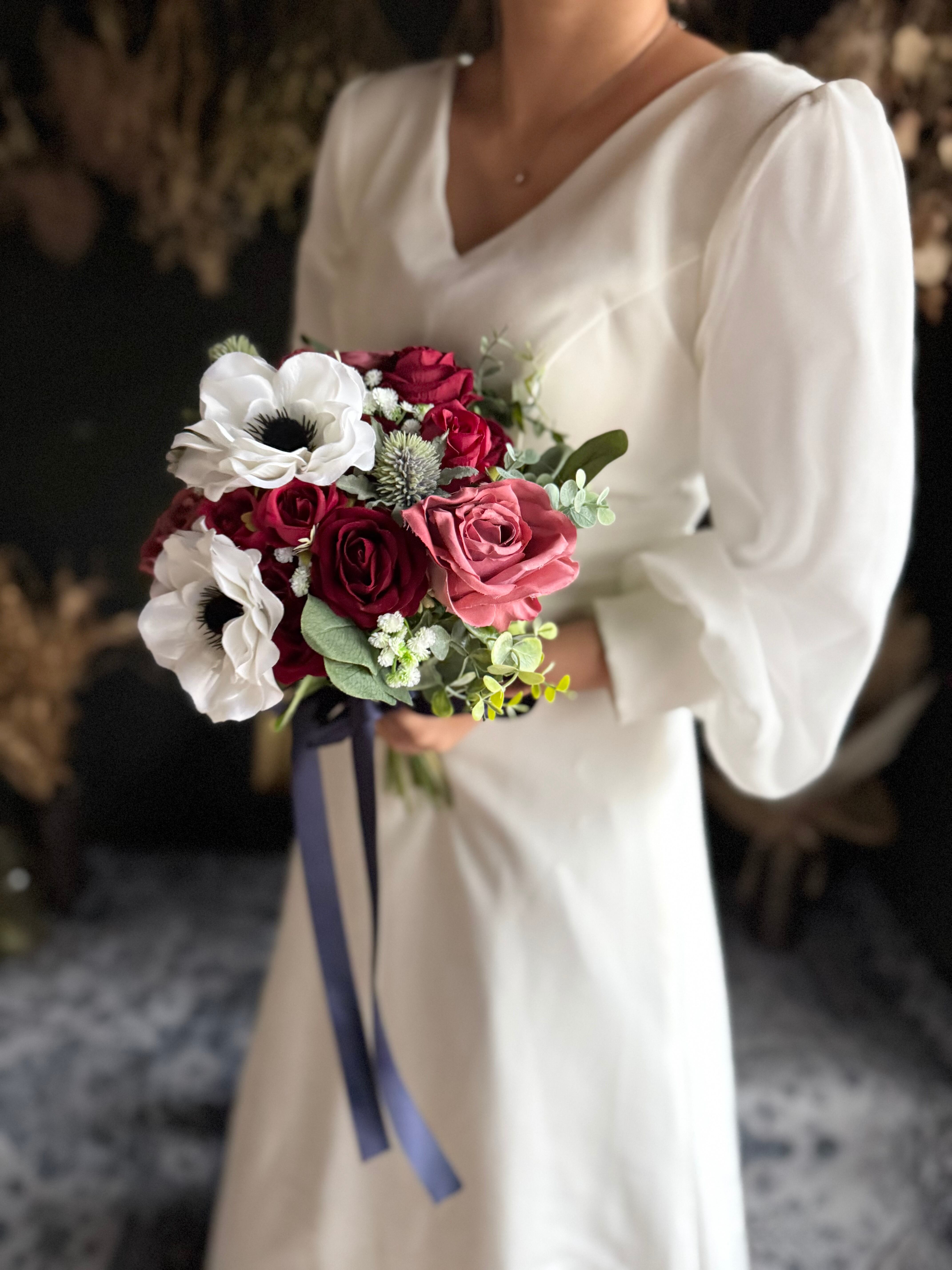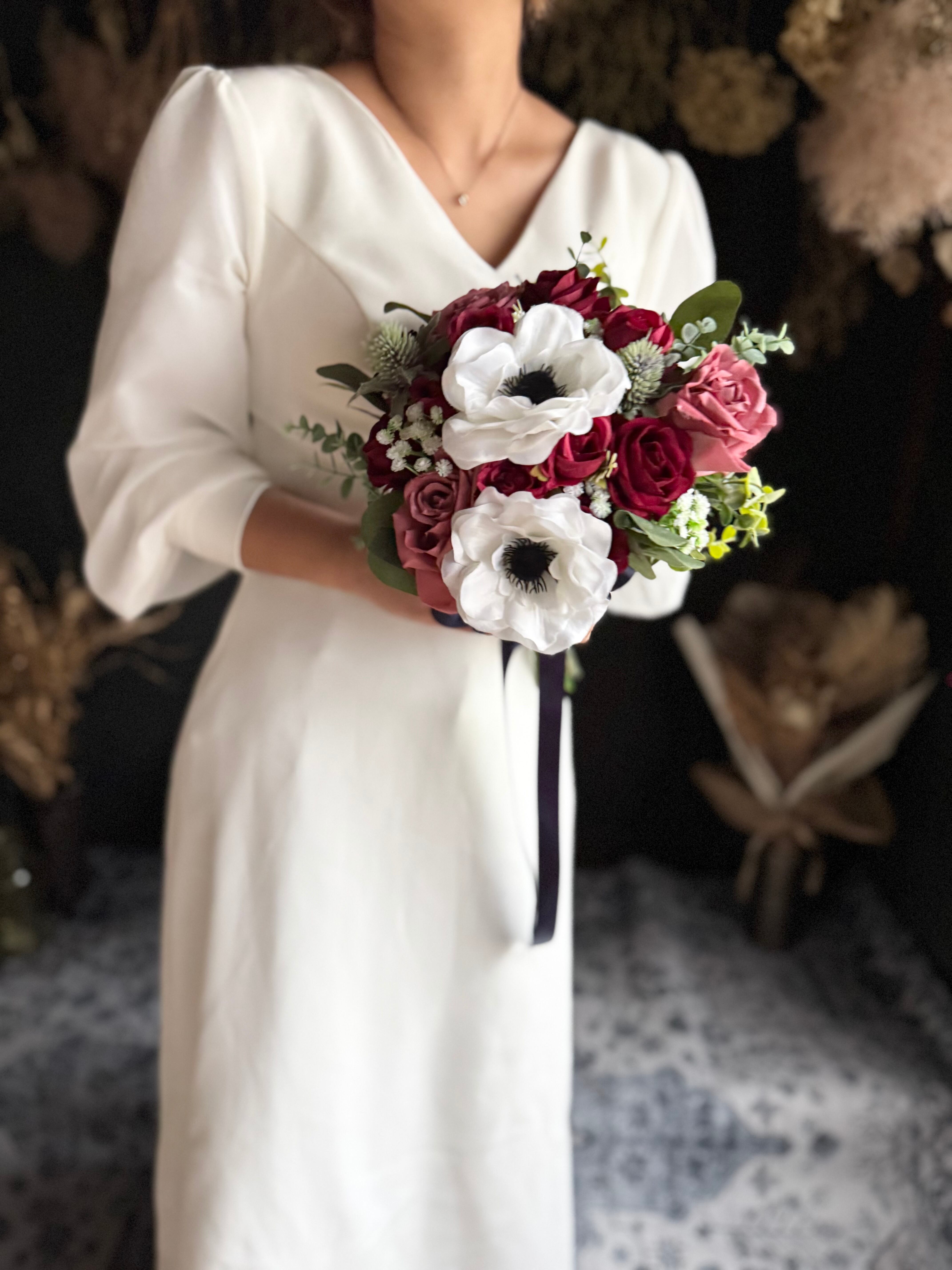 清楚な白アネモネと、深いワインレッドのバラを主役にしたクラシカルブーケ•*・