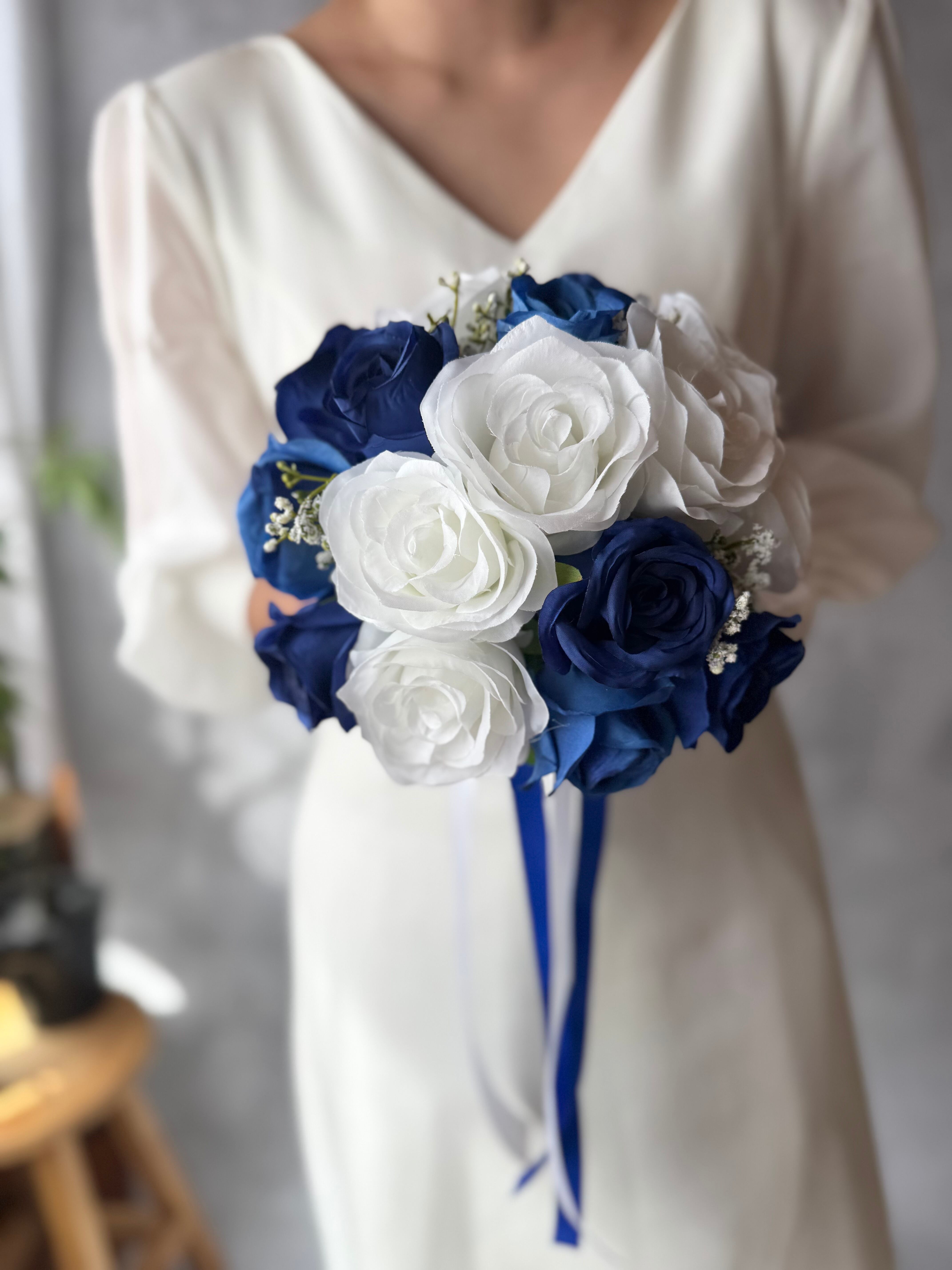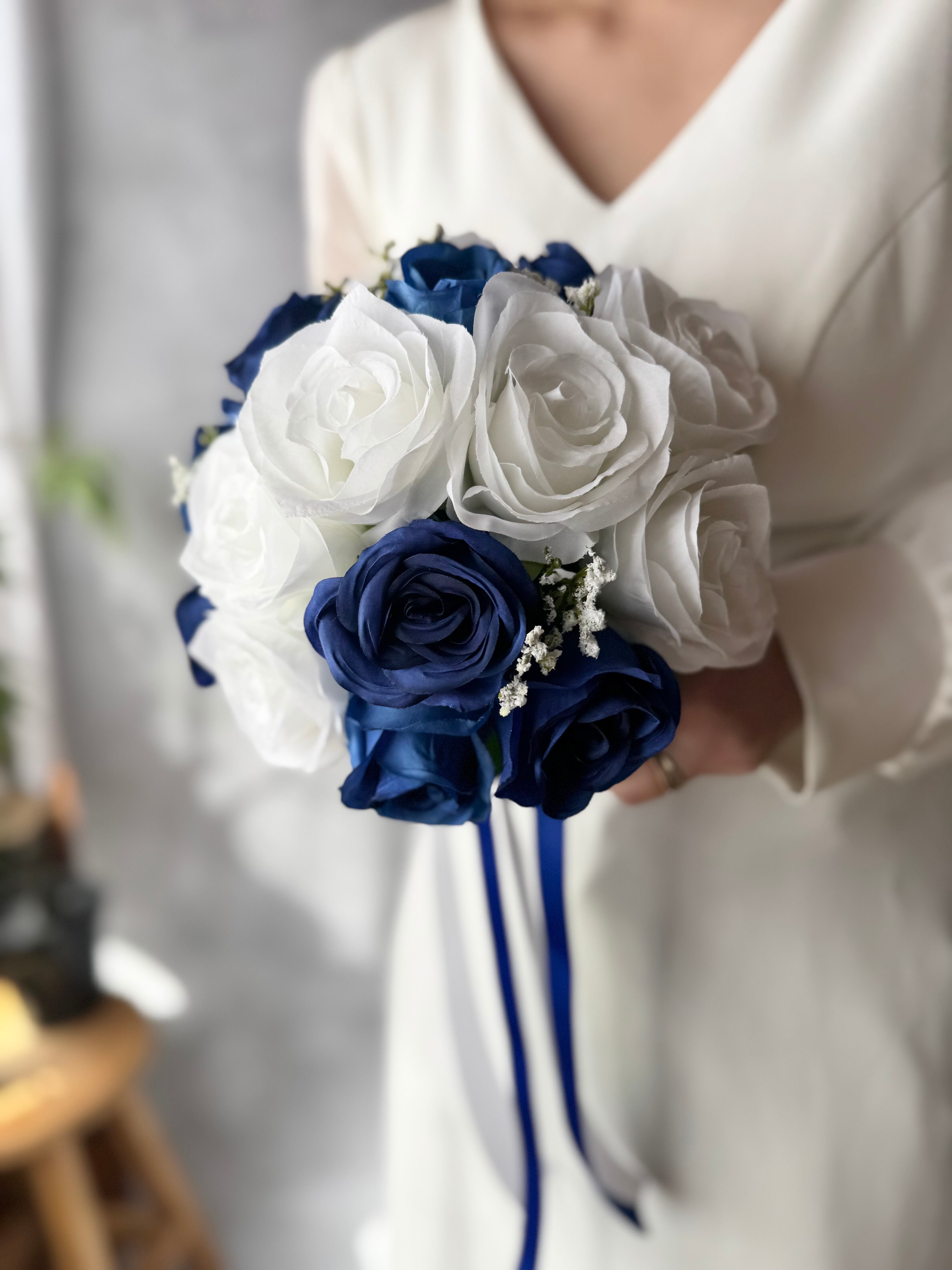 白のバラと生花では難しいブルーのバラ、上品で美しいラウンドブーケ