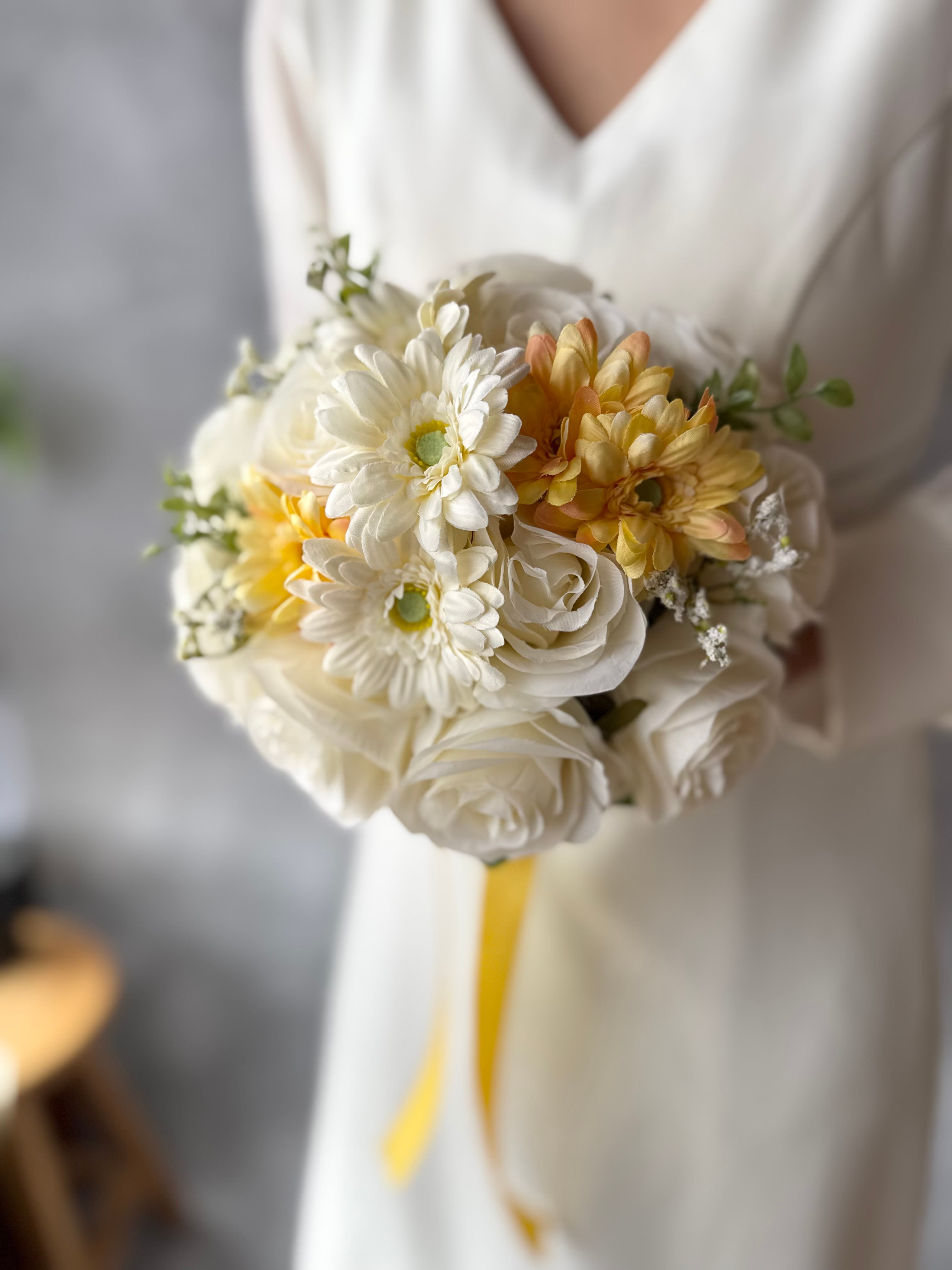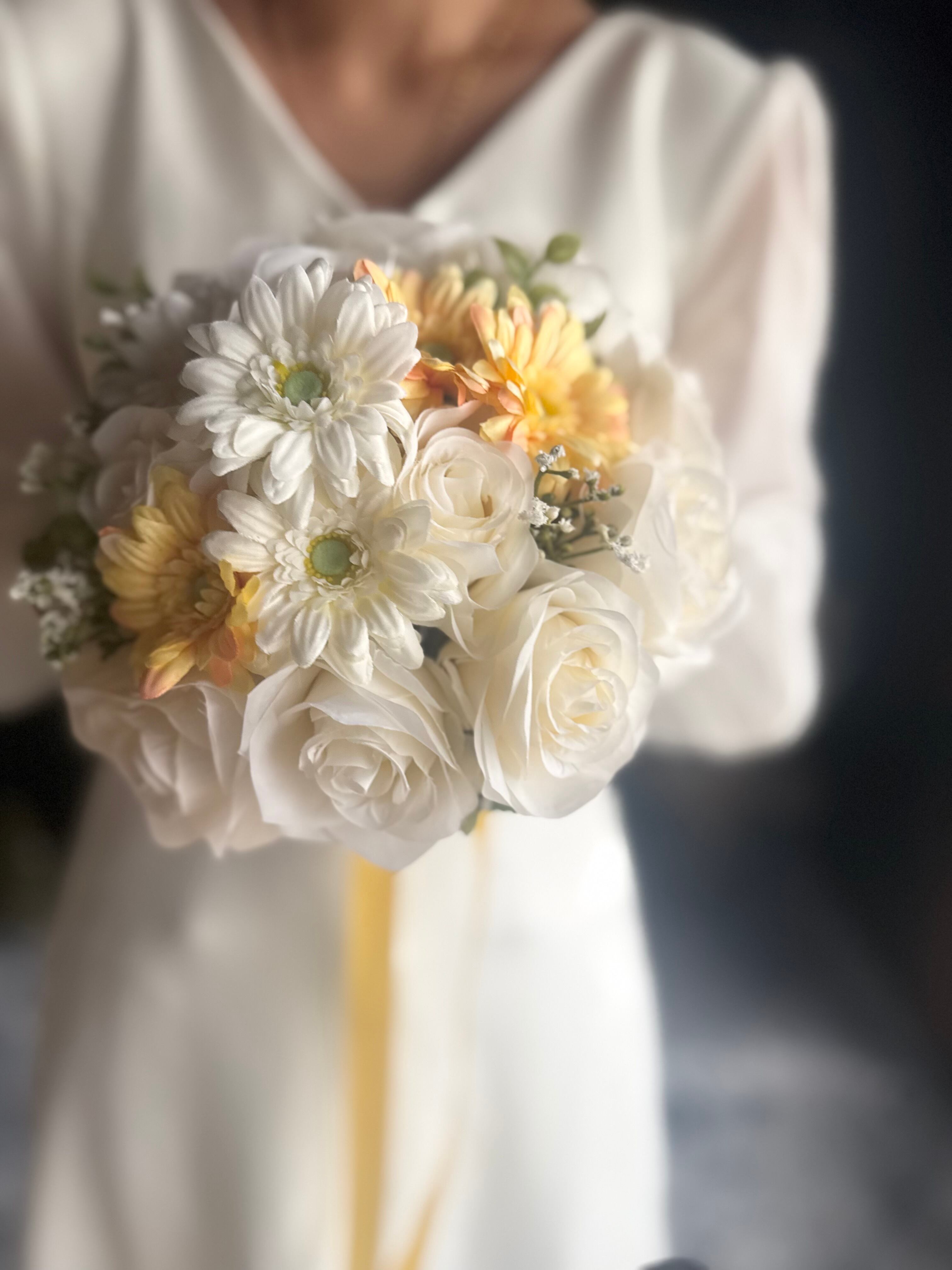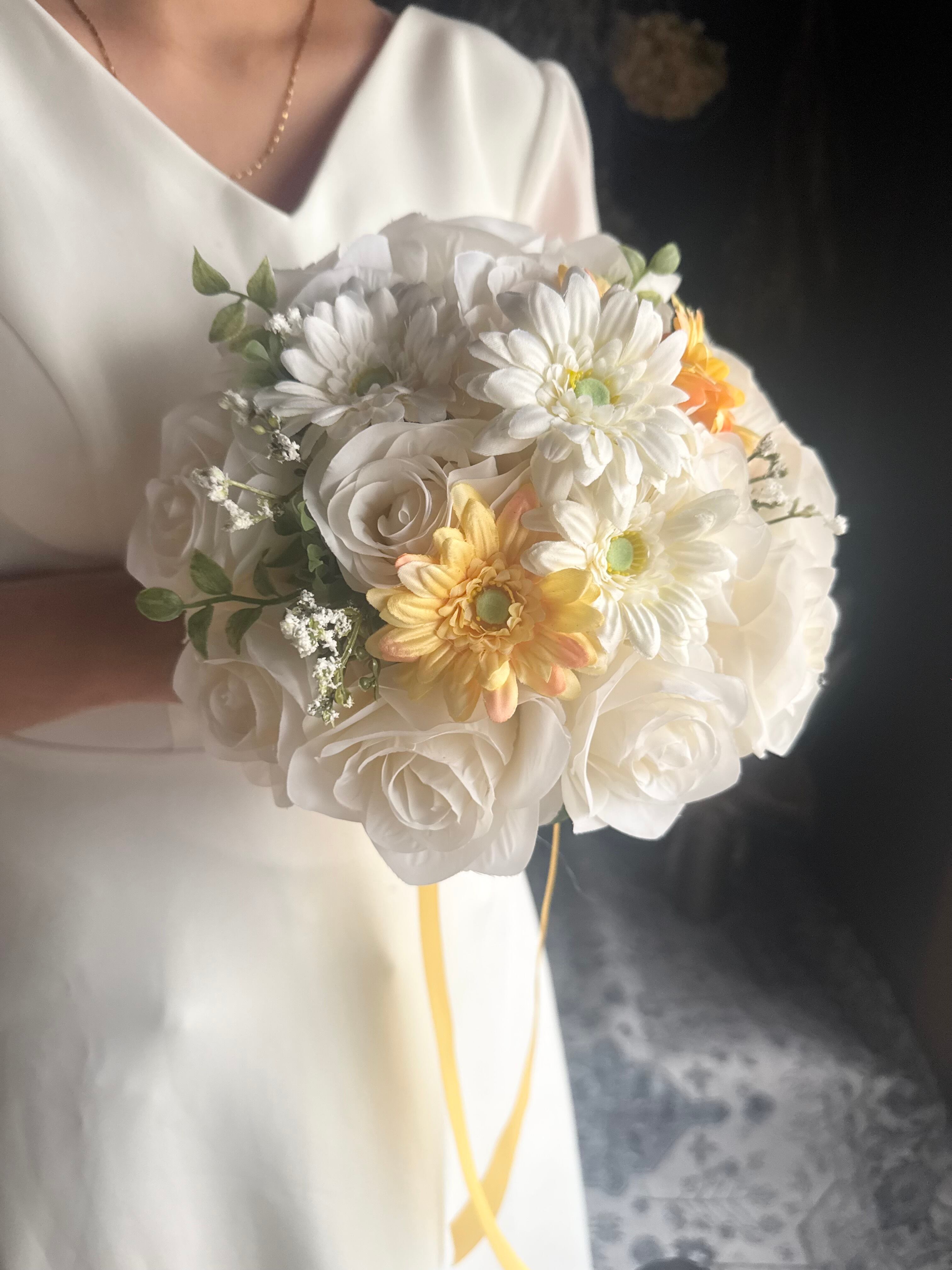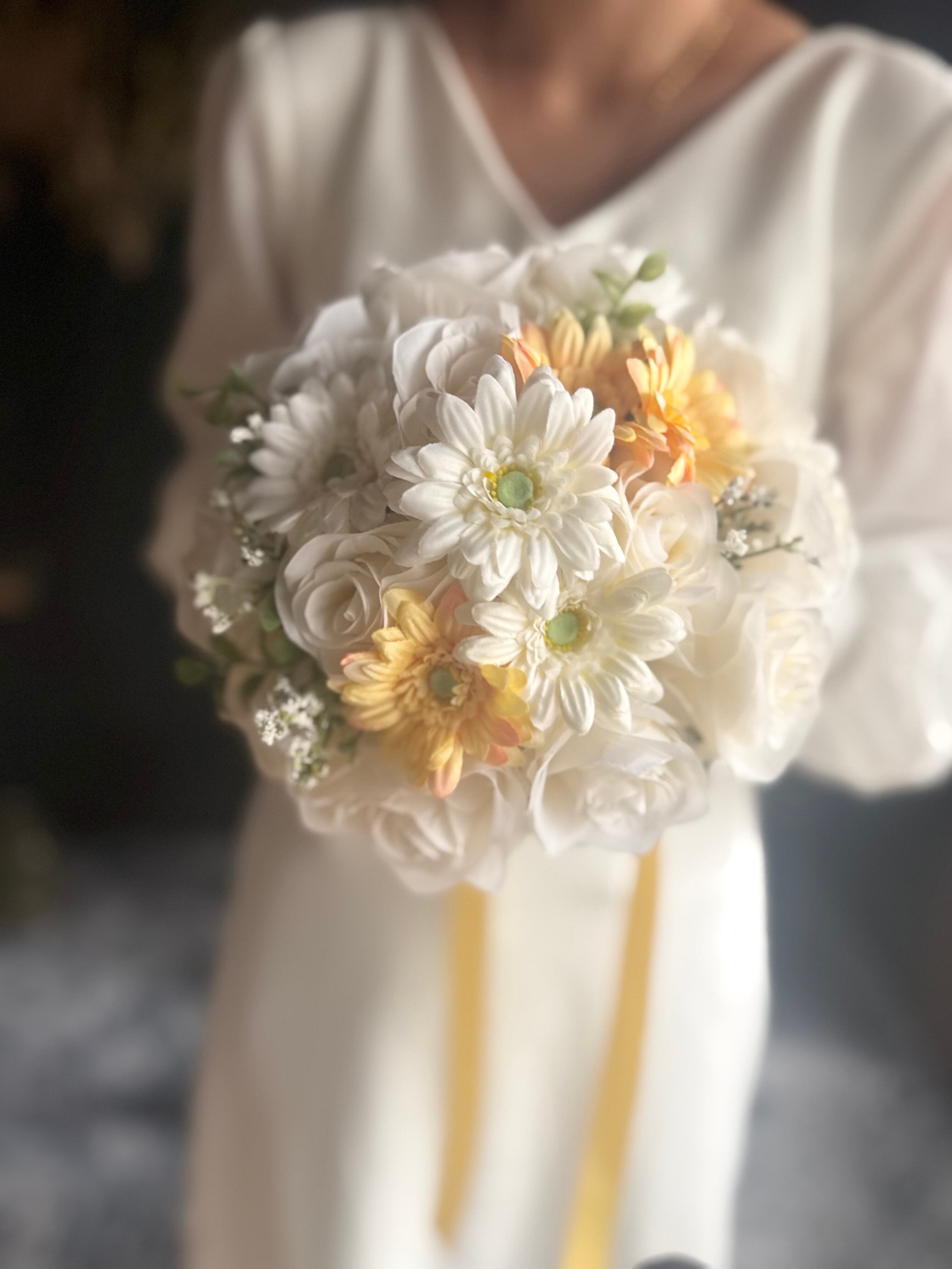 白、黄色のガーベラとアイボリーのバラのカジュアルで可愛いデザインのラウンドブーケです^ ^特別な日を彩るお手伝いをさせていただけるのが何よりの幸せです♪
