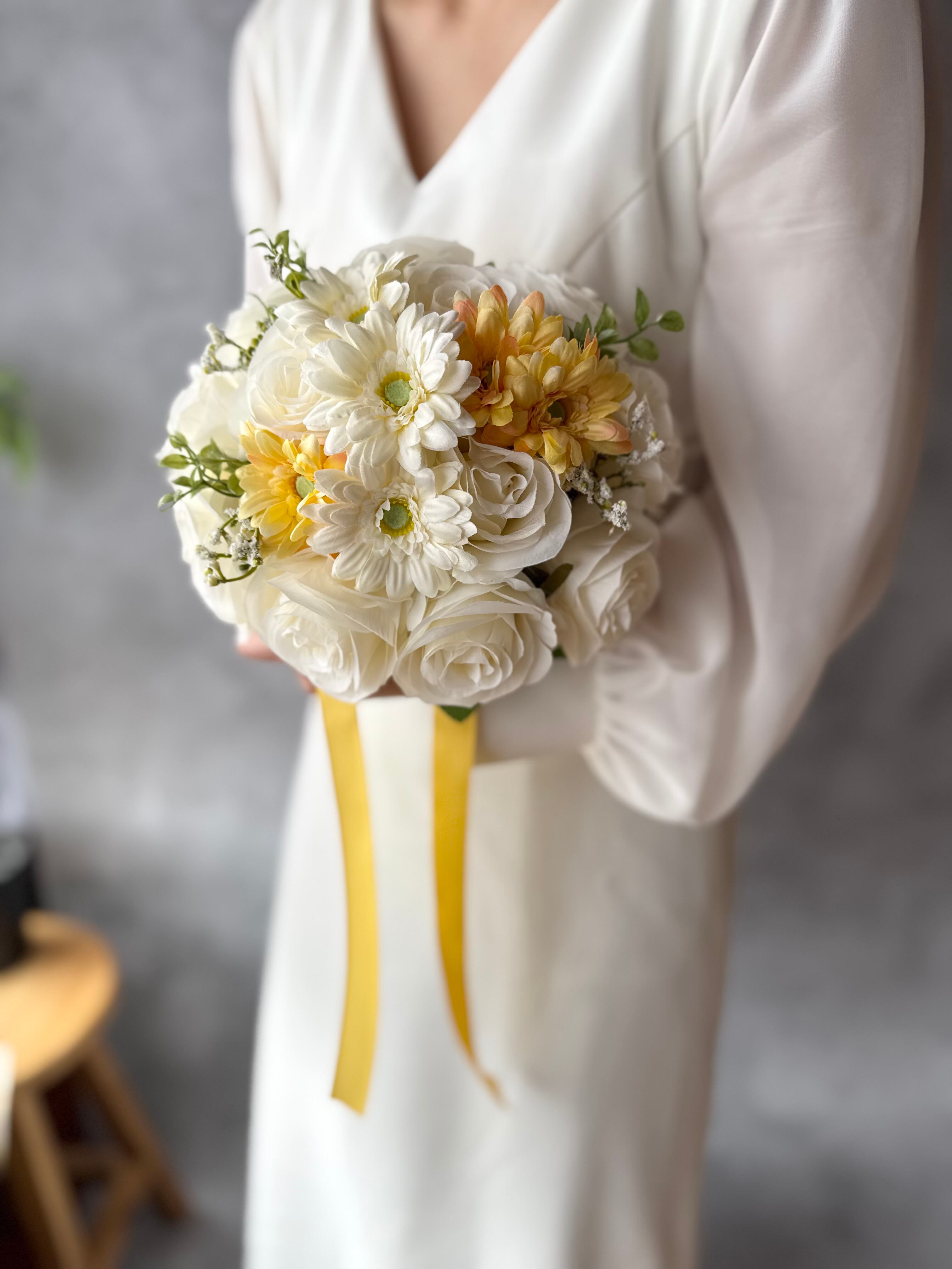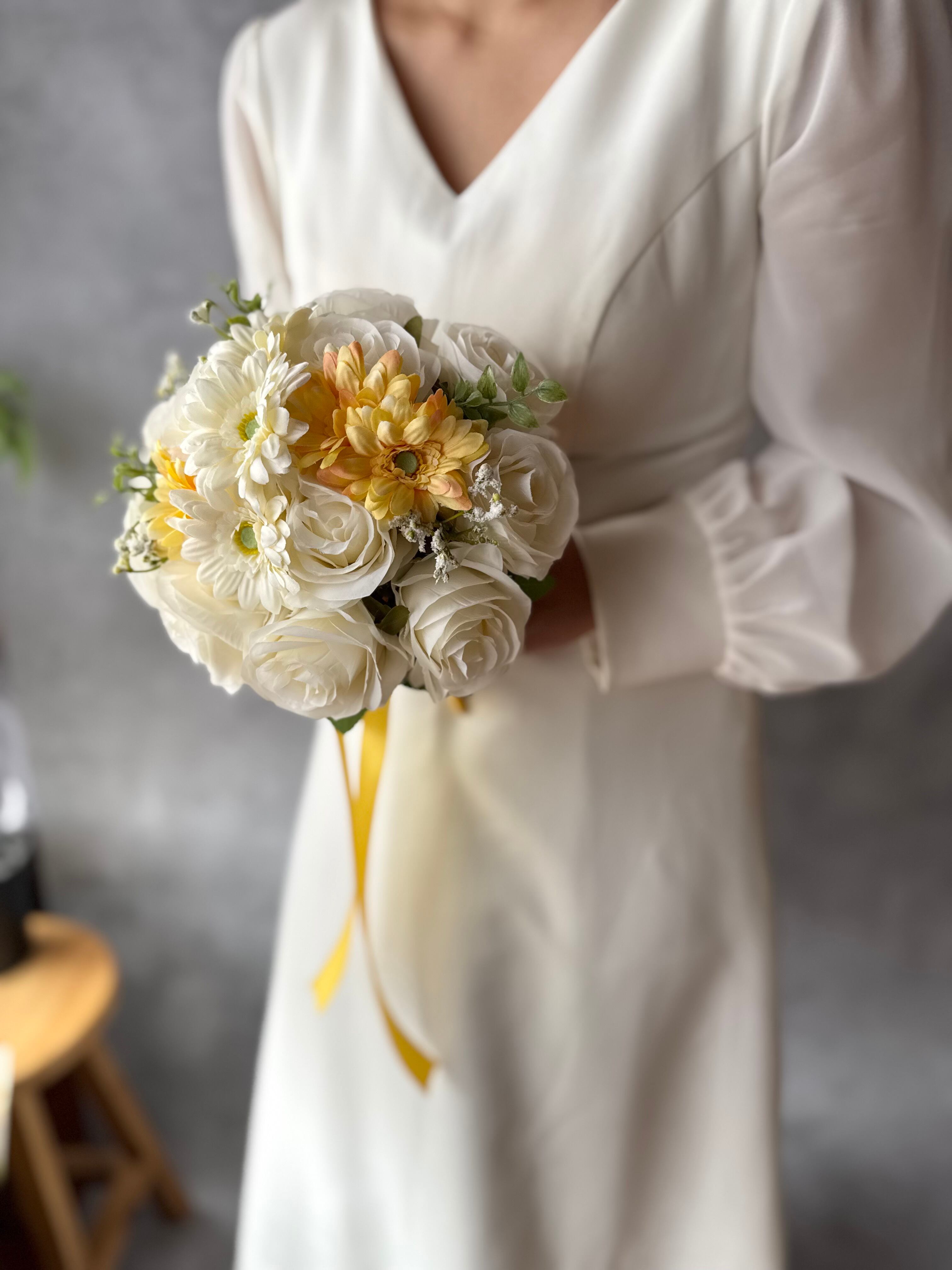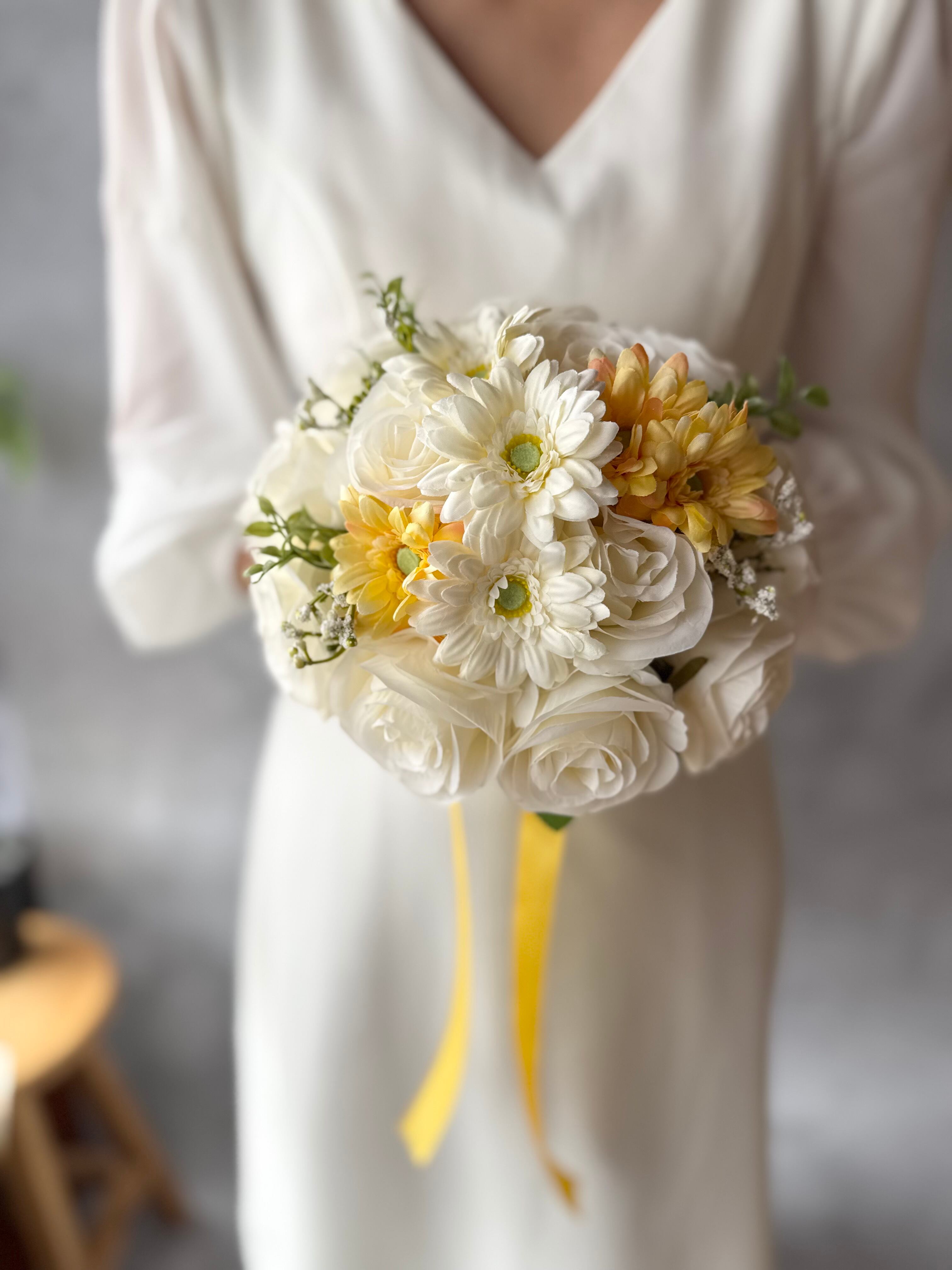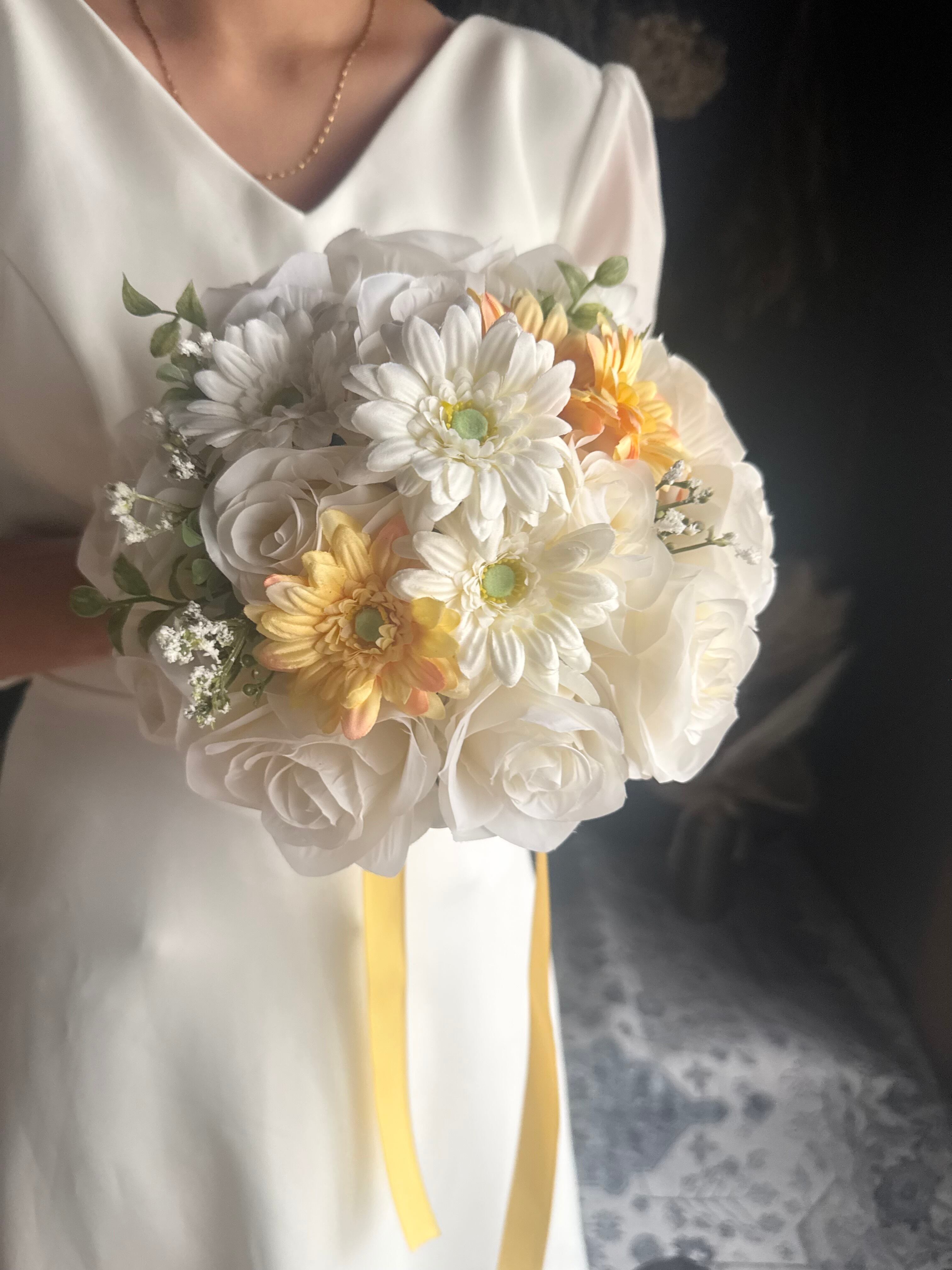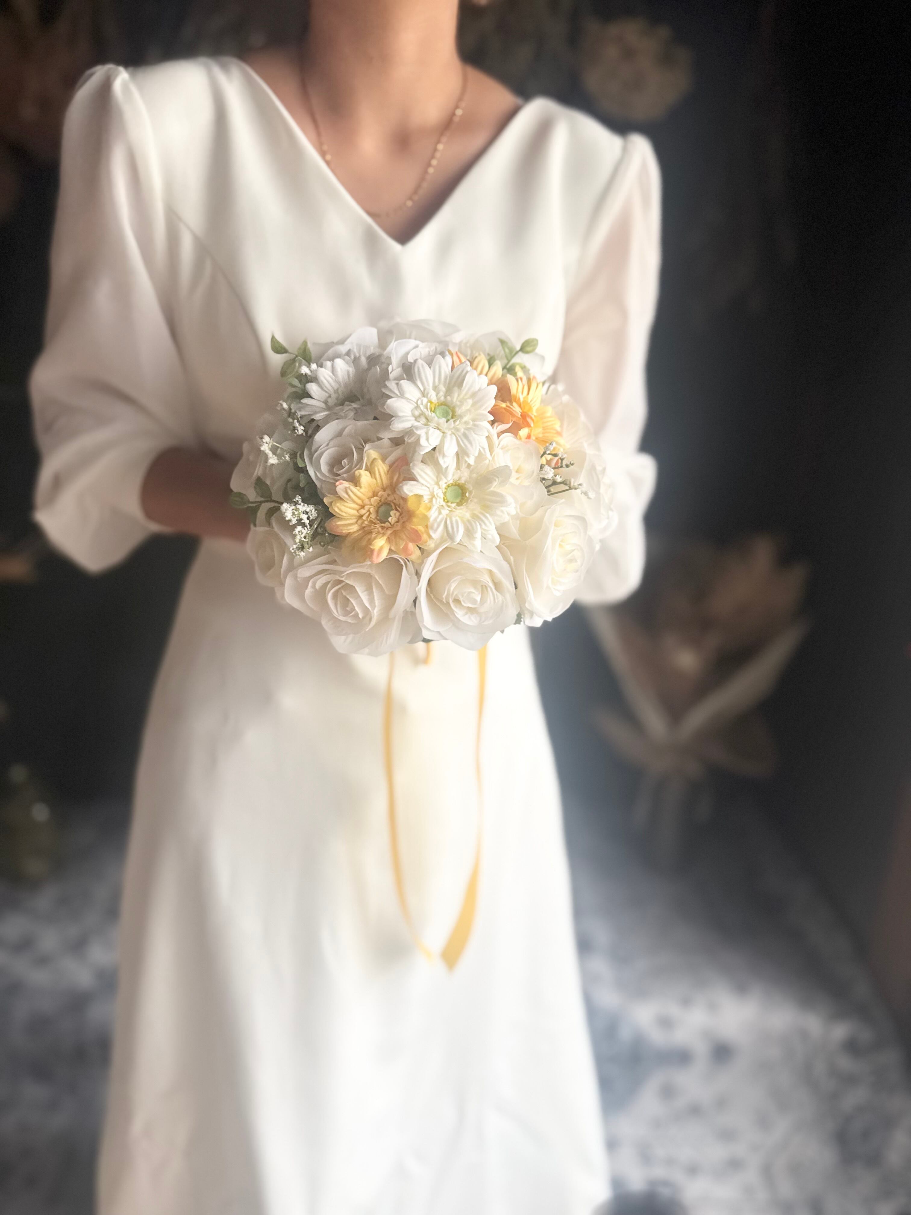 白、黄色のガーベラとアイボリーのバラのカジュアルで可愛いデザインのラウンドブーケです^ ^特別な日を彩るお手伝いをさせていただけるのが何よりの幸せです♪