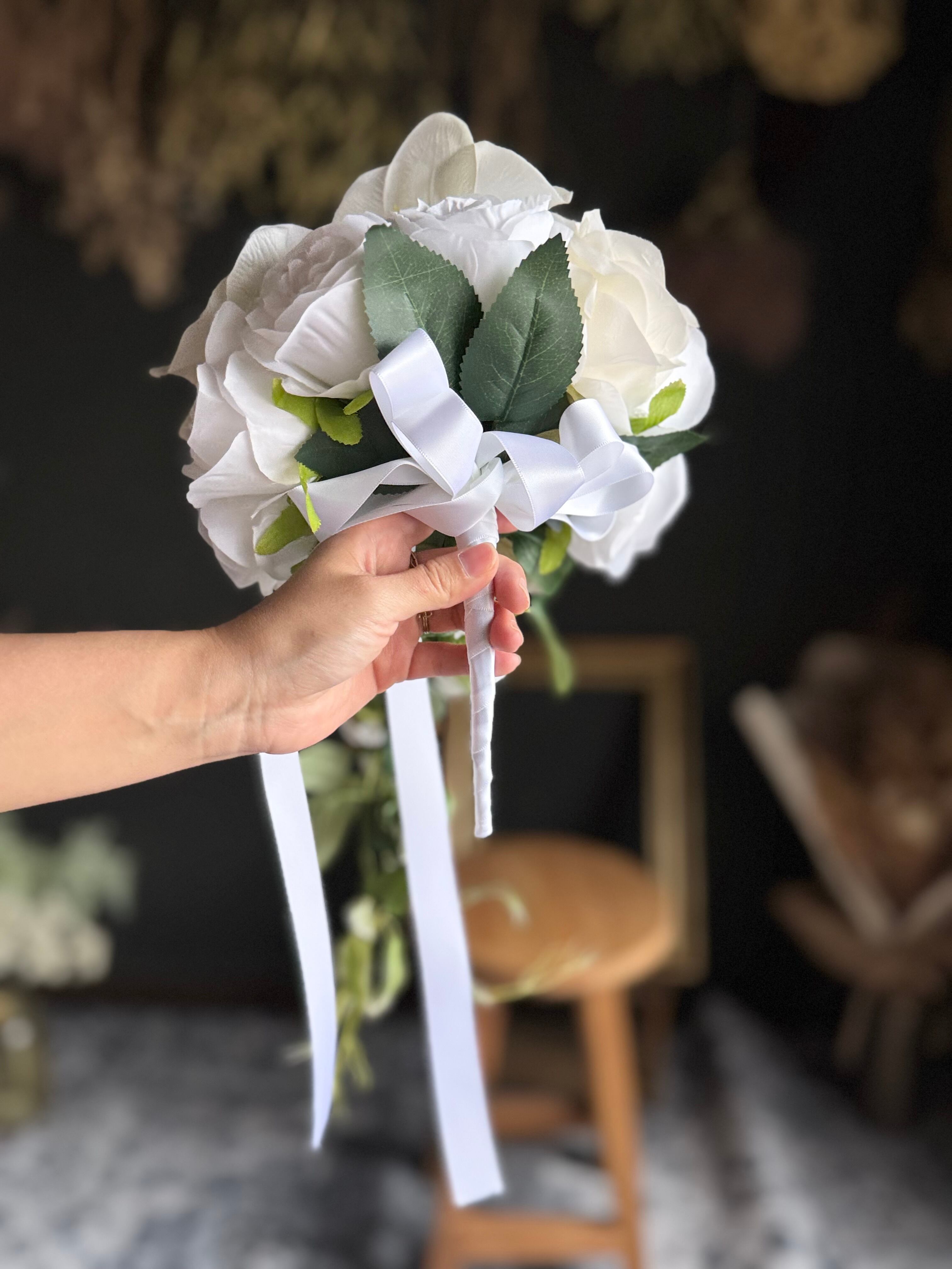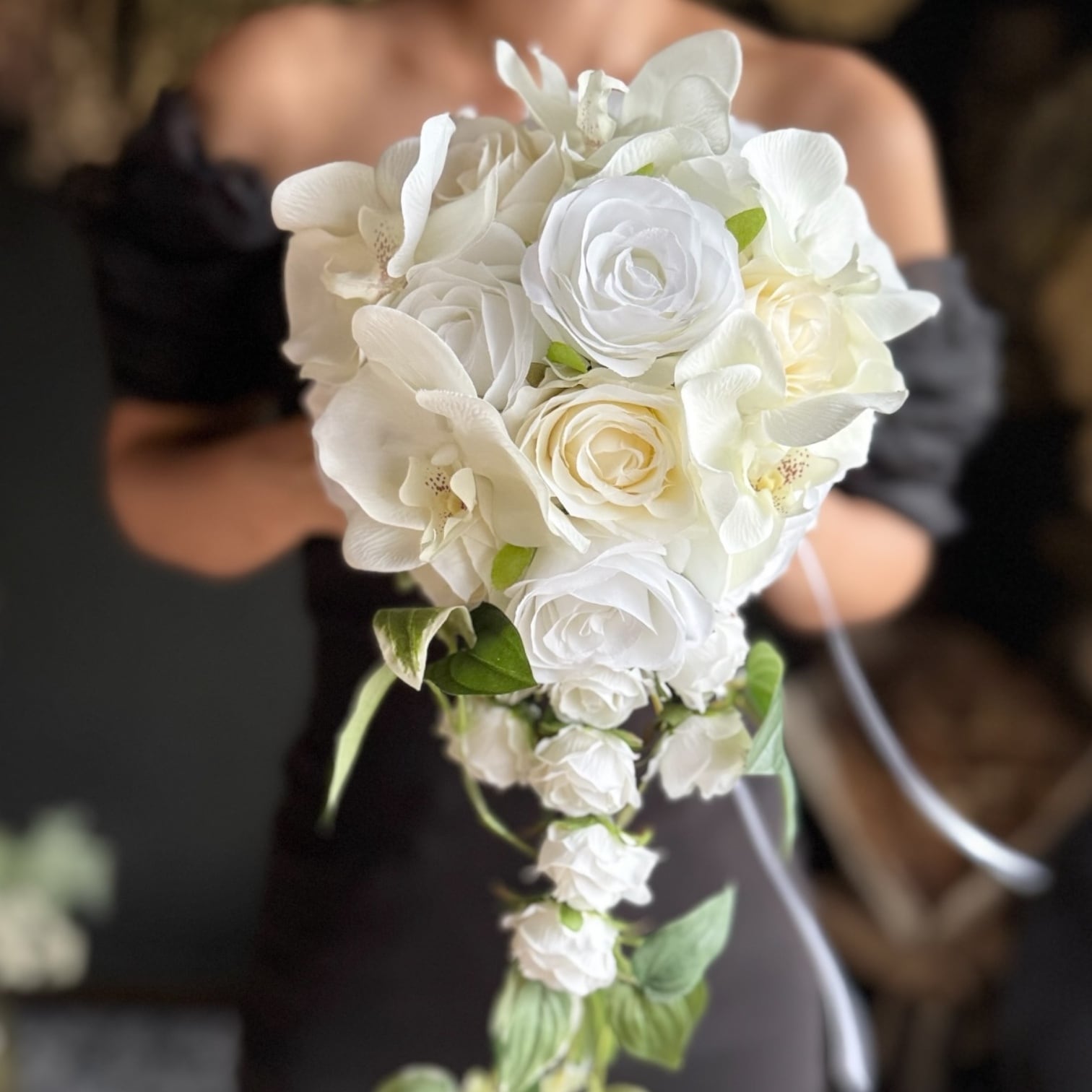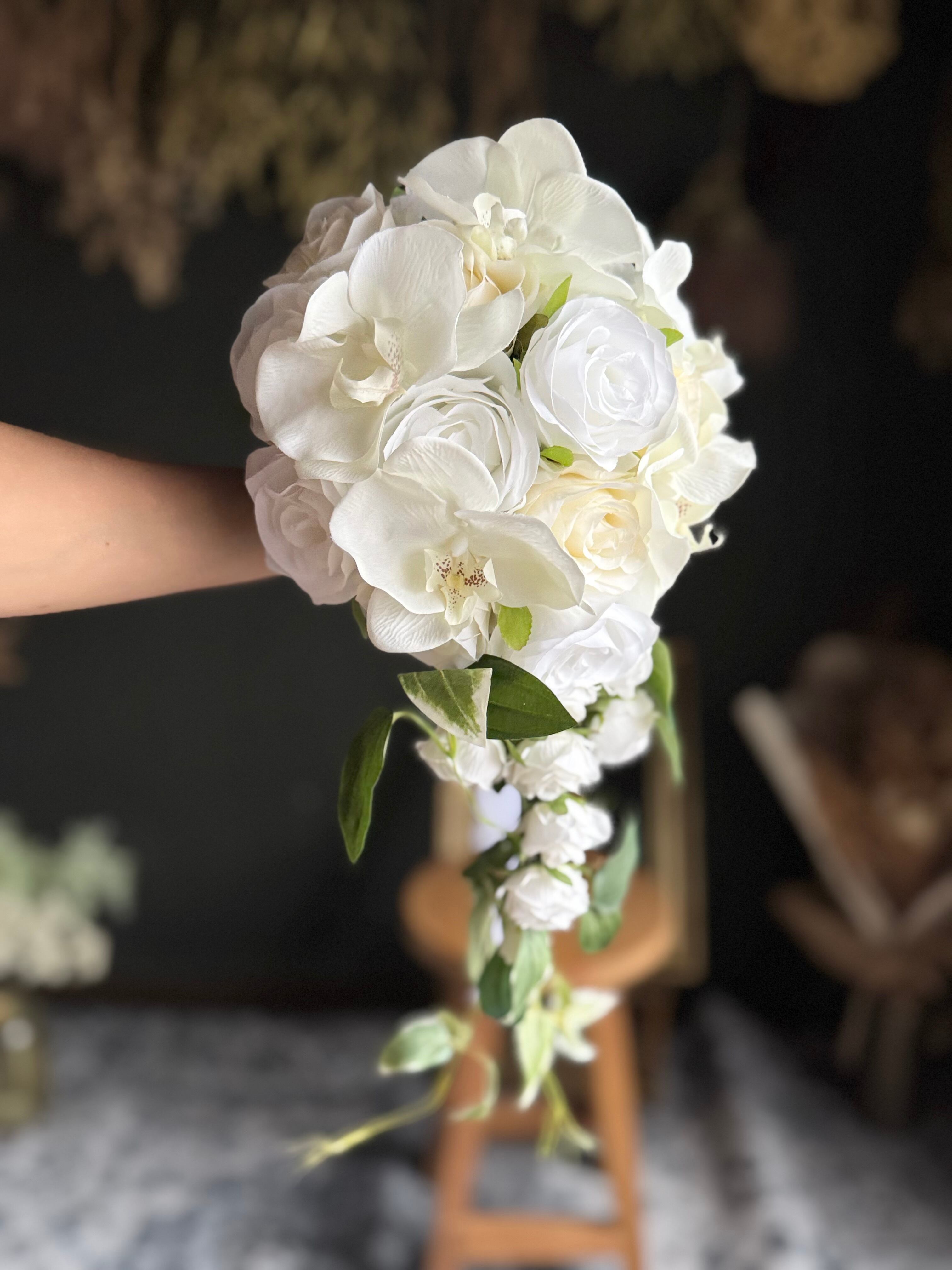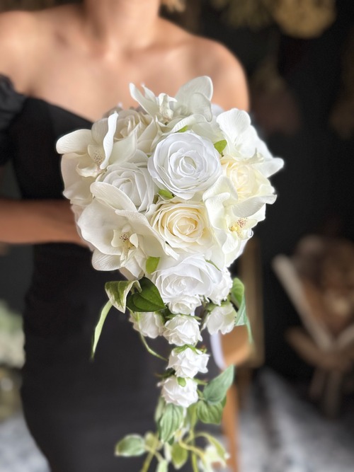こちらは胡蝶蘭と白バラをベースにアクセントにアイボリーを入れておりますので、白ドレス、アイボリードレス、どちらにも合わせやすいブーケ•*・
