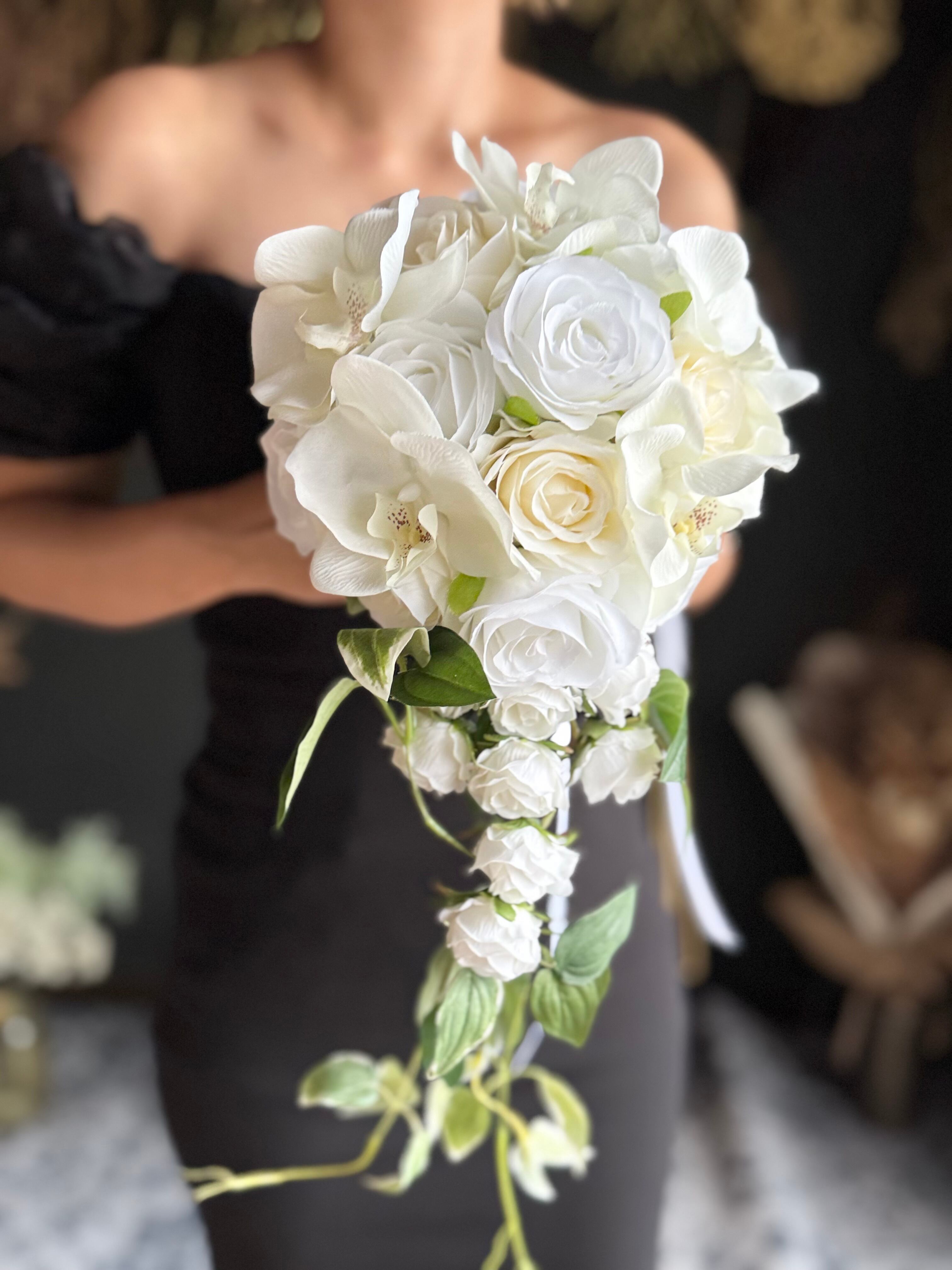 ウェディングブーケ王道デザインのキャスケードブーケ•*・