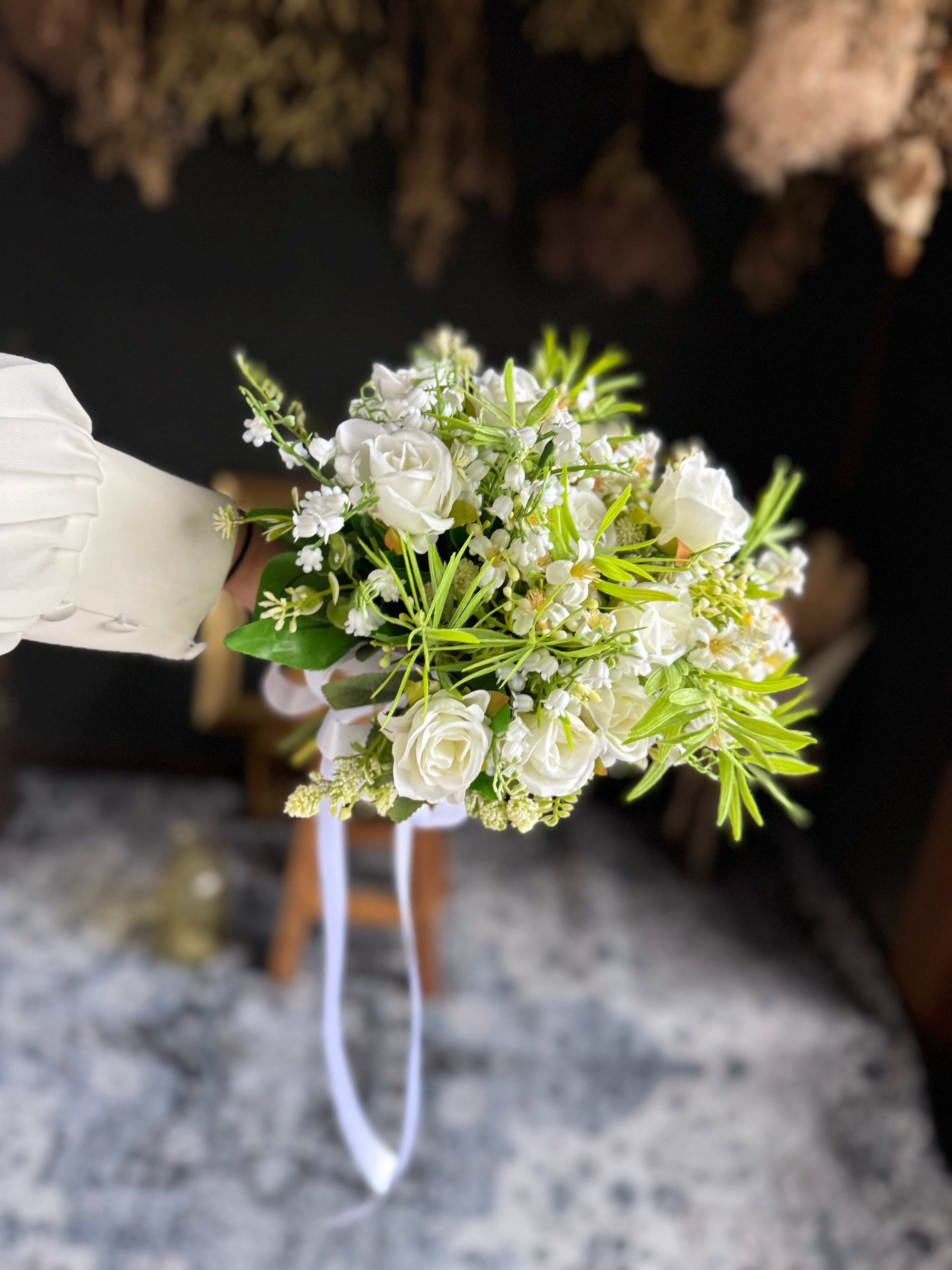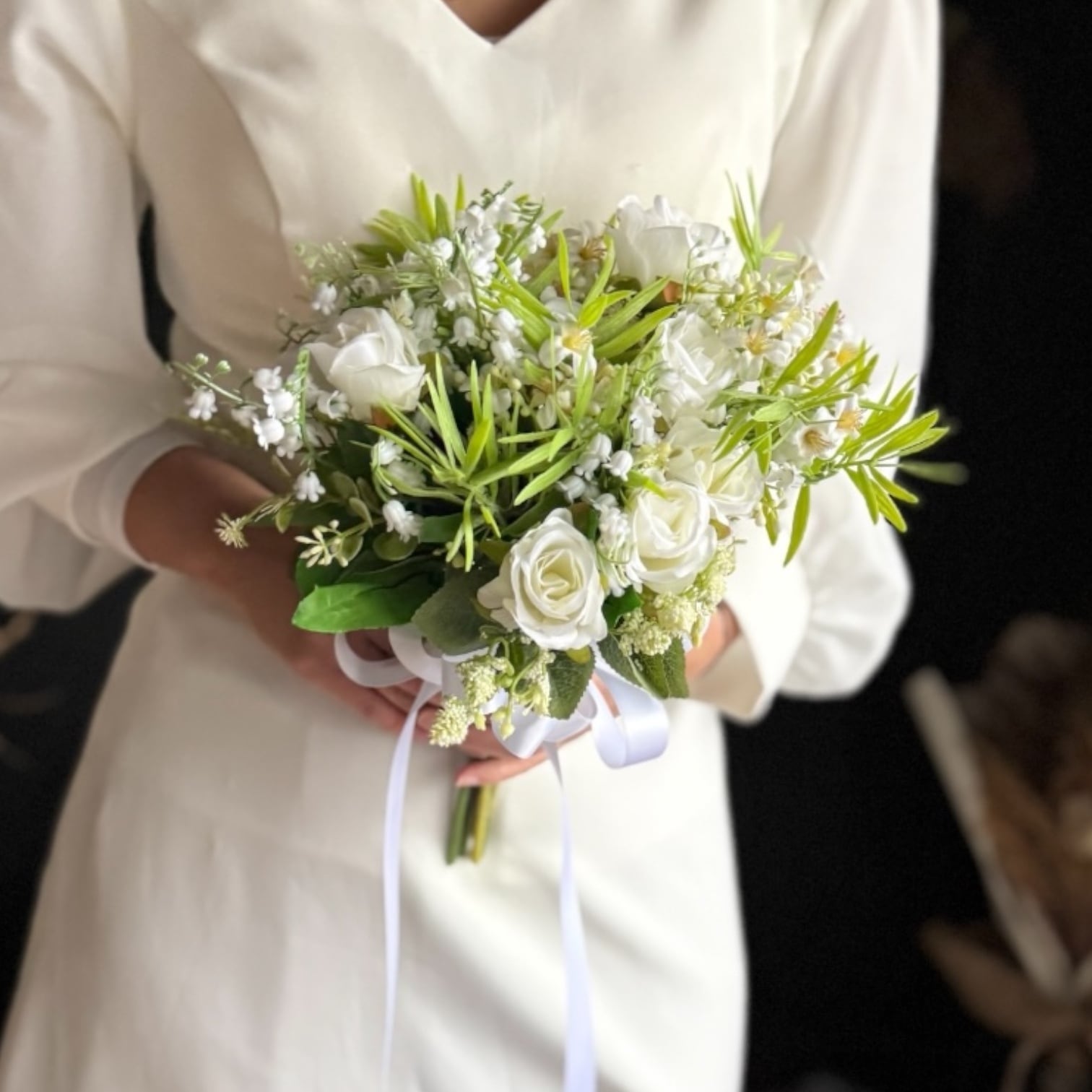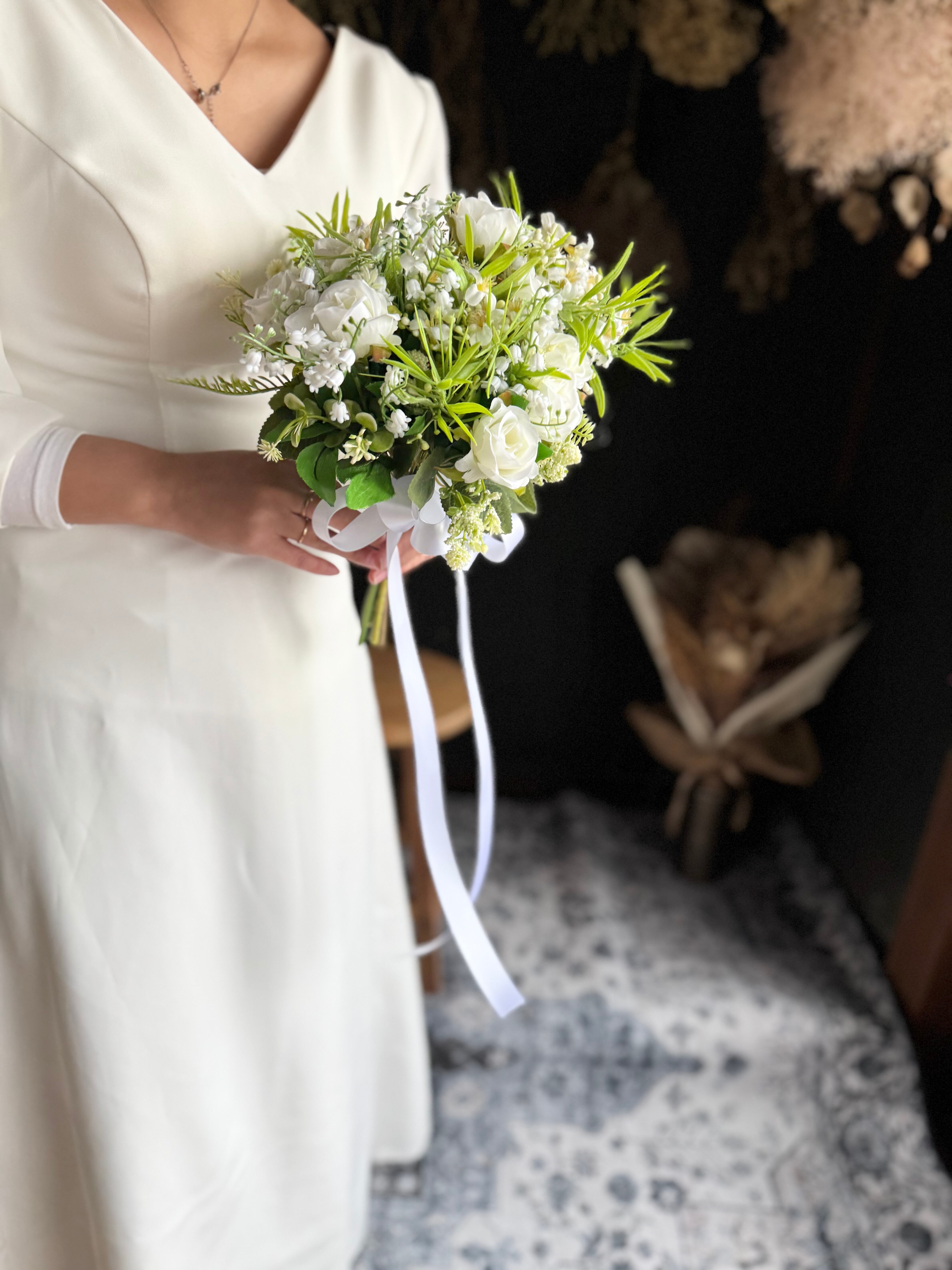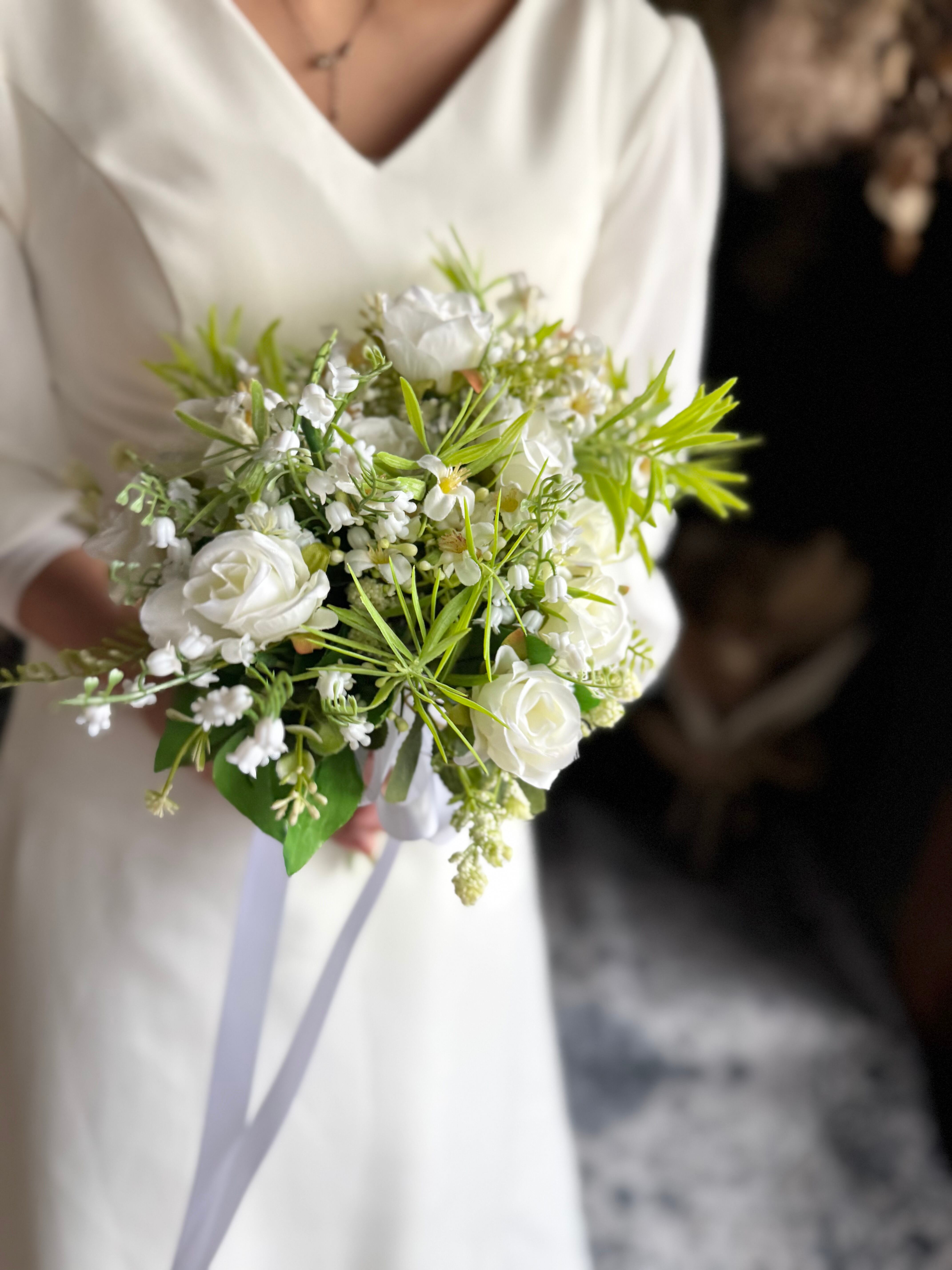 可愛らしい白ミニバラと清らかなスズランのナチュラルな組み合わせが魅力的なウェディングブーケ•*・前撮り・挙式両方にお使いいただけます•*・^ ^