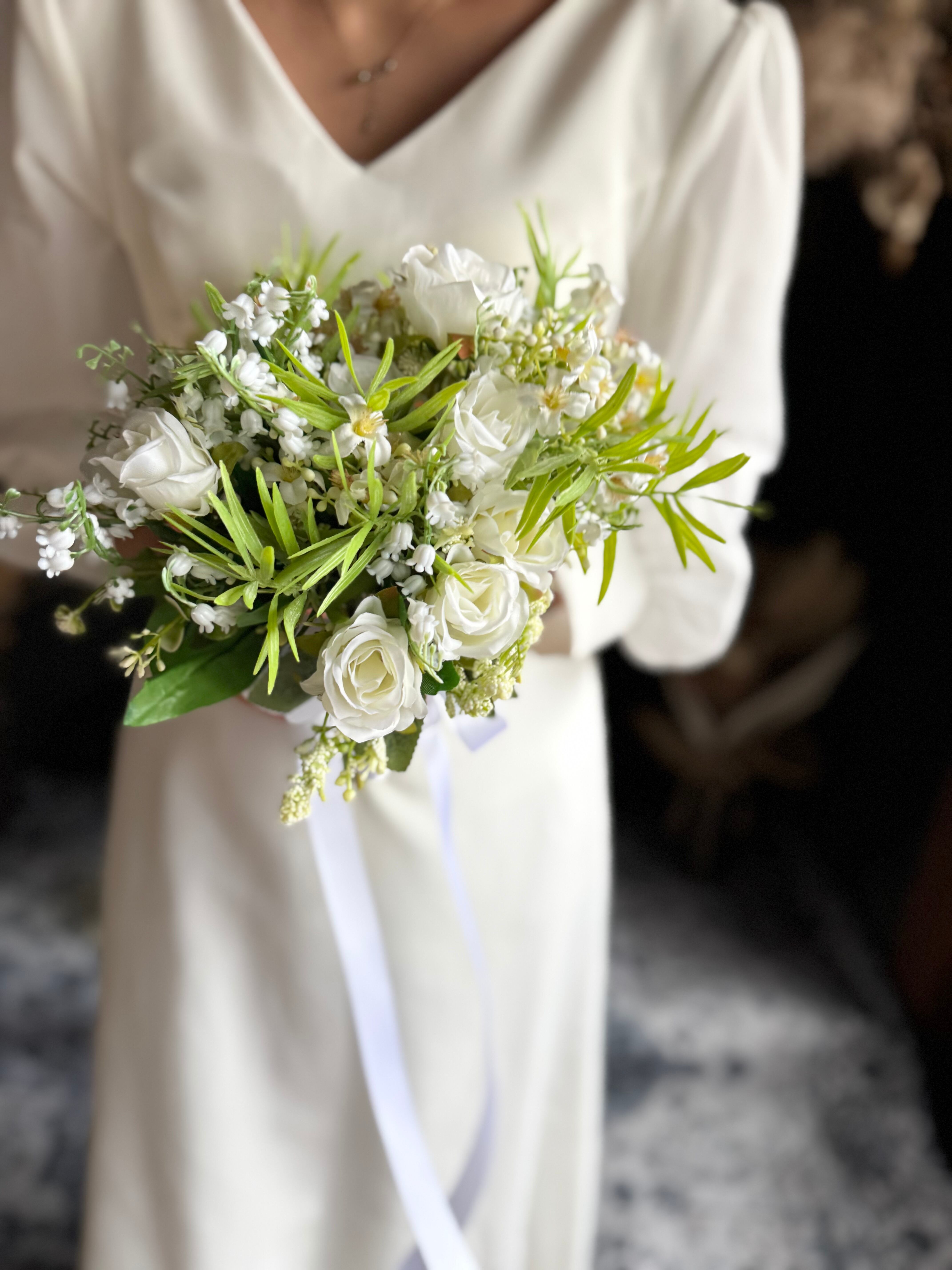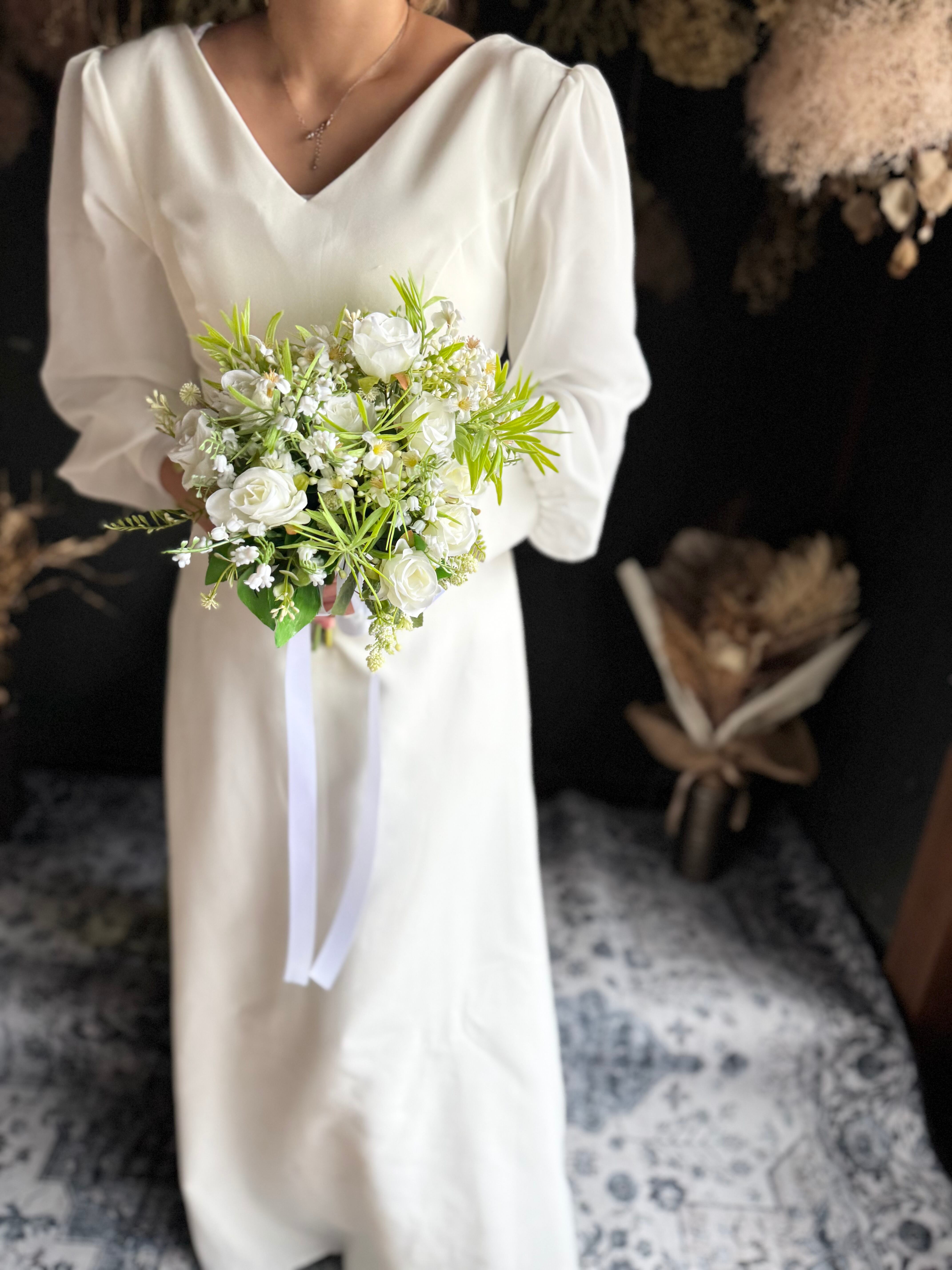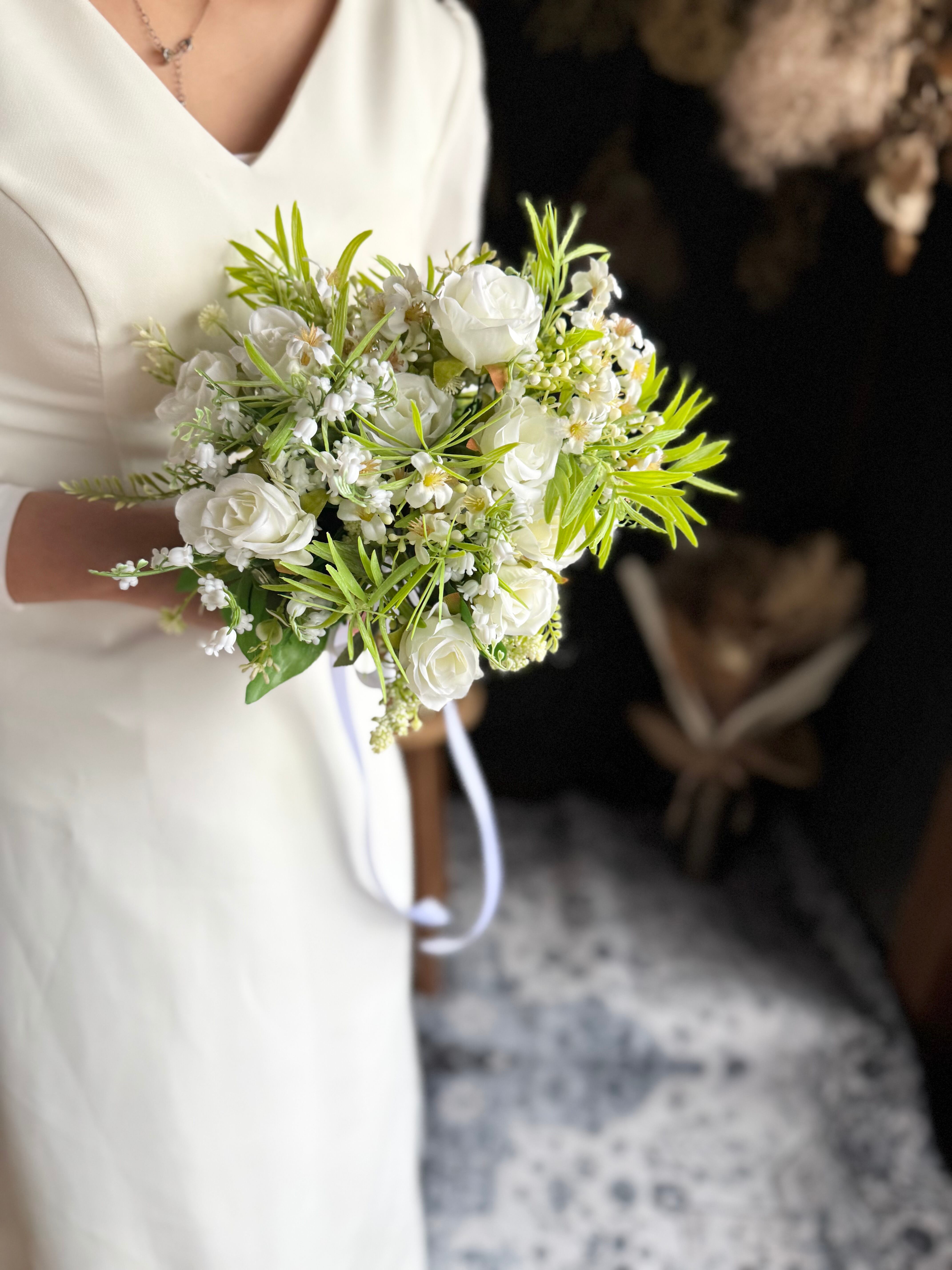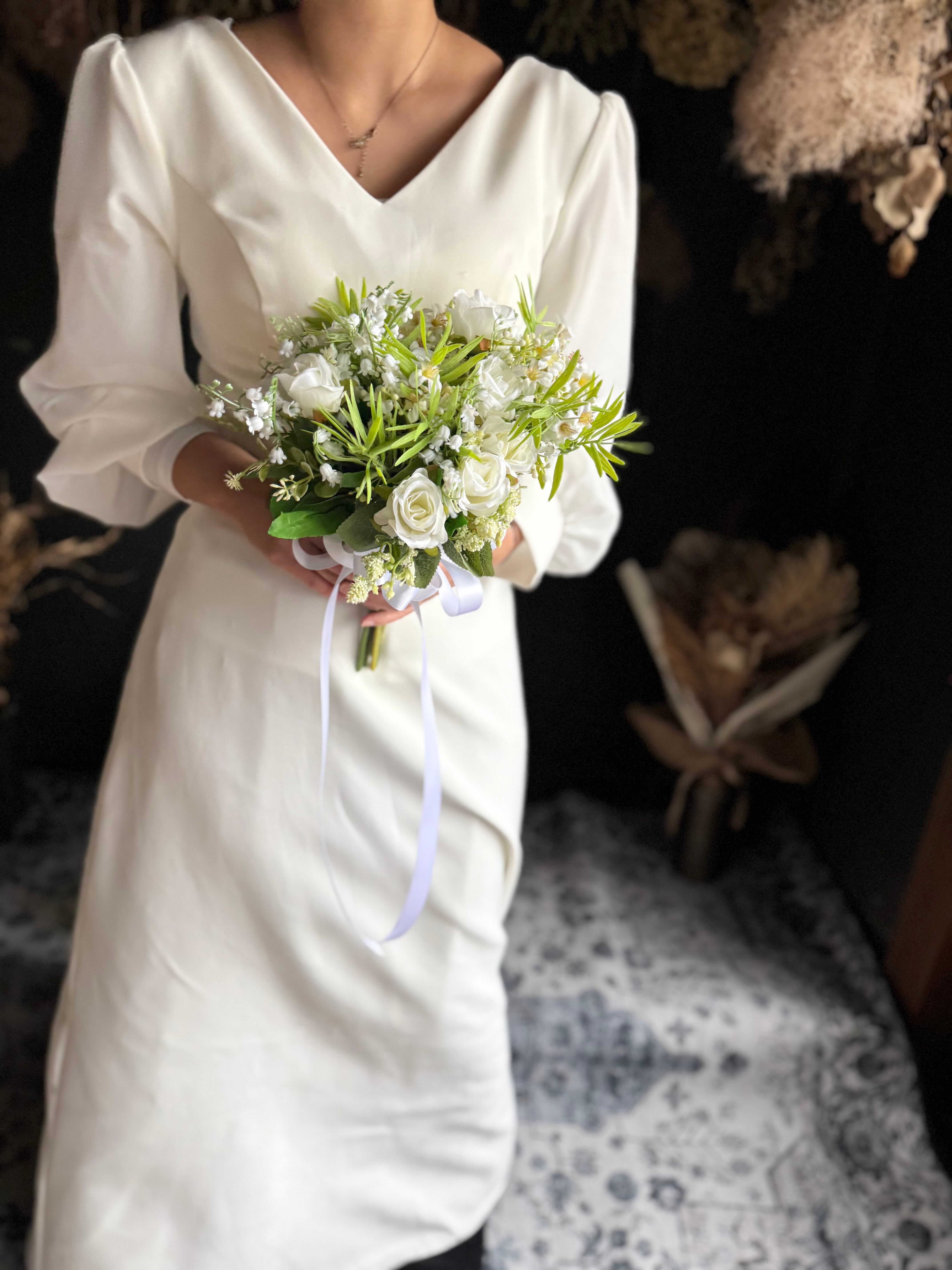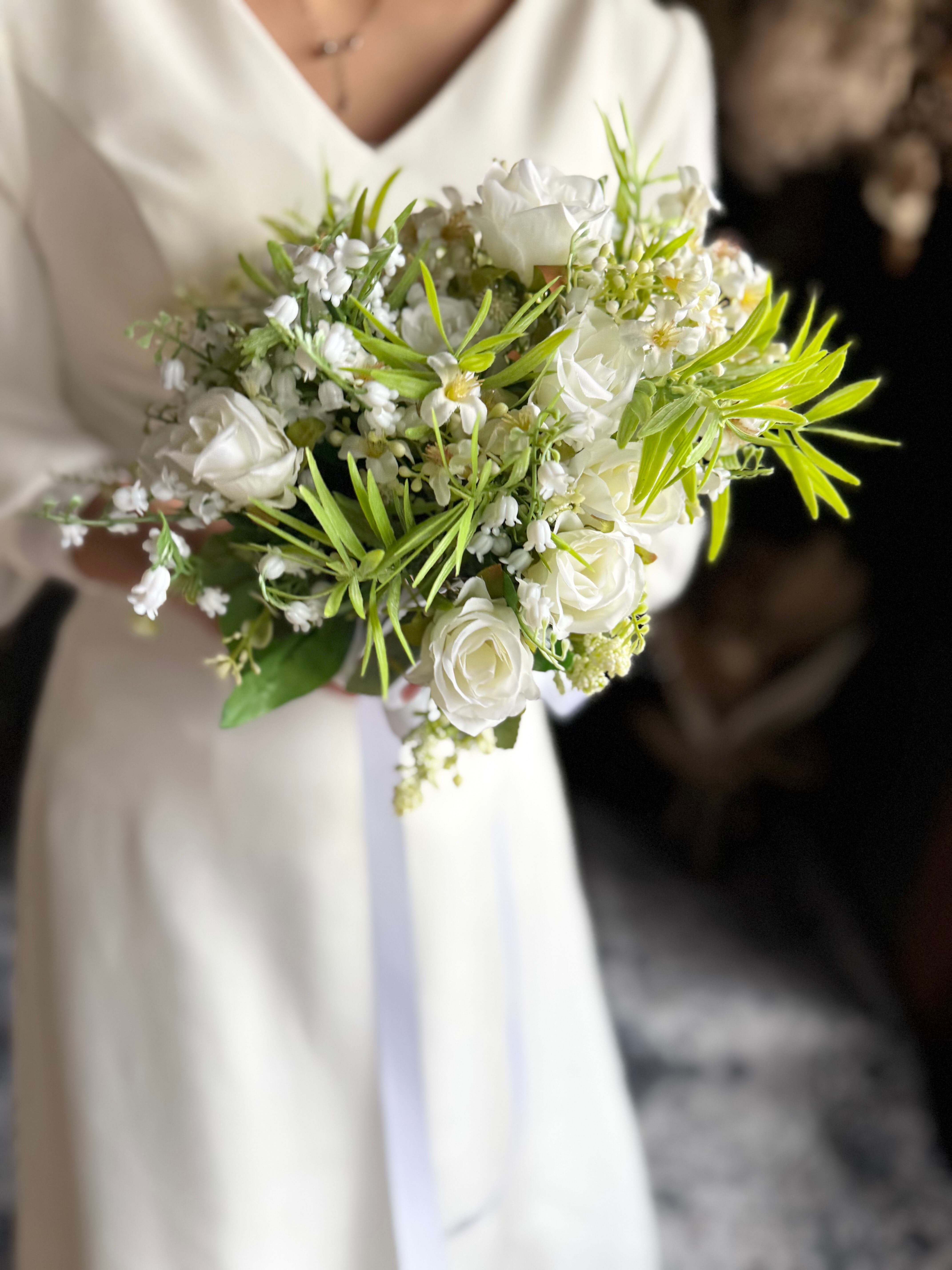 可愛らしい白ミニバラと清らかなスズランのナチュラルな組み合わせが魅力的なウェディングブーケ•*・前撮り・挙式両方にお使いいただけます•*・^ ^
