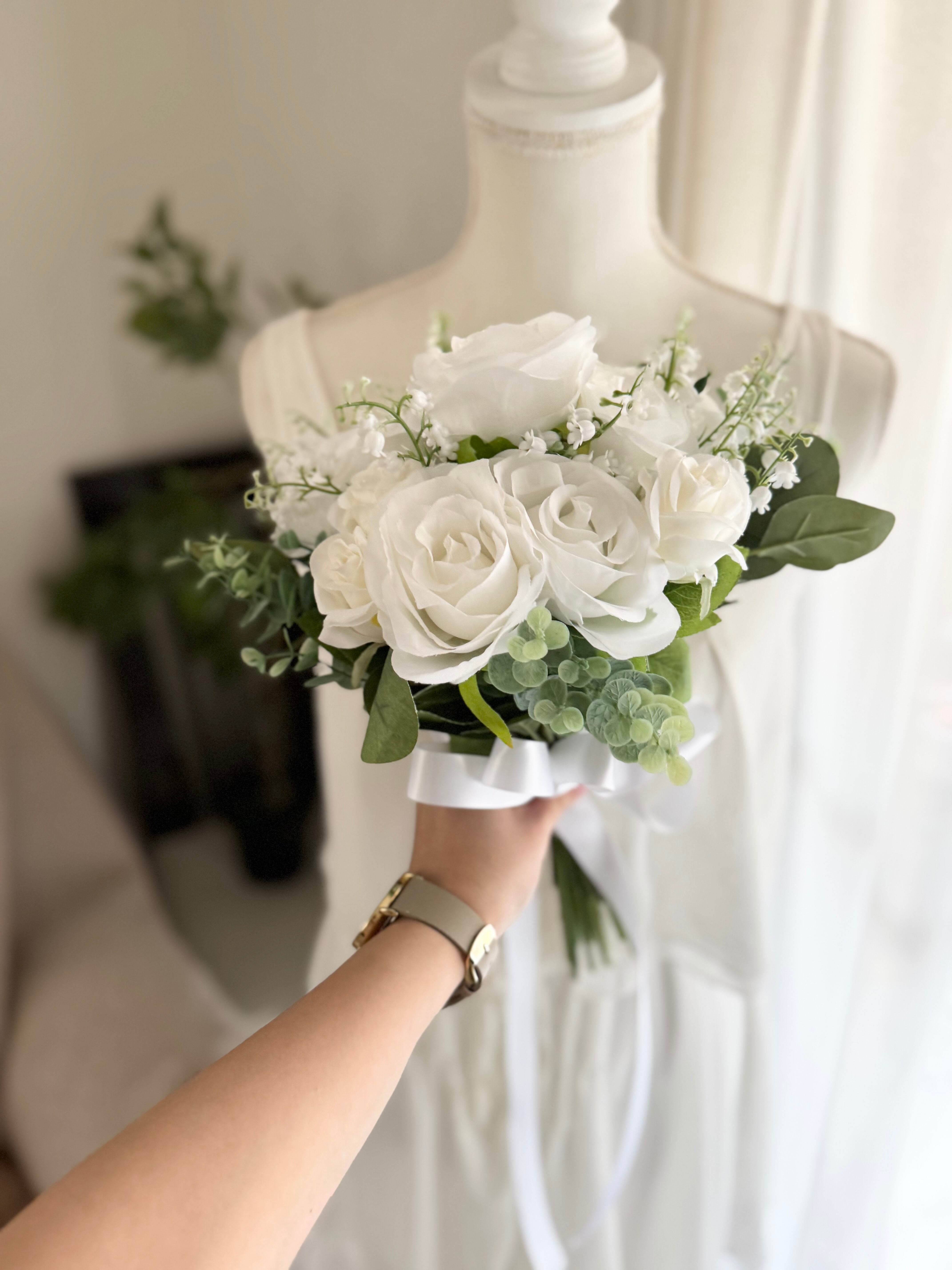 エレガントな白バラと清らかなスズランで、気品あふれる素敵な組み合わせが魅力的なウェディングブーケ•*・前撮り・挙式両方にお使いいただけます•*・^ ^