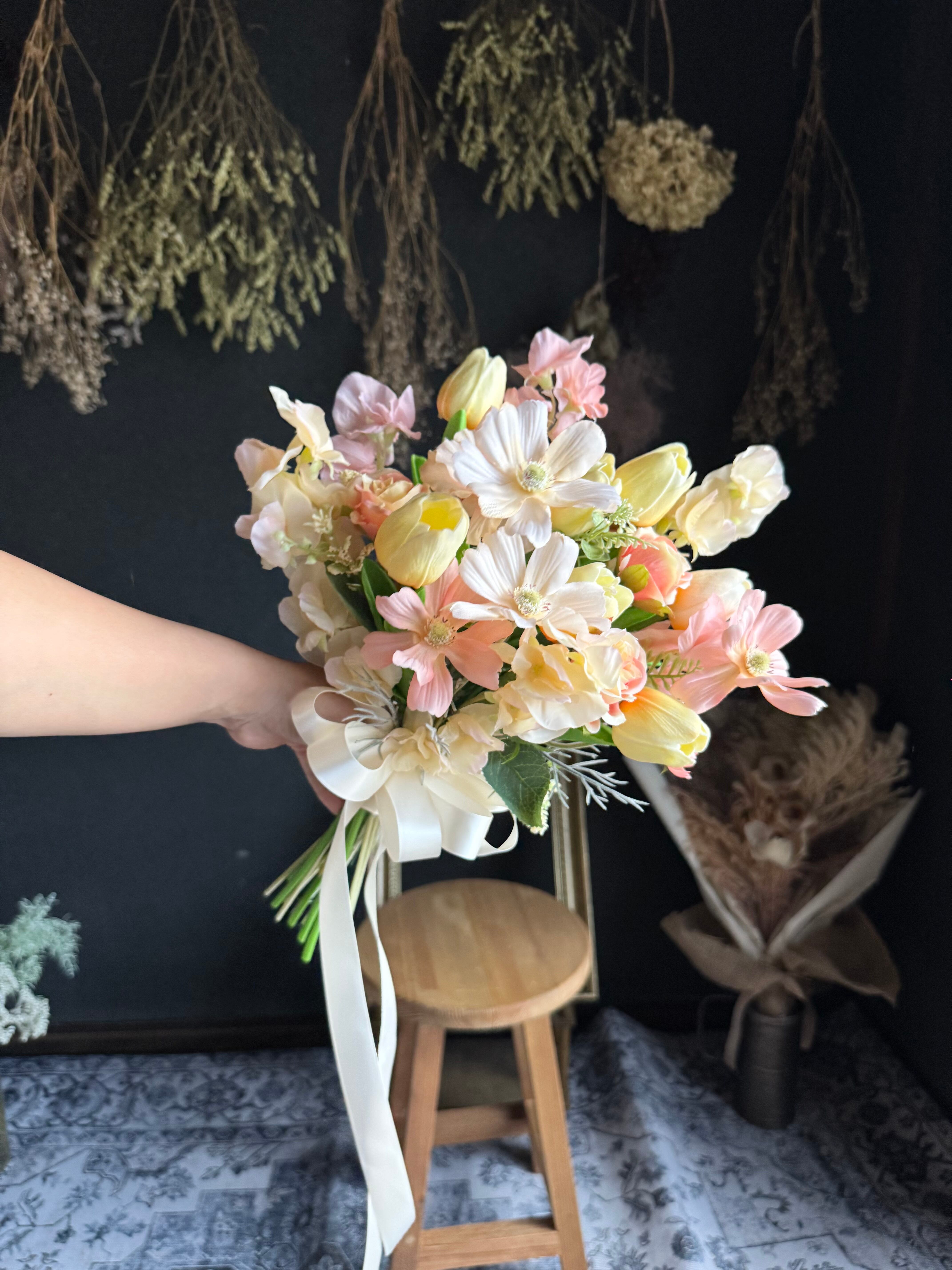 チューリップやコスモス・小花をバランスよく束ね、ボリューム感を持たせながらも上品で甘すぎない印象に。
