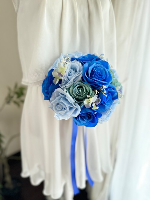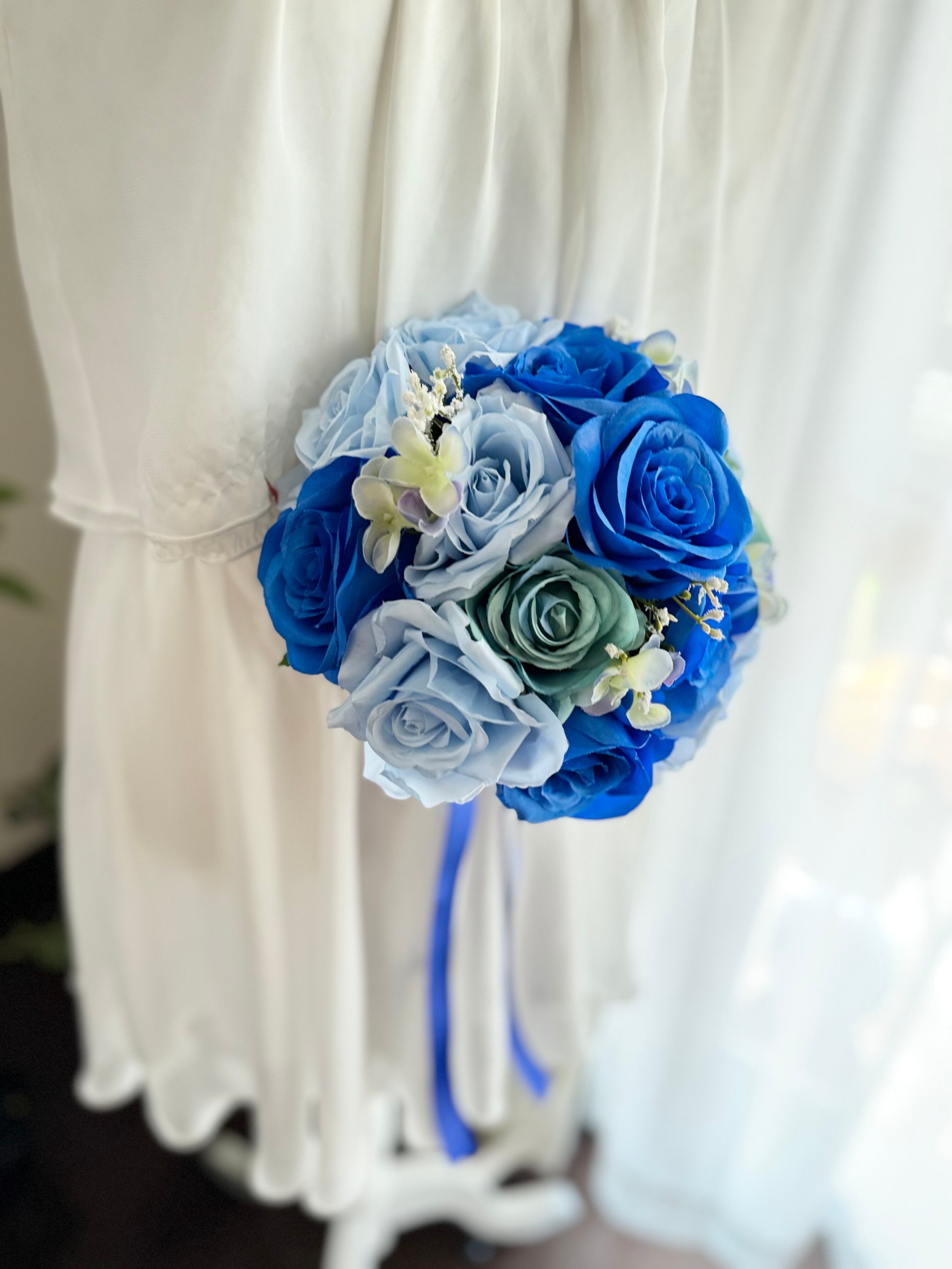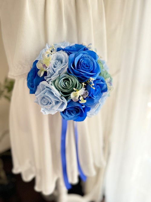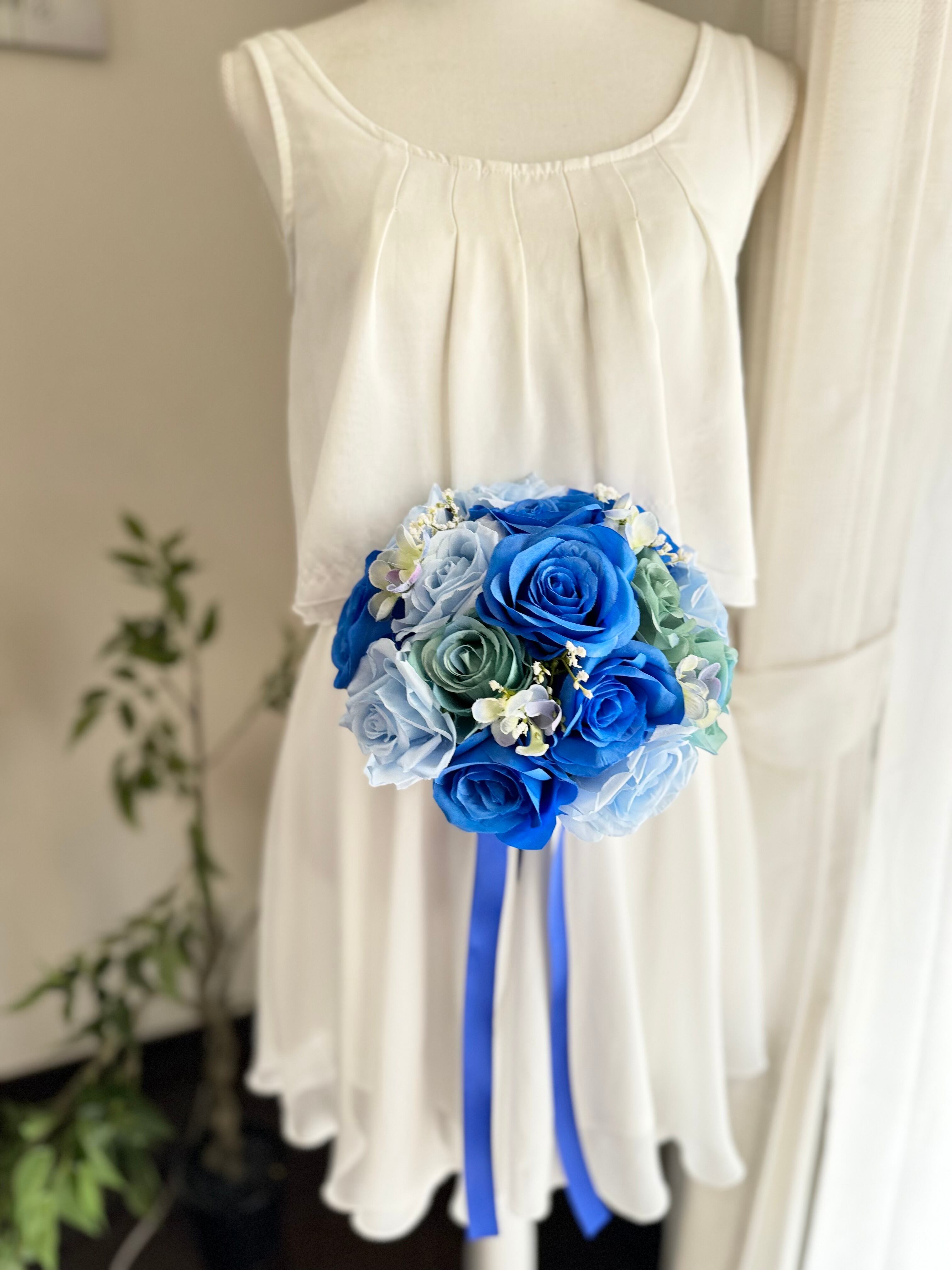 海やリゾートウェディングにぴったりで、青い海と緑の大地を背景に撮影した写真も素敵なラウンドブーケです♪ 鮮やかなブルーが花嫁様を一際華やかに演出します♪