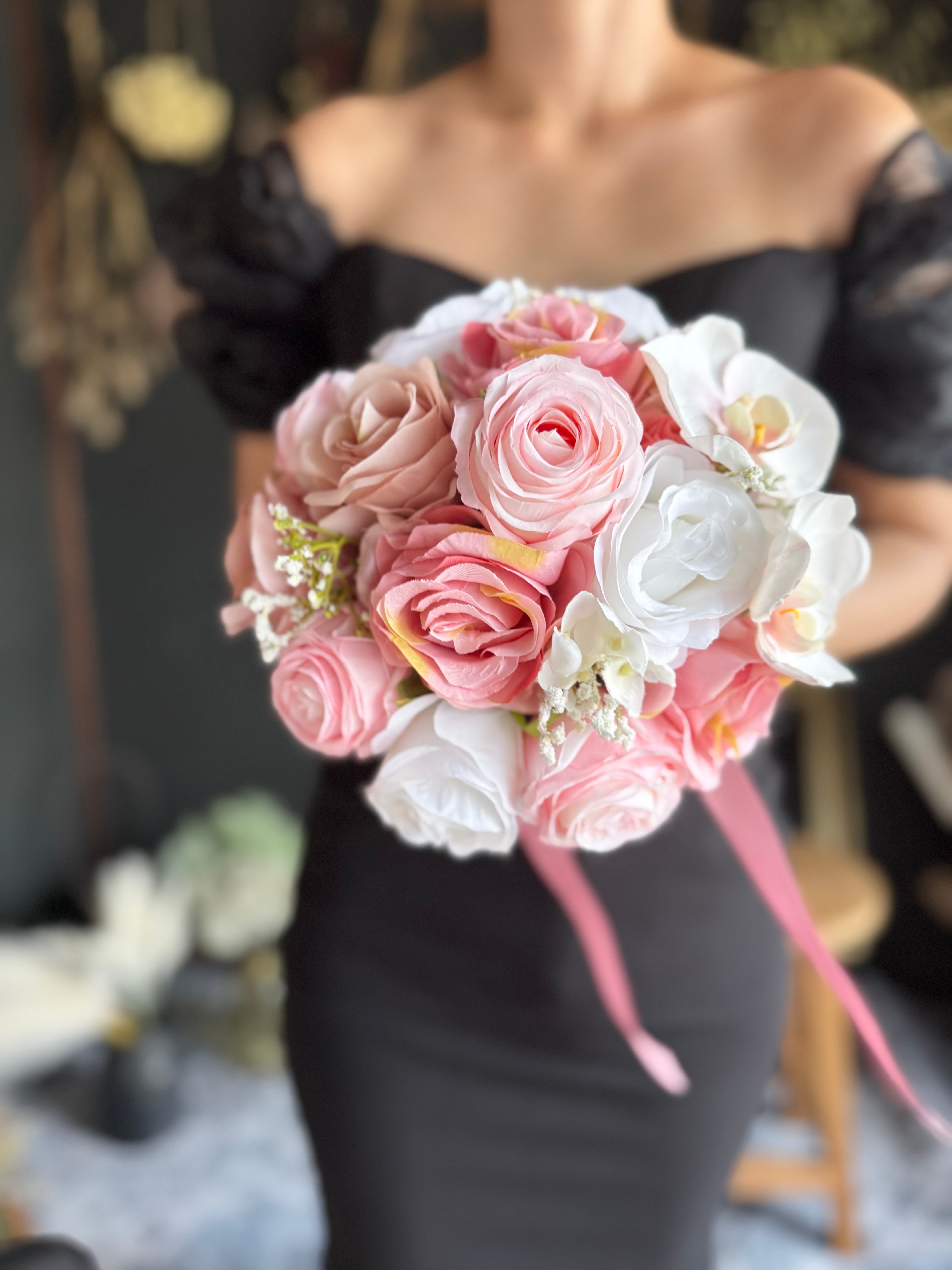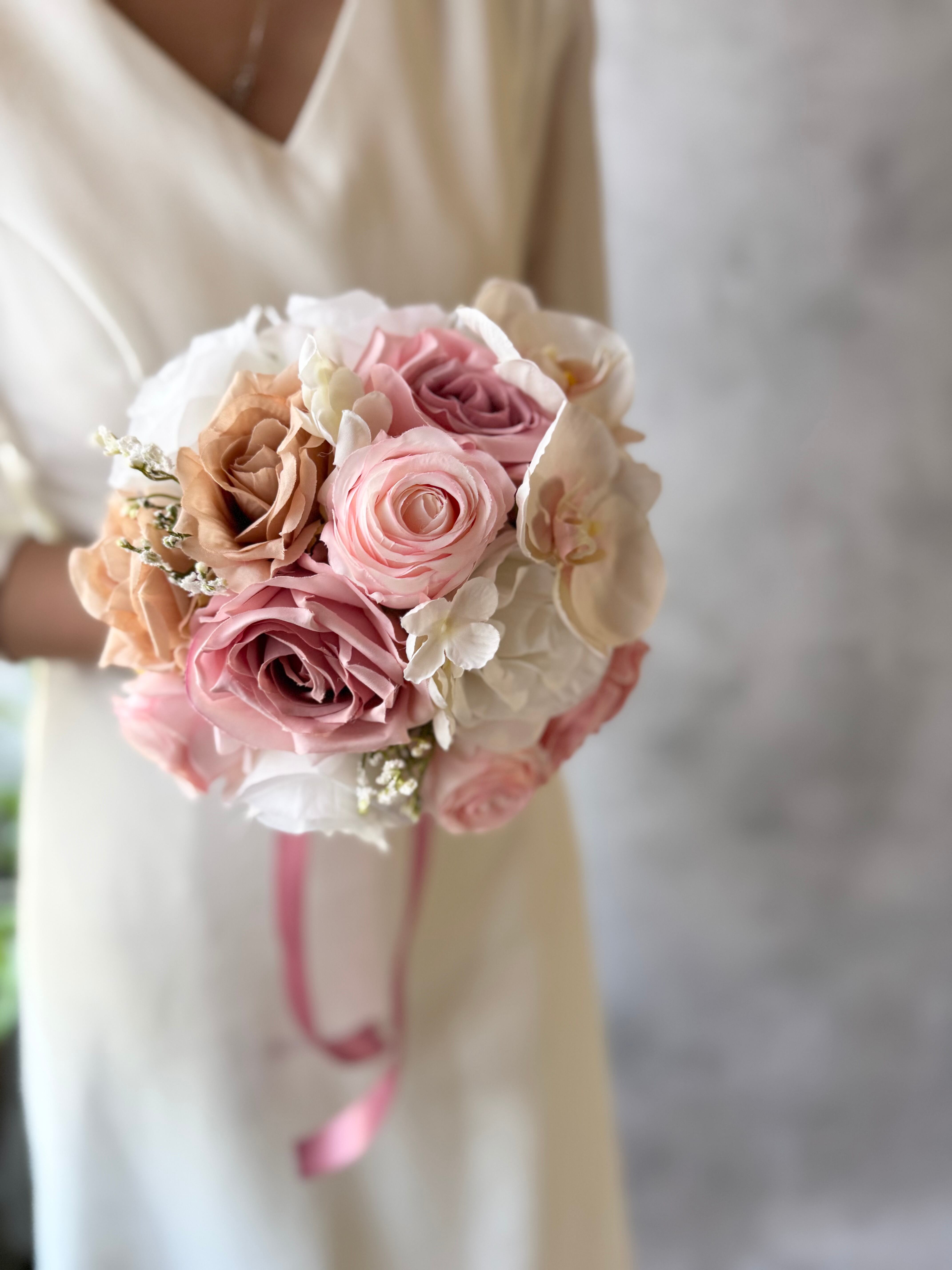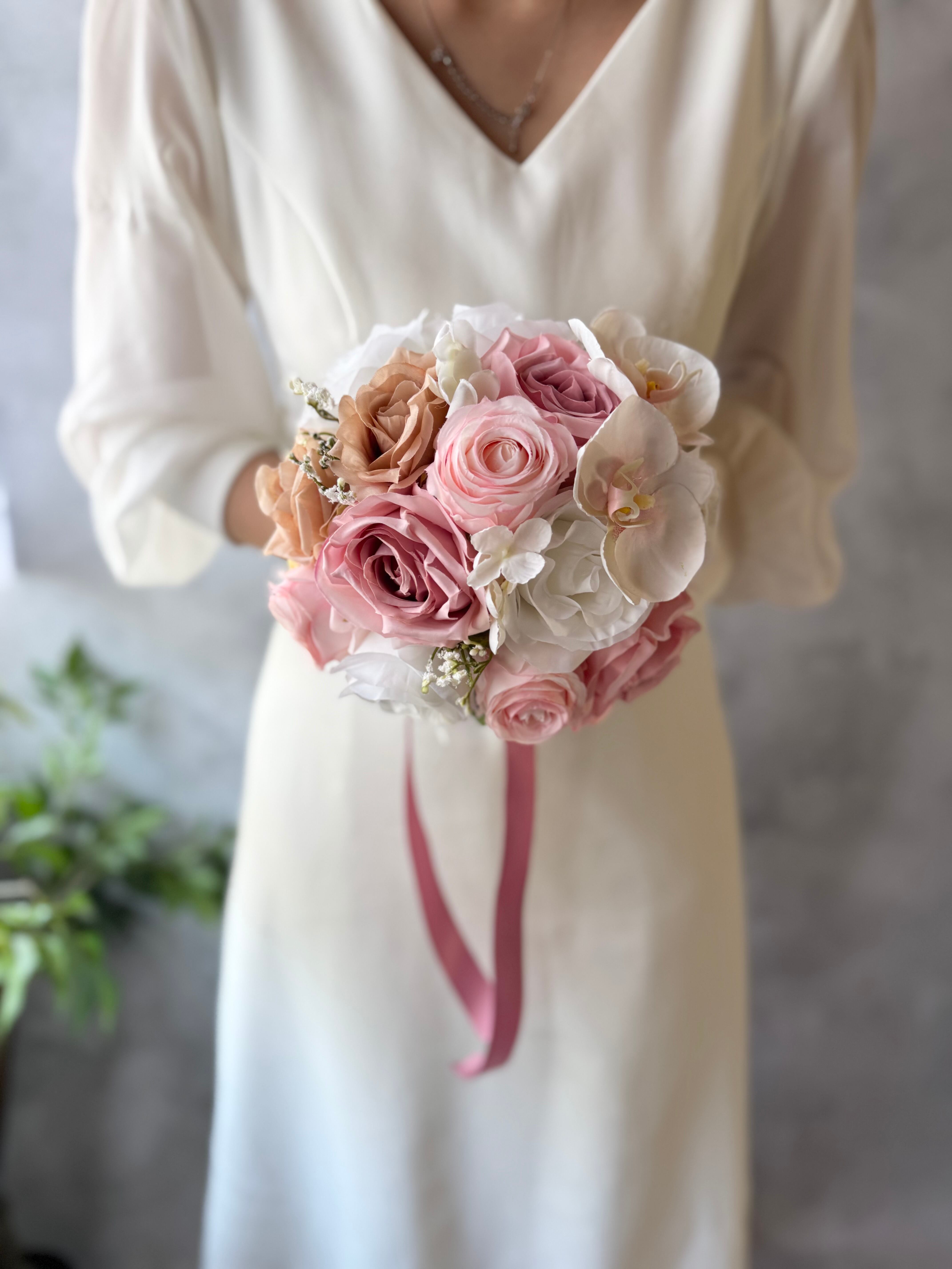 華やかでありながら上品な印象があるので可愛くなりすぎない♪くすみピンク、大人可愛いピンク色が印象的ブーケです^ ^