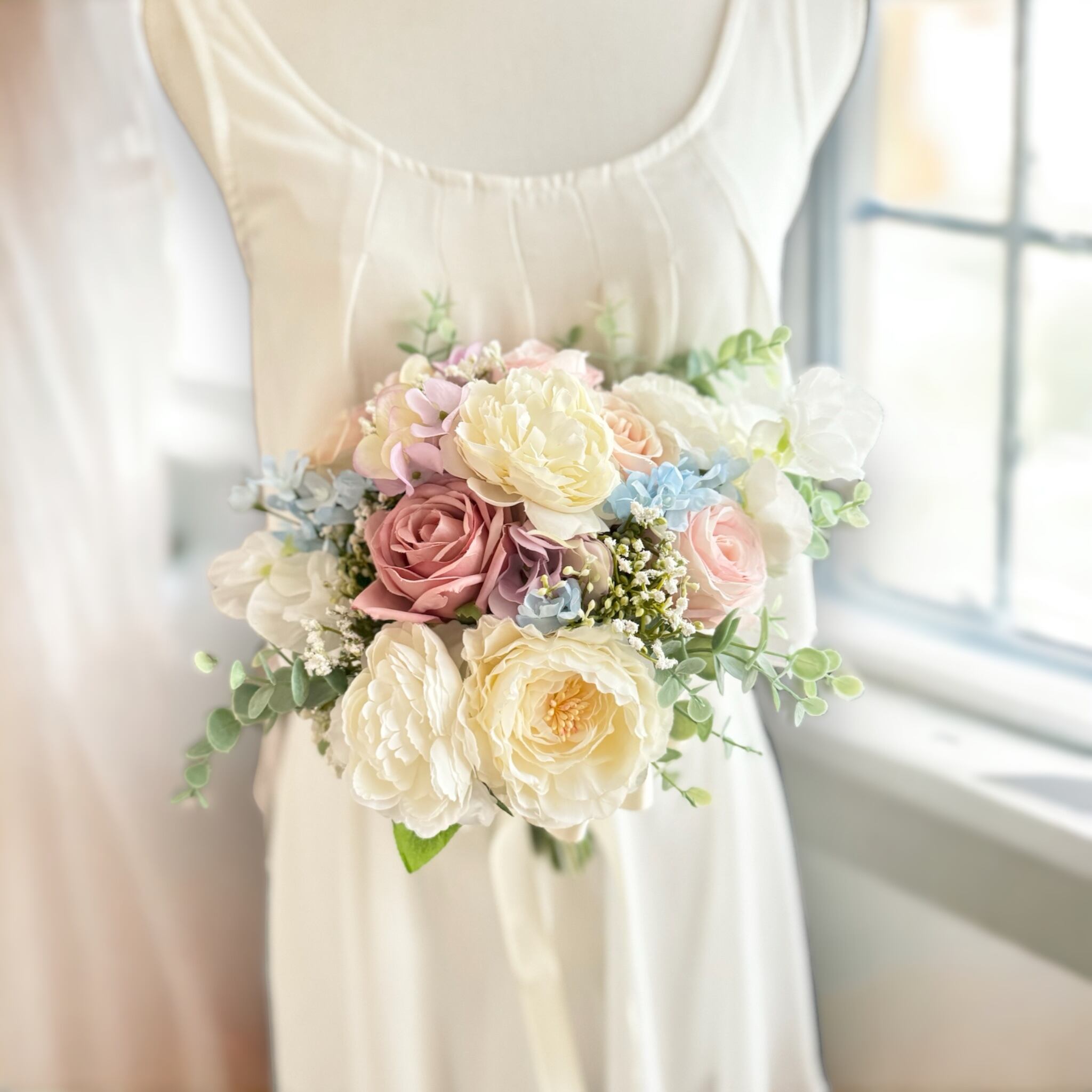 バラや小花をナチュラルに束ねた可愛いクラッチブーケ•*・シックなアイボリーに可愛いピンクや水色を組み合わせた、兼用ブーケとしても使いやすい特別な日を彩るウェディングブーケ