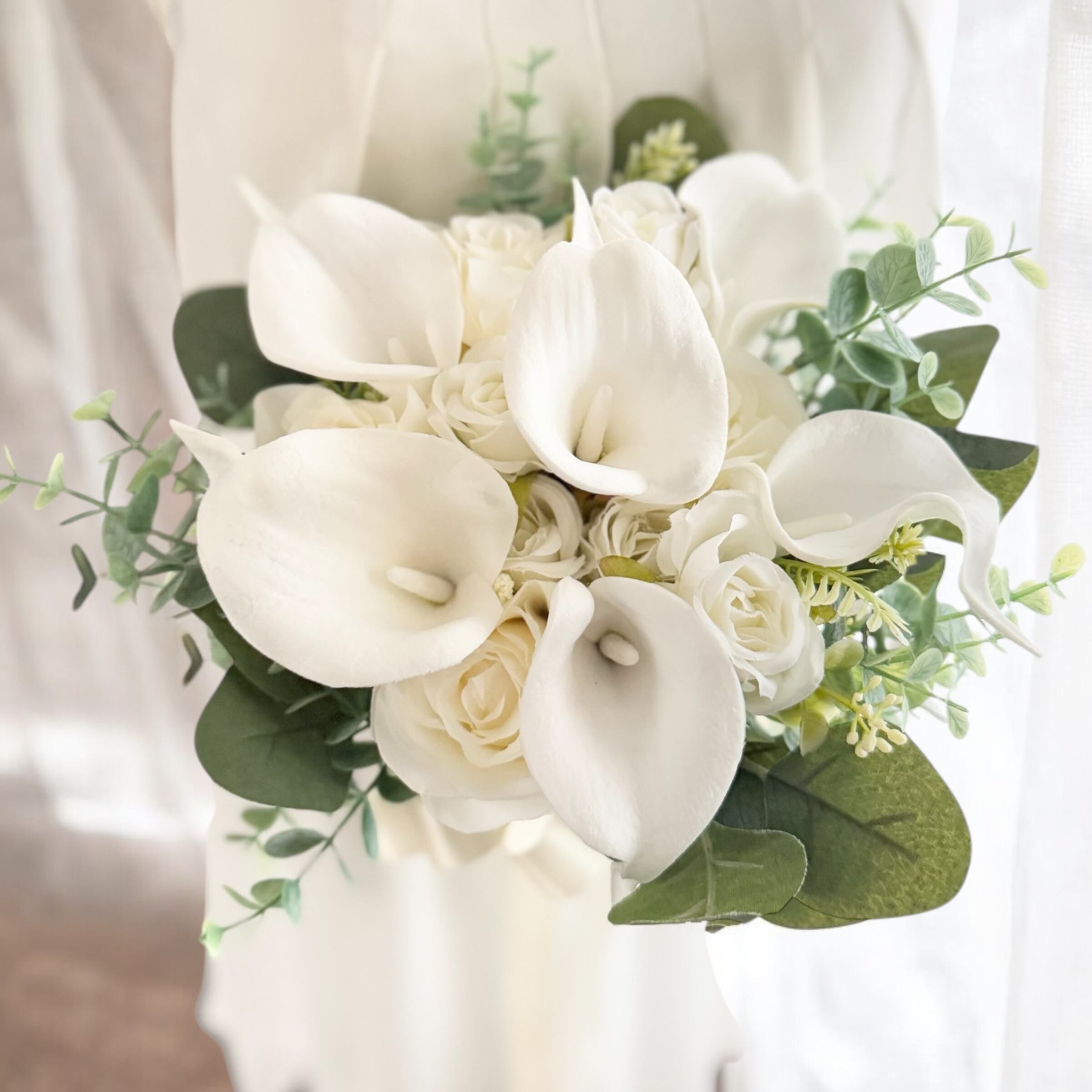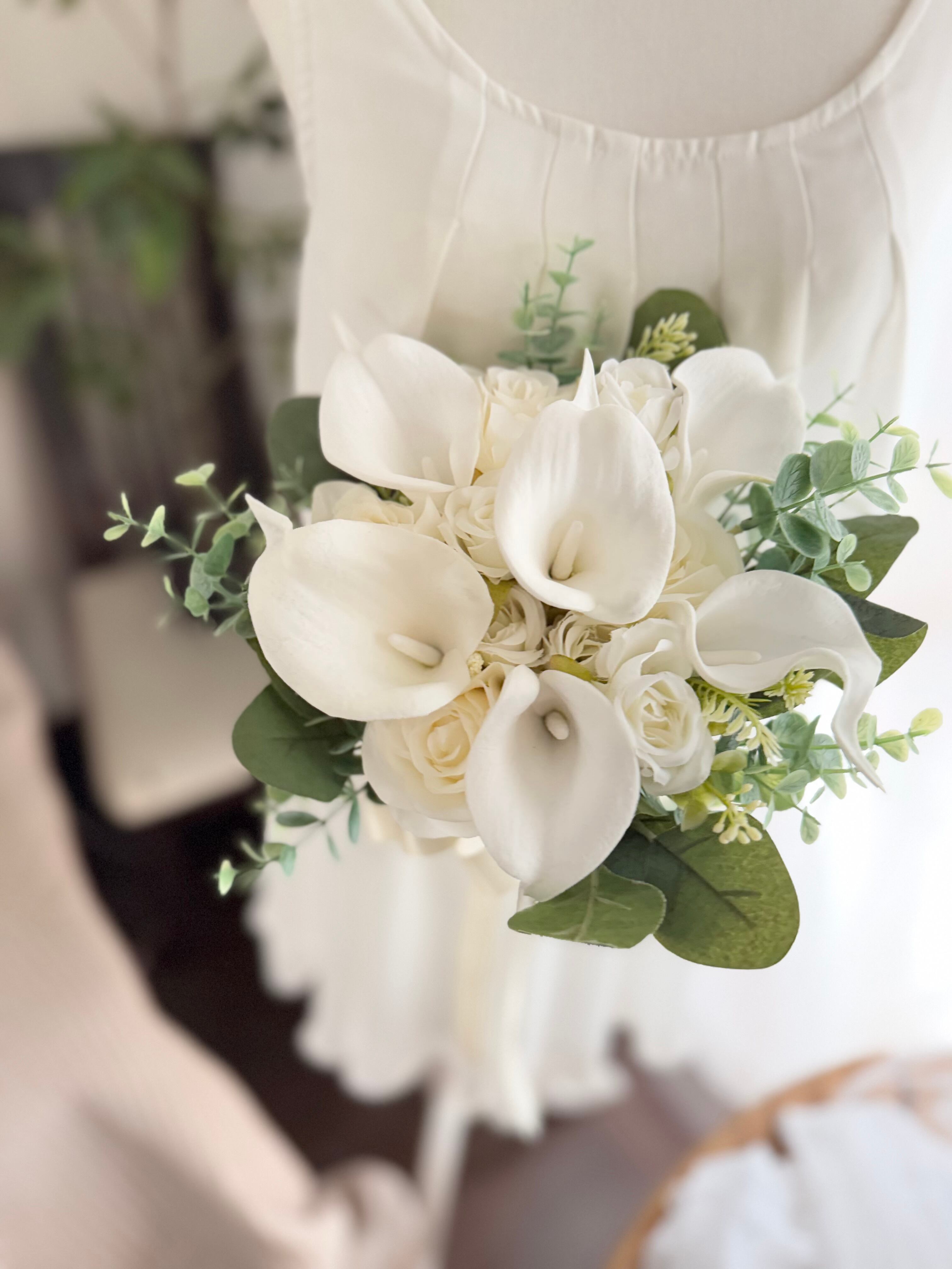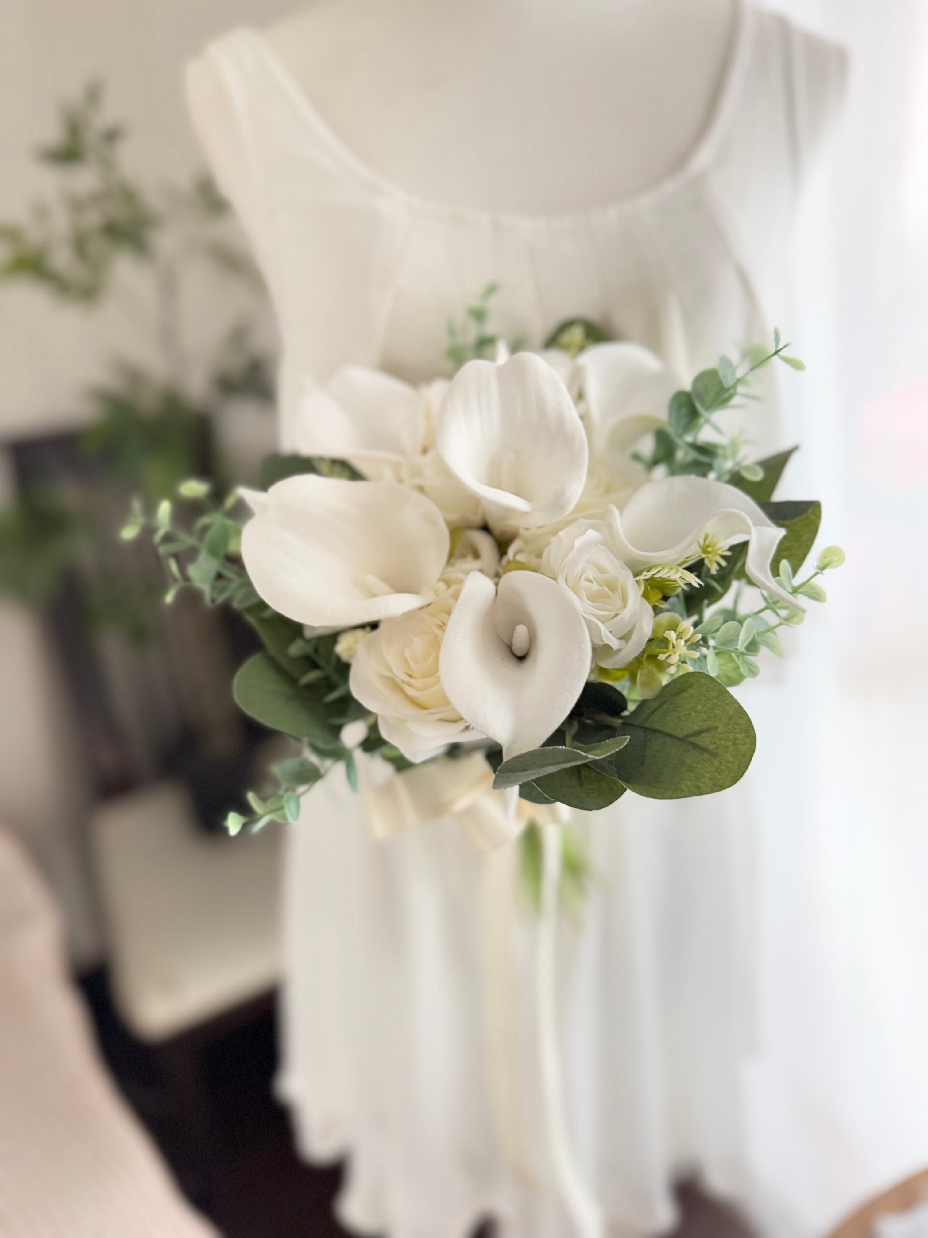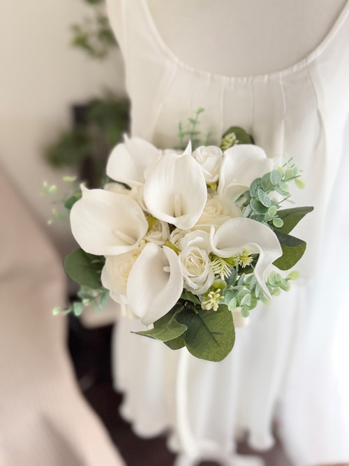 カラーとアイボリーのバラとミニバラを可愛らしく束ねた花束ブーケ♪花嫁様をエレガントに美しく演出してくれるアイテムです^ ^