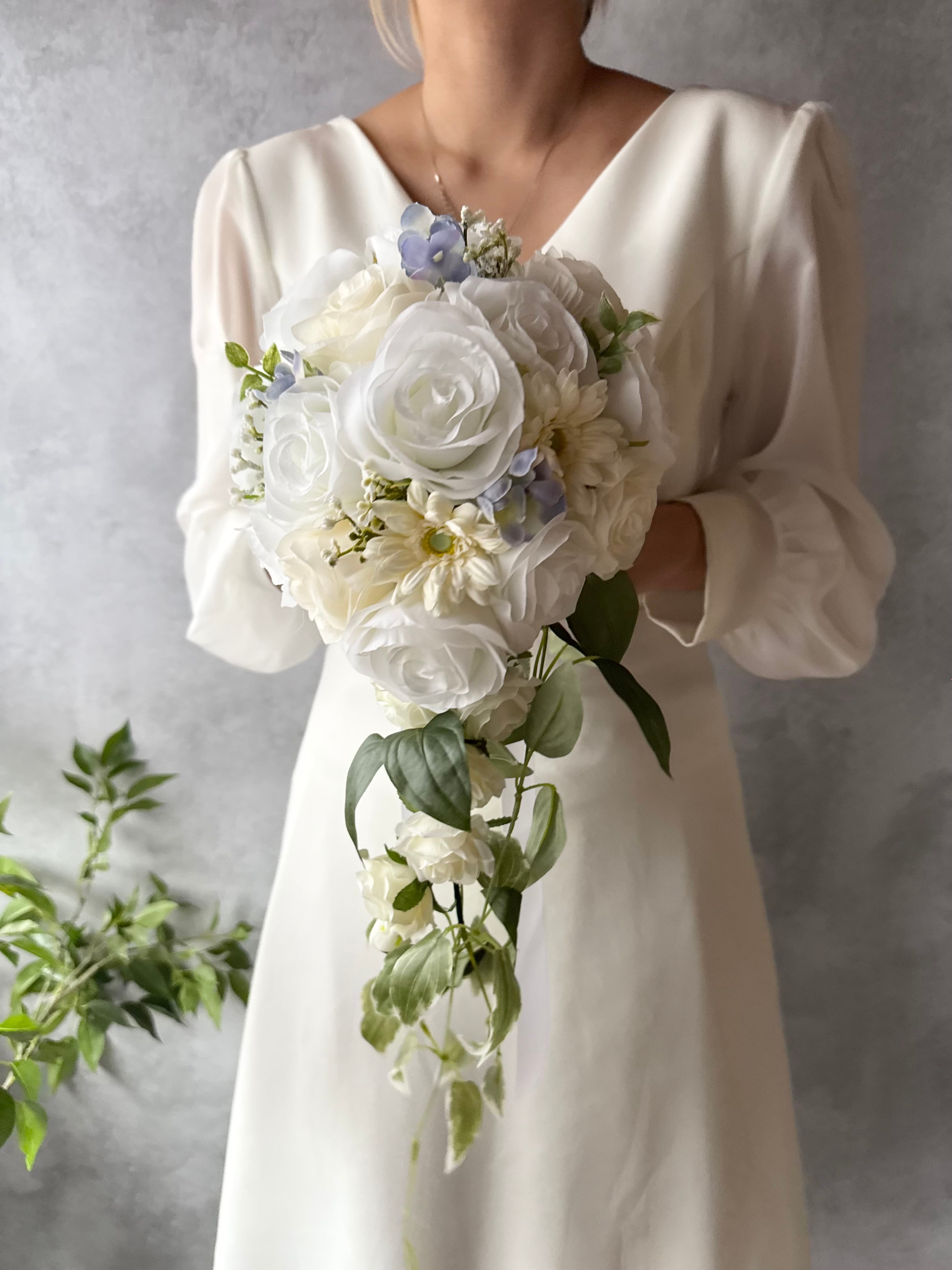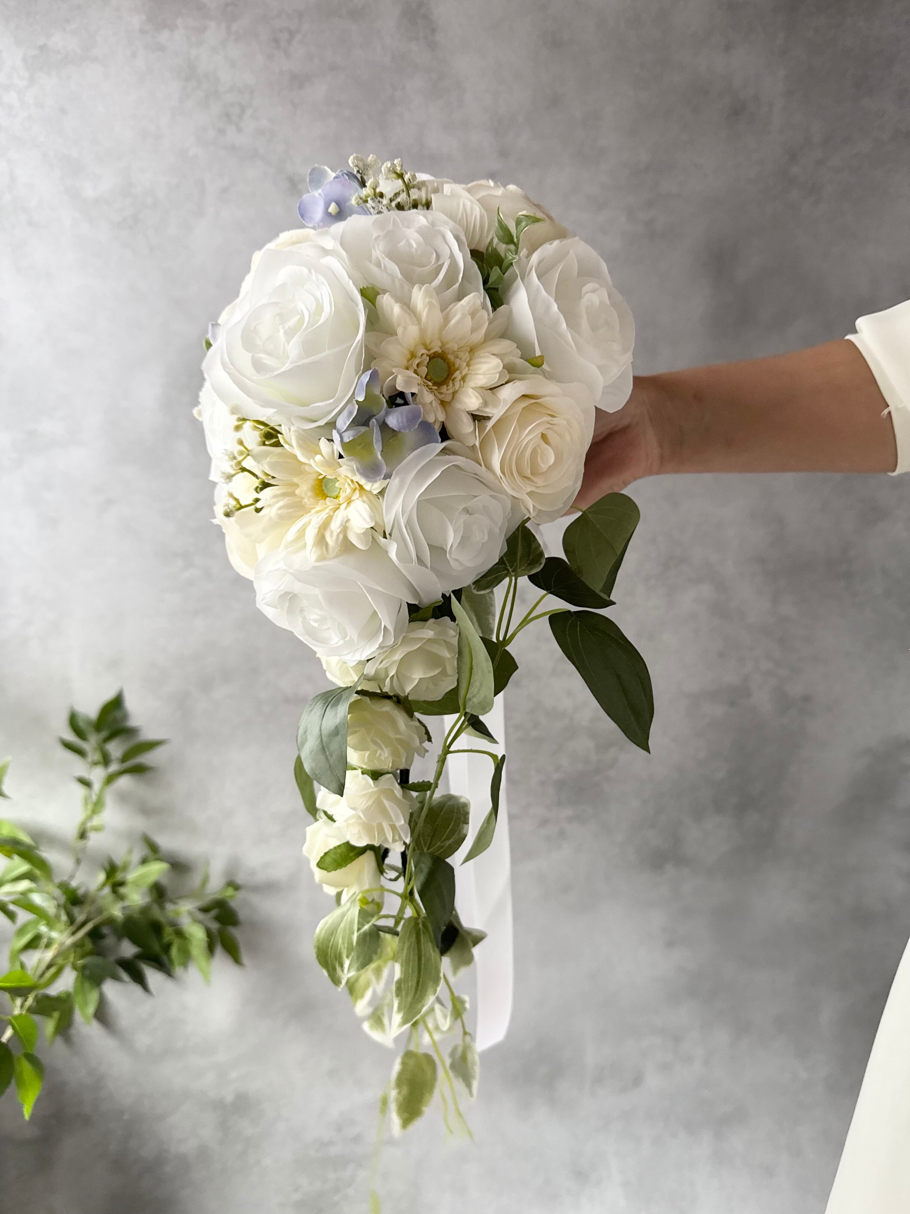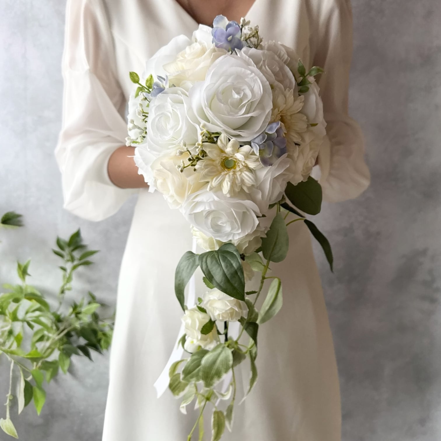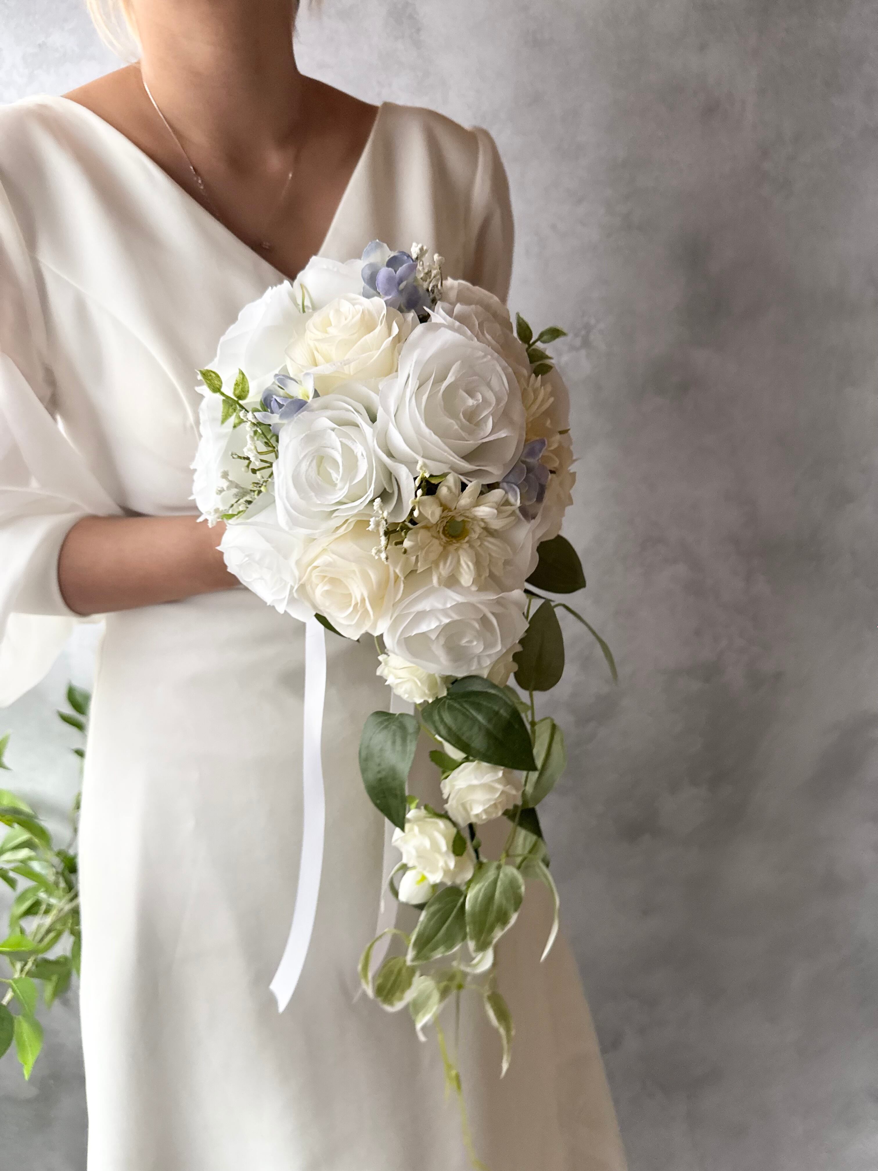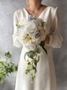 上品なホワイトローズを中心に、ナチュラルなガーベラや小花を優しく束ねたキャスケードブーケ。