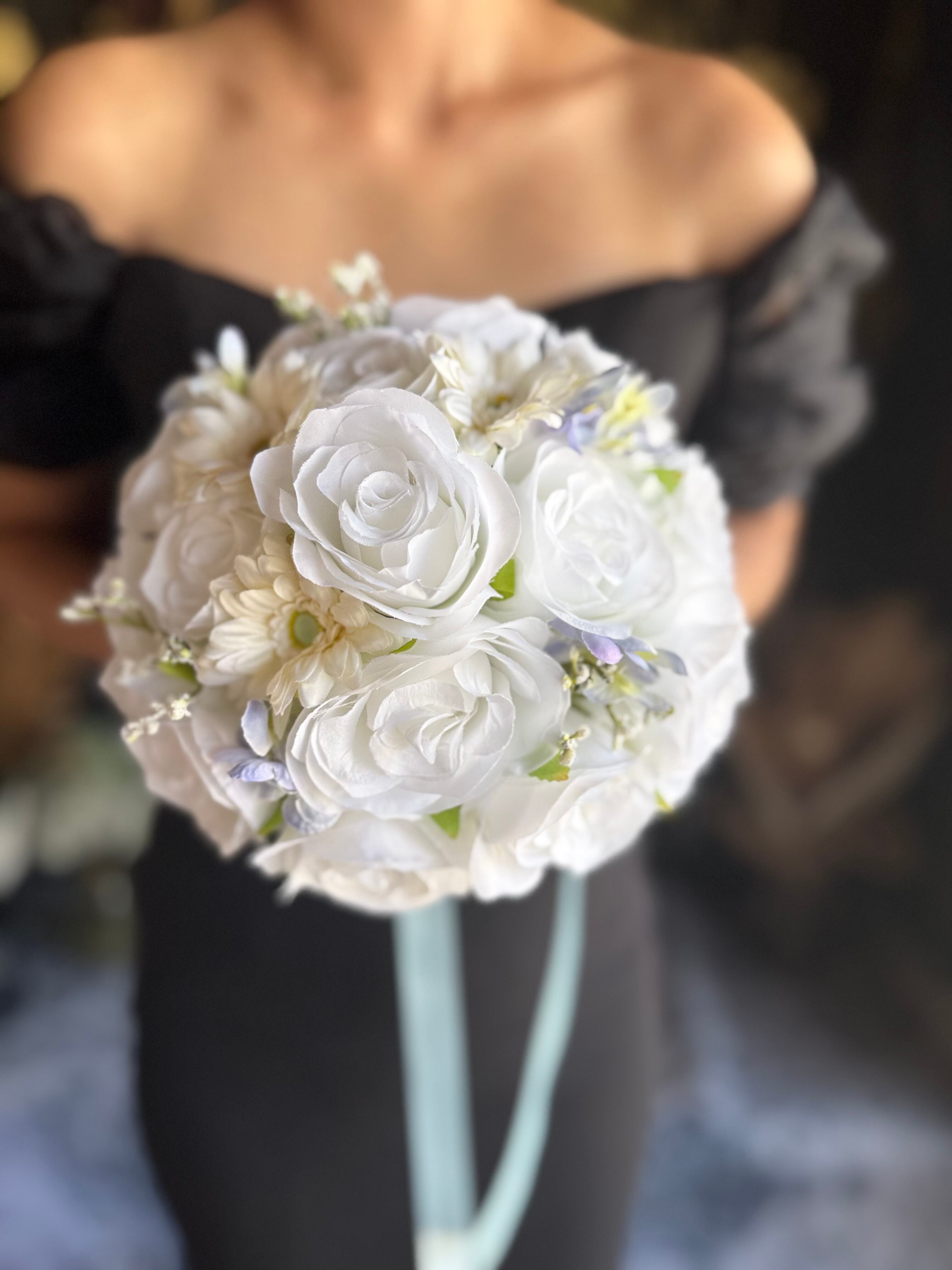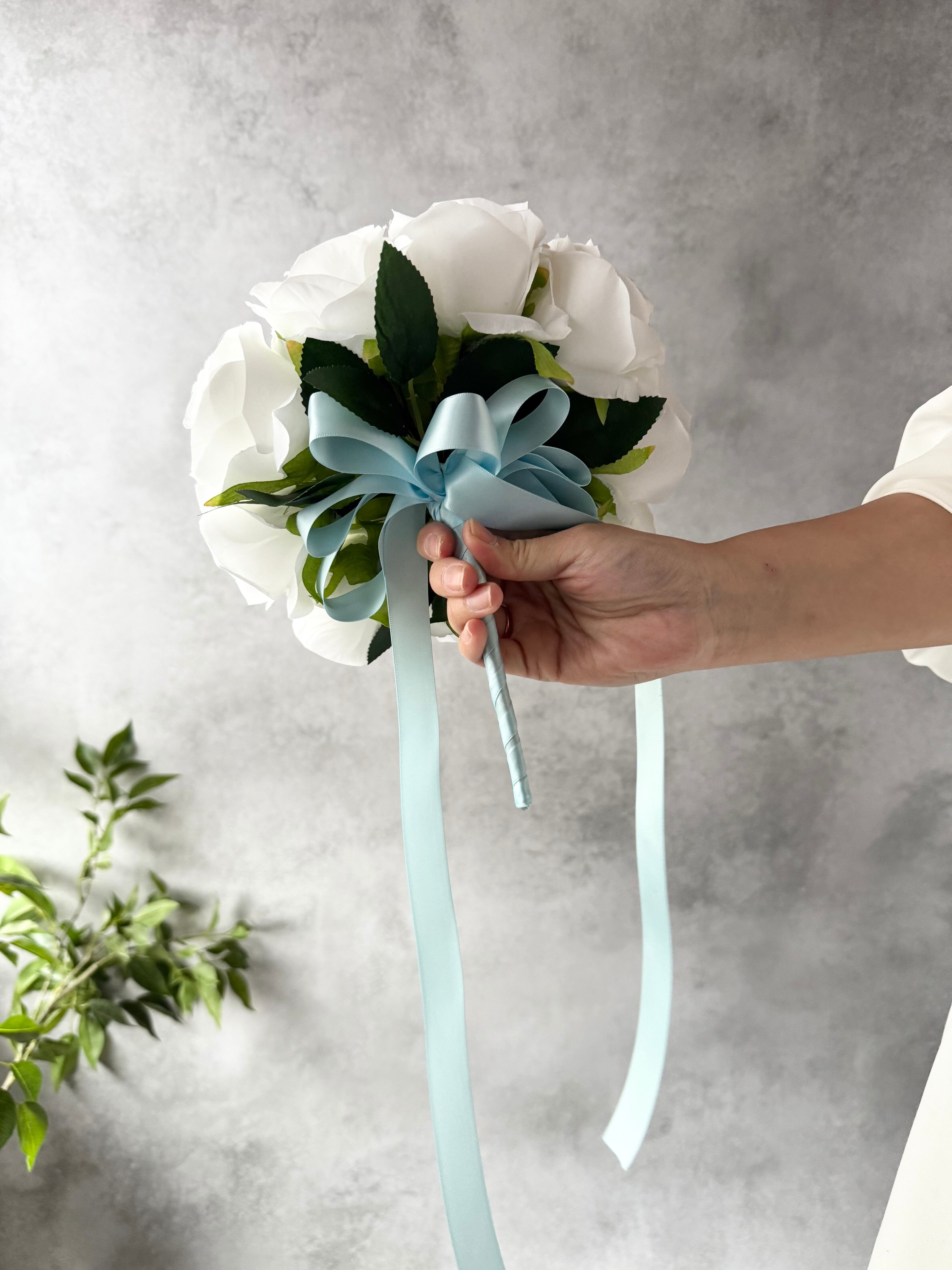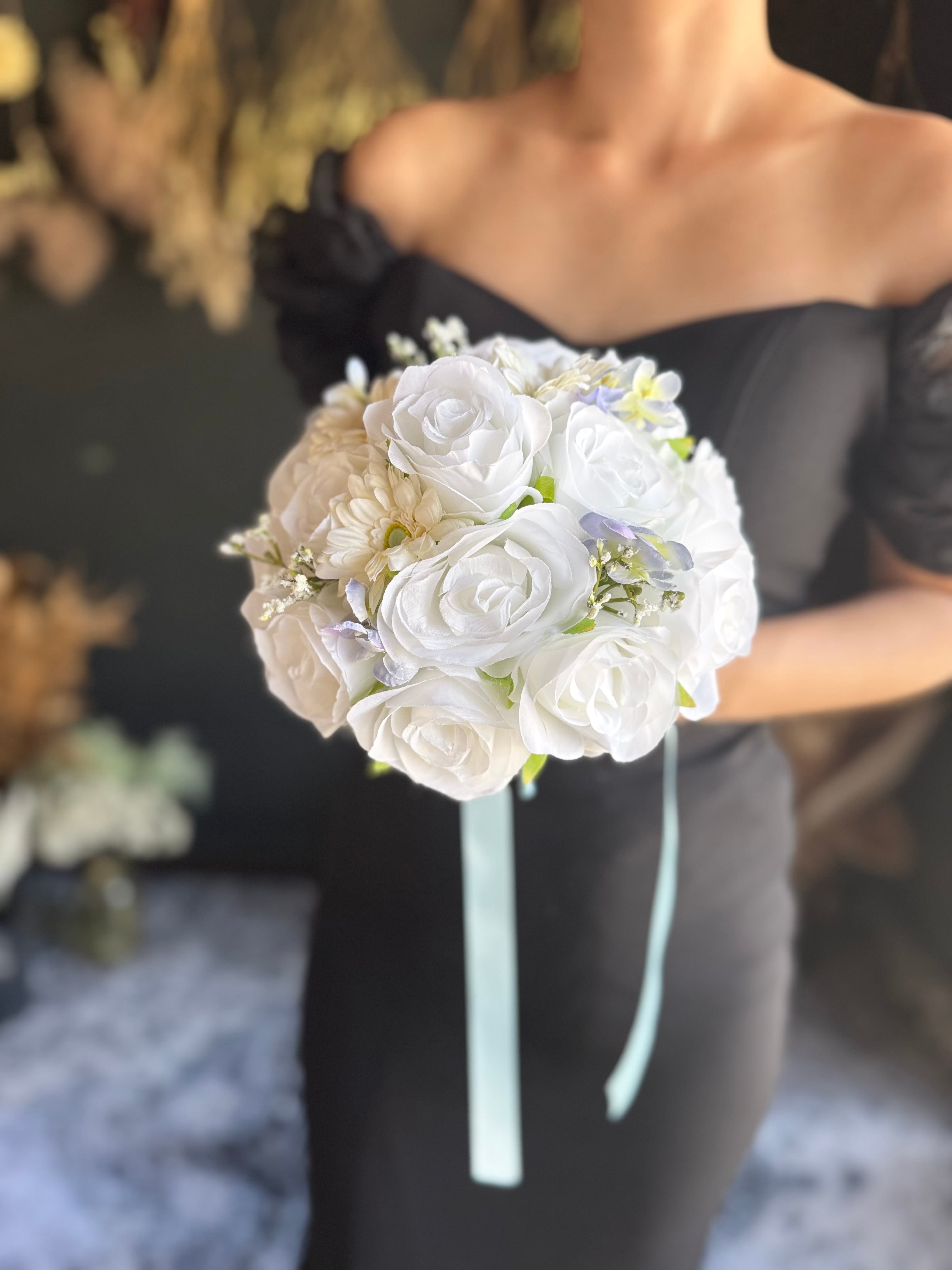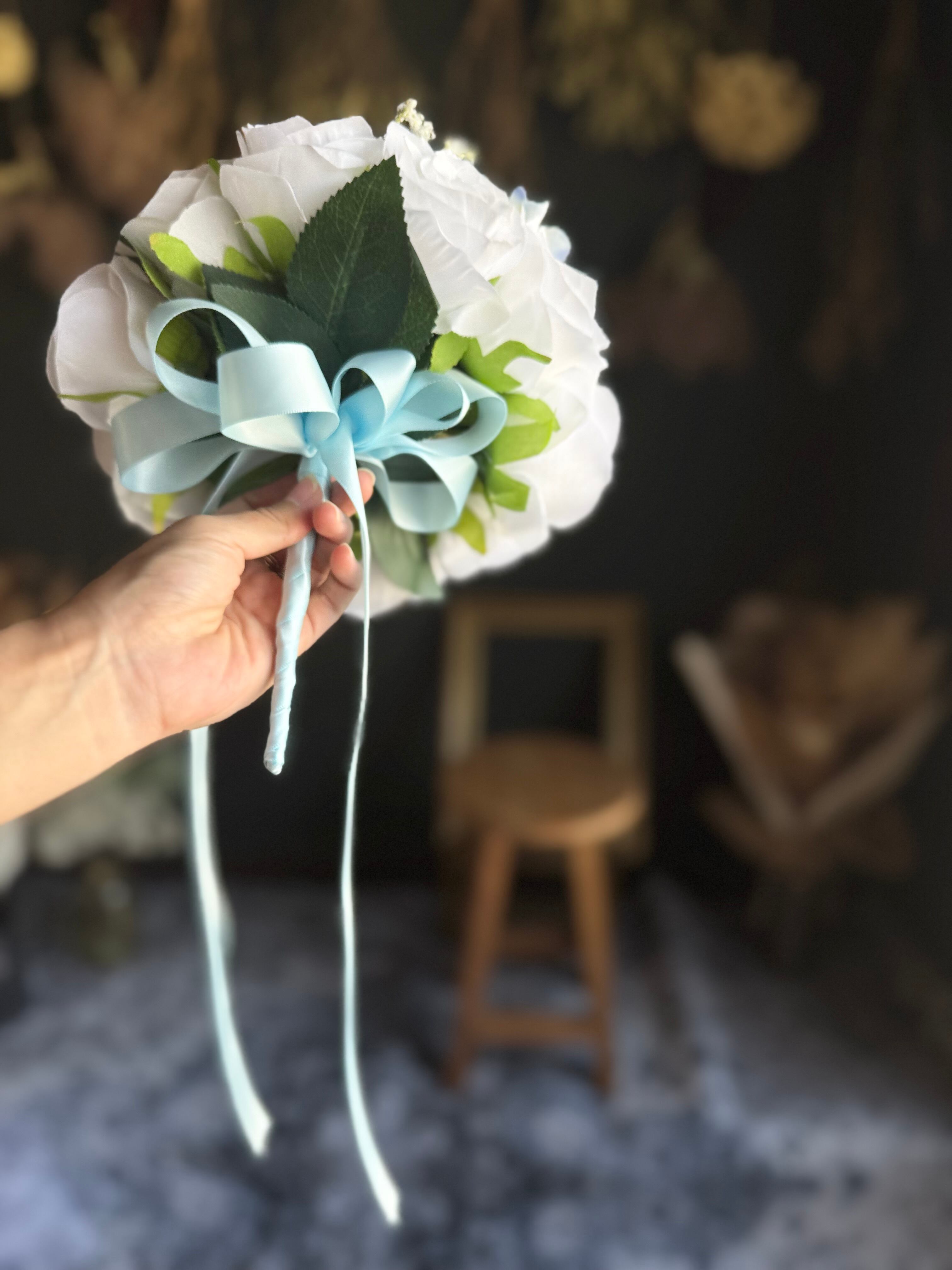 爽やかな色合いのラウンドブーケを再販致します♪純白の白×水色が優しい雰囲気を作り出し、花々の美しさを一層引き立てます♪
