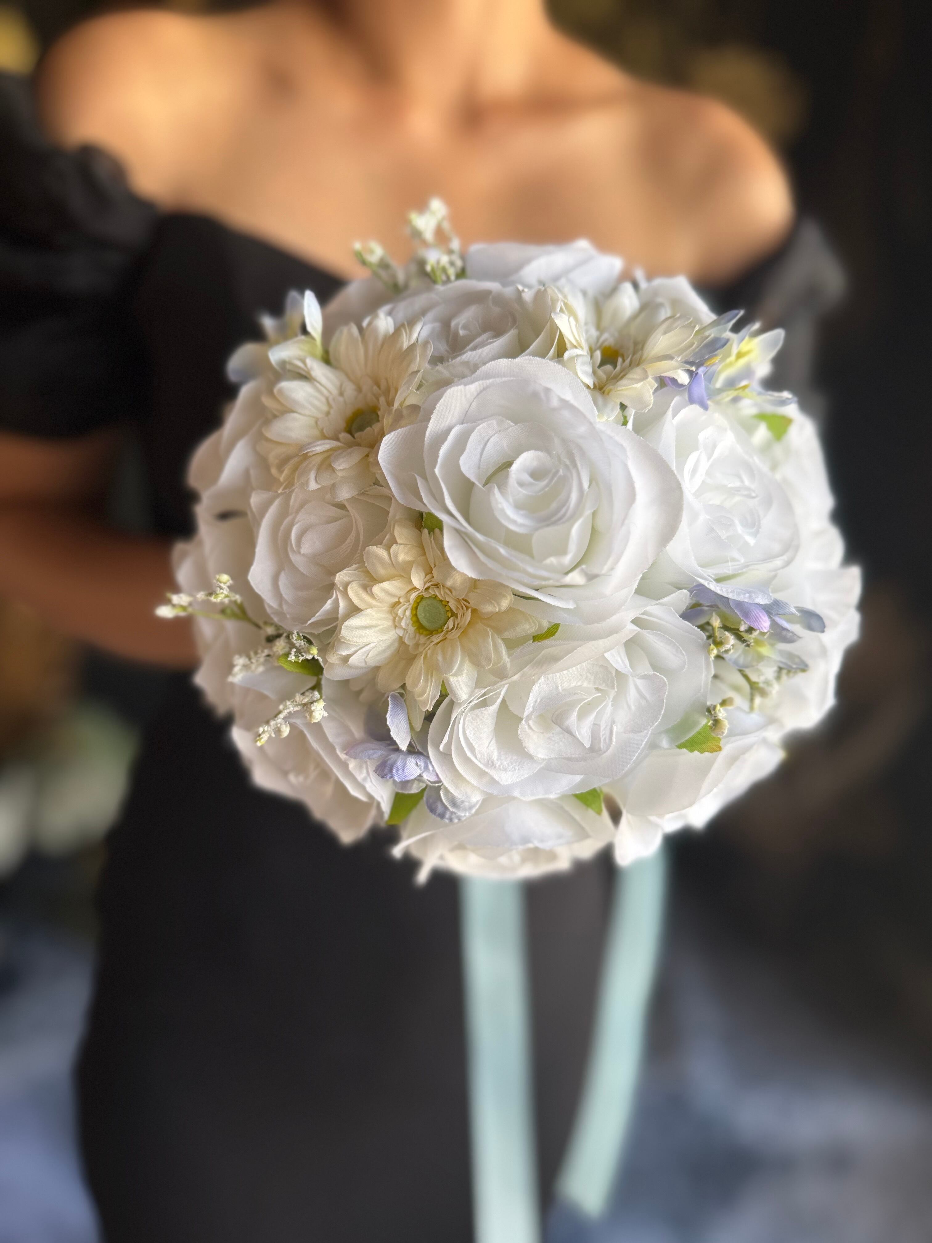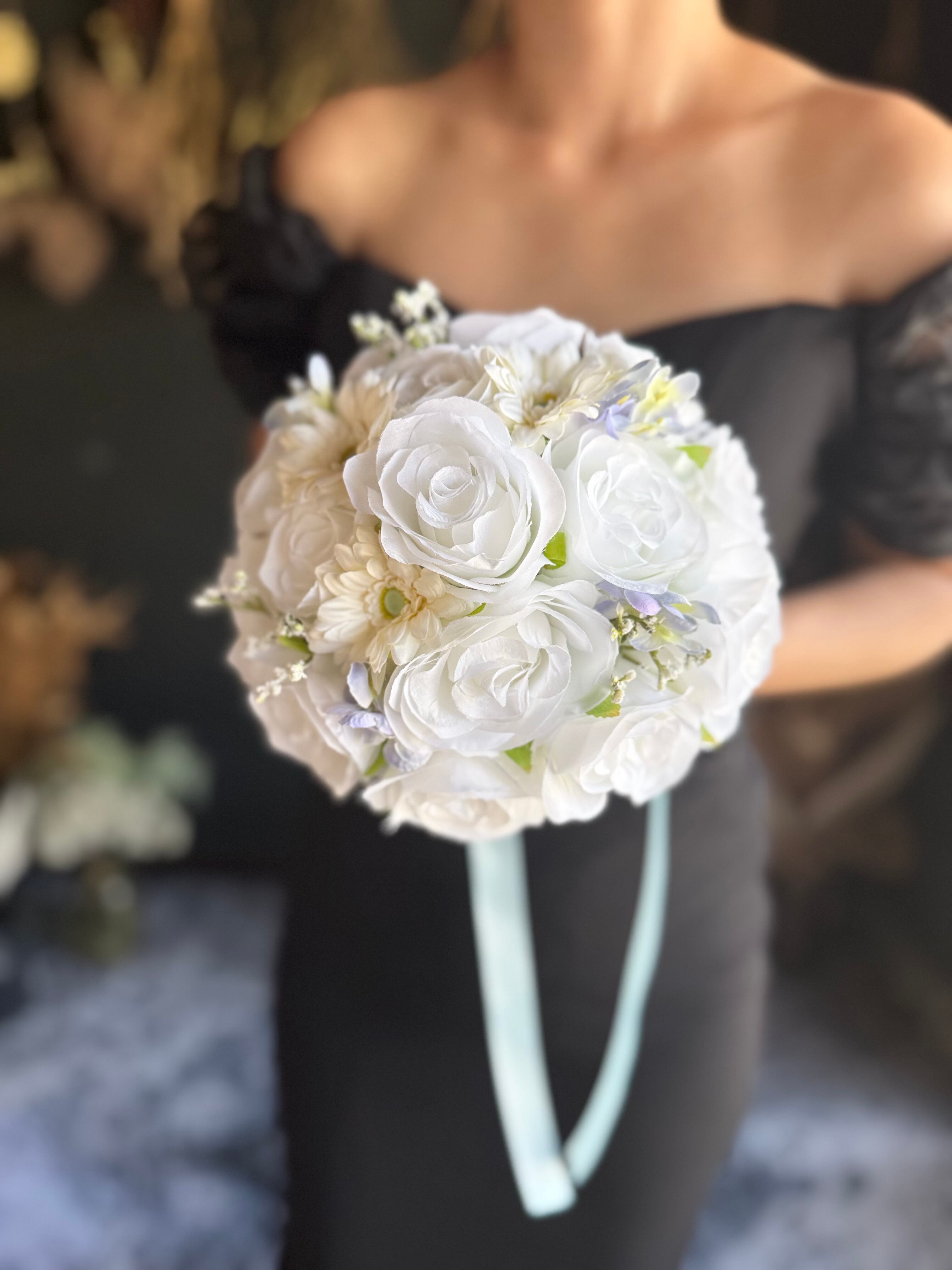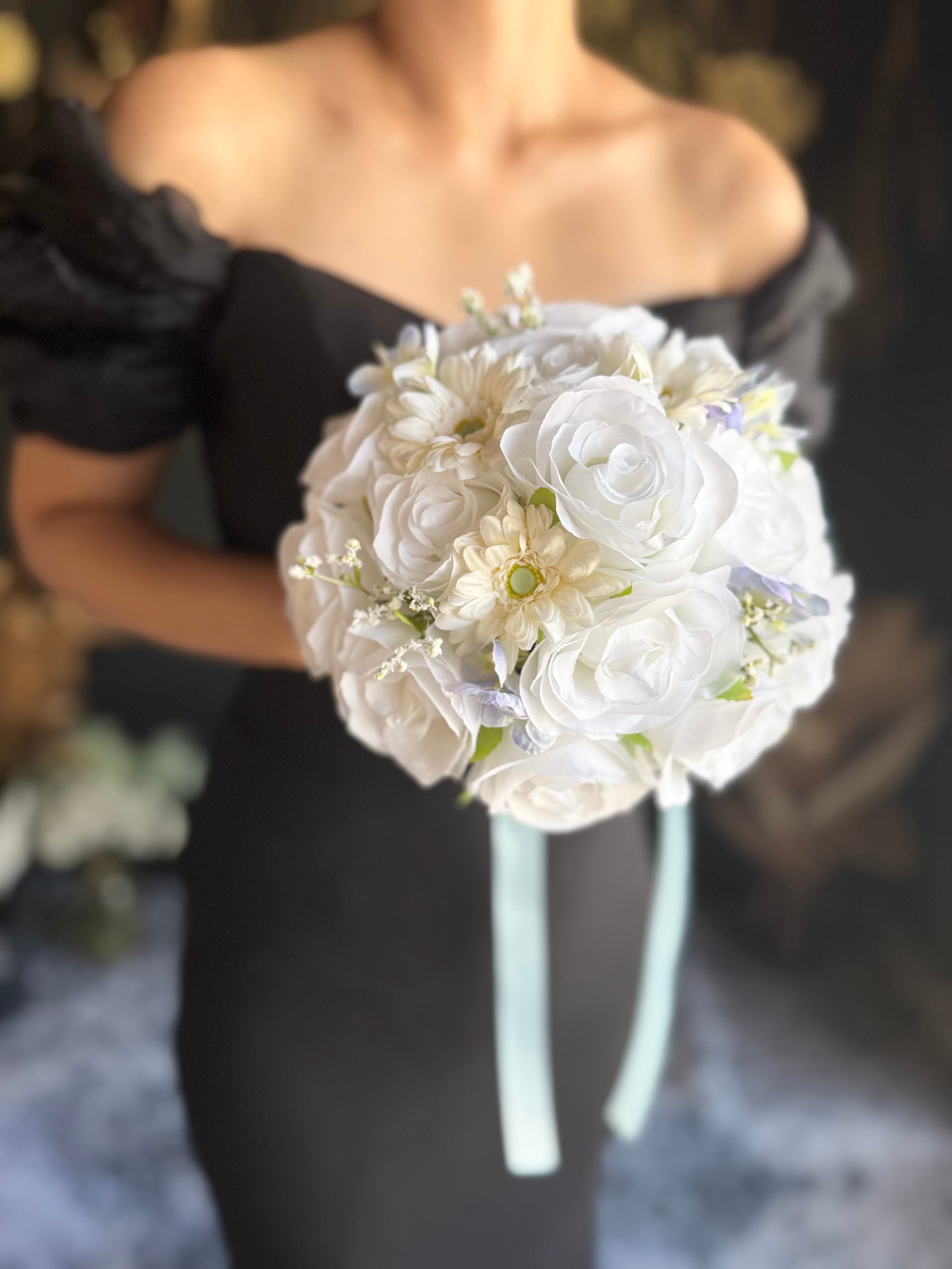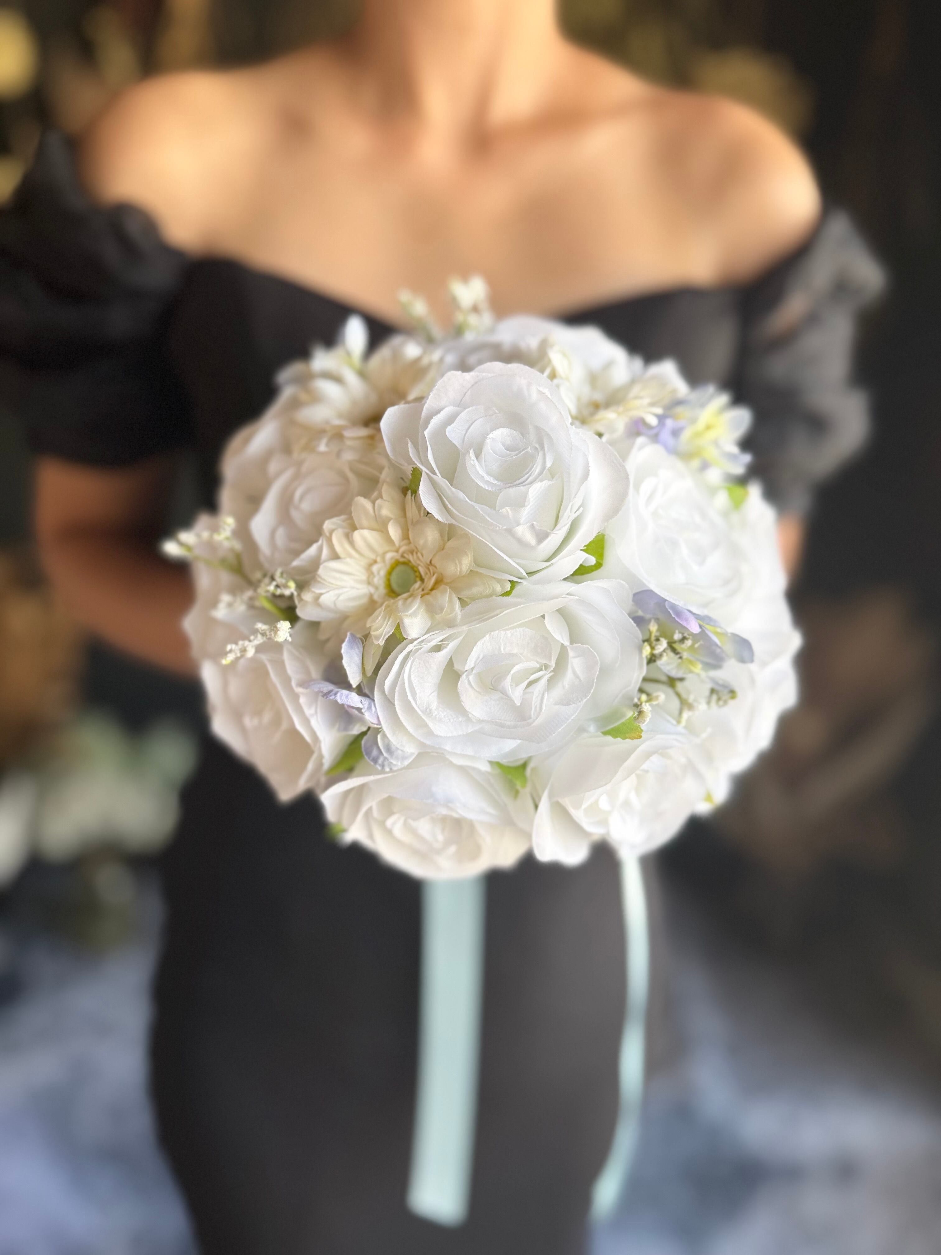 爽やかな色合いのラウンドブーケを再販致します♪純白の白×水色が優しい雰囲気を作り出し、花々の美しさを一層引き立てます♪