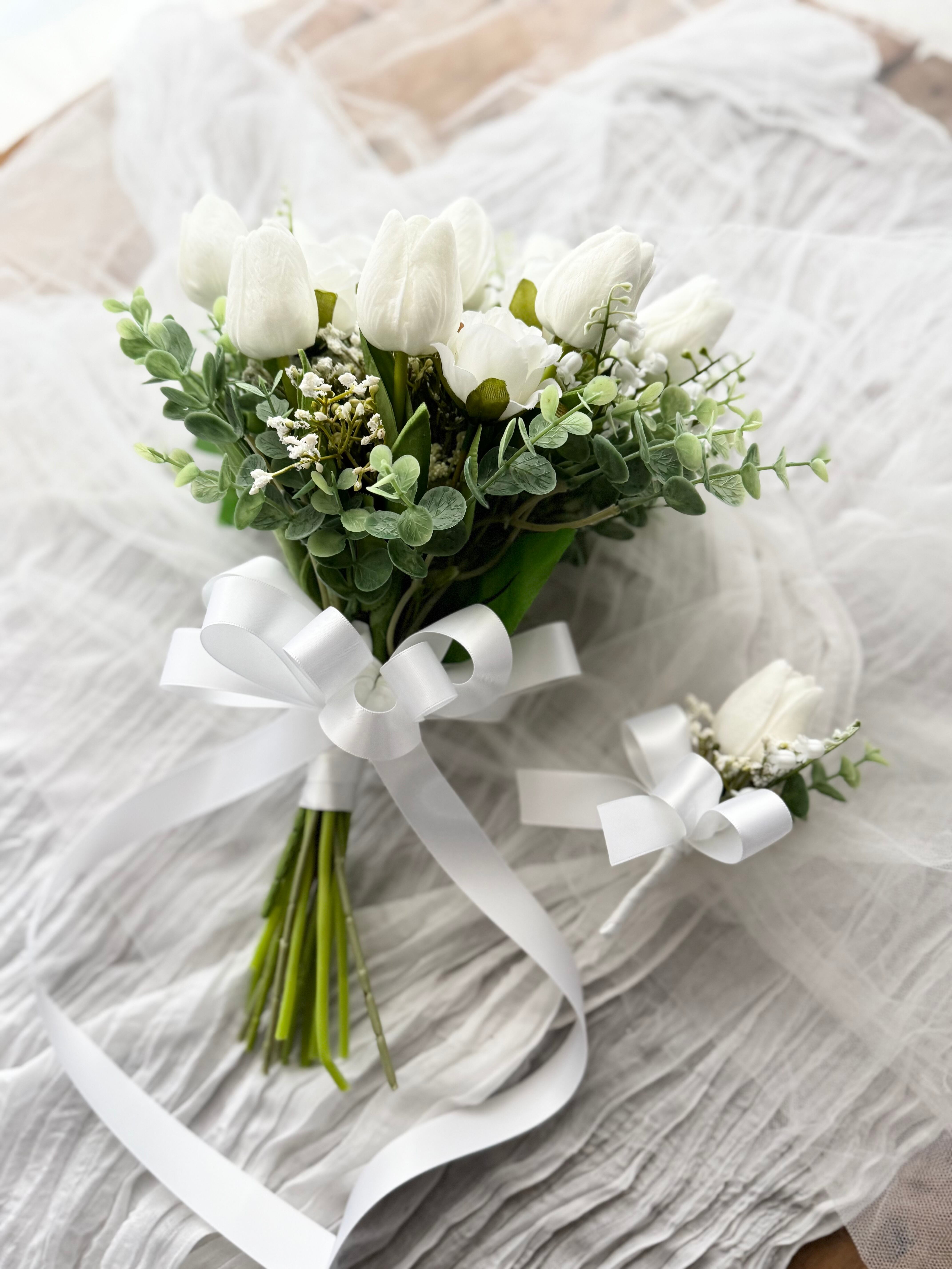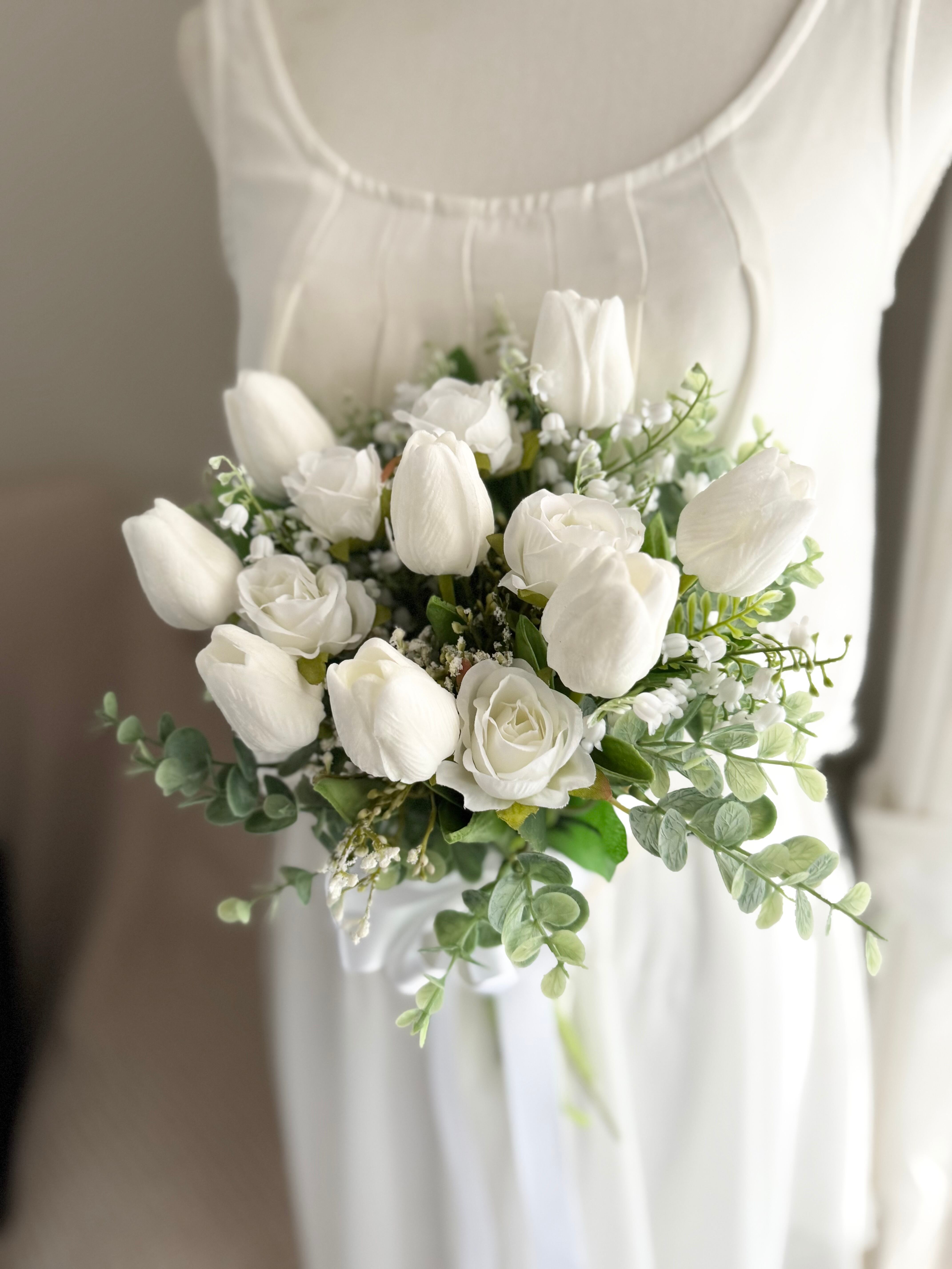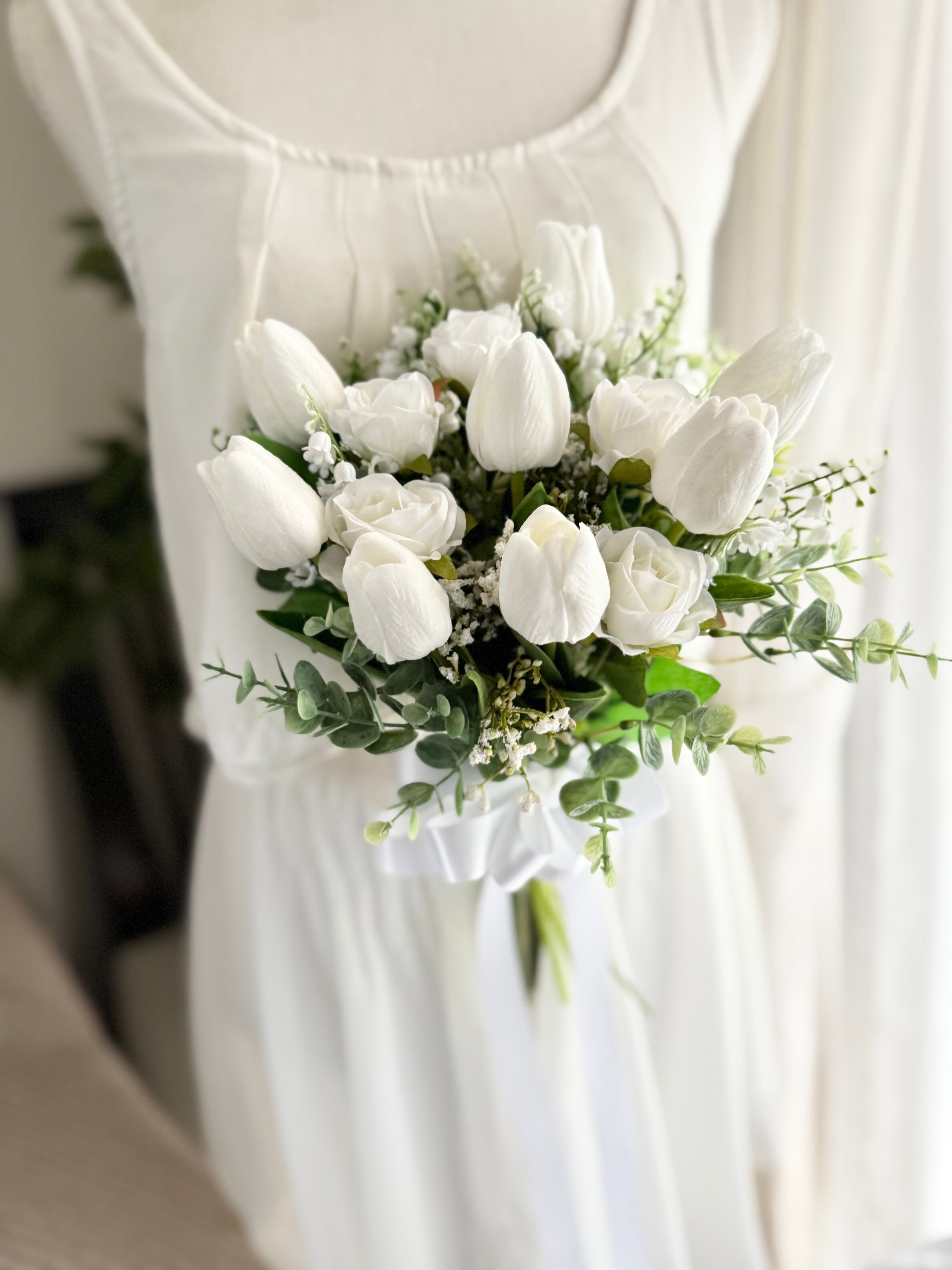 ふんわり可愛いウェディングブーケ•*・白のチューリップと可愛い小花が、清純で優しいイメージに花嫁様を包んで演出致します•*・