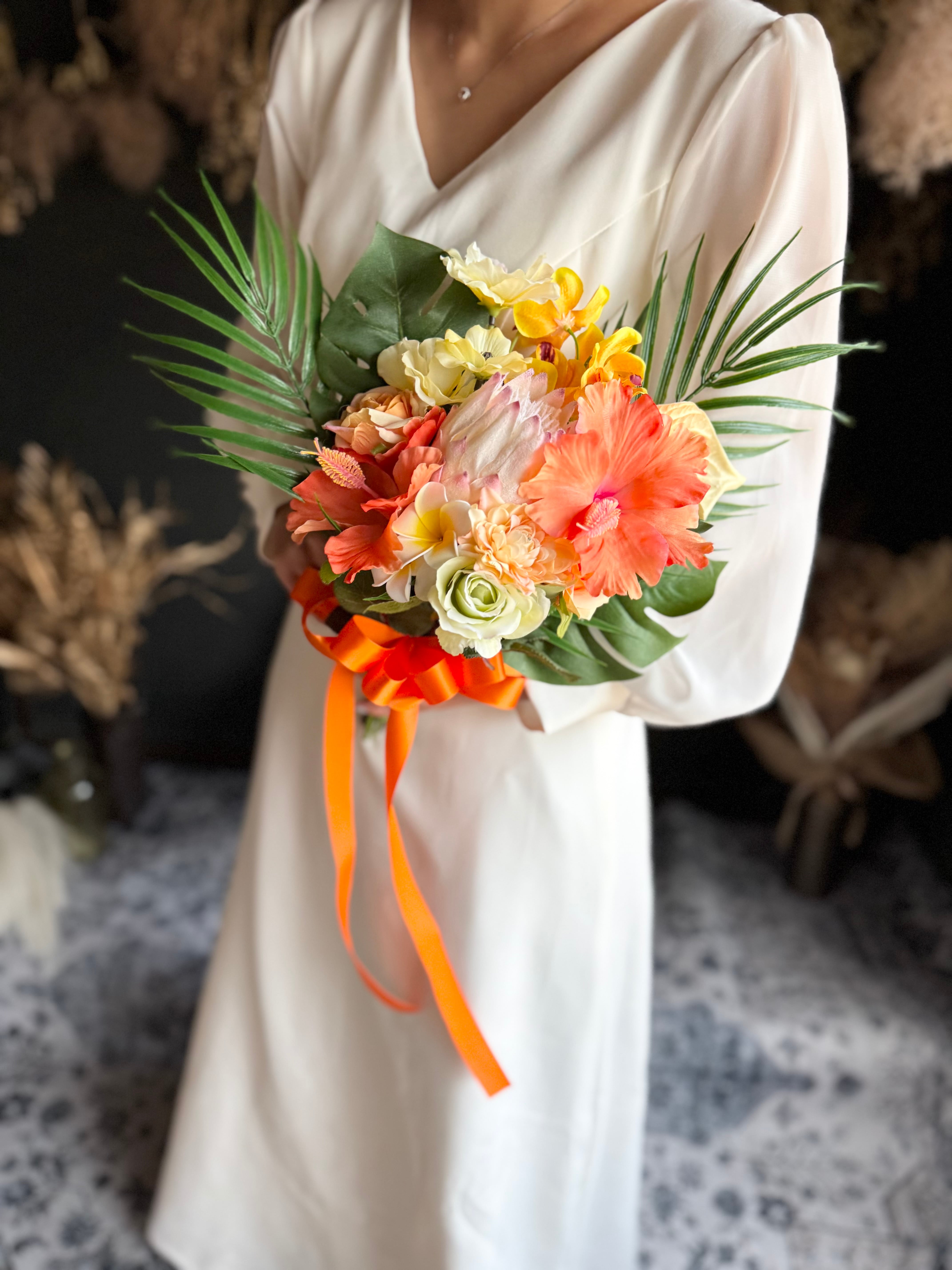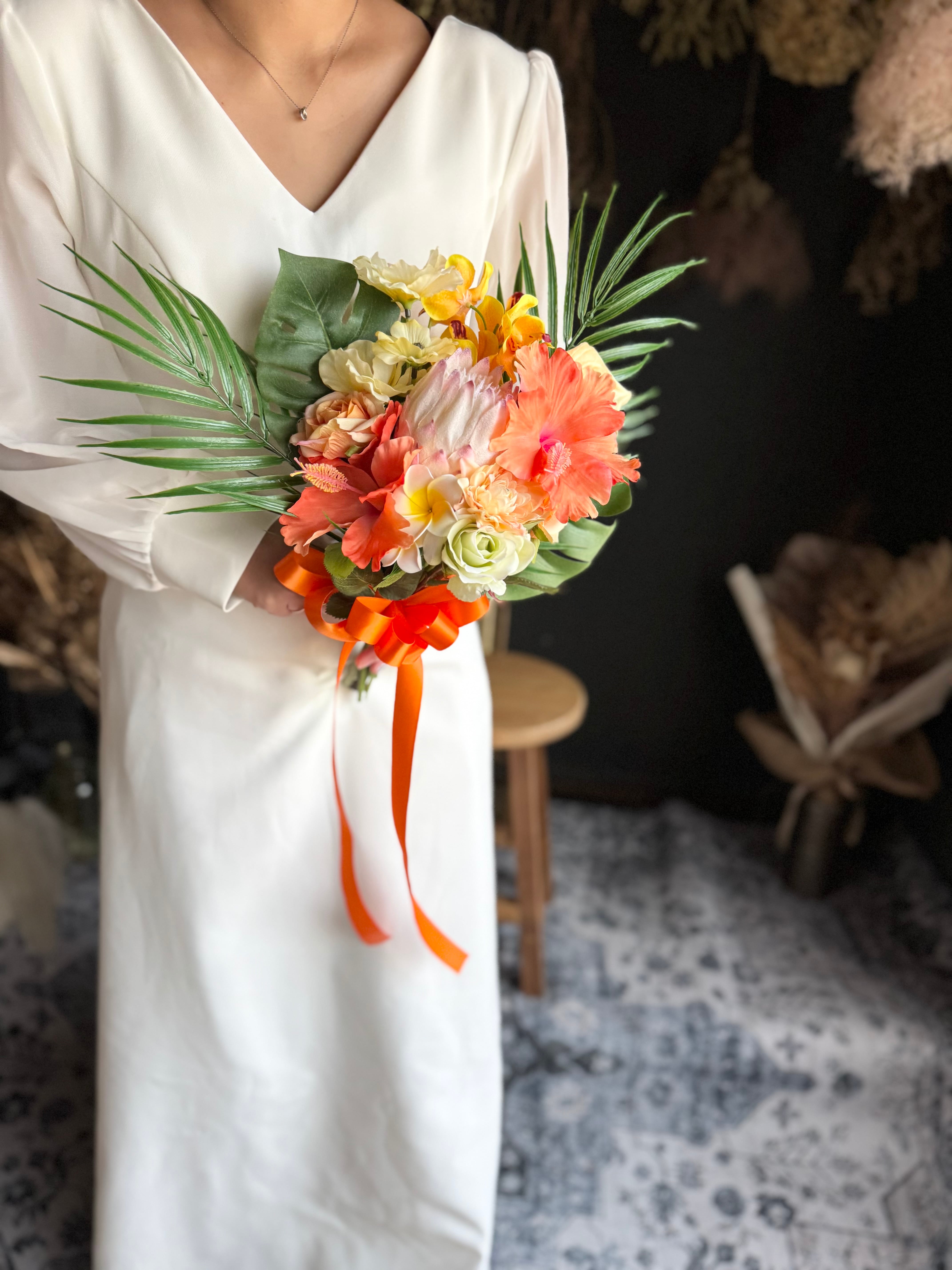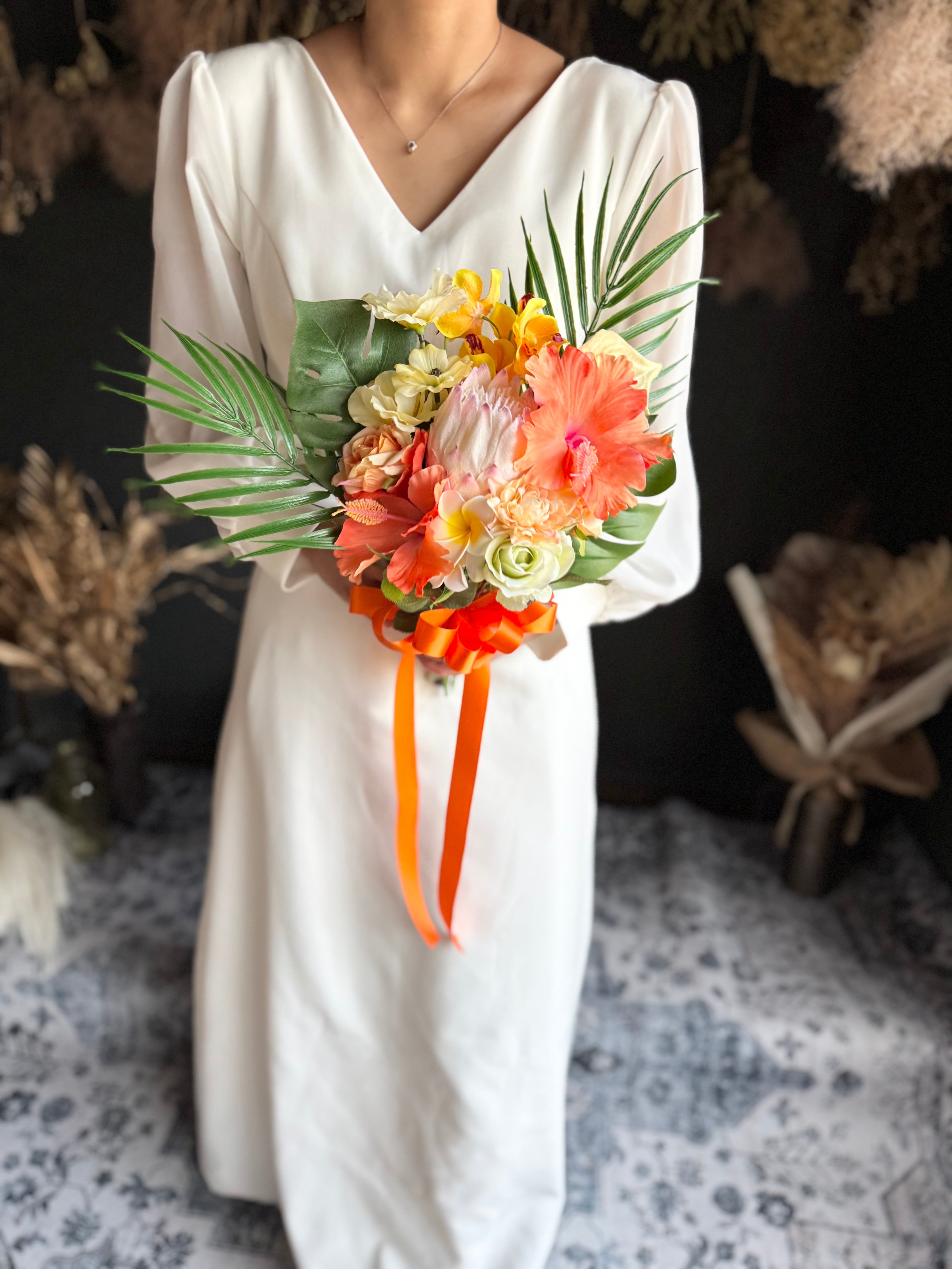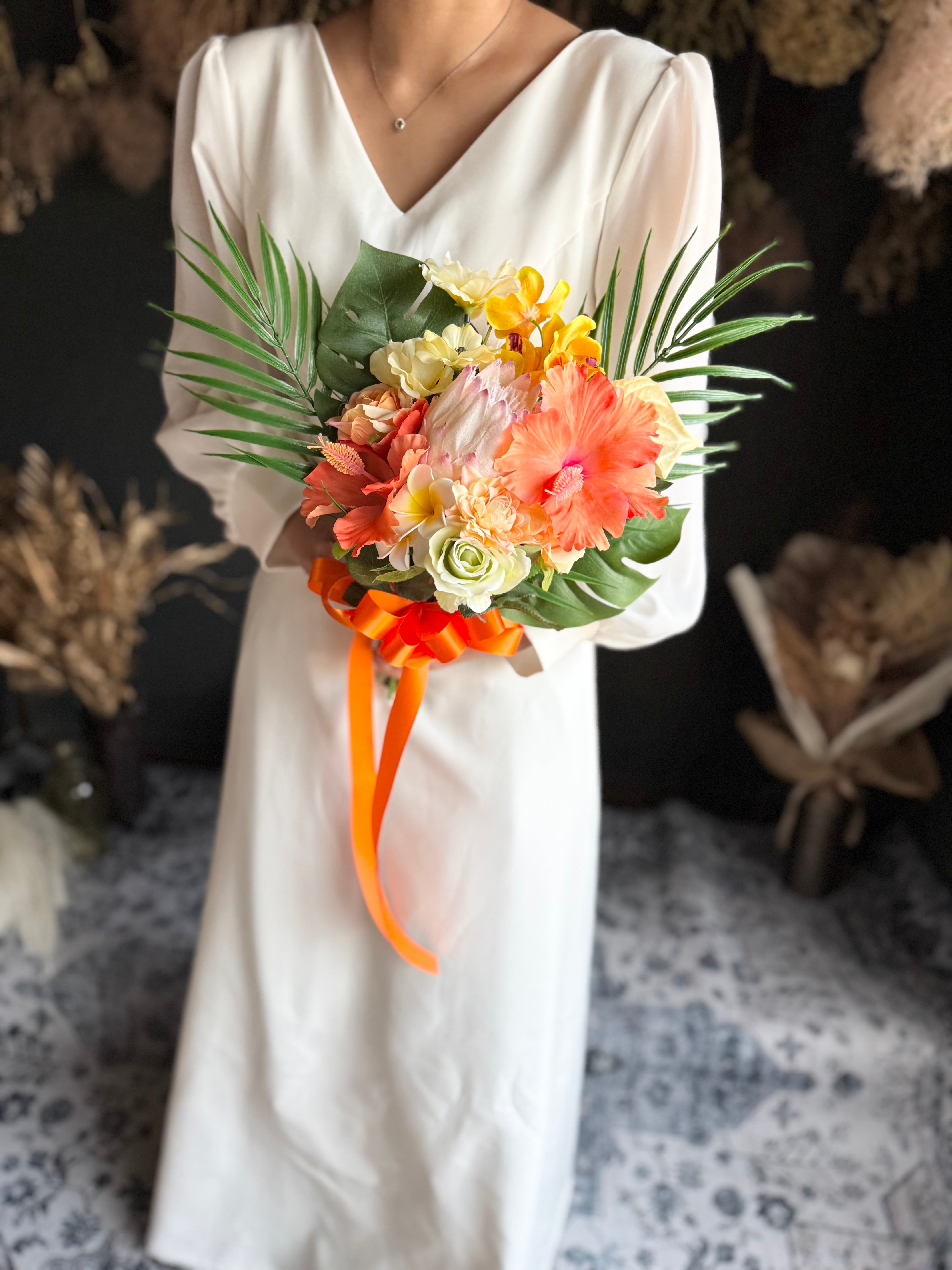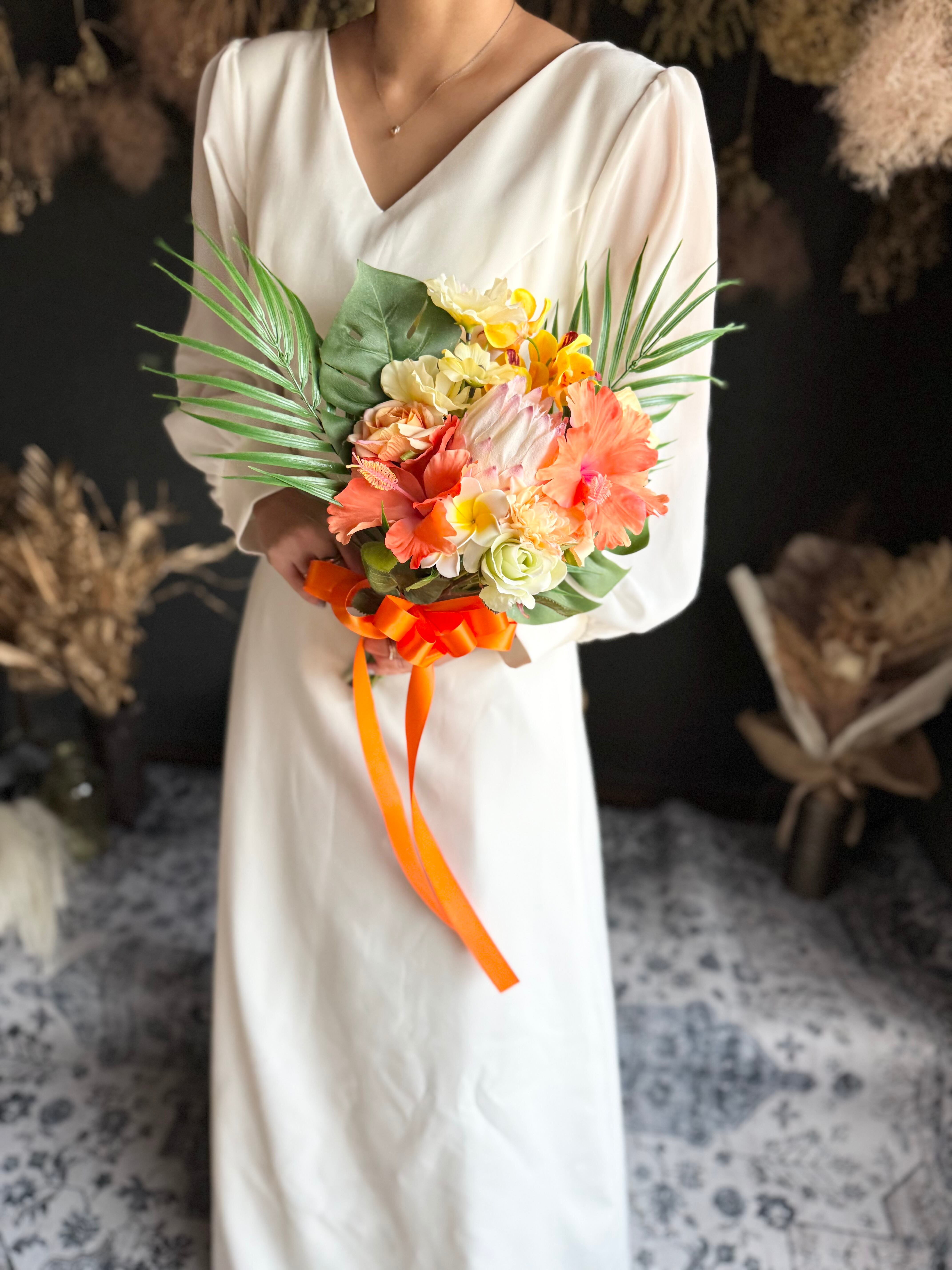 華やかでボリューム満点♪個性的なワイルドフラワースタイルで、おしゃれな花嫁様にぴったり♪海辺でのウェディングフォトや海外ウェディングにもオススメのブーケです♪