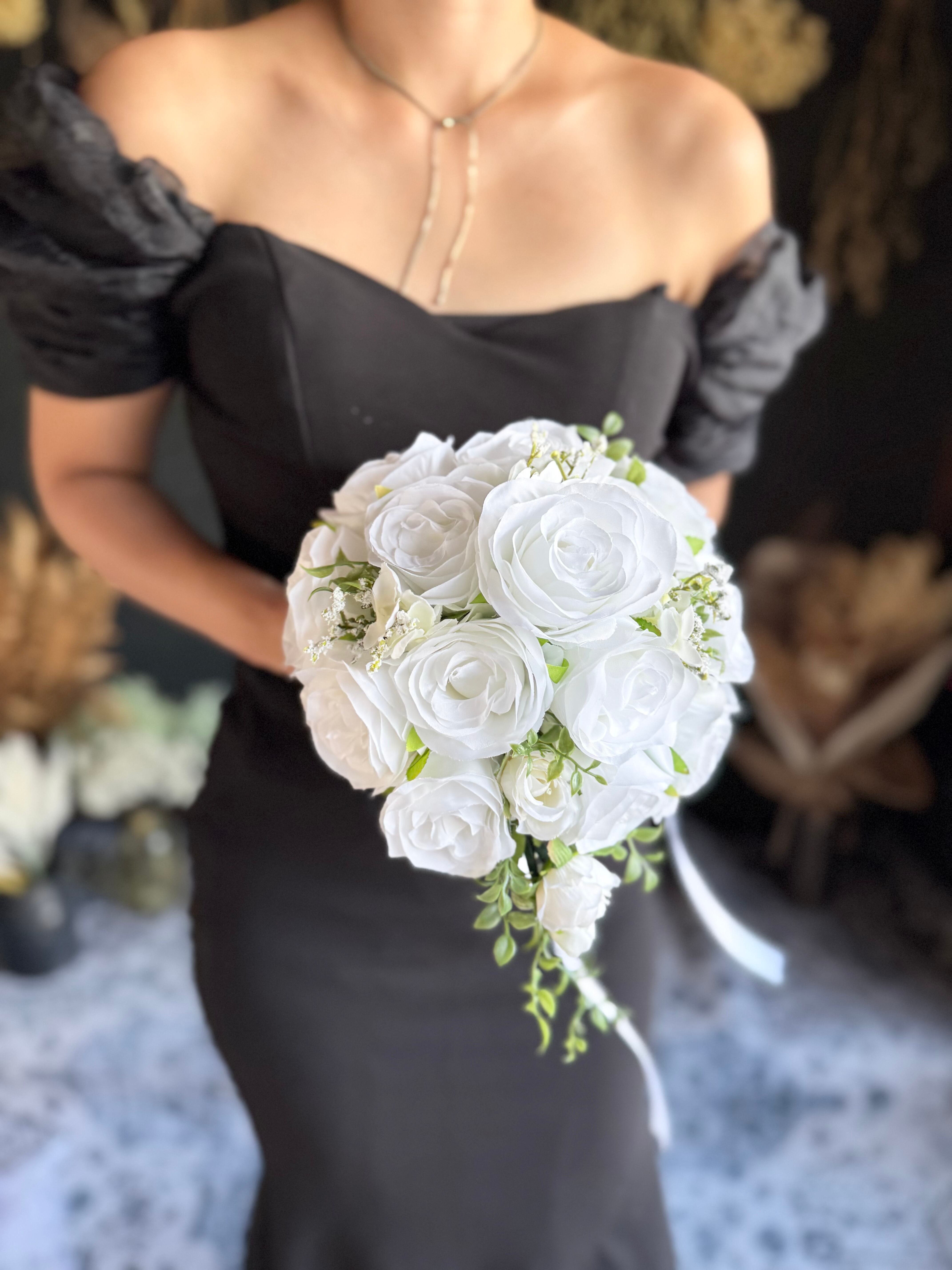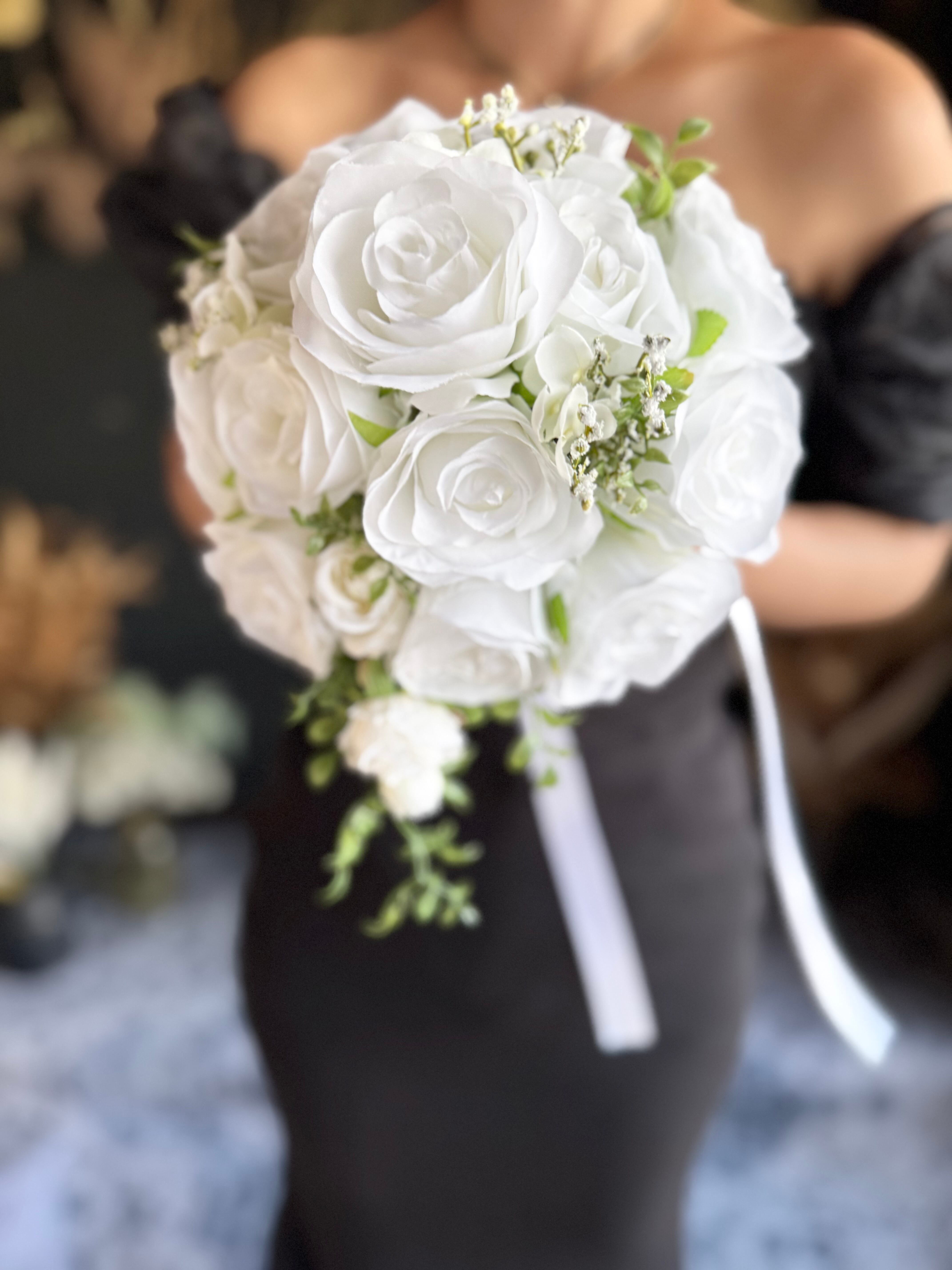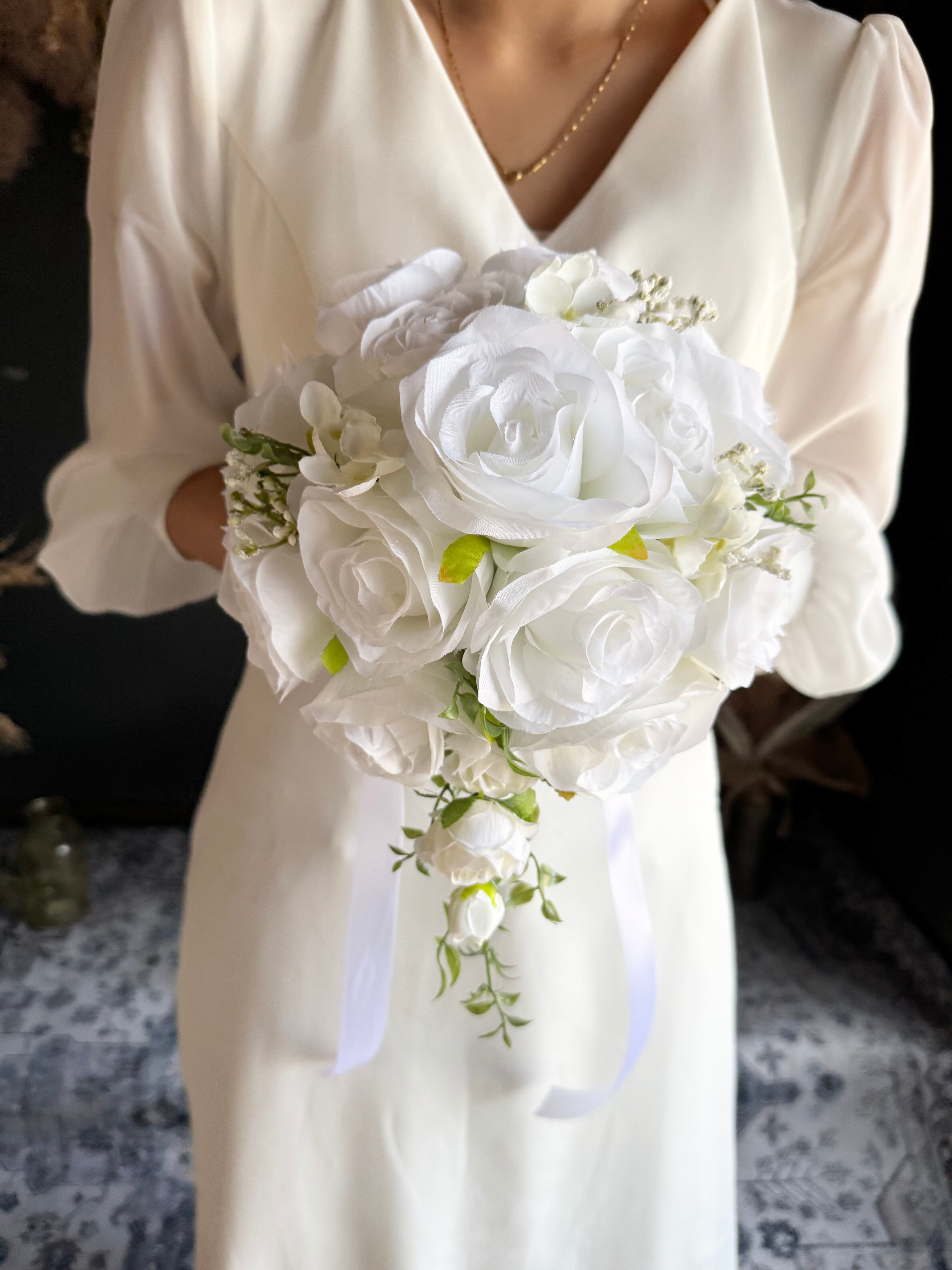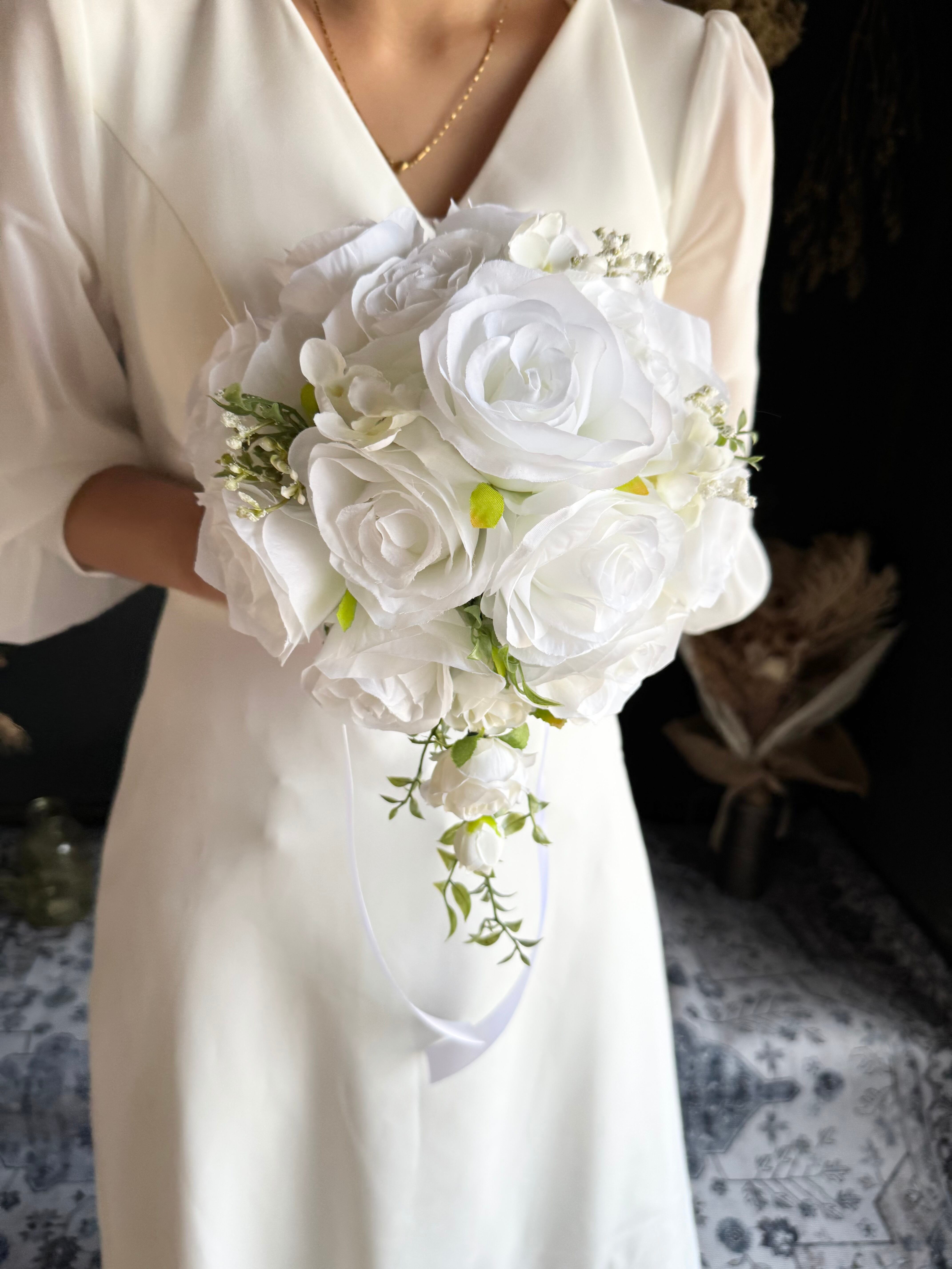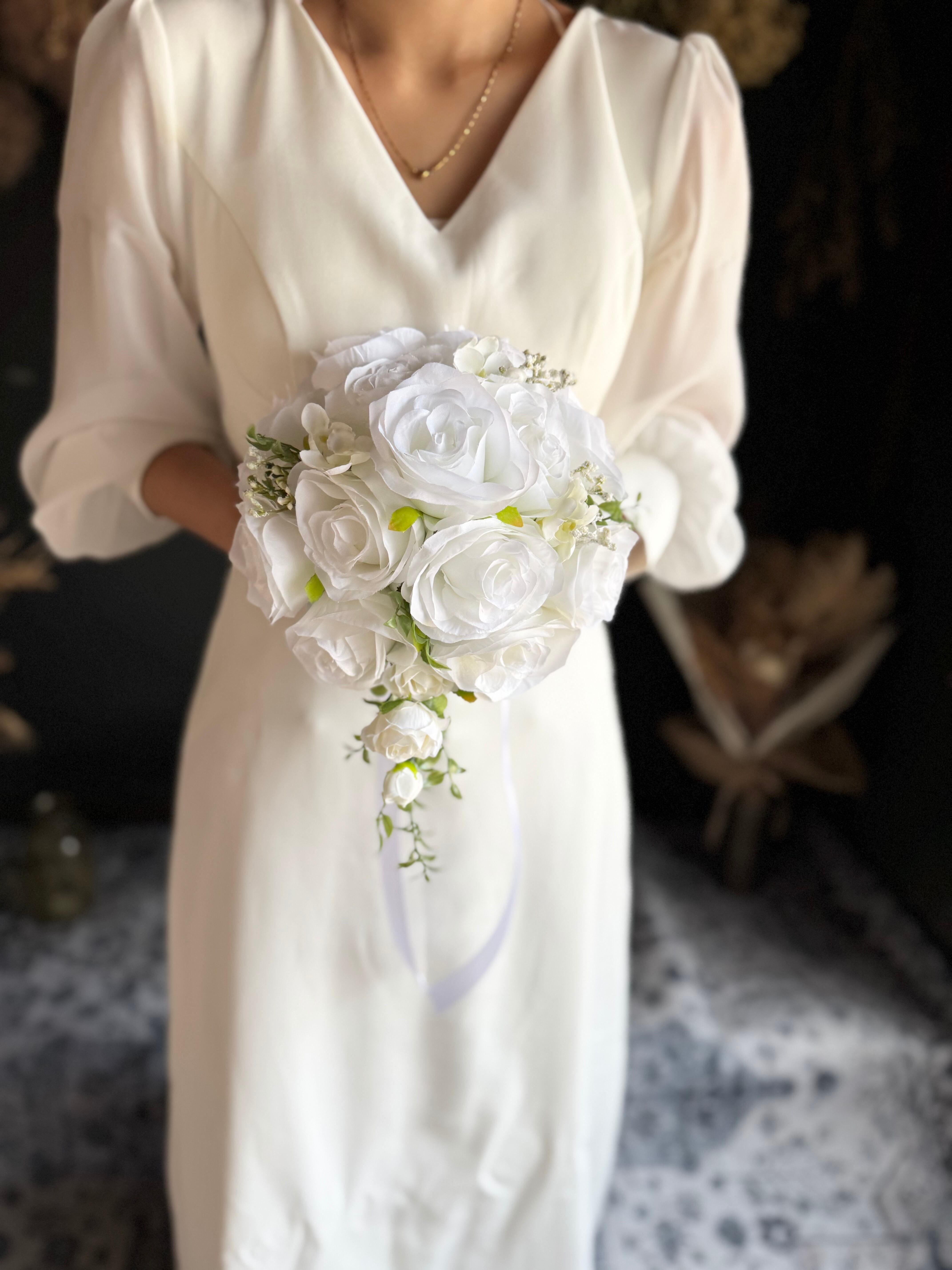 シンプルで王道のデザイン•*・キャスケードブーケよりも短く、ドレスを隠したくない花嫁様にオススメオーバル・ティアドロップの形•*・