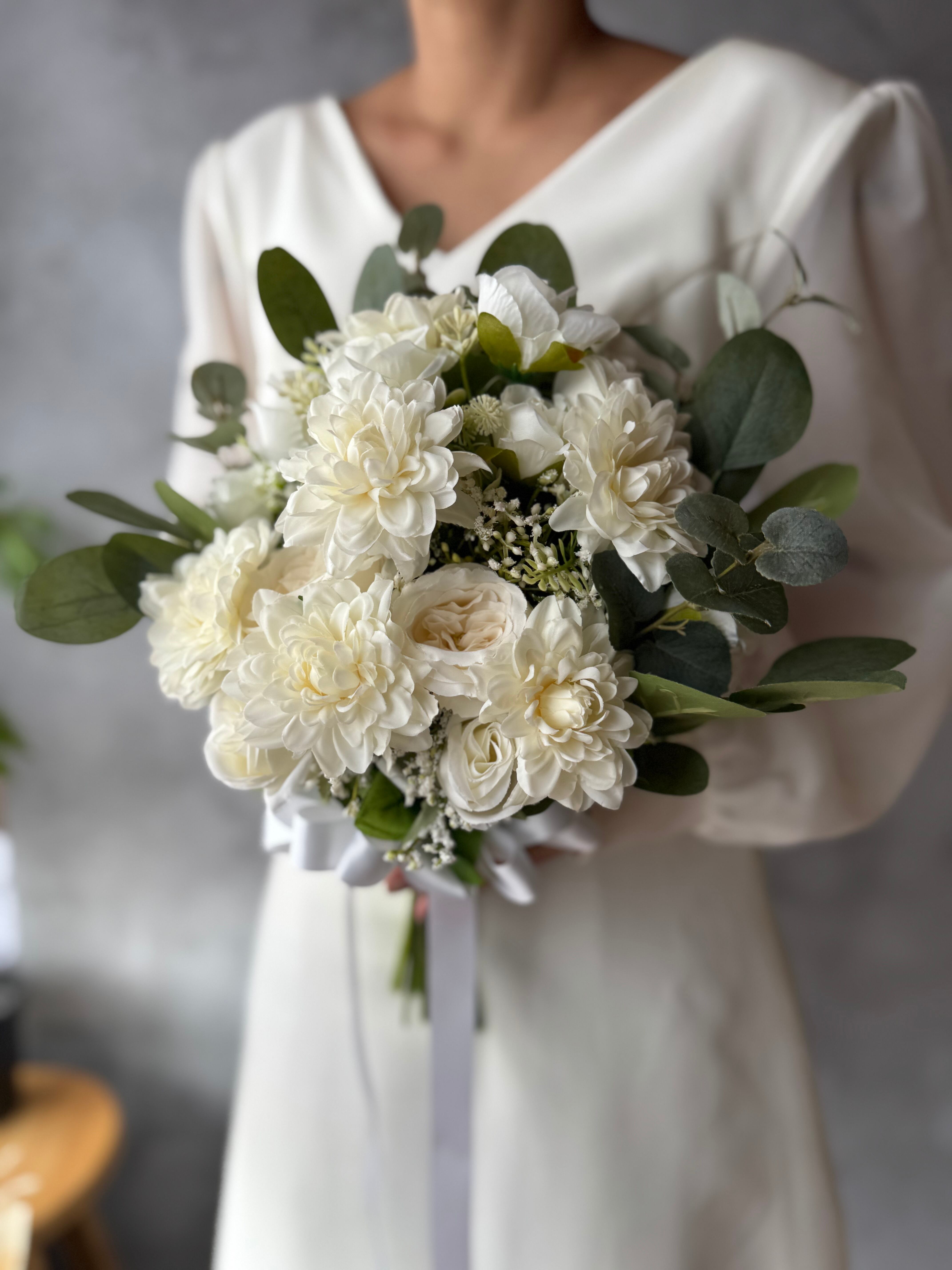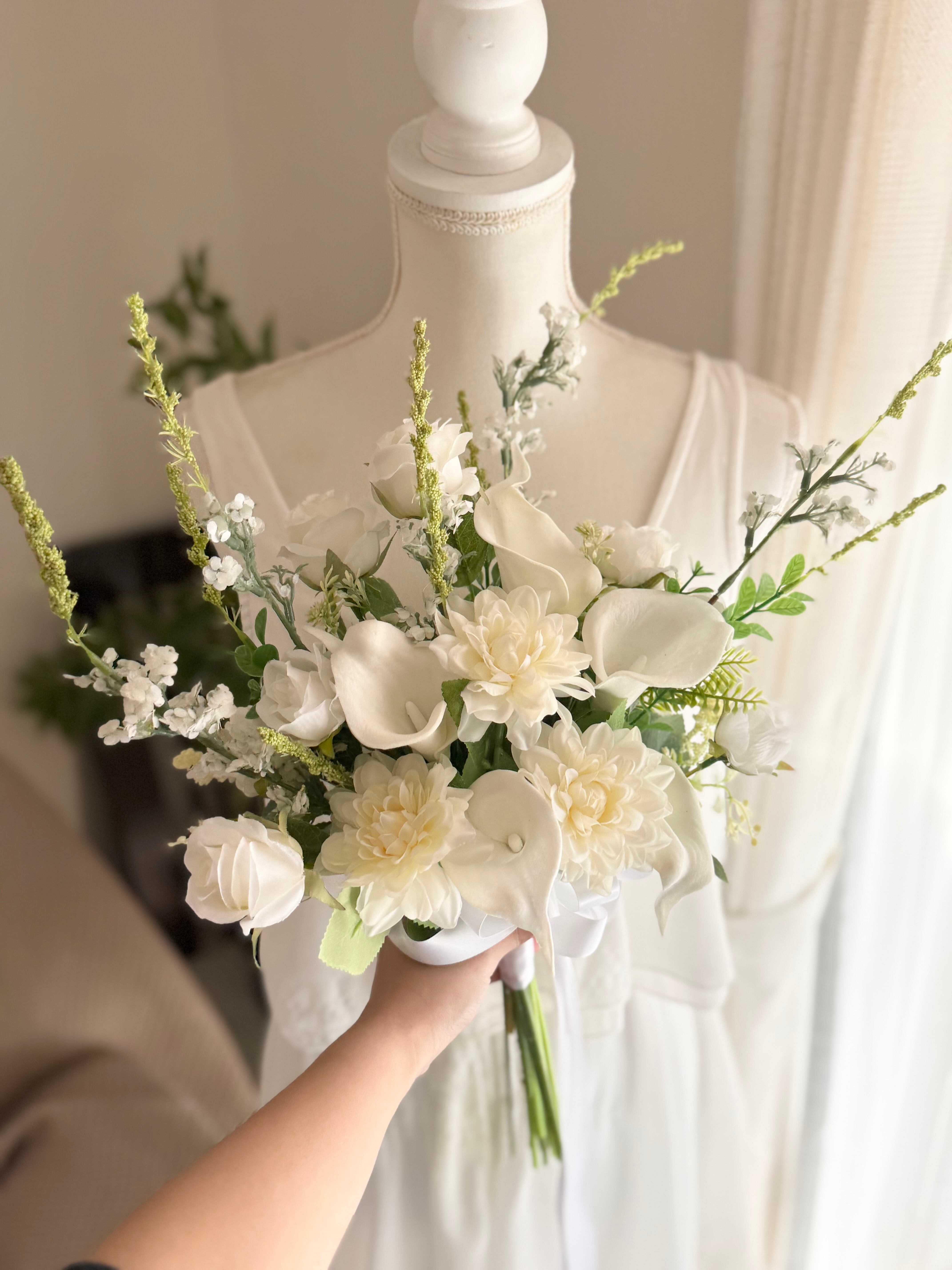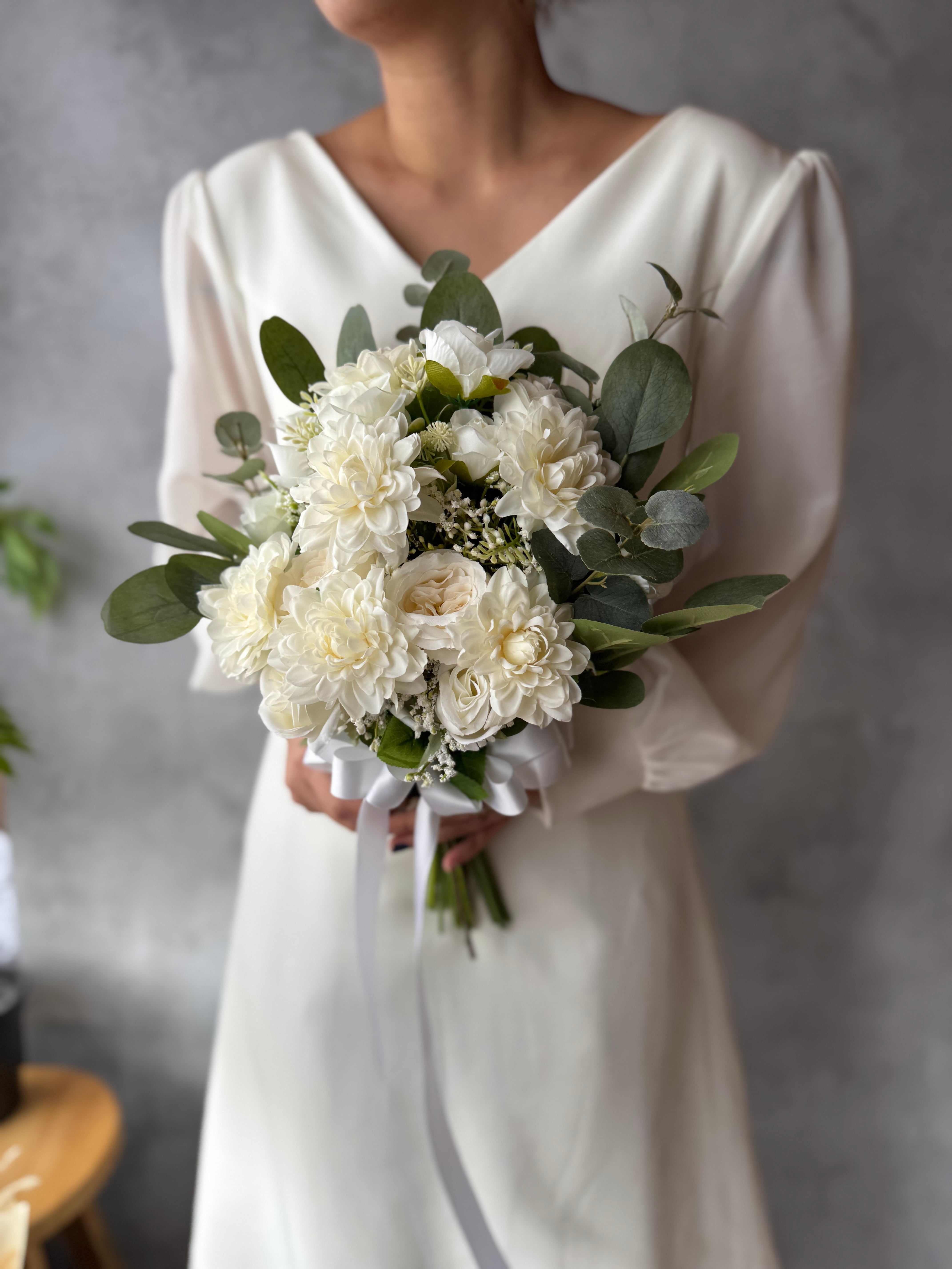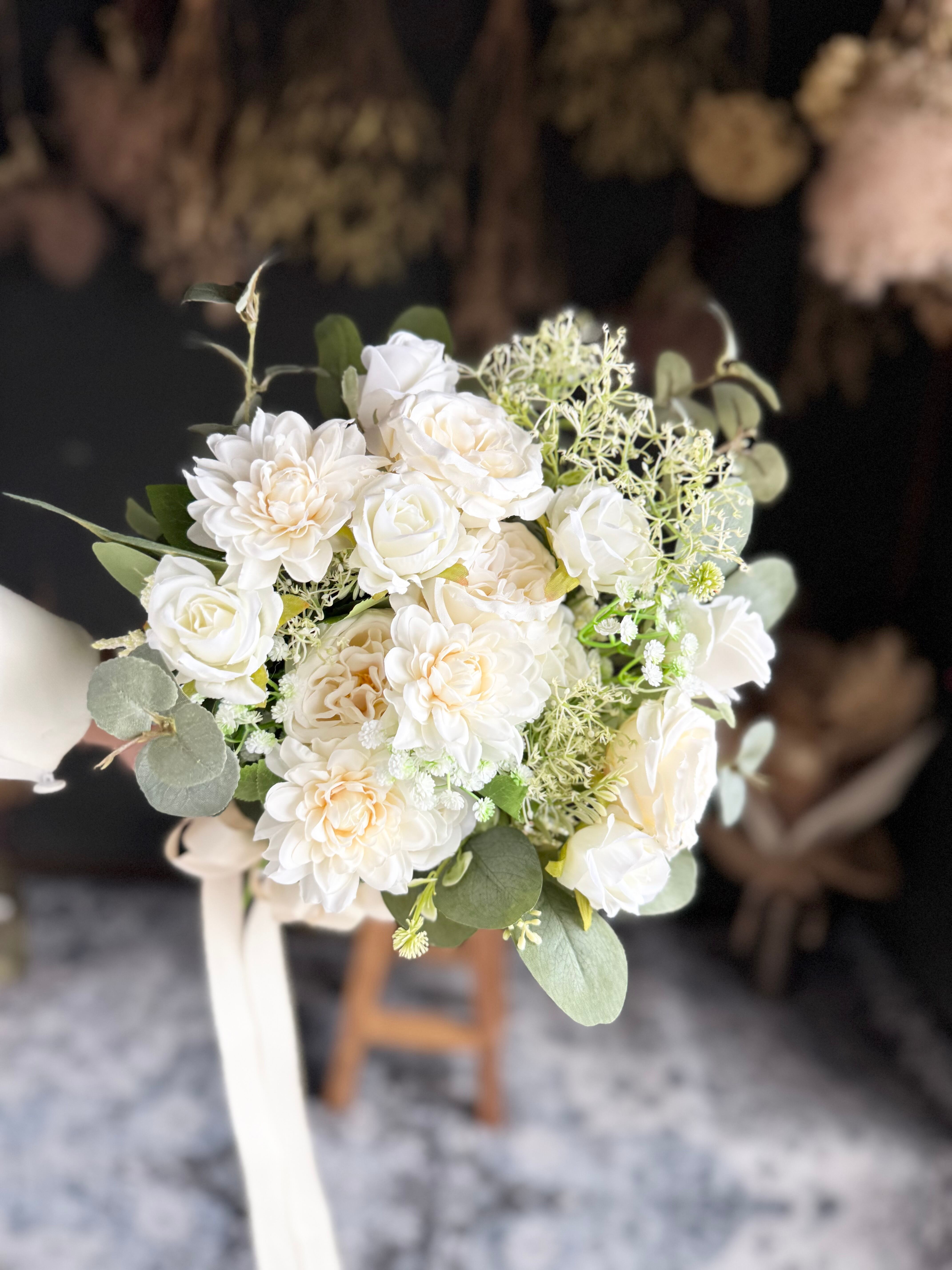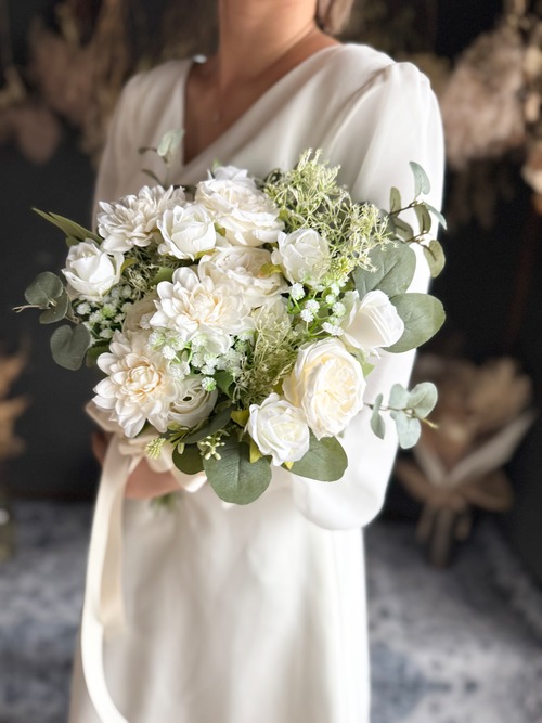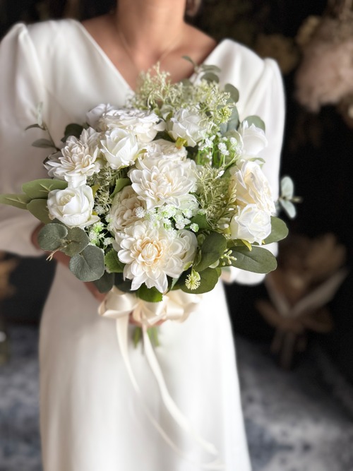 白のバラやダリアが可憐に咲き誇る、ウェディングやパーティーに最適なブーケ♪