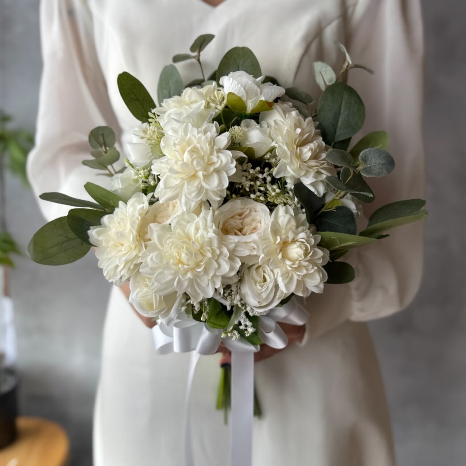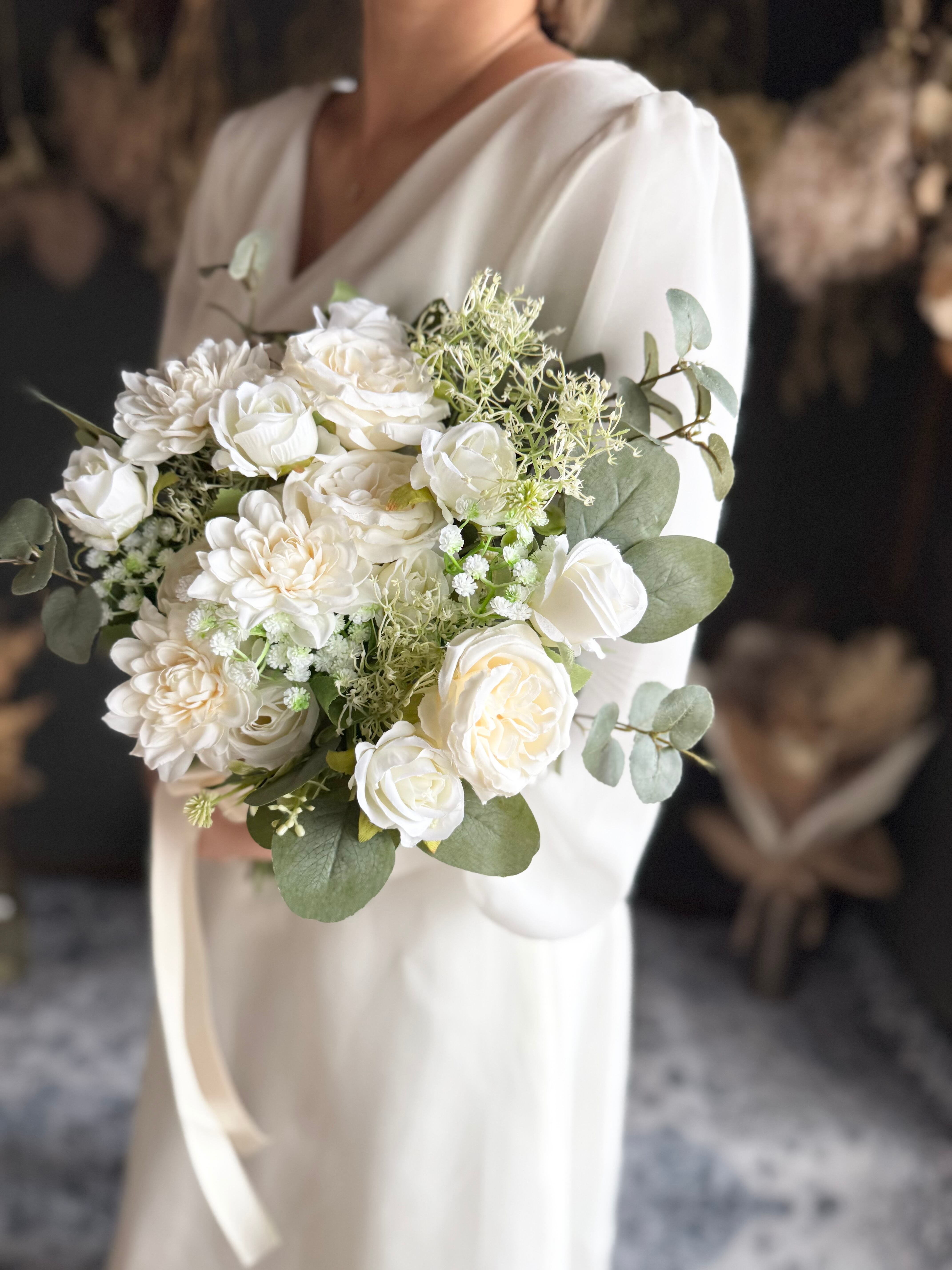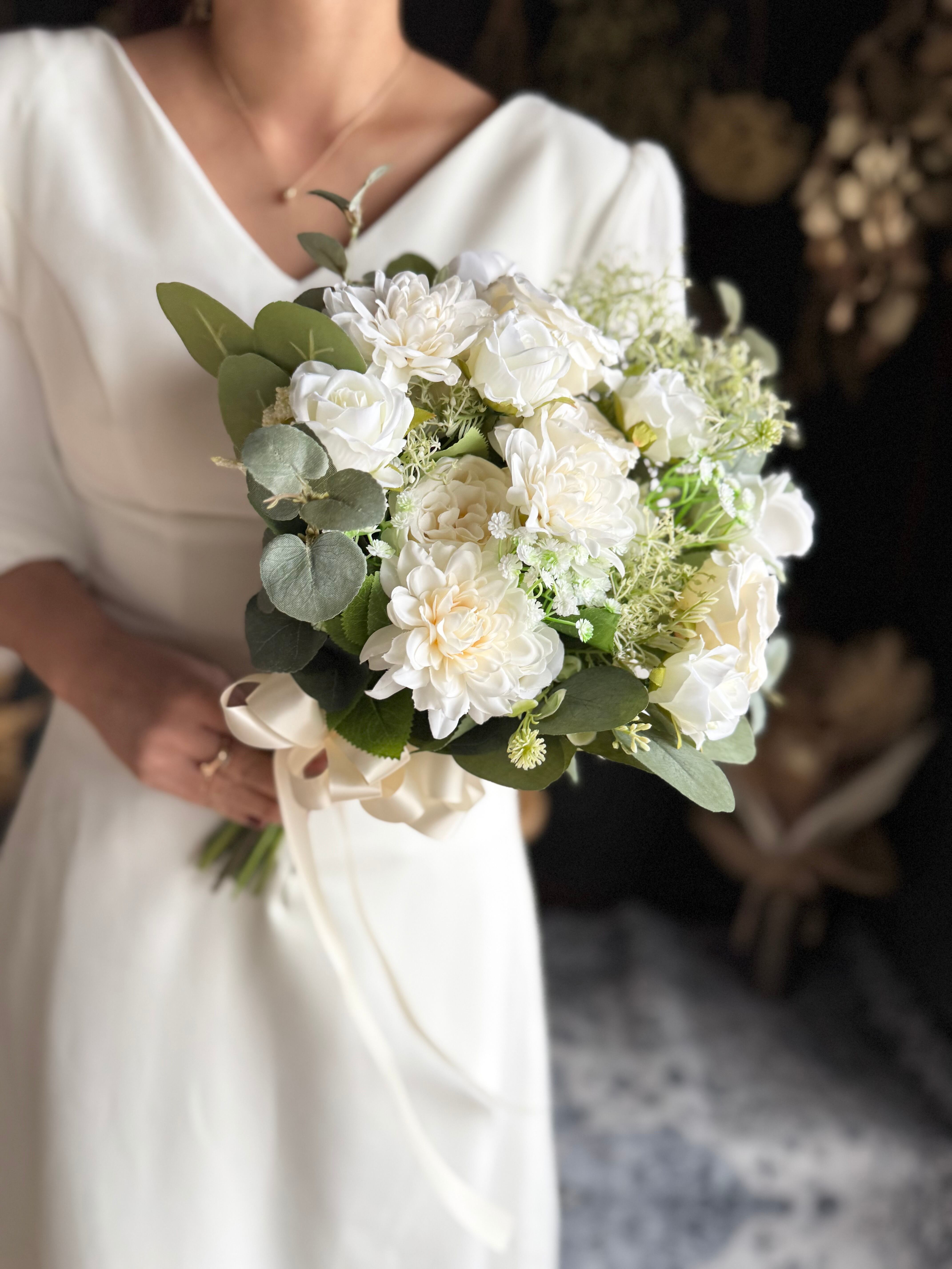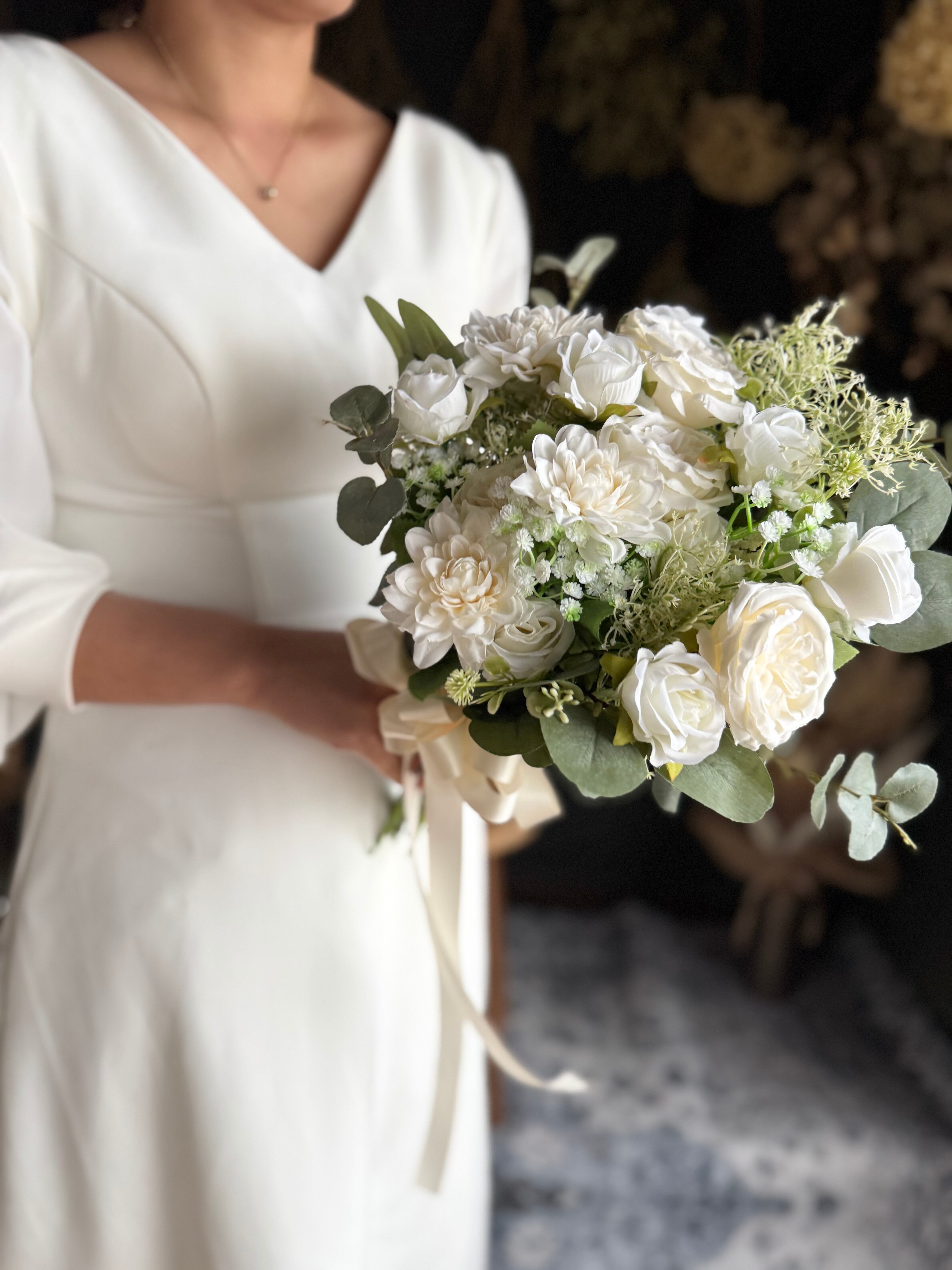 白のバラやダリアが可憐に咲き誇る、ウェディングやパーティーに最適なブーケ♪