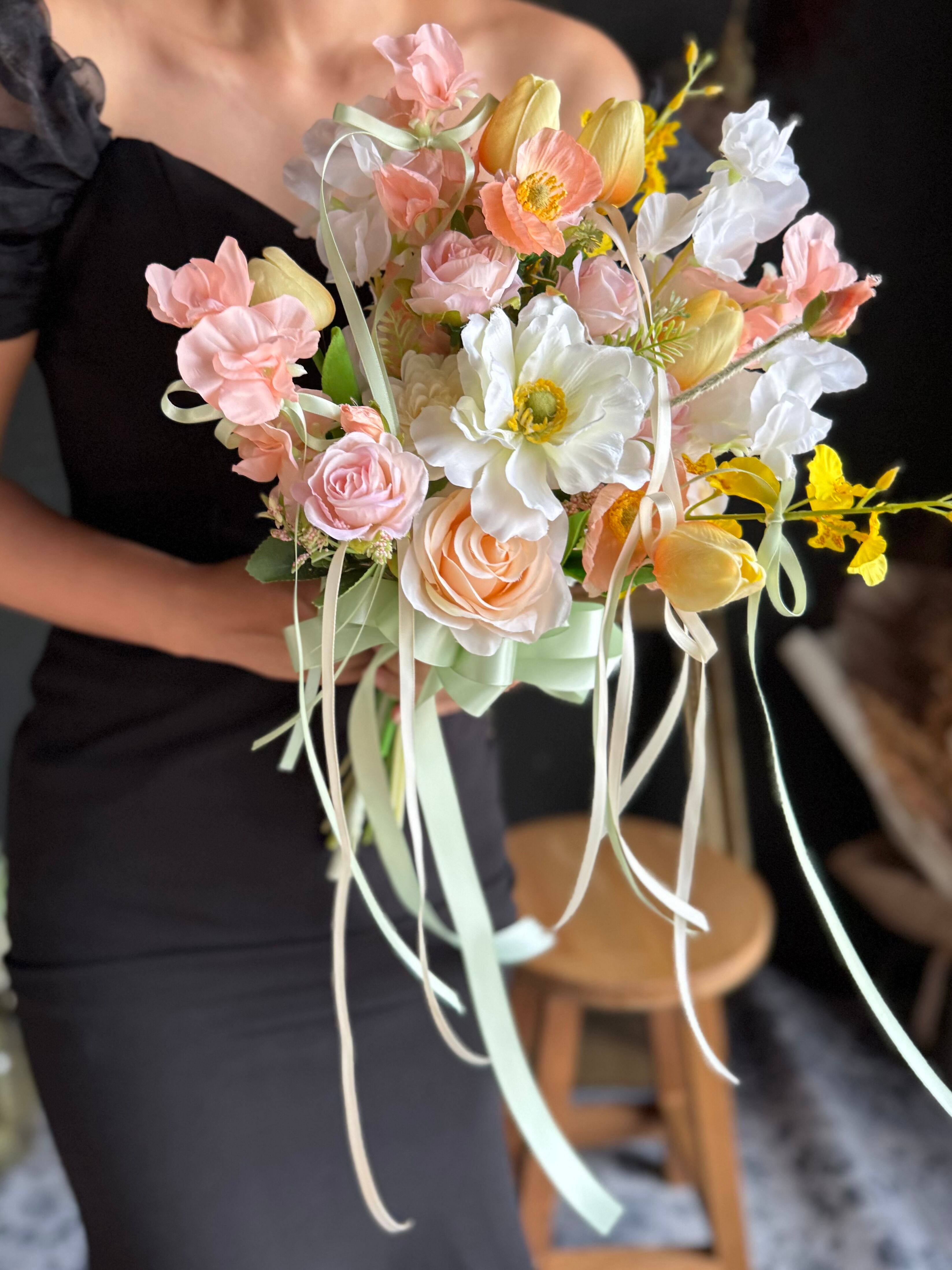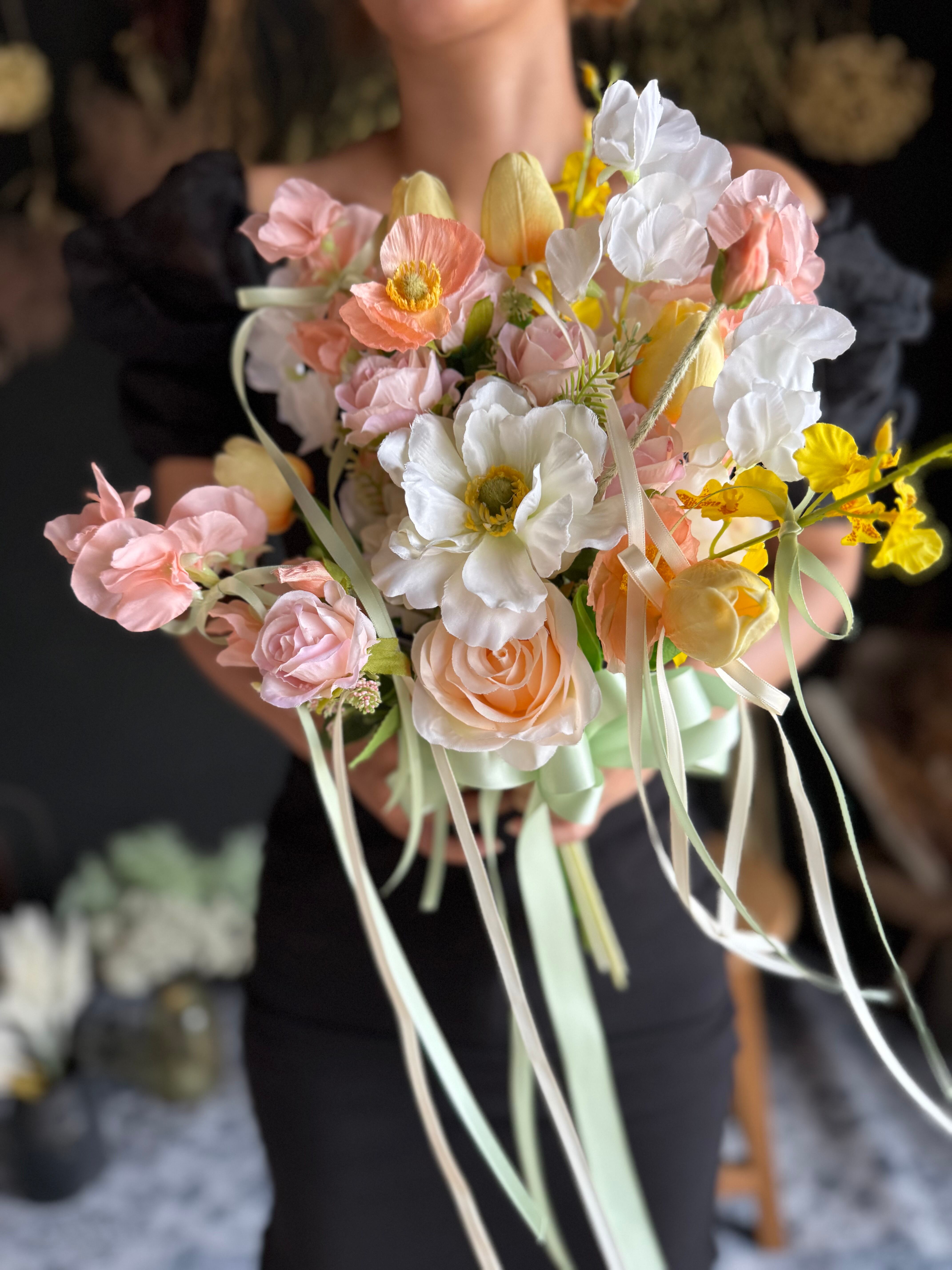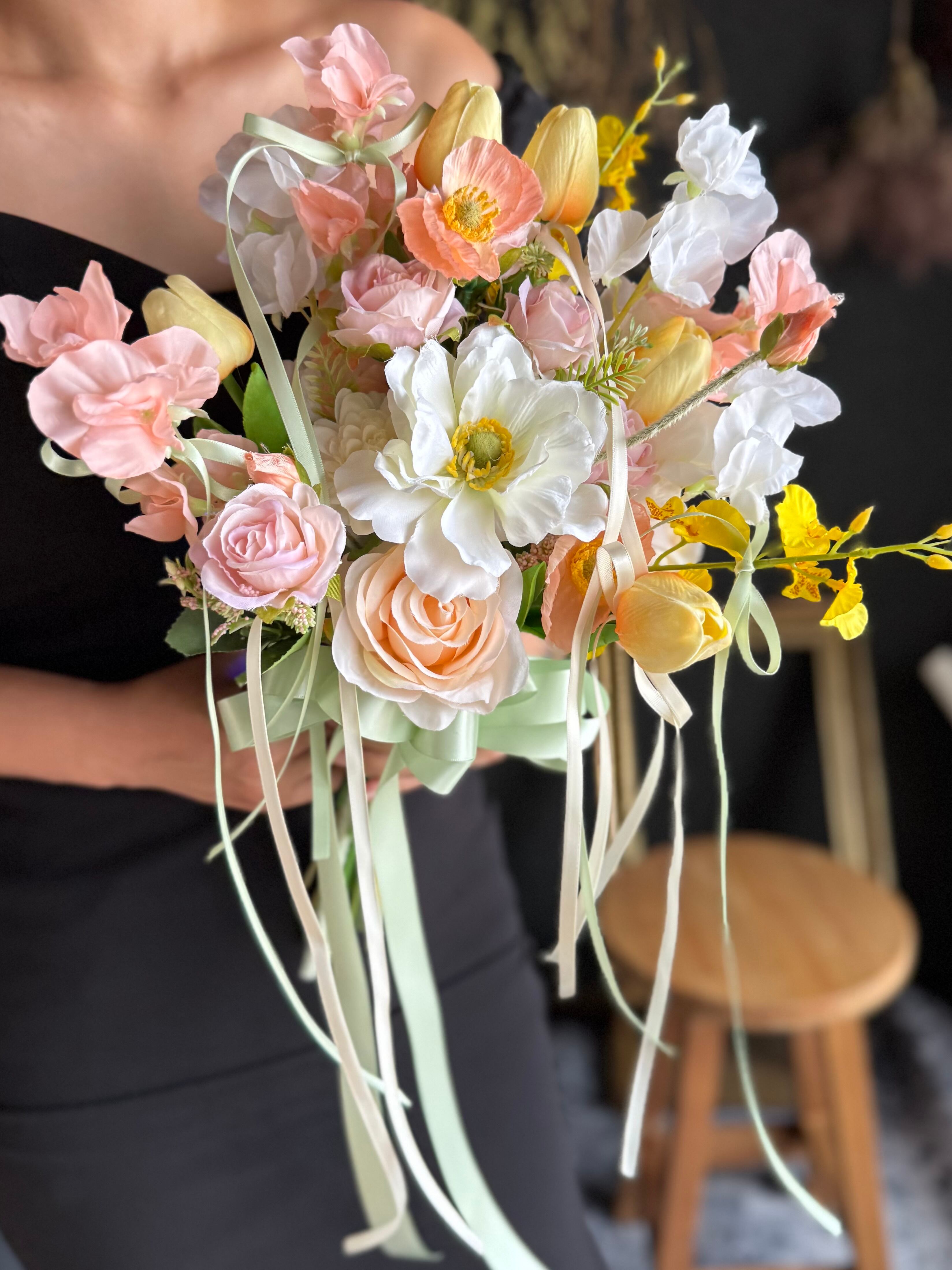 可愛いチューリップにアネモネ、スイートピーと人気のお花たちをふんわり束ね