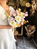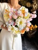 チューリップとスイートピーを合わせたクラッチブーケです♪ぴょんぴょんと飛び跳ねるような、無造作でナチュラルなブーケは華やかで軽い印象で花嫁様を彩るカラフルなブーケです•*・