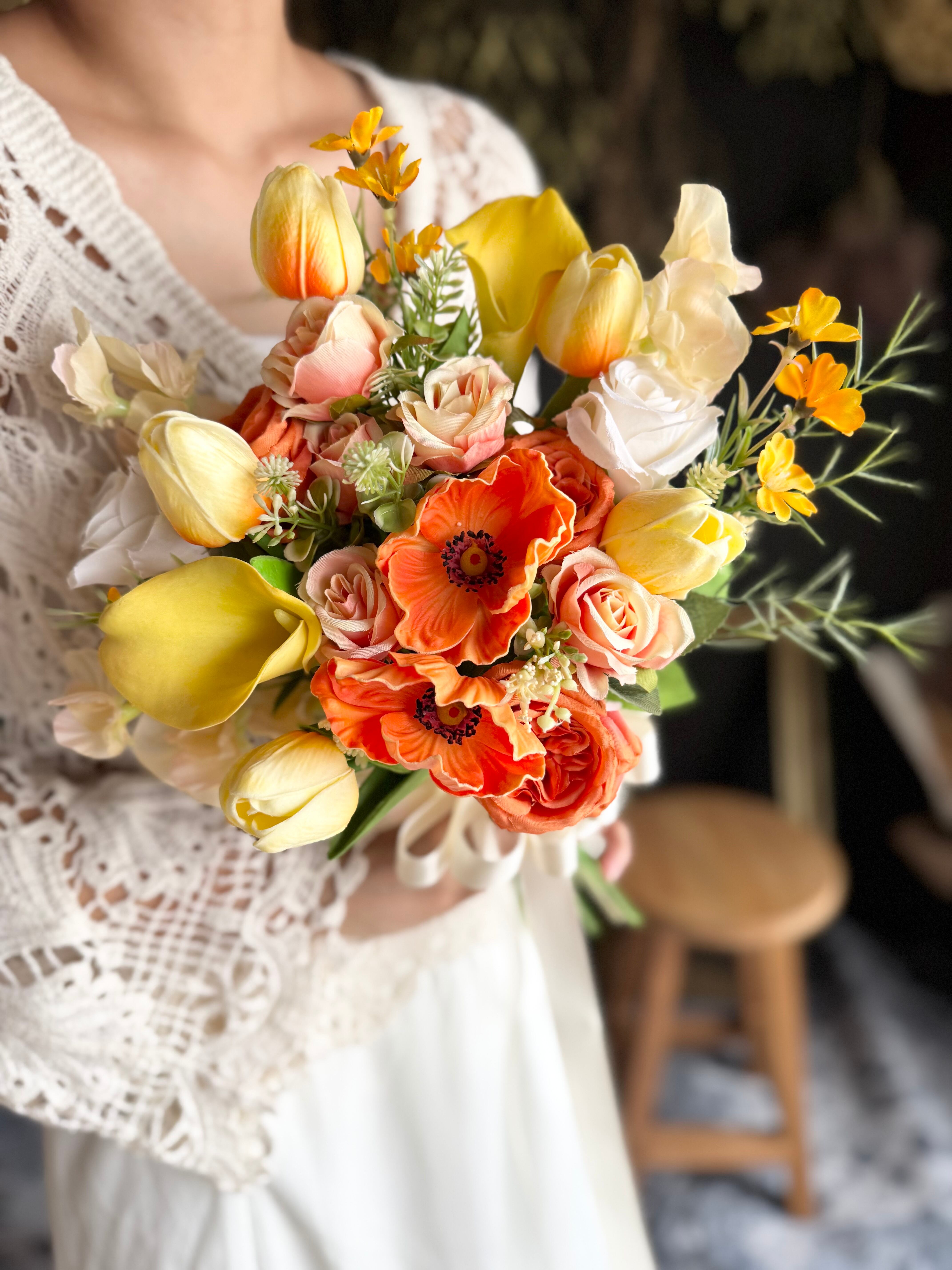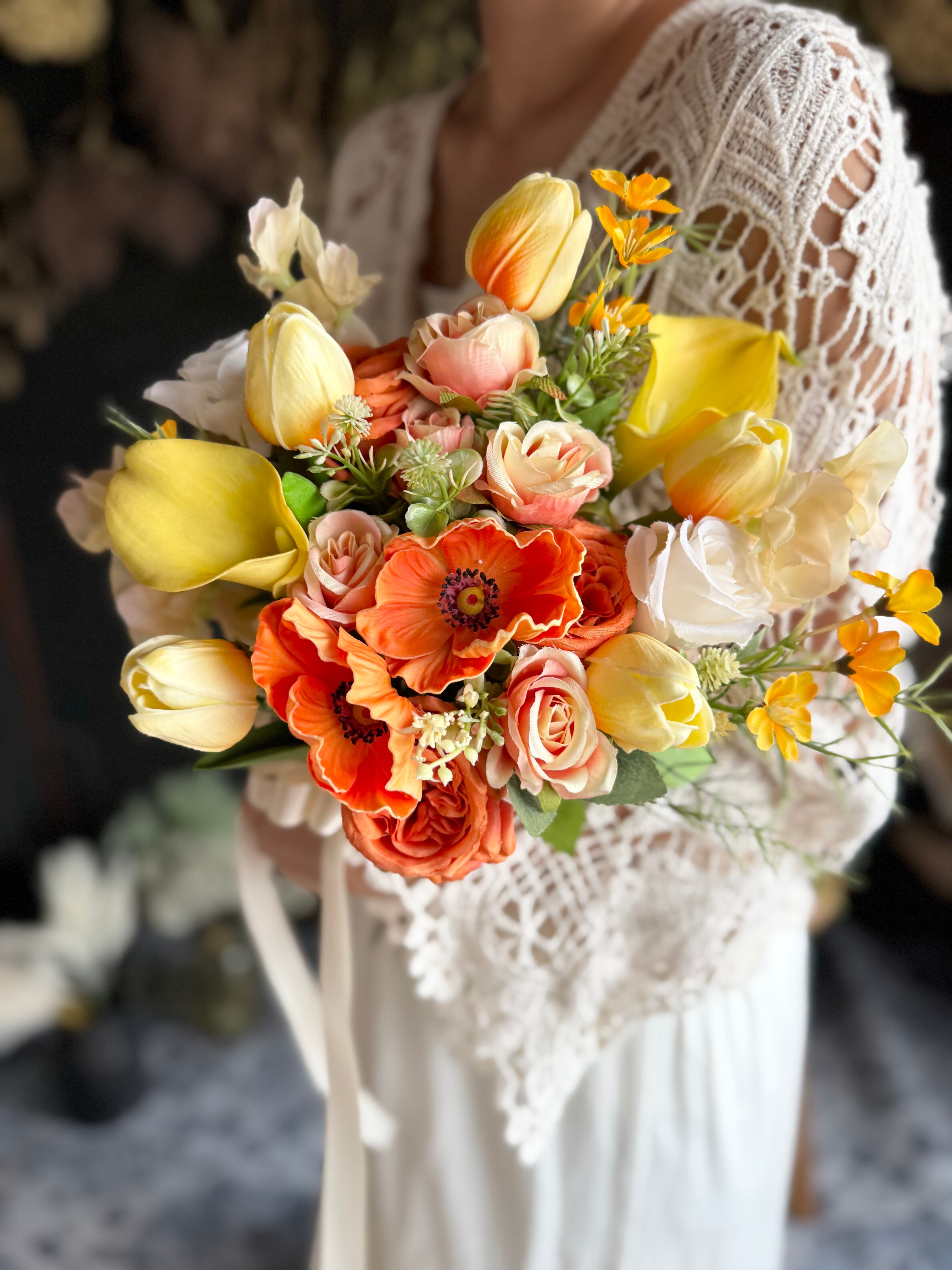 鮮やかなオレンジのアネモネとバラに、元気いっぱいのサーモンピンクチューリップを合わせた、明るく華やかなブーケ•*・