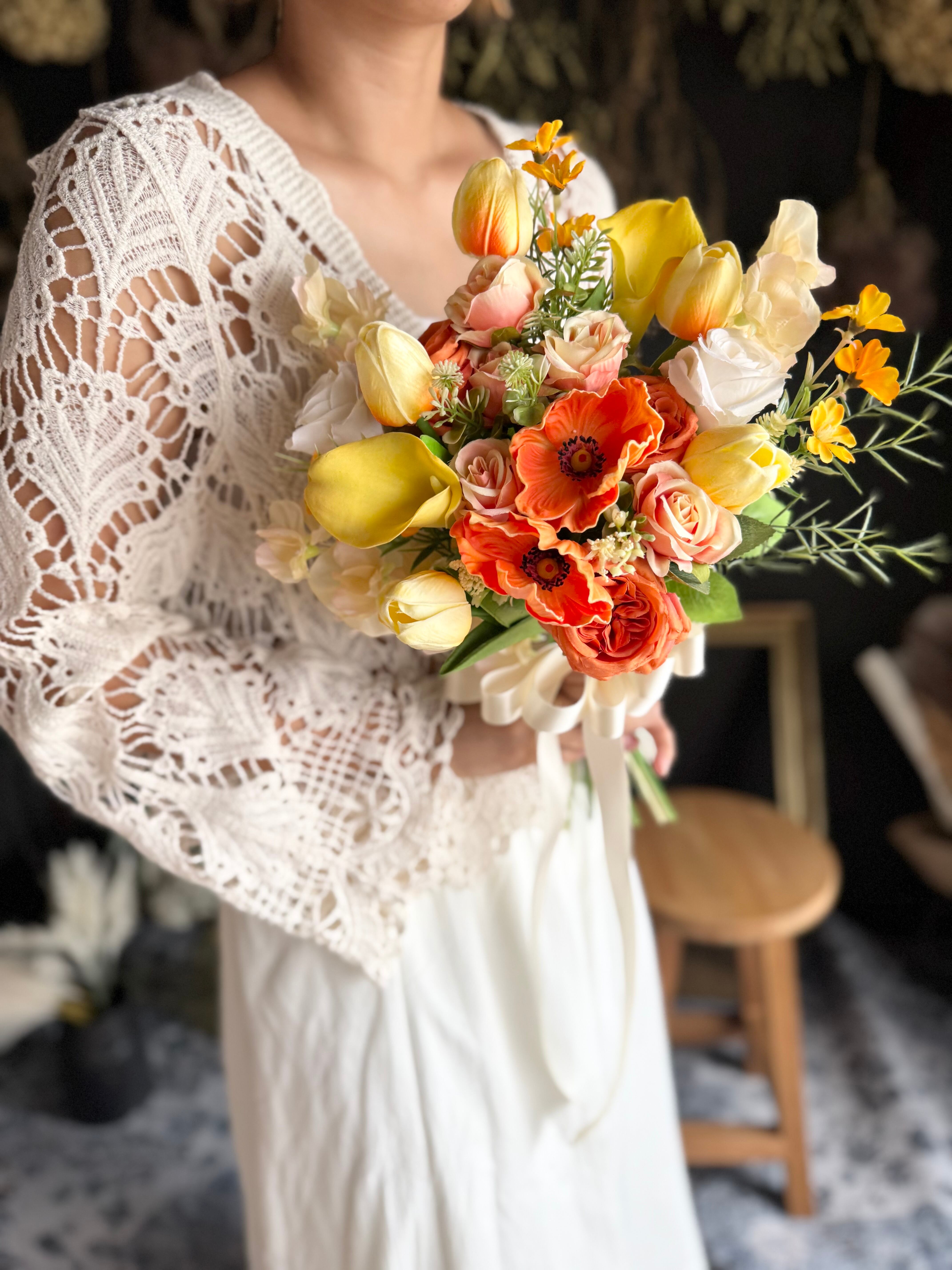 ゲストの視線を集める存在感と、花嫁さまの笑顔をより輝かせるエネルギッシュな一束です。