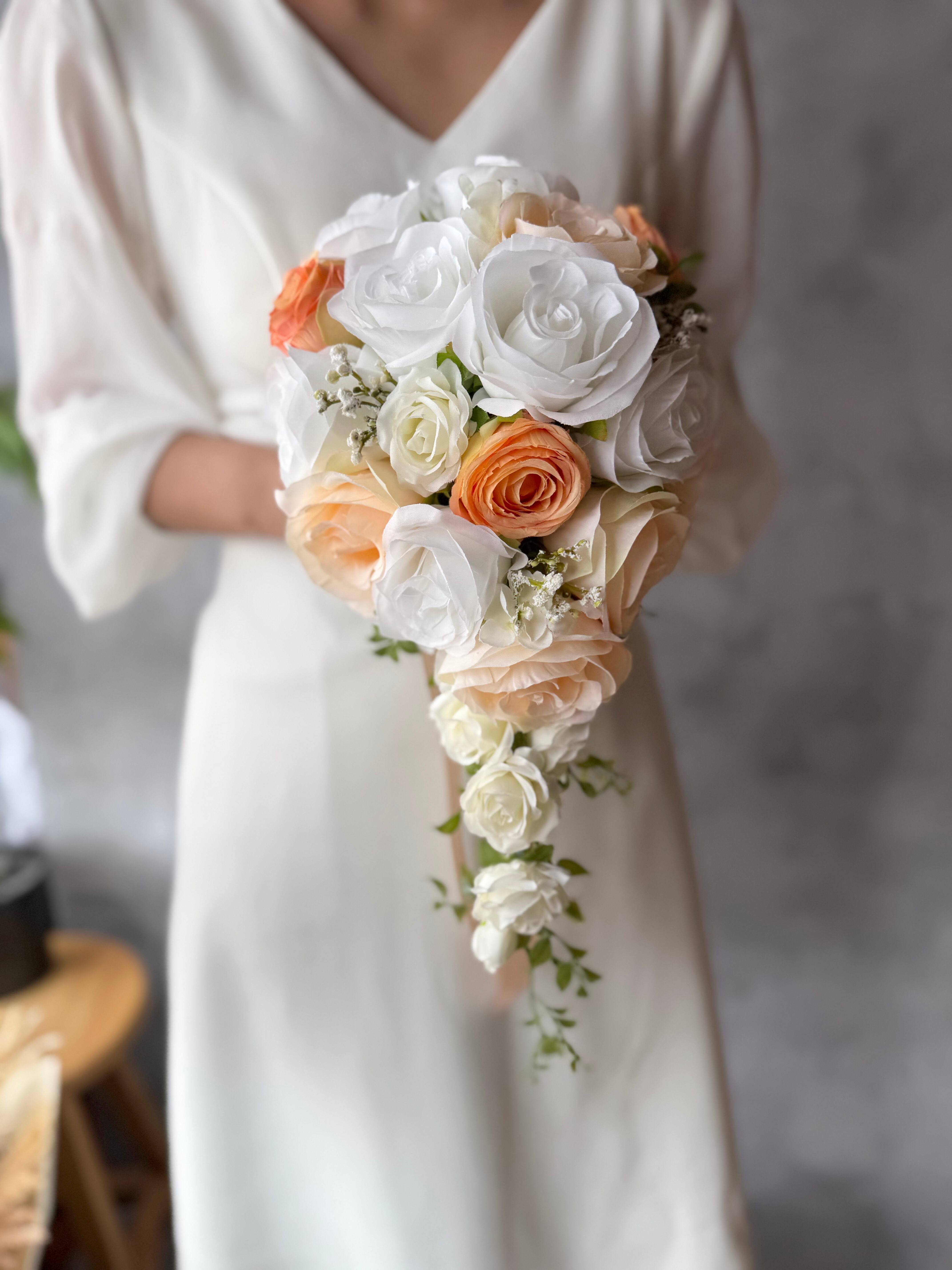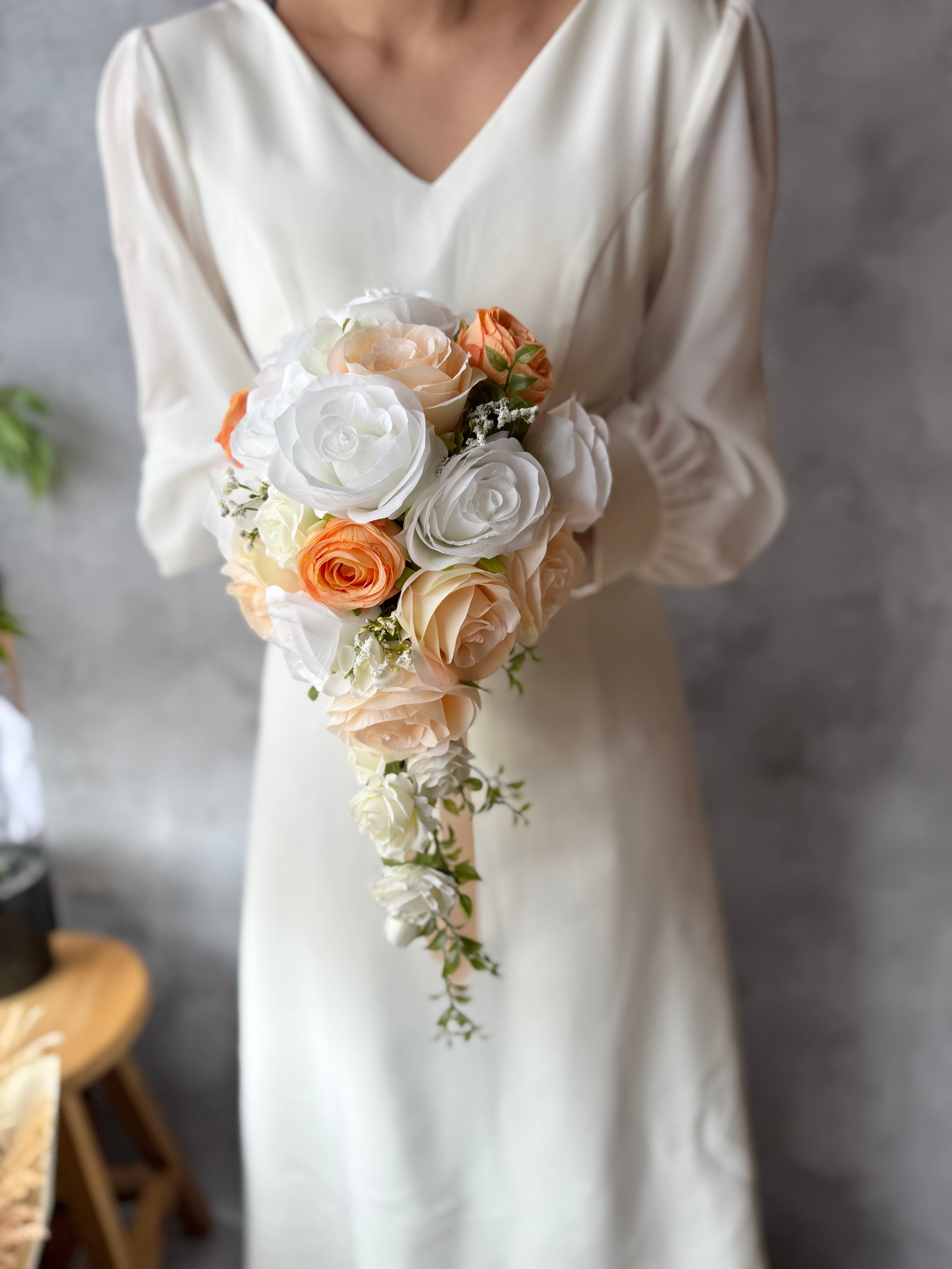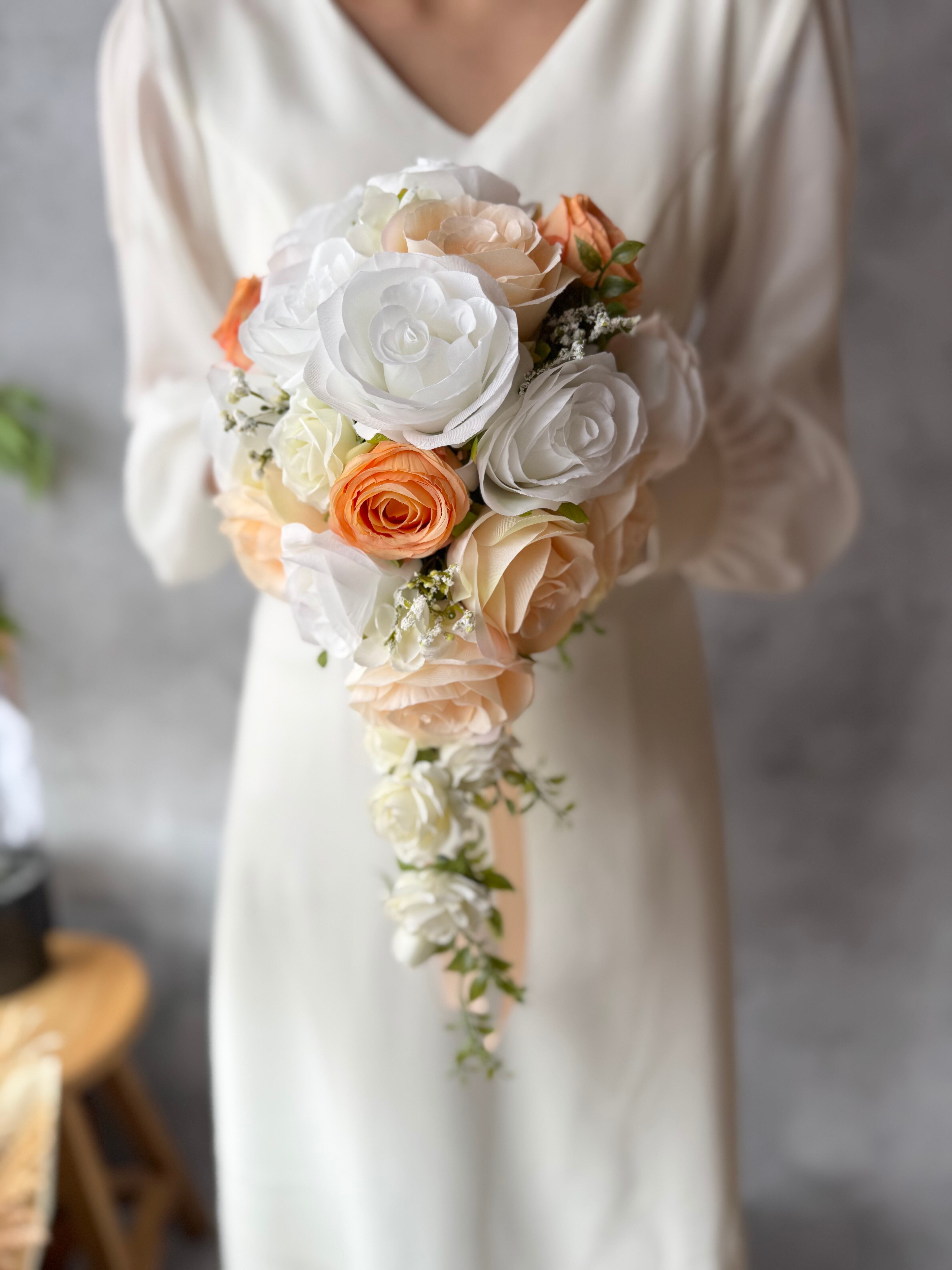 ホワイトを基調に、オレンジ系のローズを合わせた、やわらかく上品な印象のキャスケードブーケ•*・
