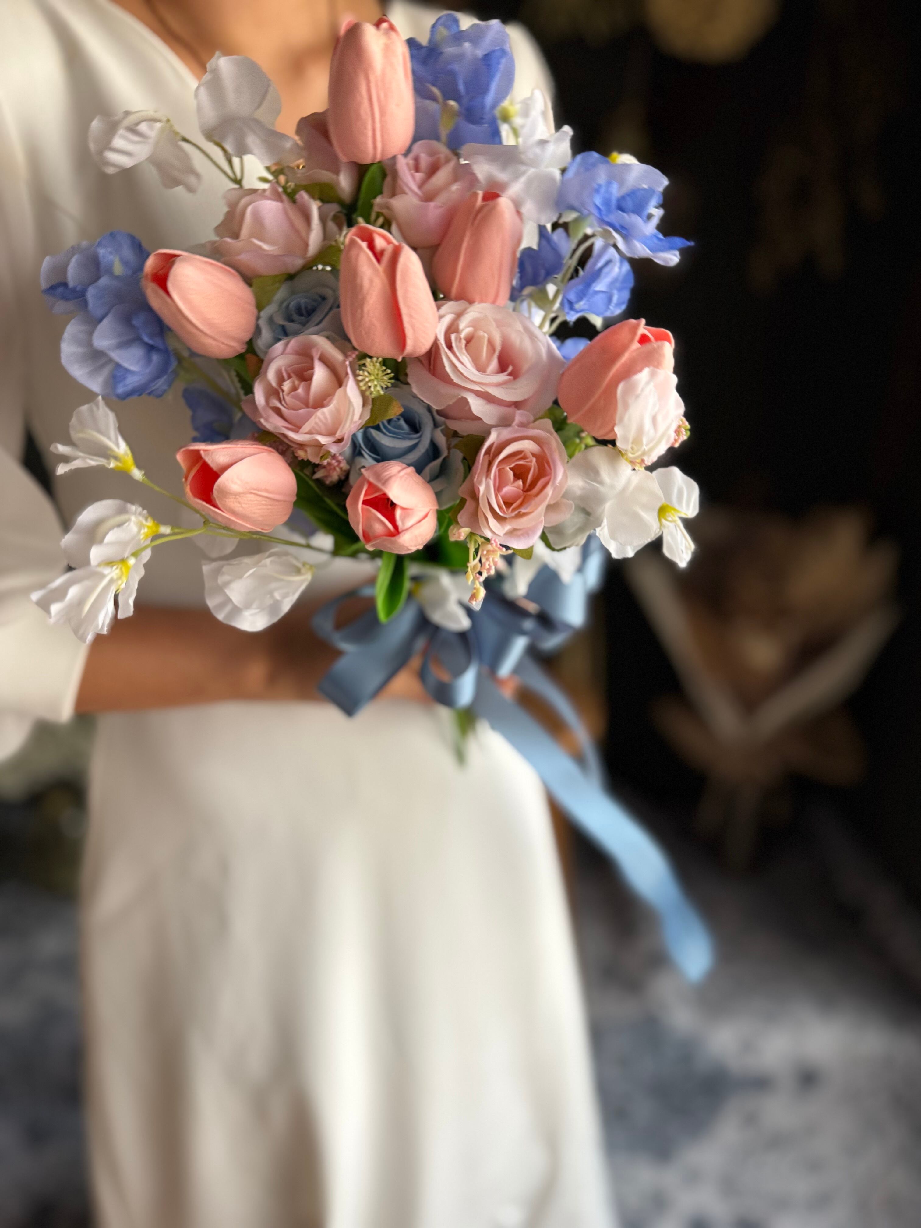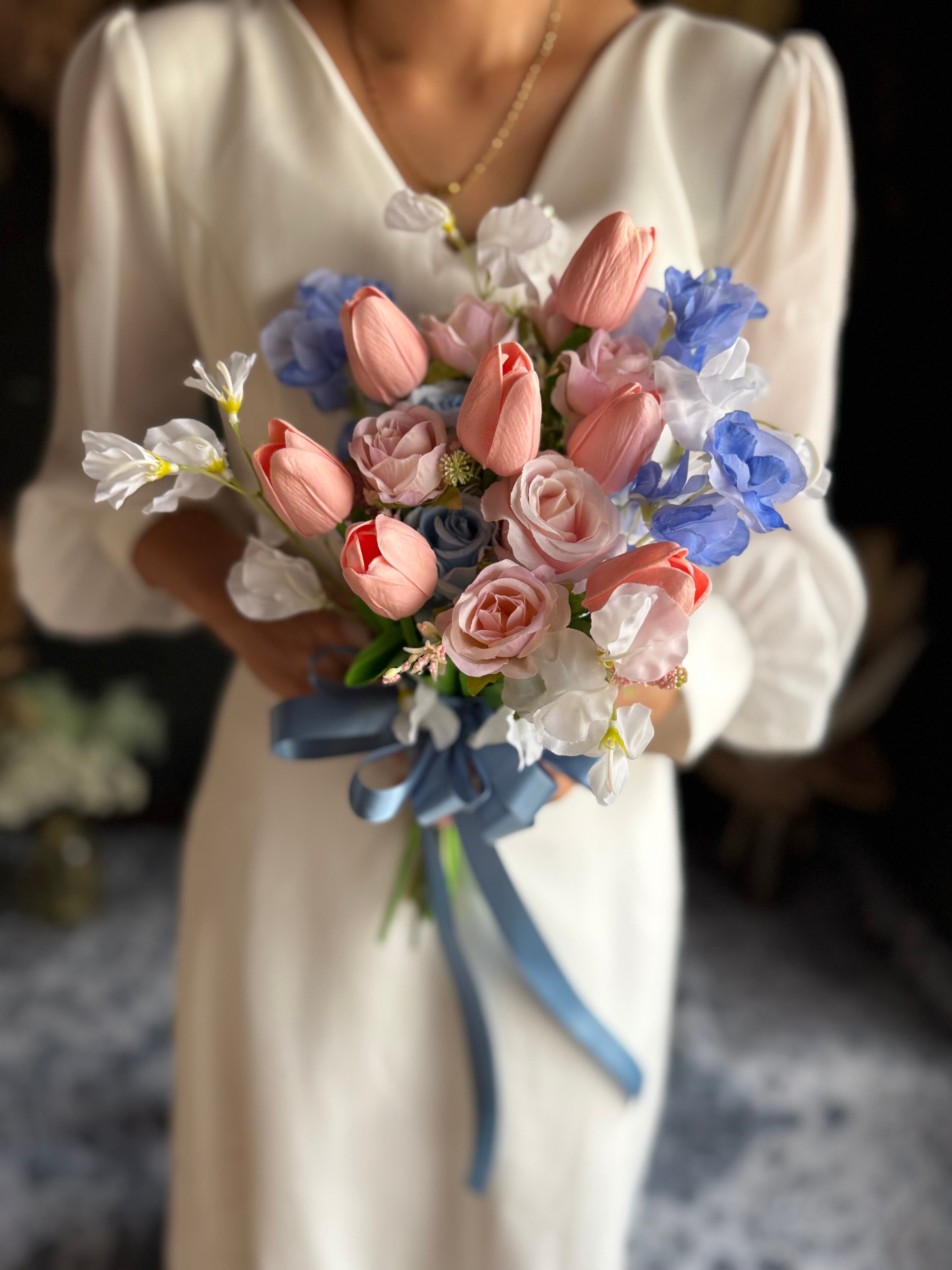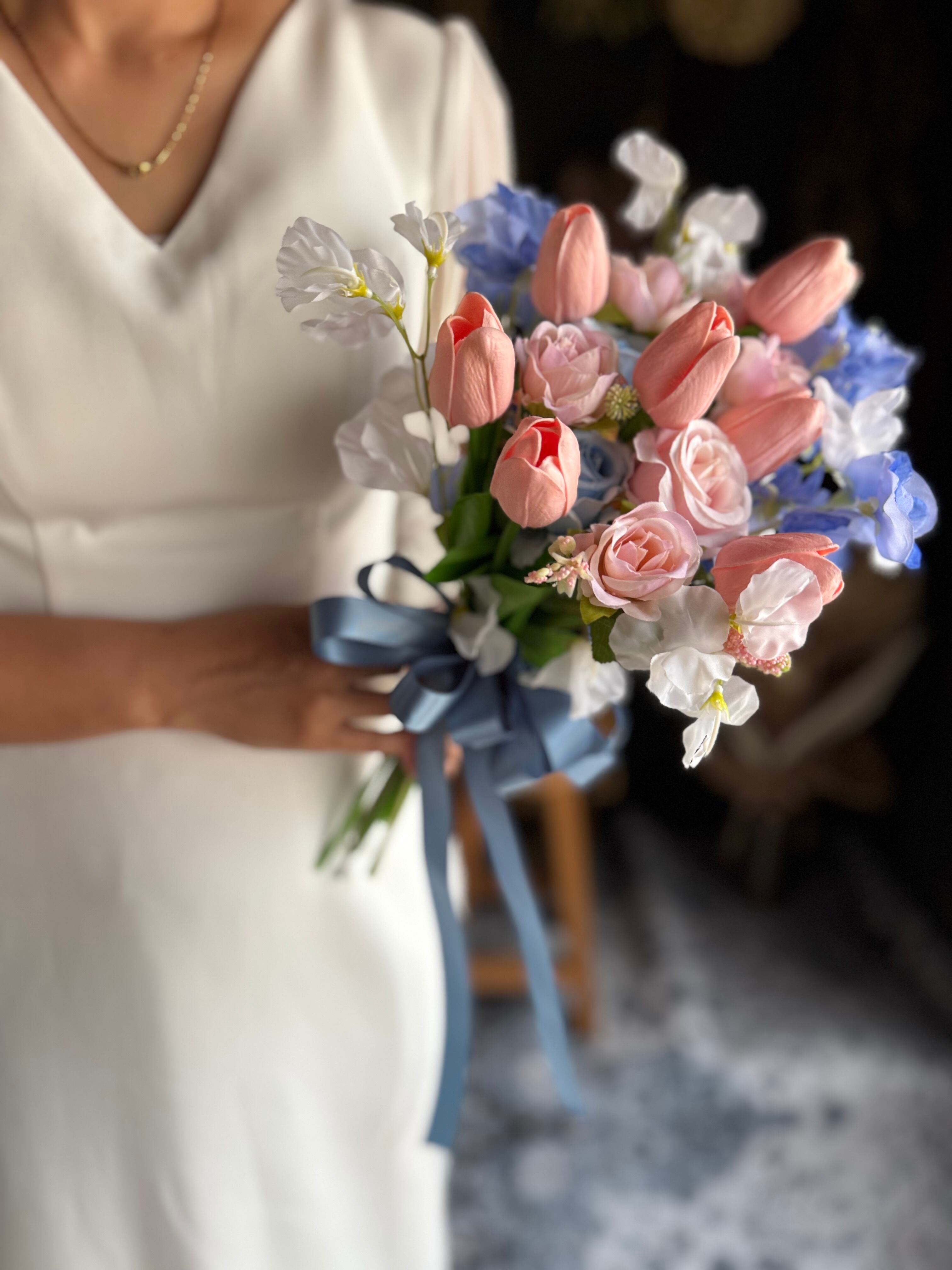 淡いピンクのチューリップにブルーのお花、くすみブルーのリボンを合わせた可愛いクラッチブーケです•*・特別な日を彩るウェディングブーケ•*・