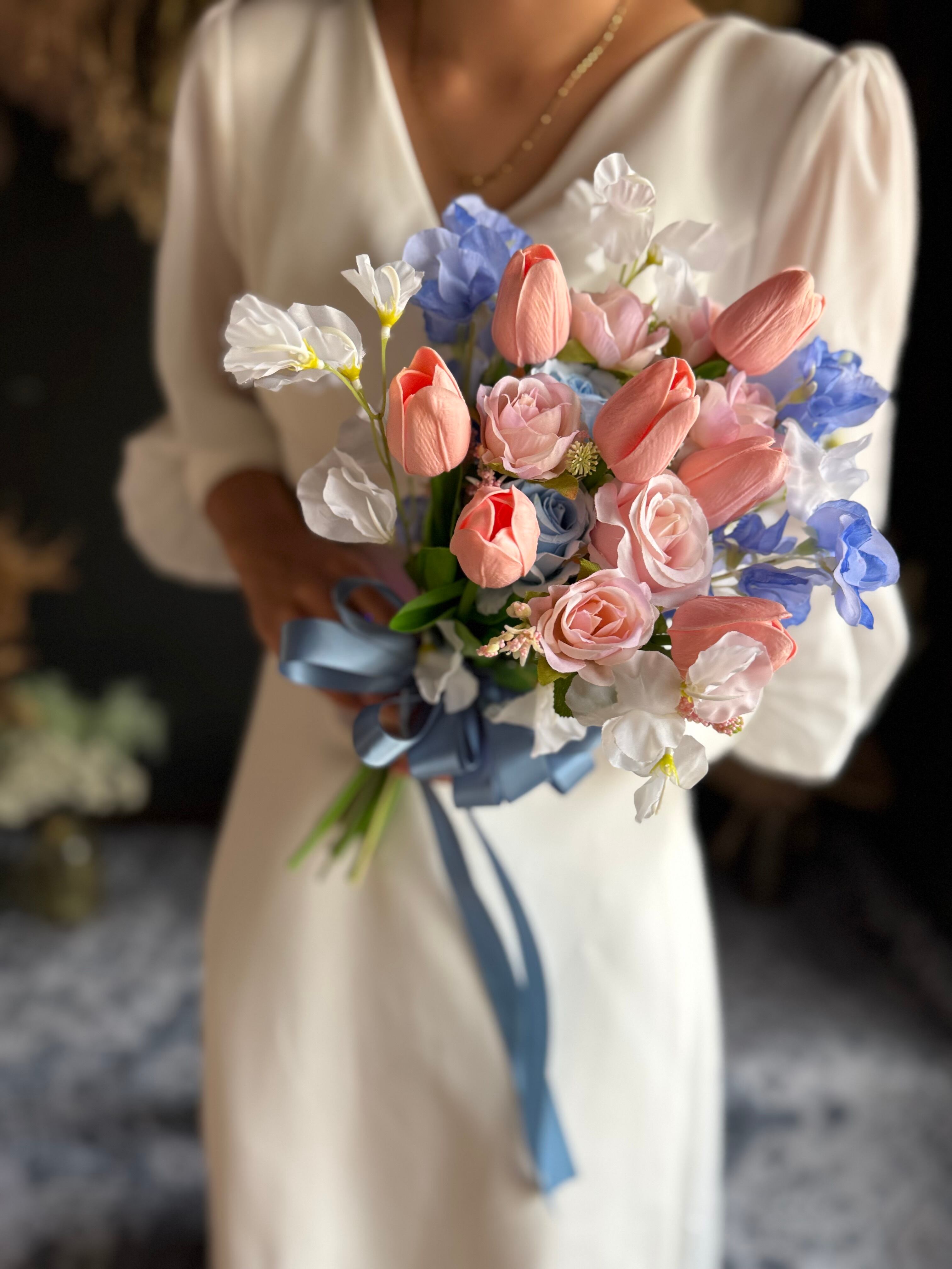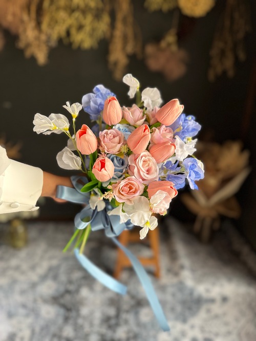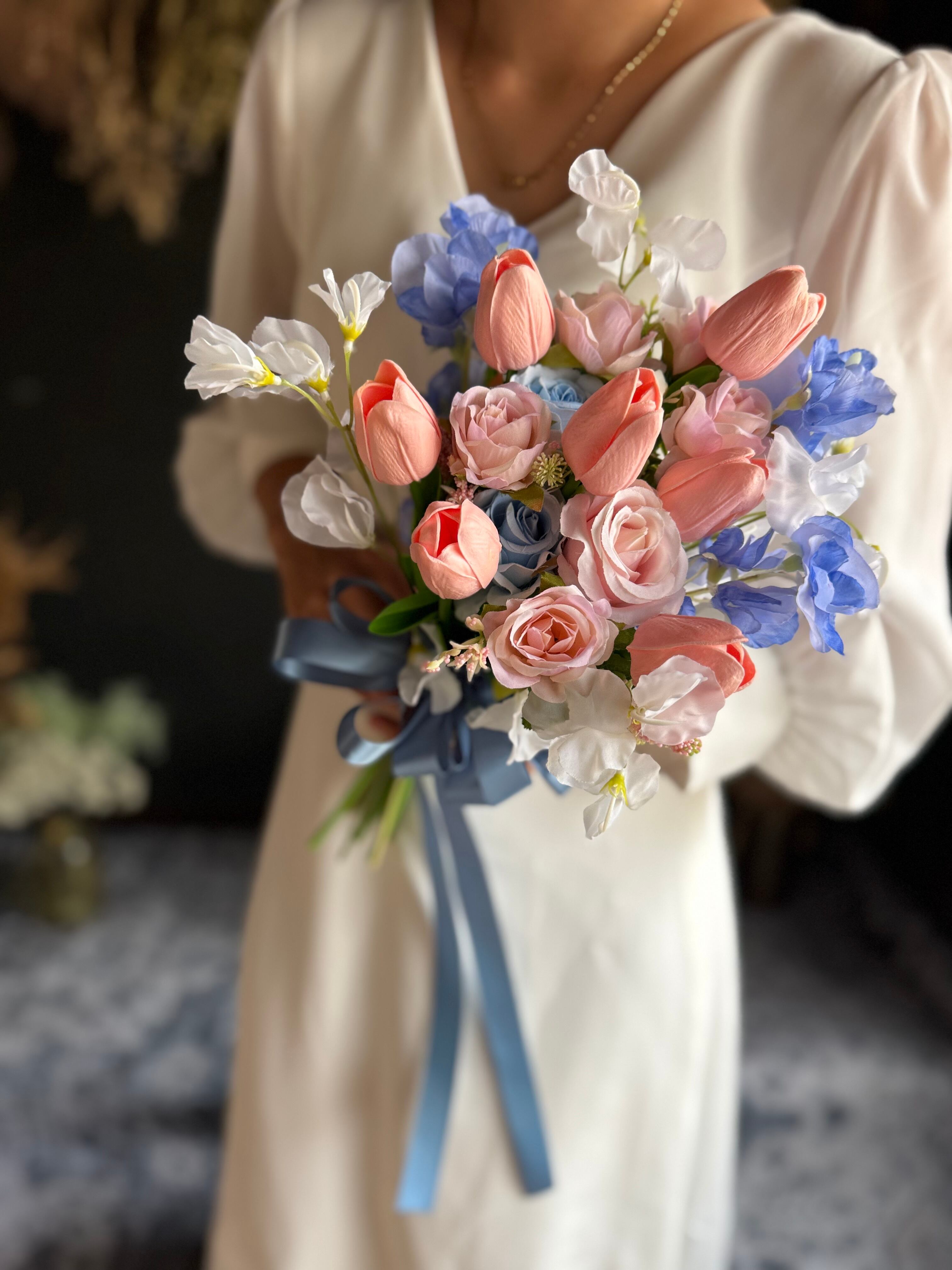 淡いピンクのチューリップにブルーのお花、くすみブルーのリボンを合わせた可愛いクラッチブーケです•*・特別な日を彩るウェディングブーケ•*・