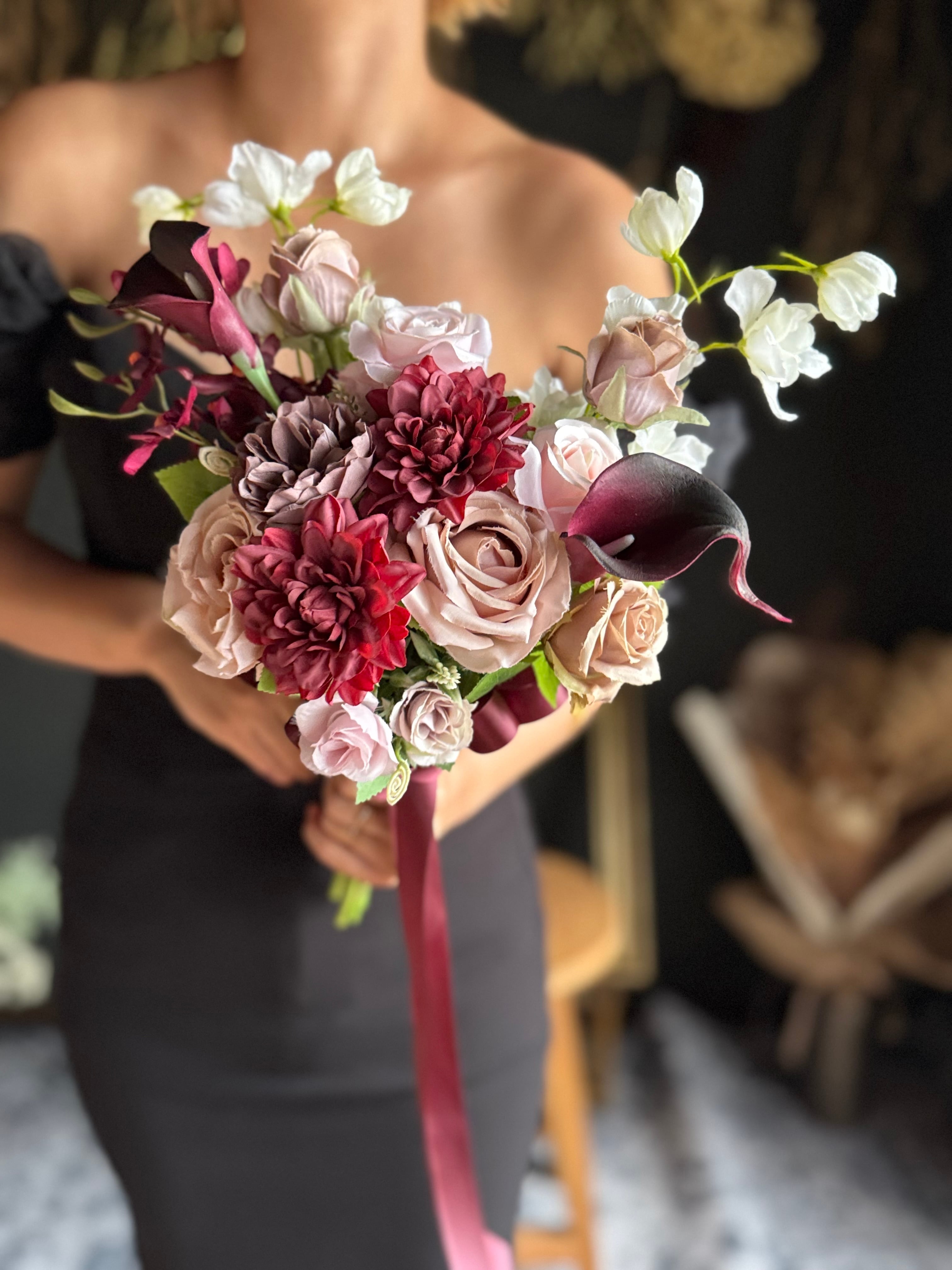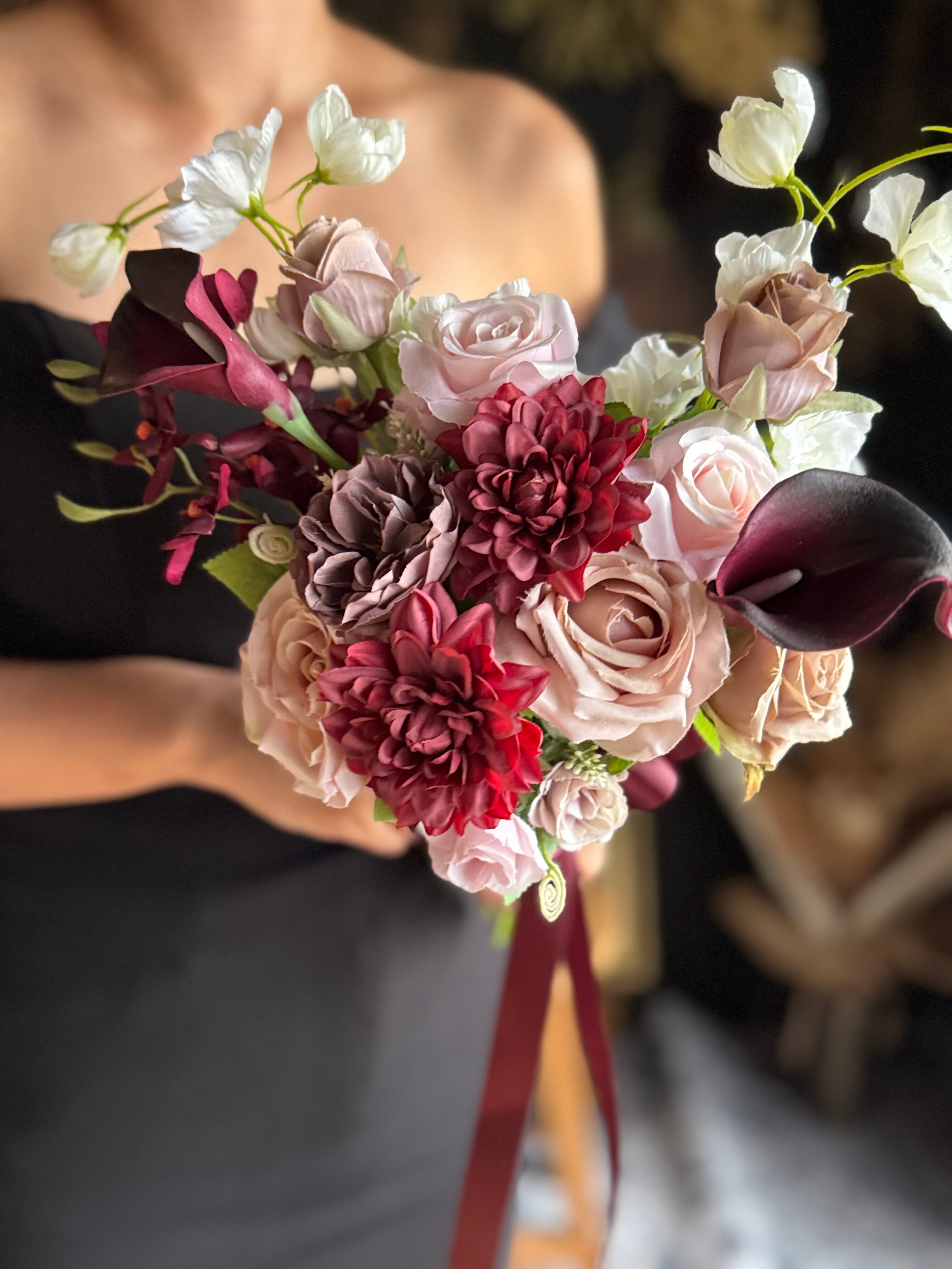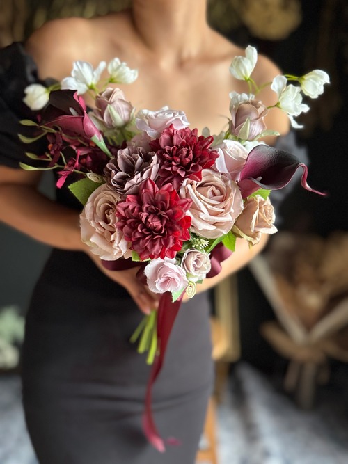 上品で華やかな印象を与えるウェディングブーケ♪落ち着いた赤やくすみカラーはどんなドレスにもなじみやすく、おしゃれな印象も与えます^ ^