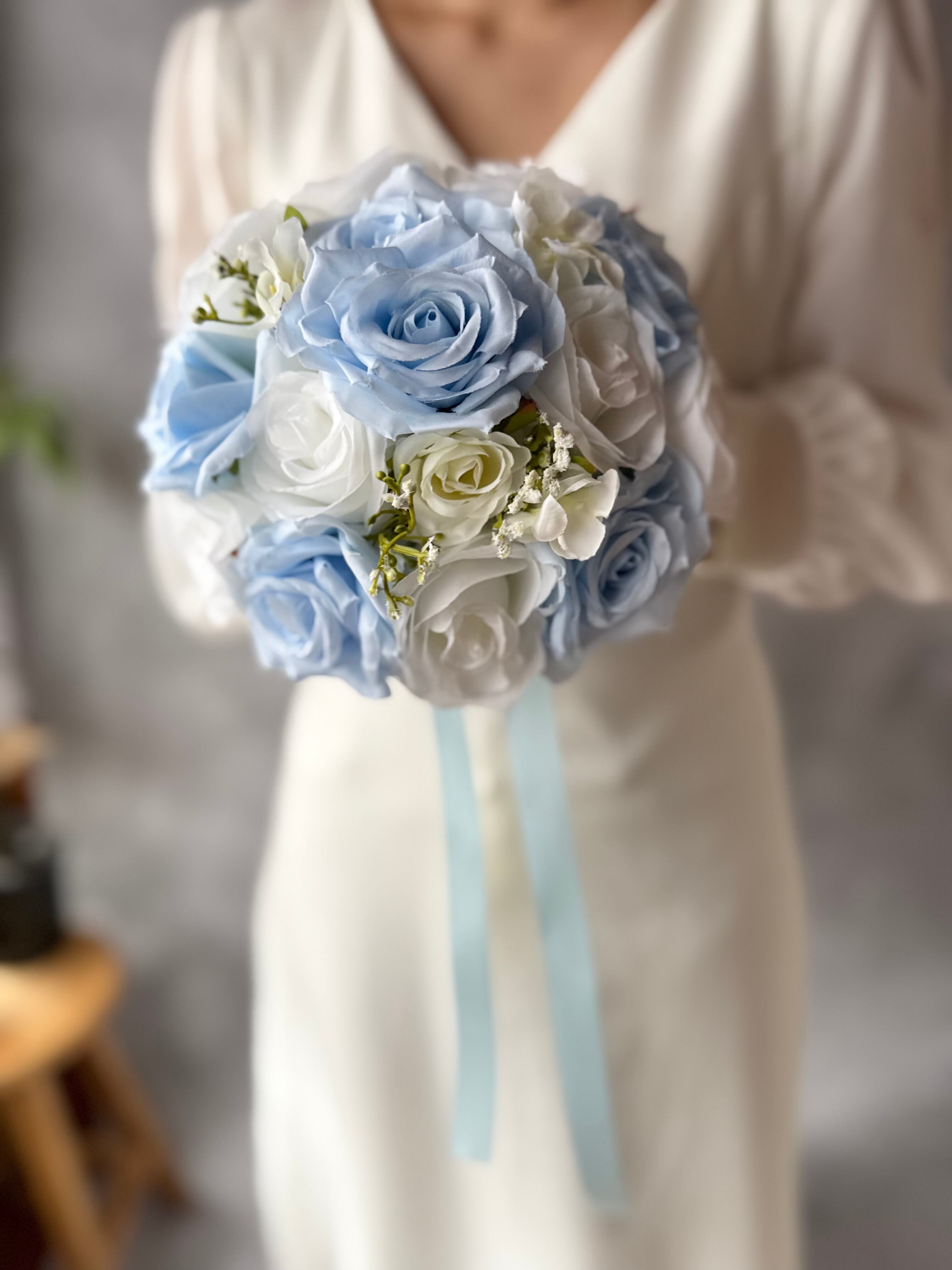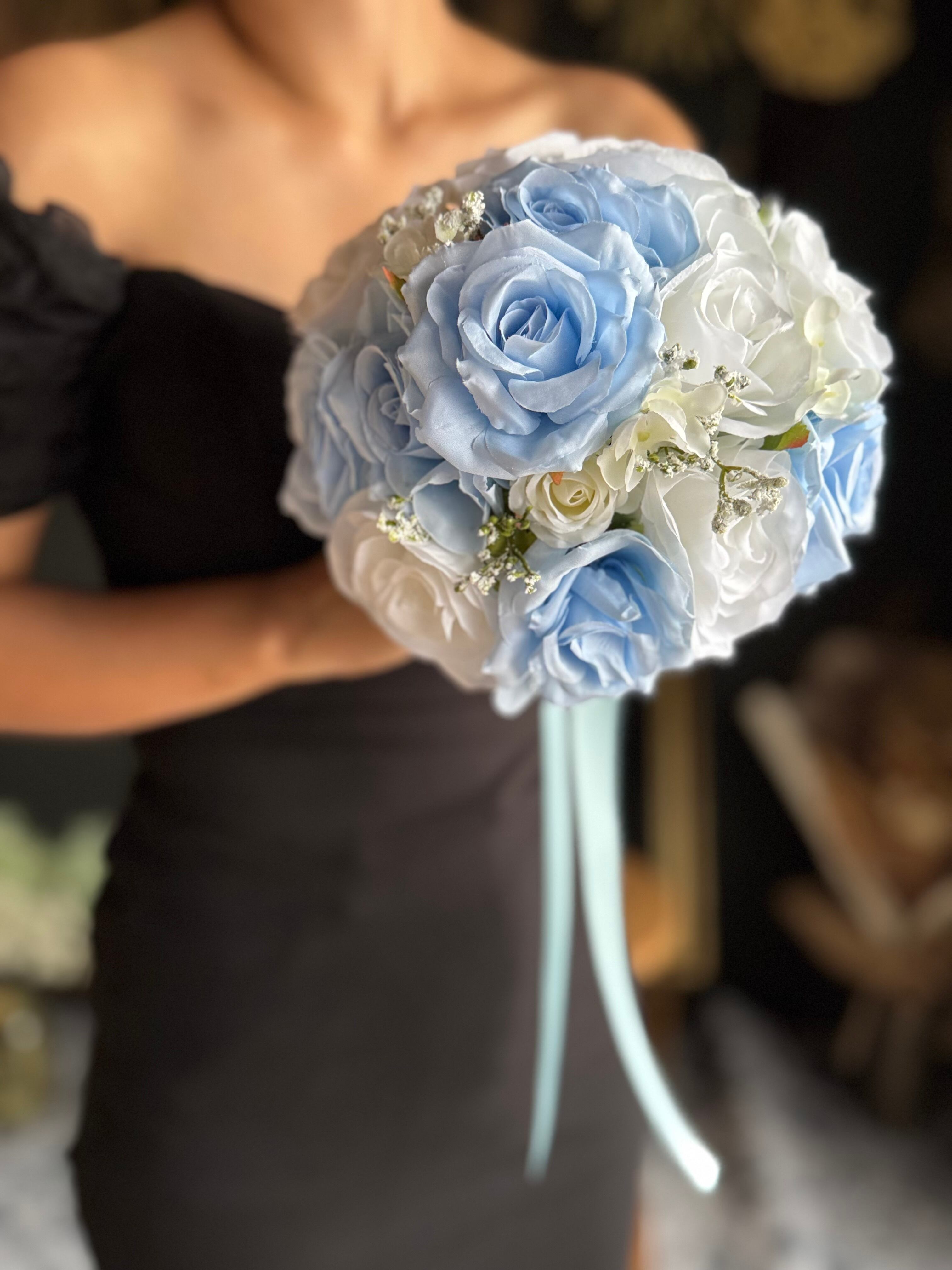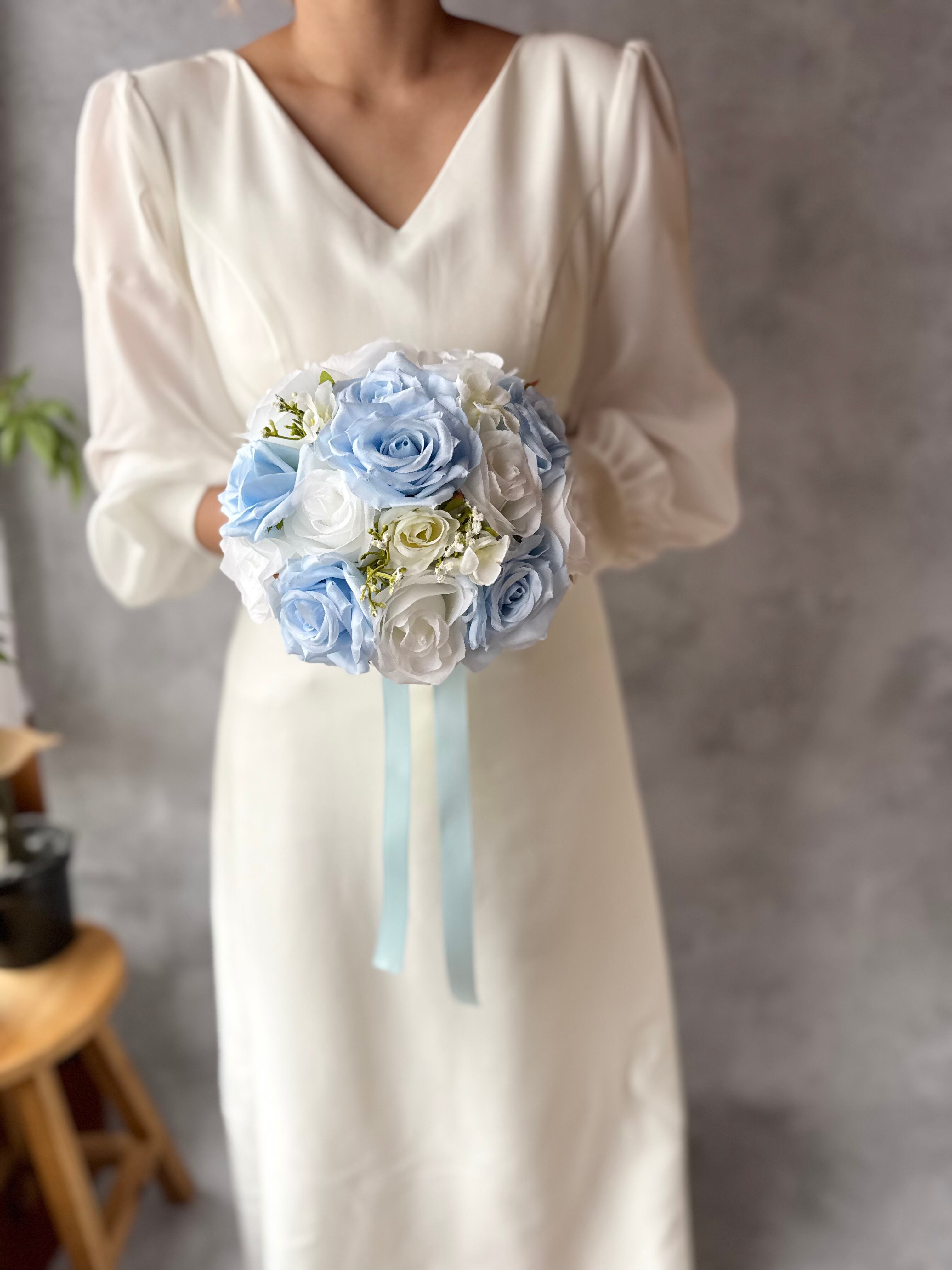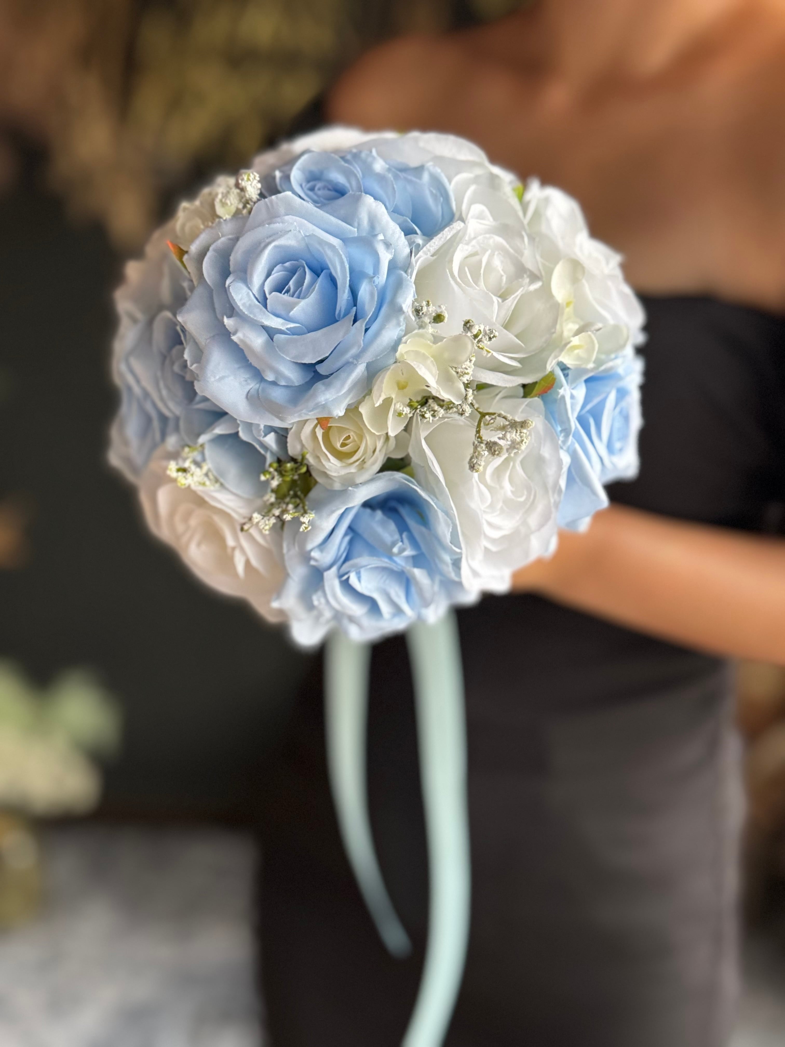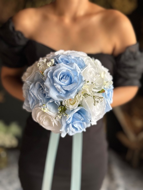 清涼感溢れるブルーやホワイトの花材をつかった、マリンスタイルにぴったりのラウンドブーケです♪もちろん、ウエディングブーケとしてもオススメです。涼しげなブルーがあなたの特別な日を彩ります^ ^