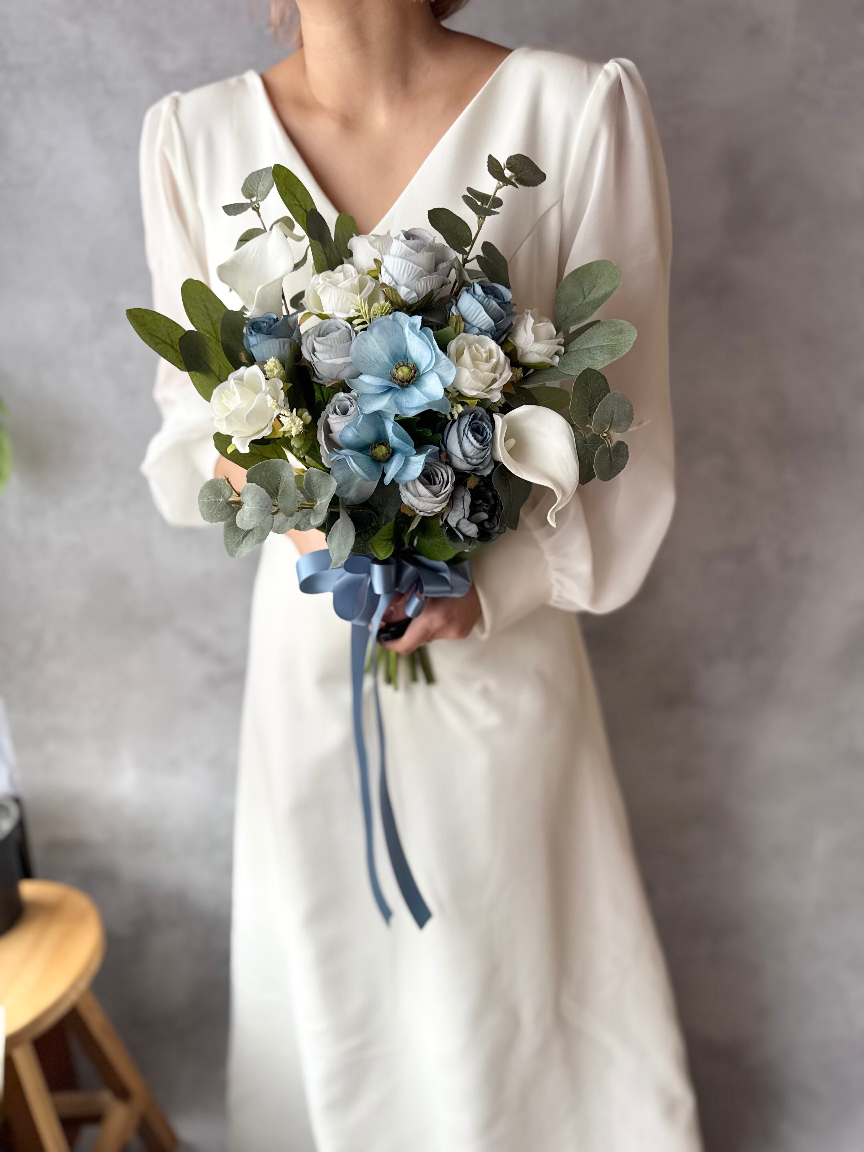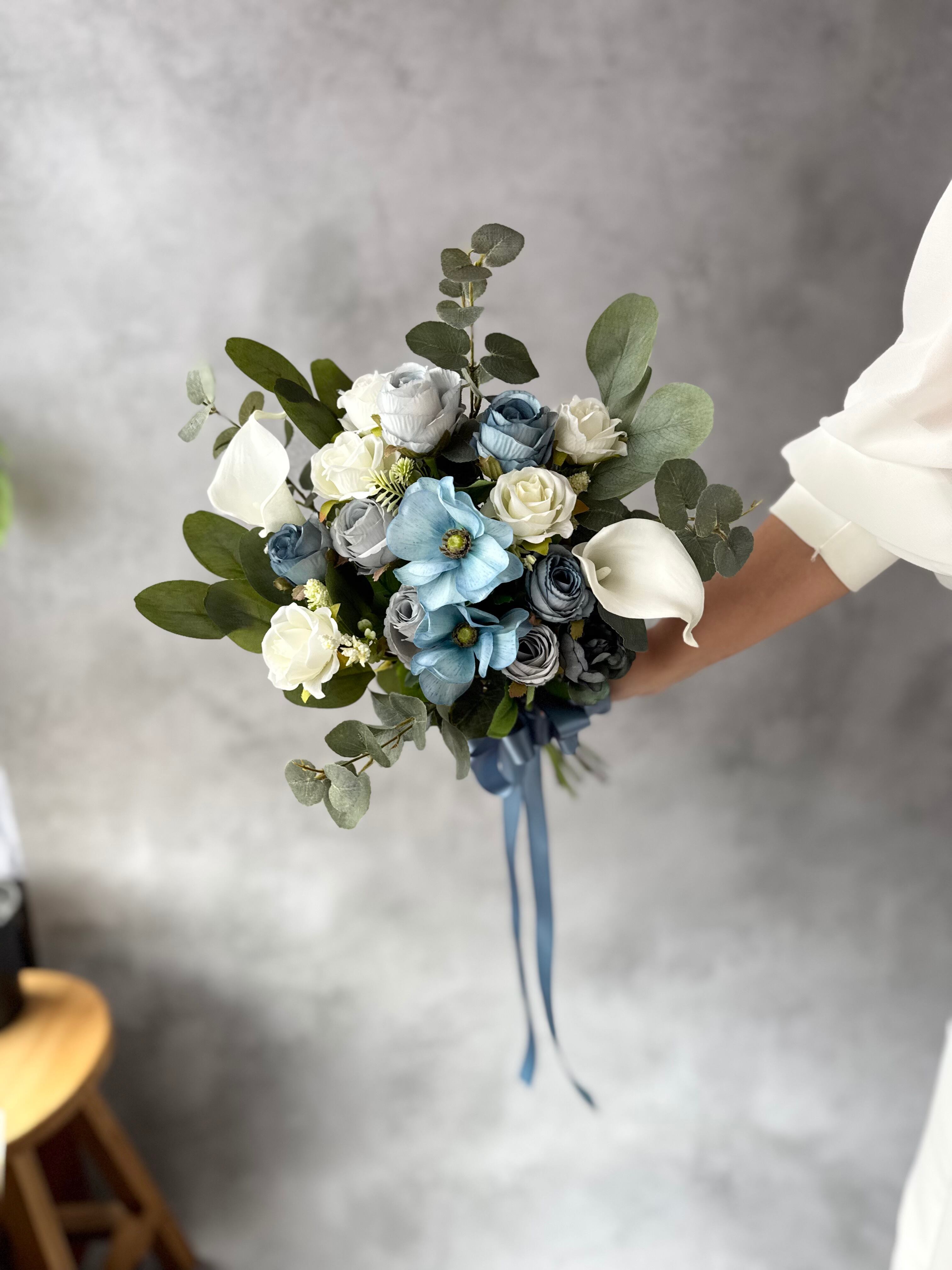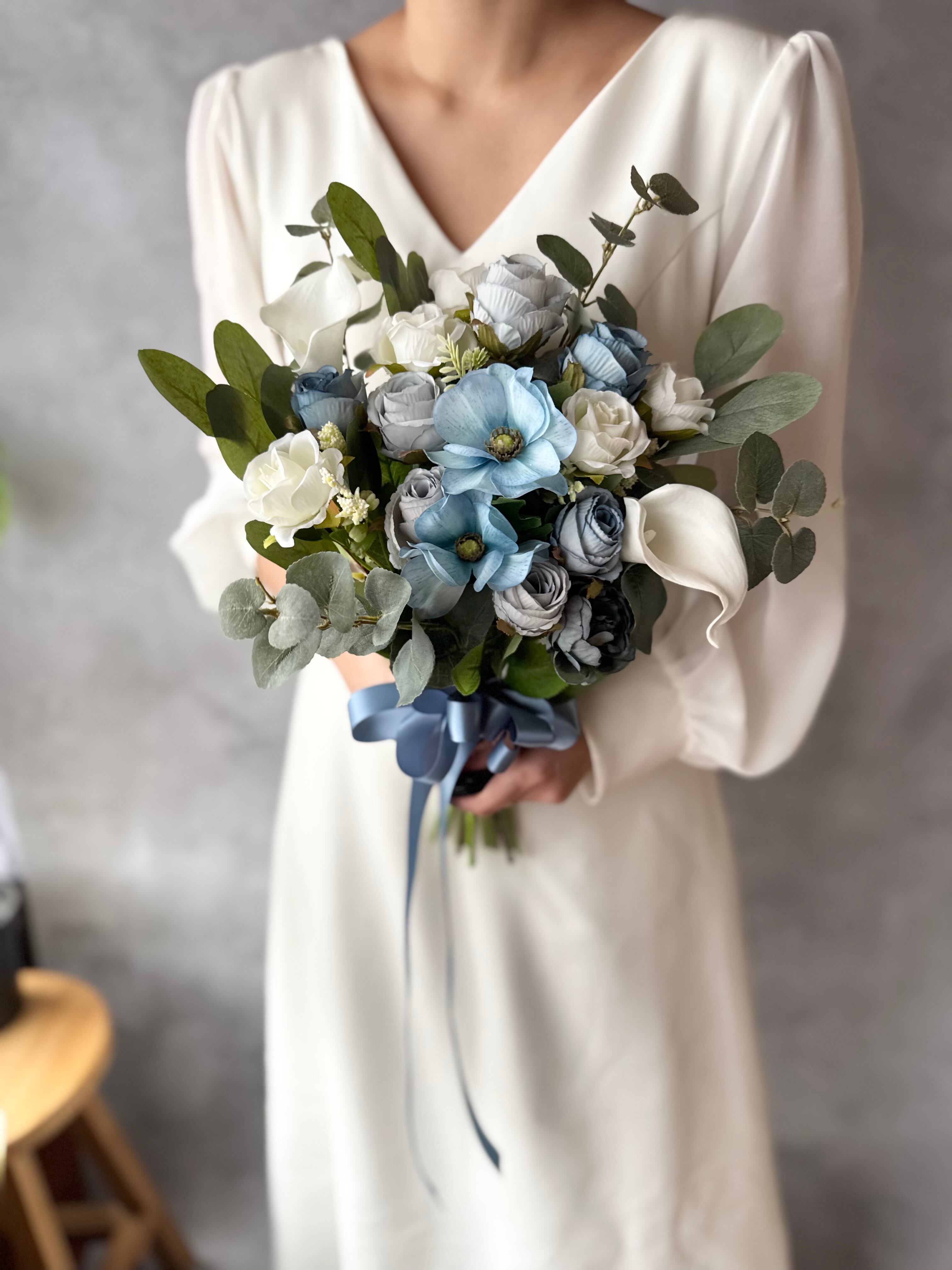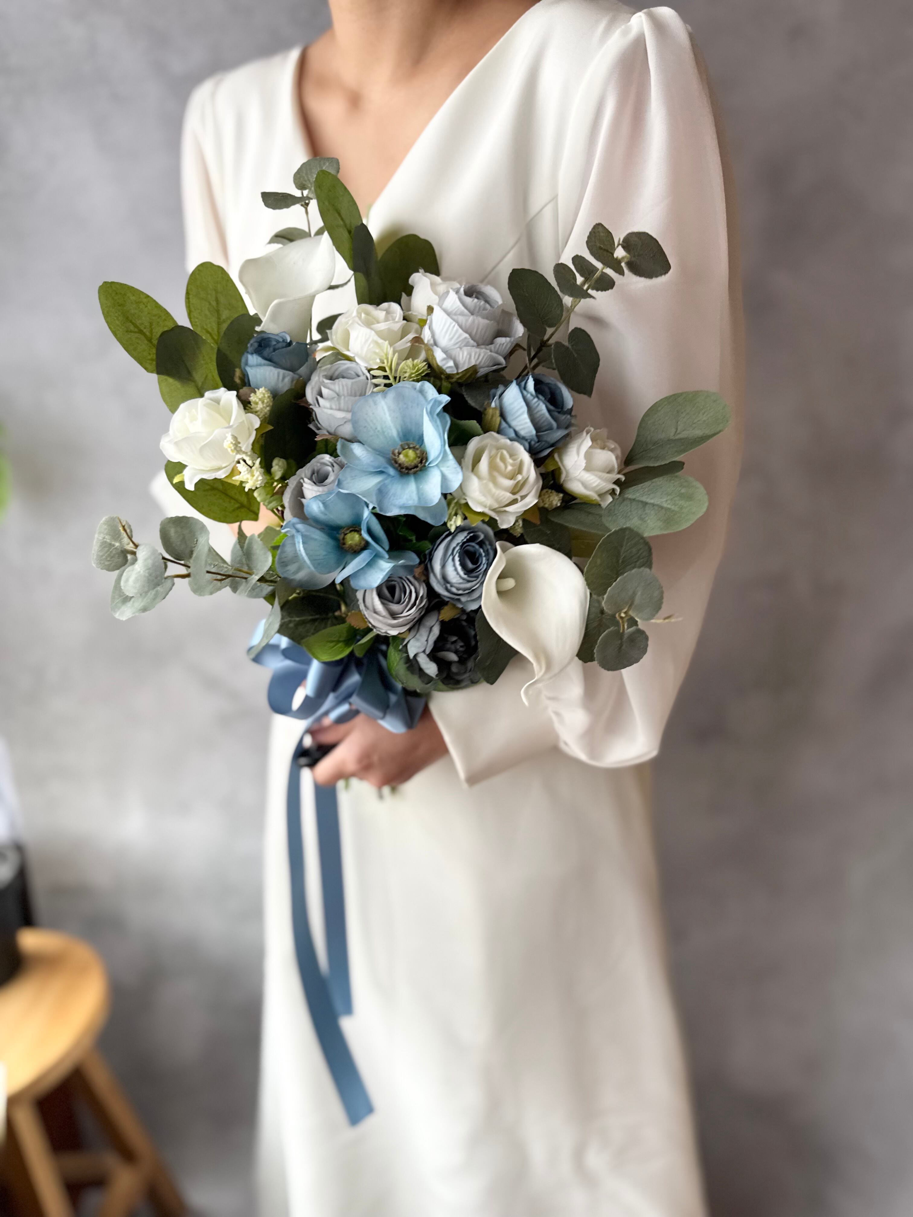 水色・ブルー・ネイビーと、奥行きのある青を重ねたグラデーションブーケ。 •*・