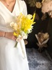華やかな黄色が目を引くこちらのブーケは、さわやかで明るい印象を与えてくれます。ミモザの花言葉は「感謝」と「思いやり」など。特別な日にぴったりのブーケ•*・