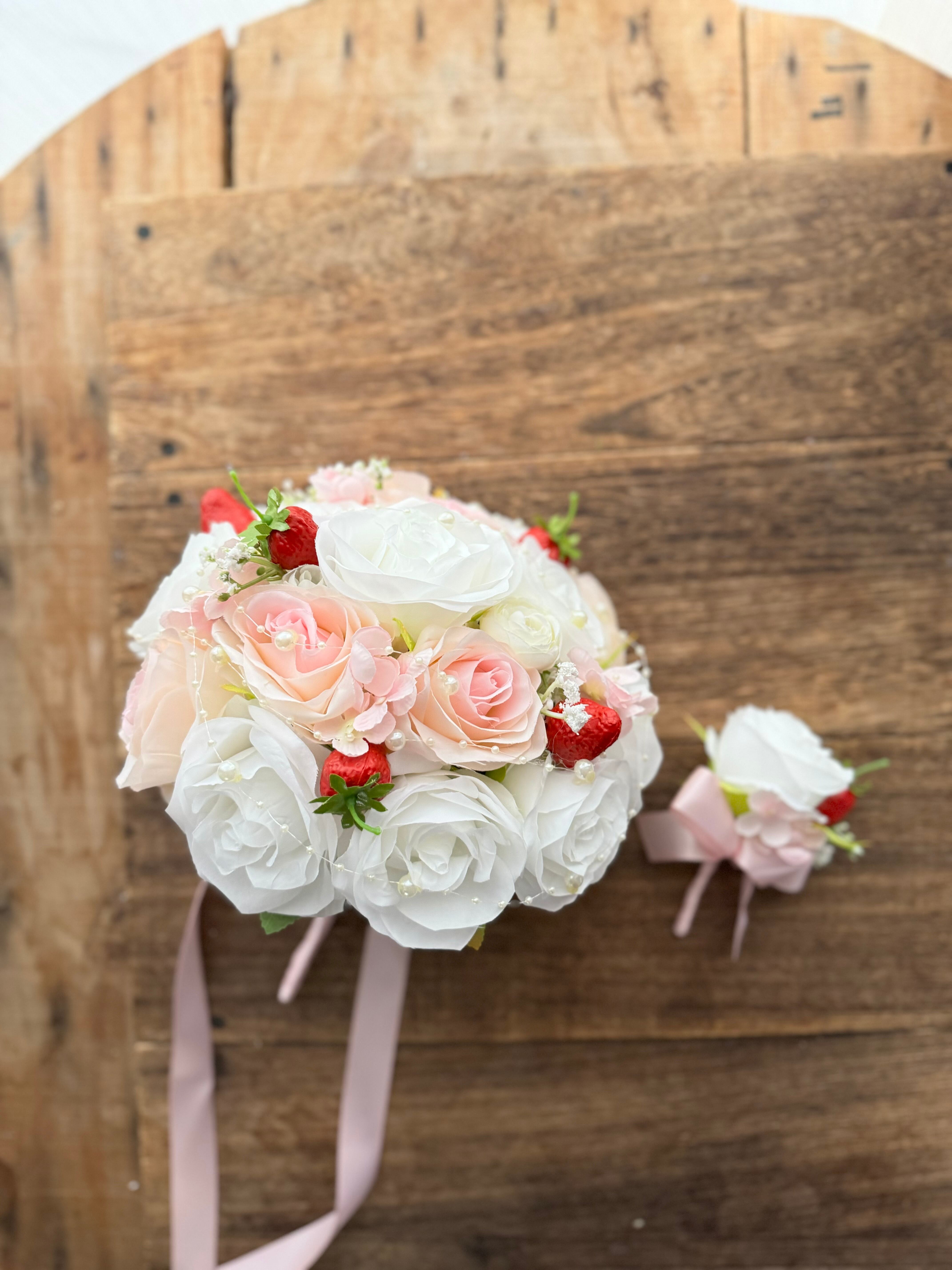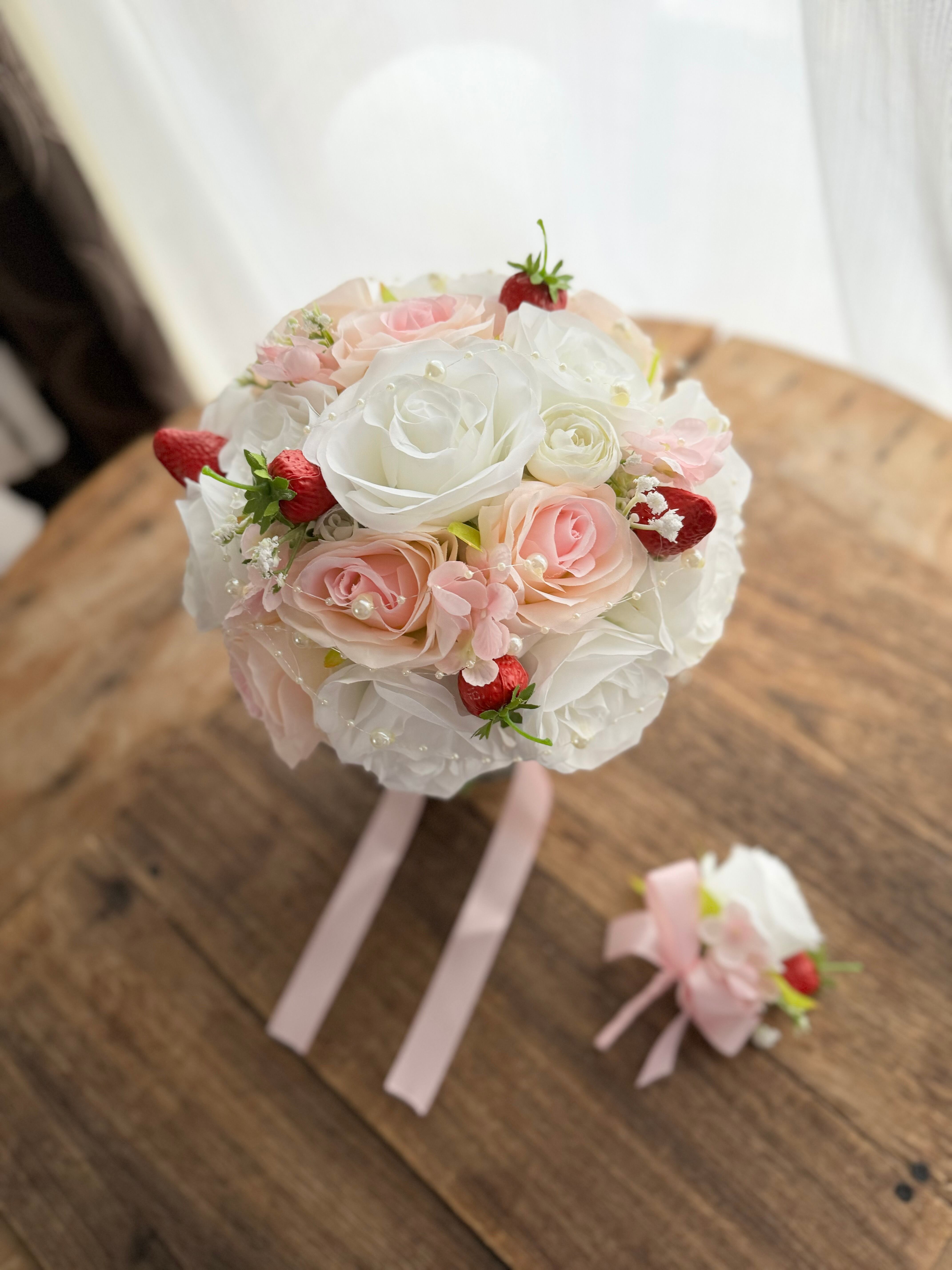 甘酸っぱい香りと華やかな見た目、贅沢な味わいが楽しめるショートケーキ。そんなショートケーキのようなラウンドブーケ♪可愛いらしさ満点のブーケです♪