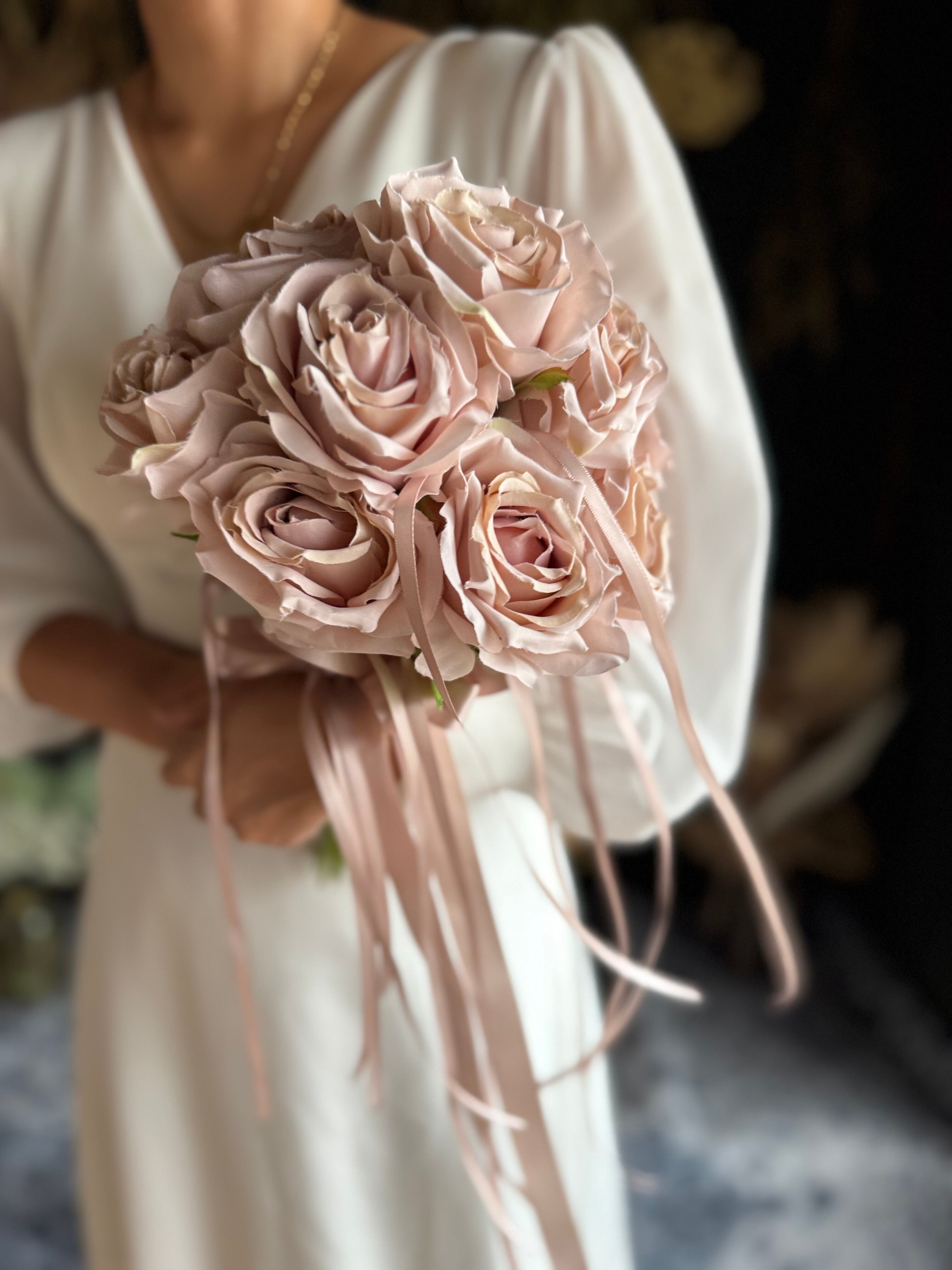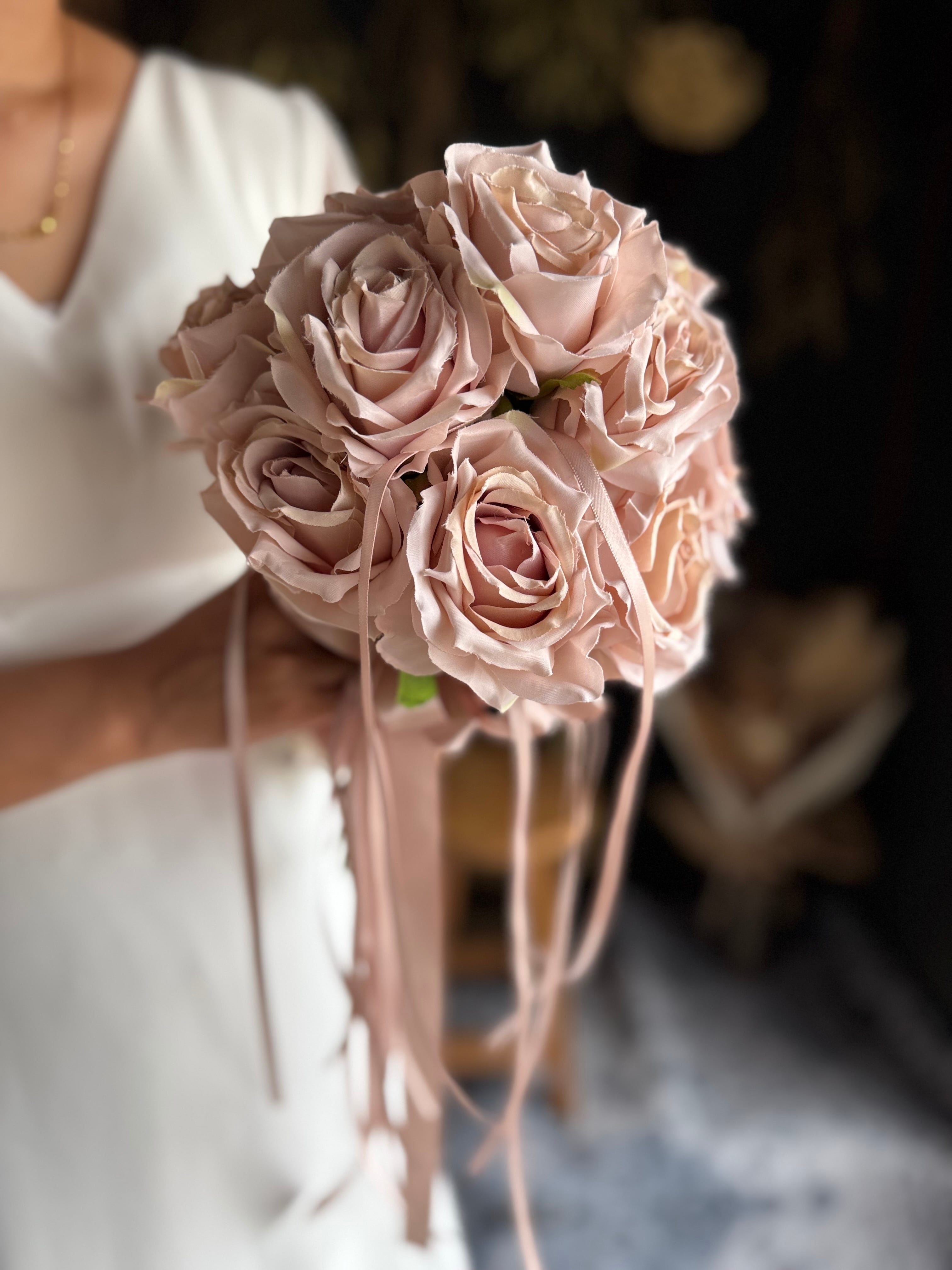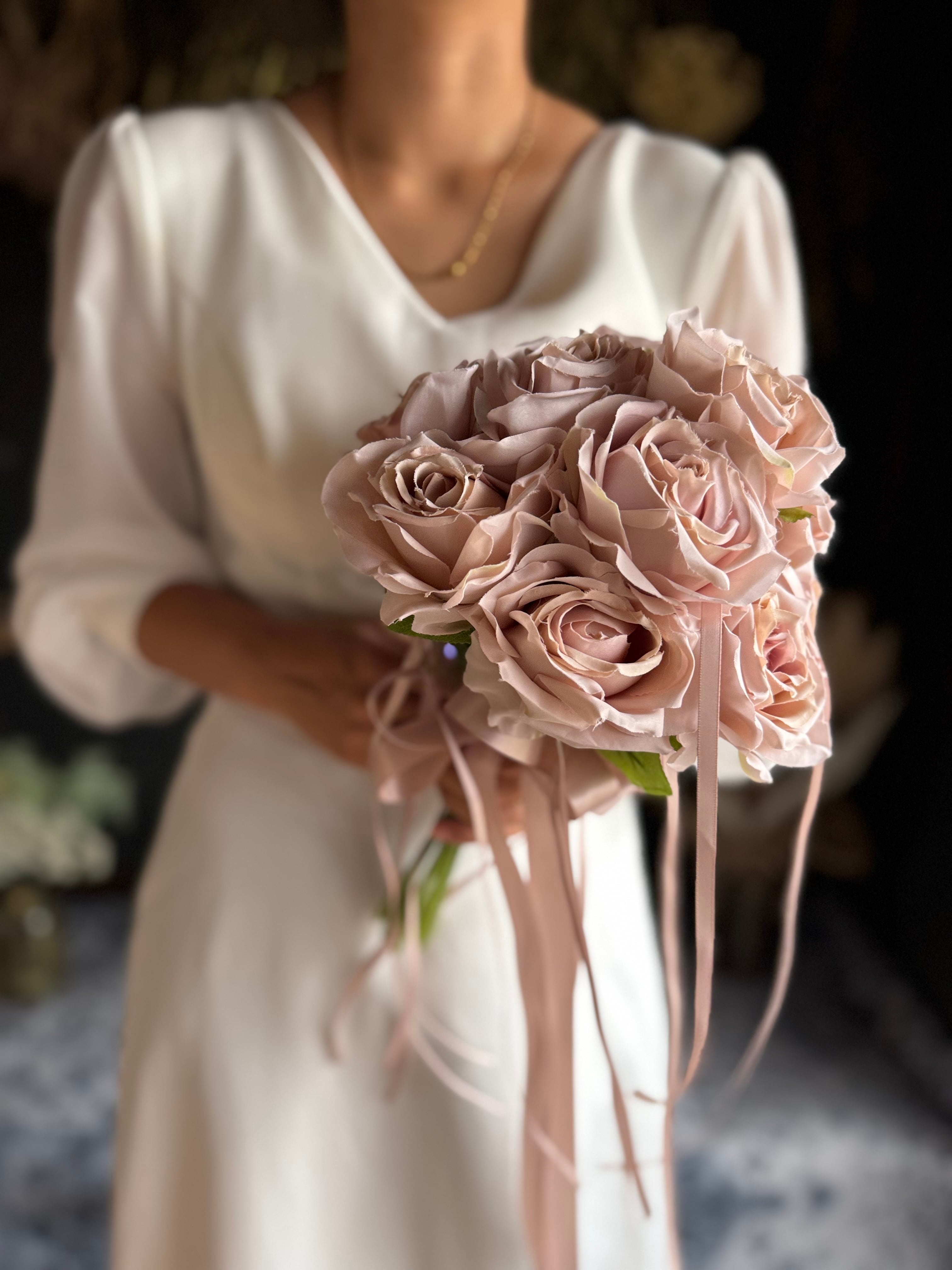 淡いくすみピンクベージュのローズを贅沢に束ねた、シンプルかつ華やかなアレンジです。