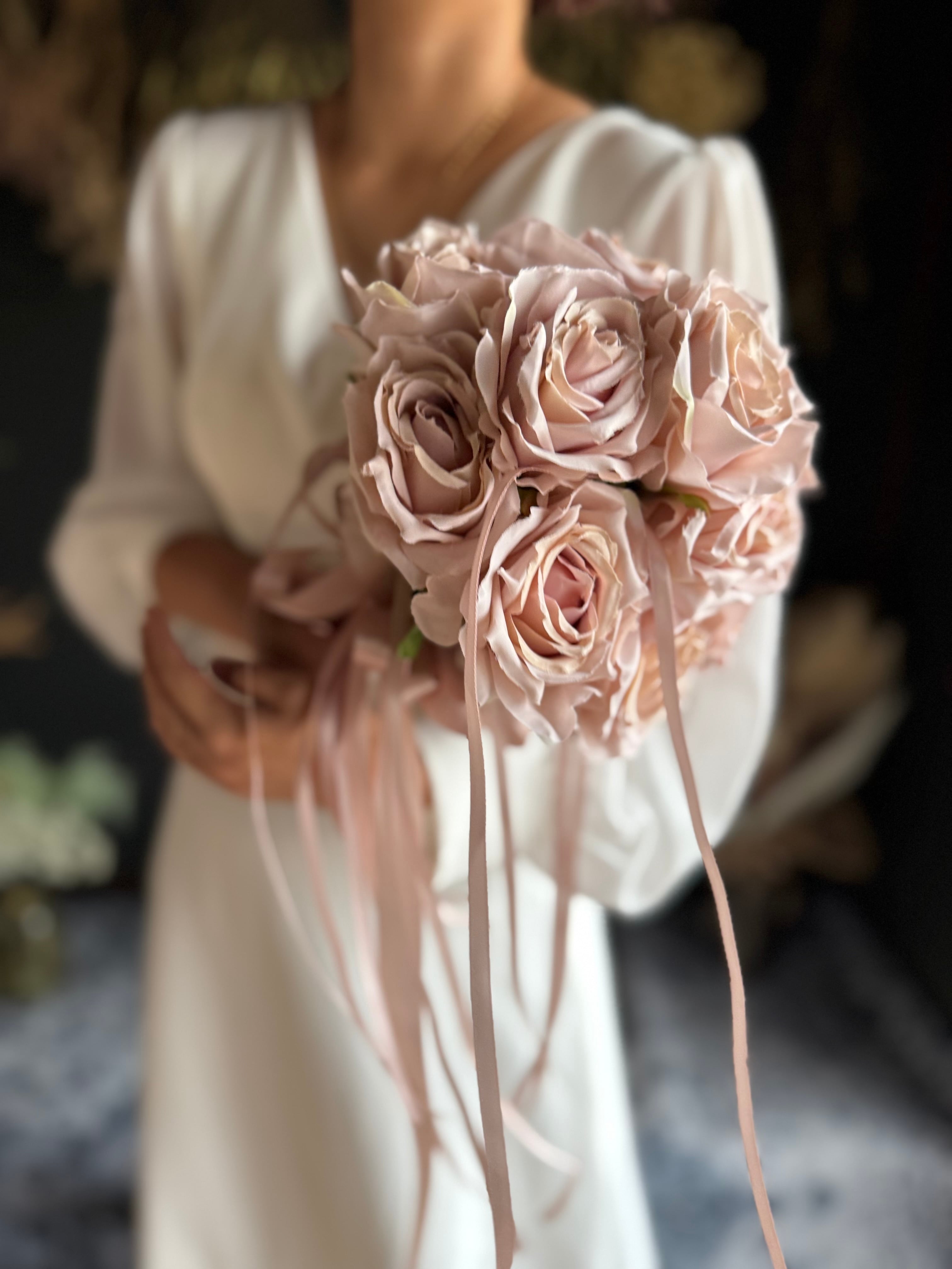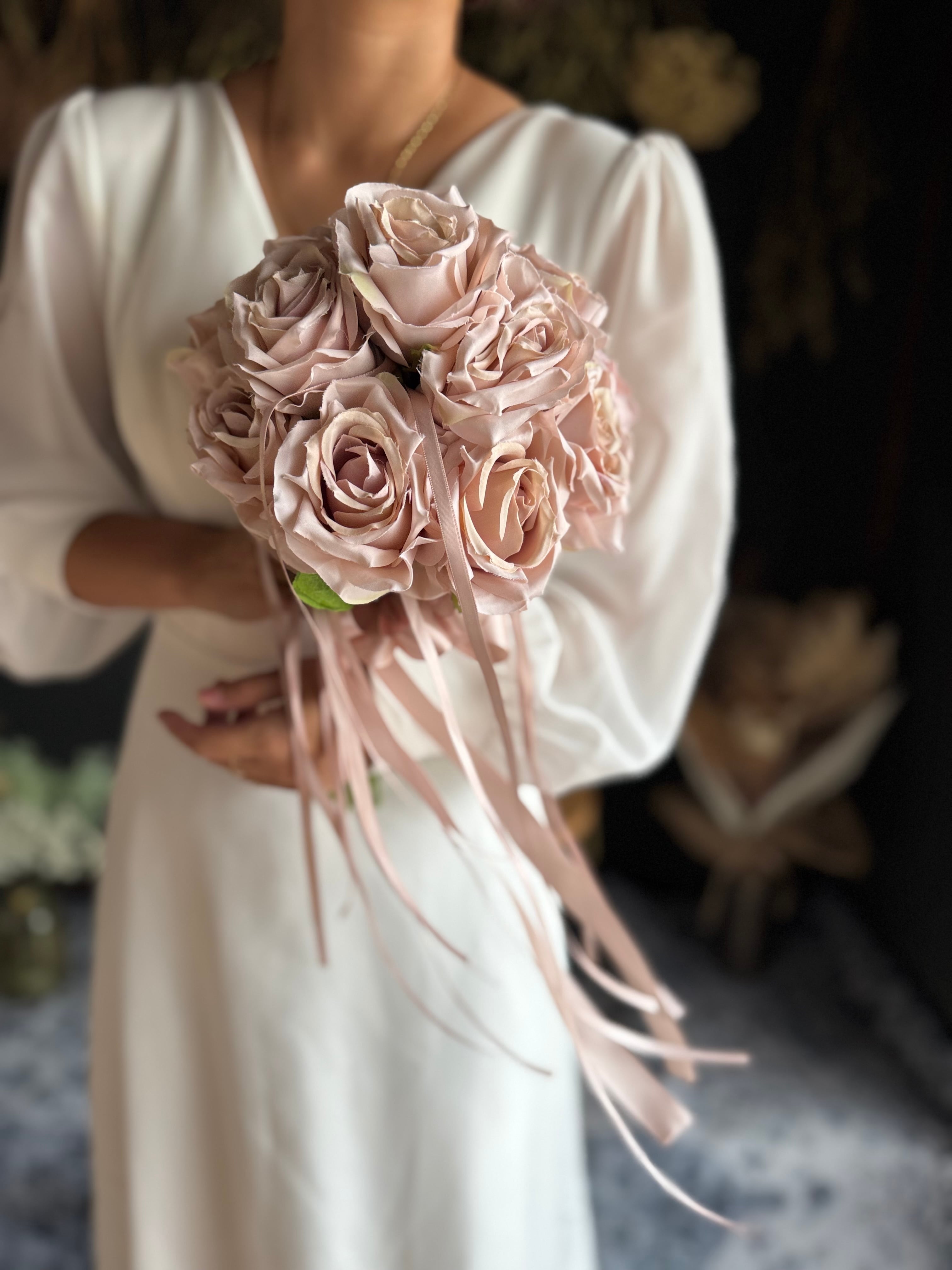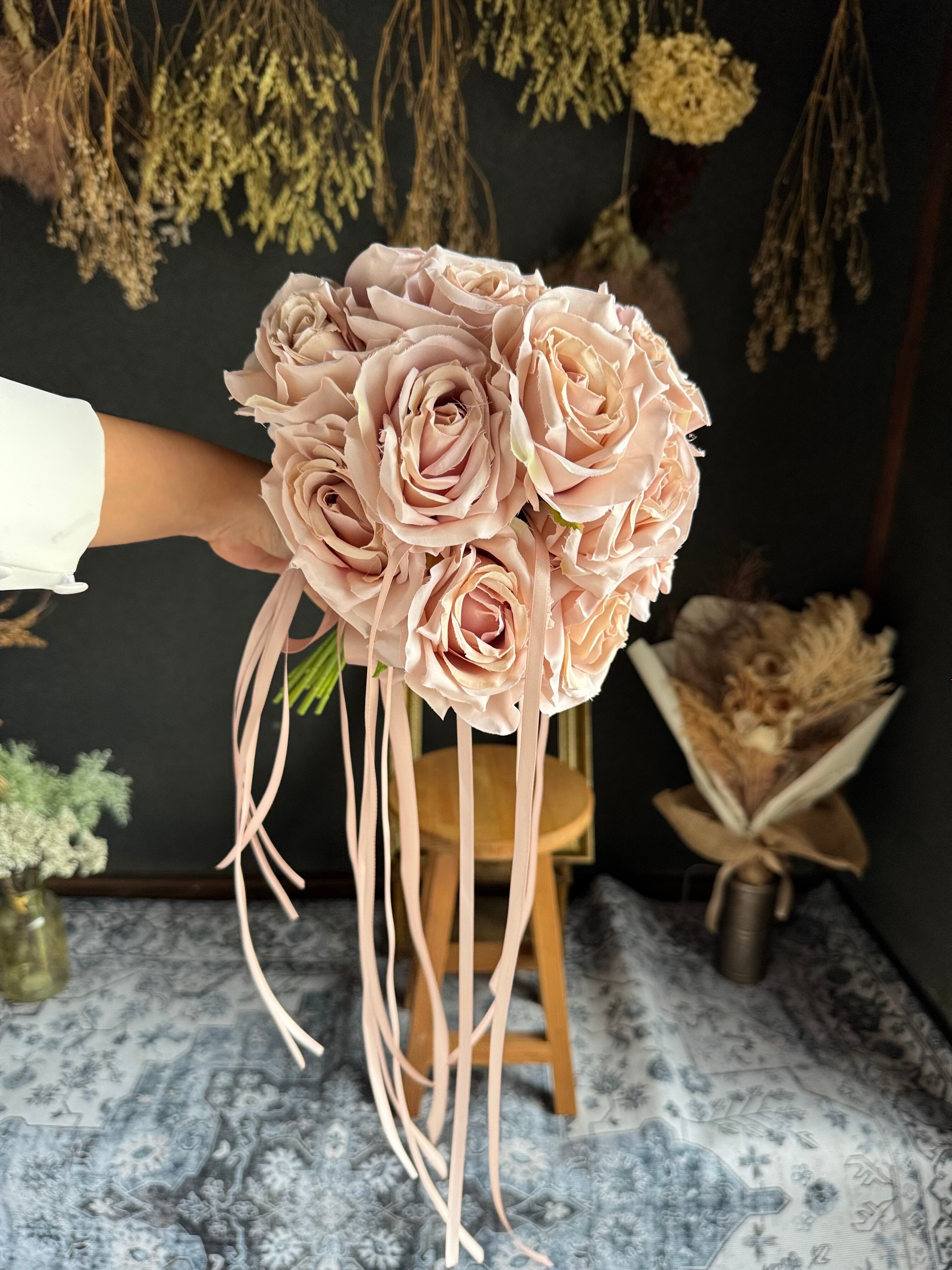 淡いくすみピンクベージュのローズを贅沢に束ねた、シンプルかつ華やかなアレンジです。