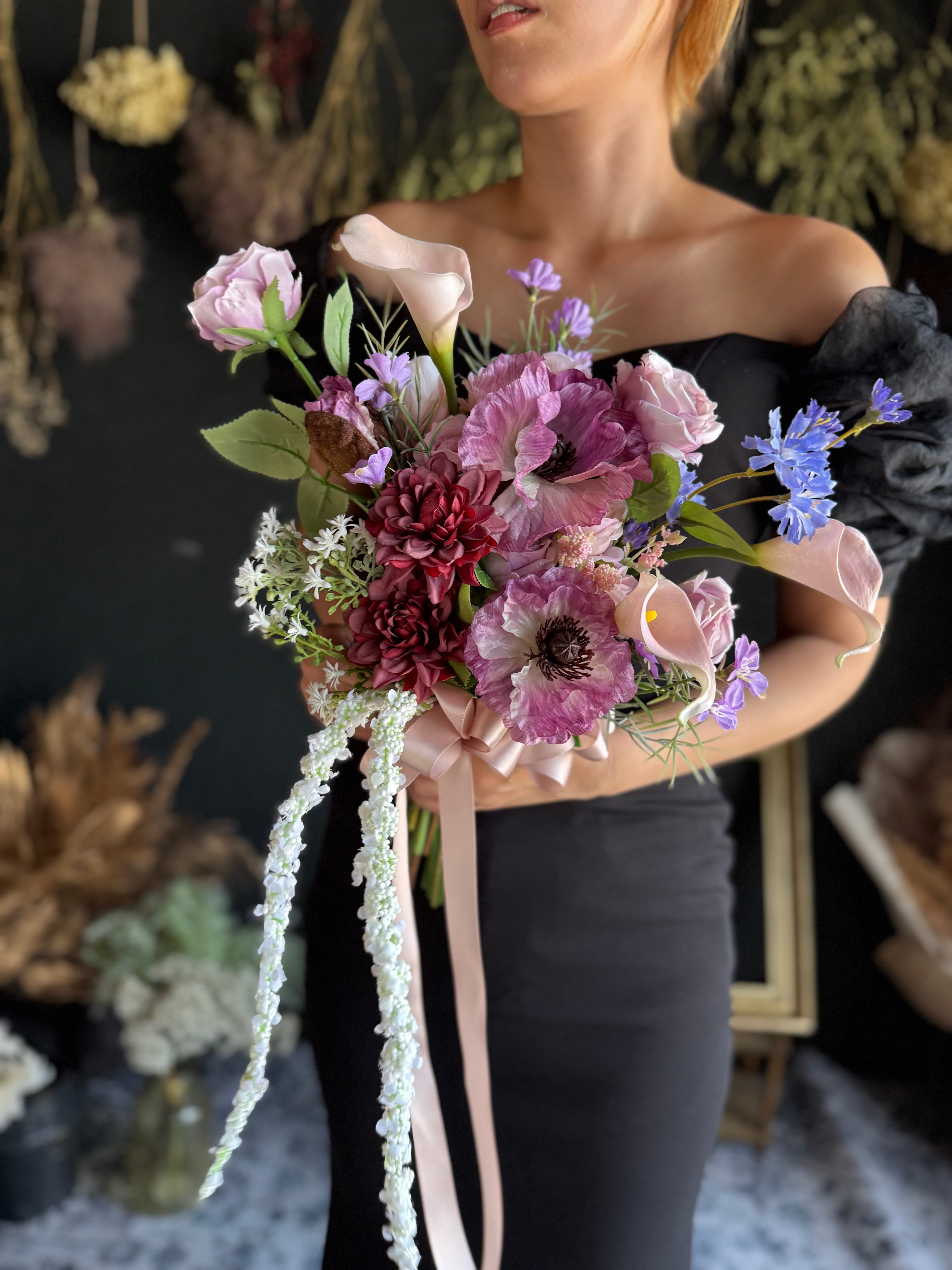 くすみピンクやワインレッド、ラベンダーカラーを基調とした、大人の華やかさが漂うアーティフィシャルフラワーブーケ•*・