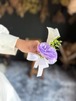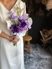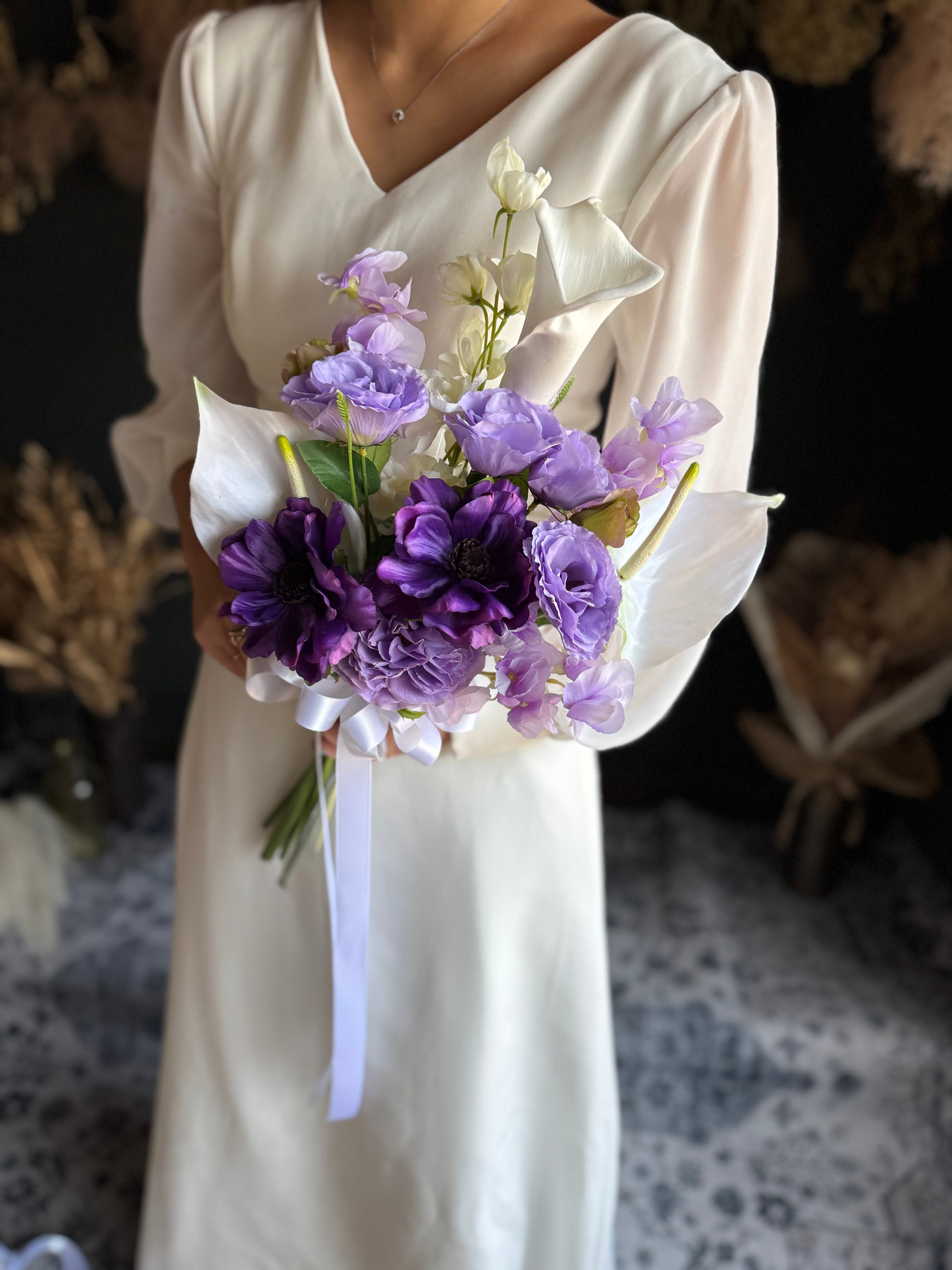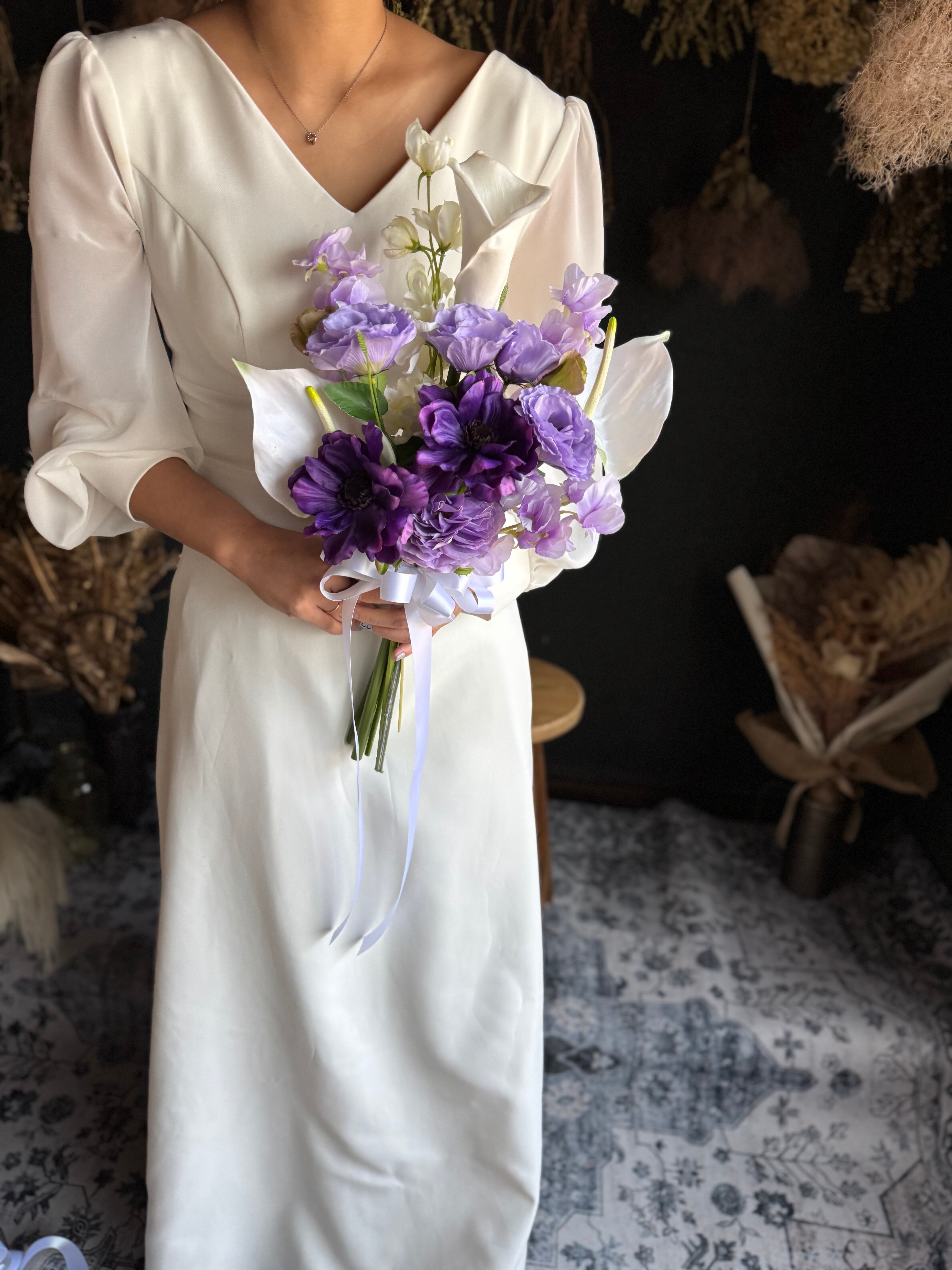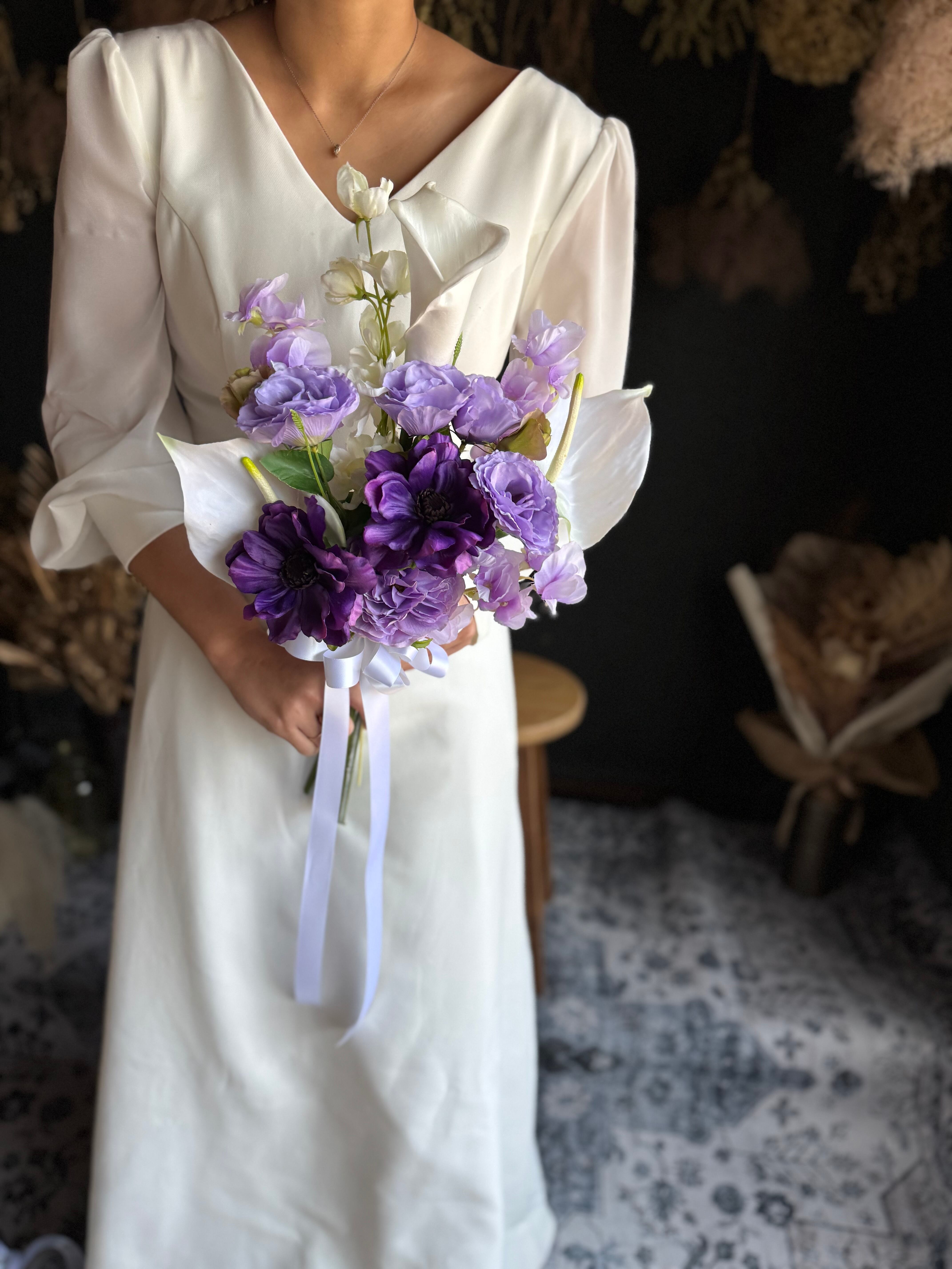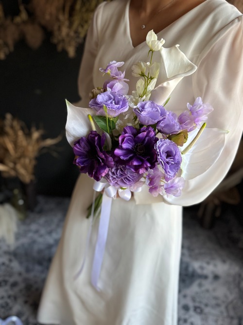 清楚なホワイトローズに、紫の花々を合わせた爽やかなウェディングブーケです。