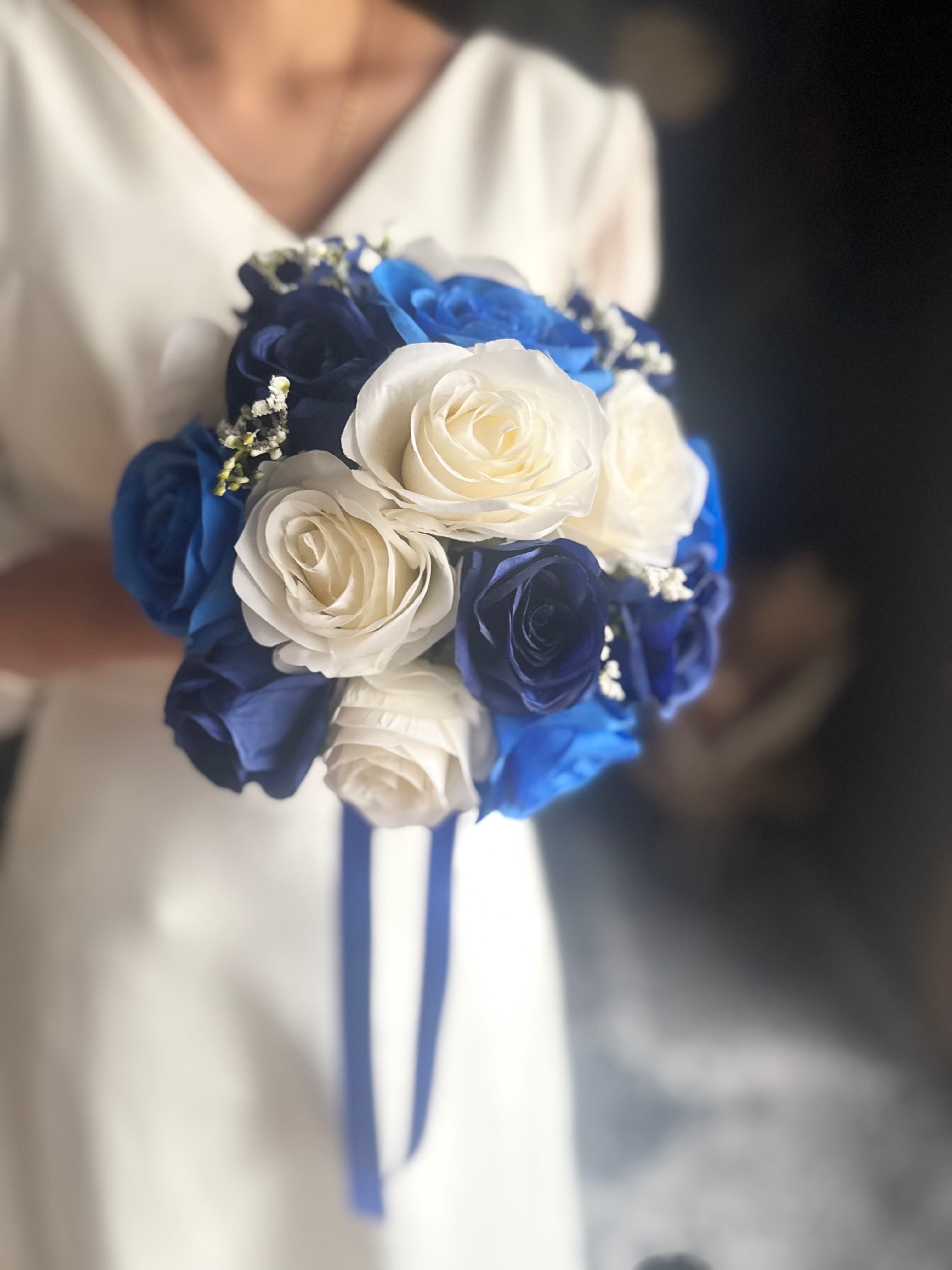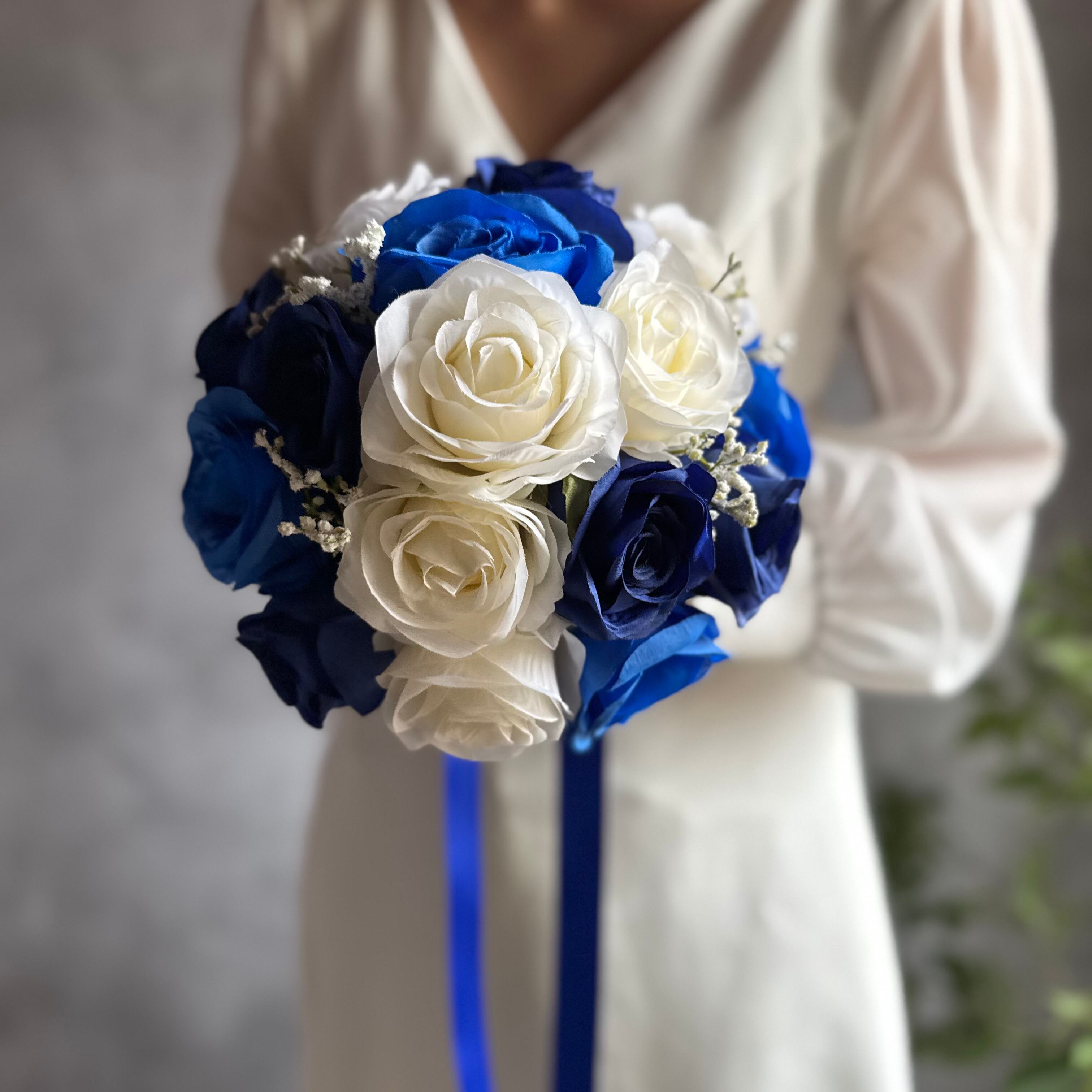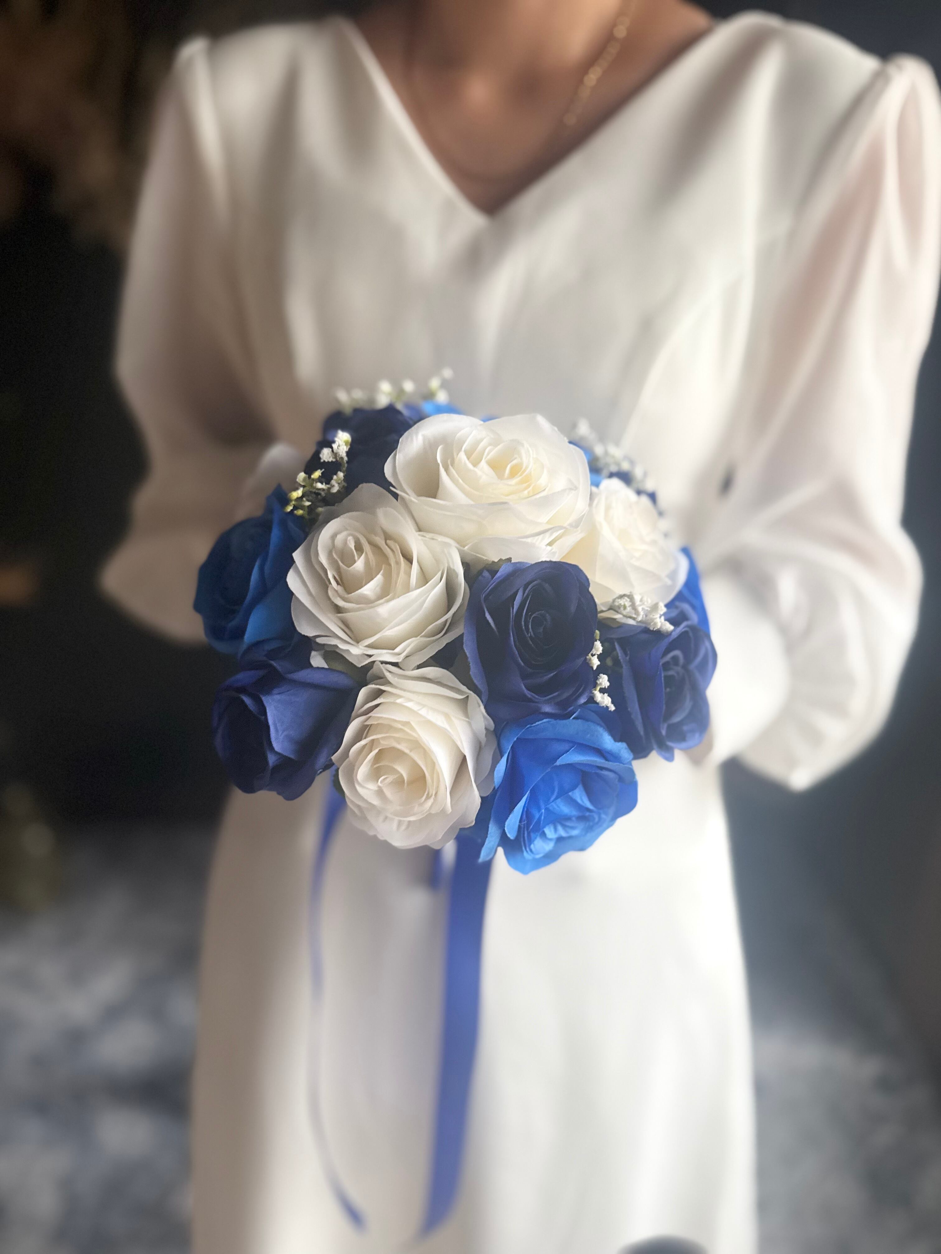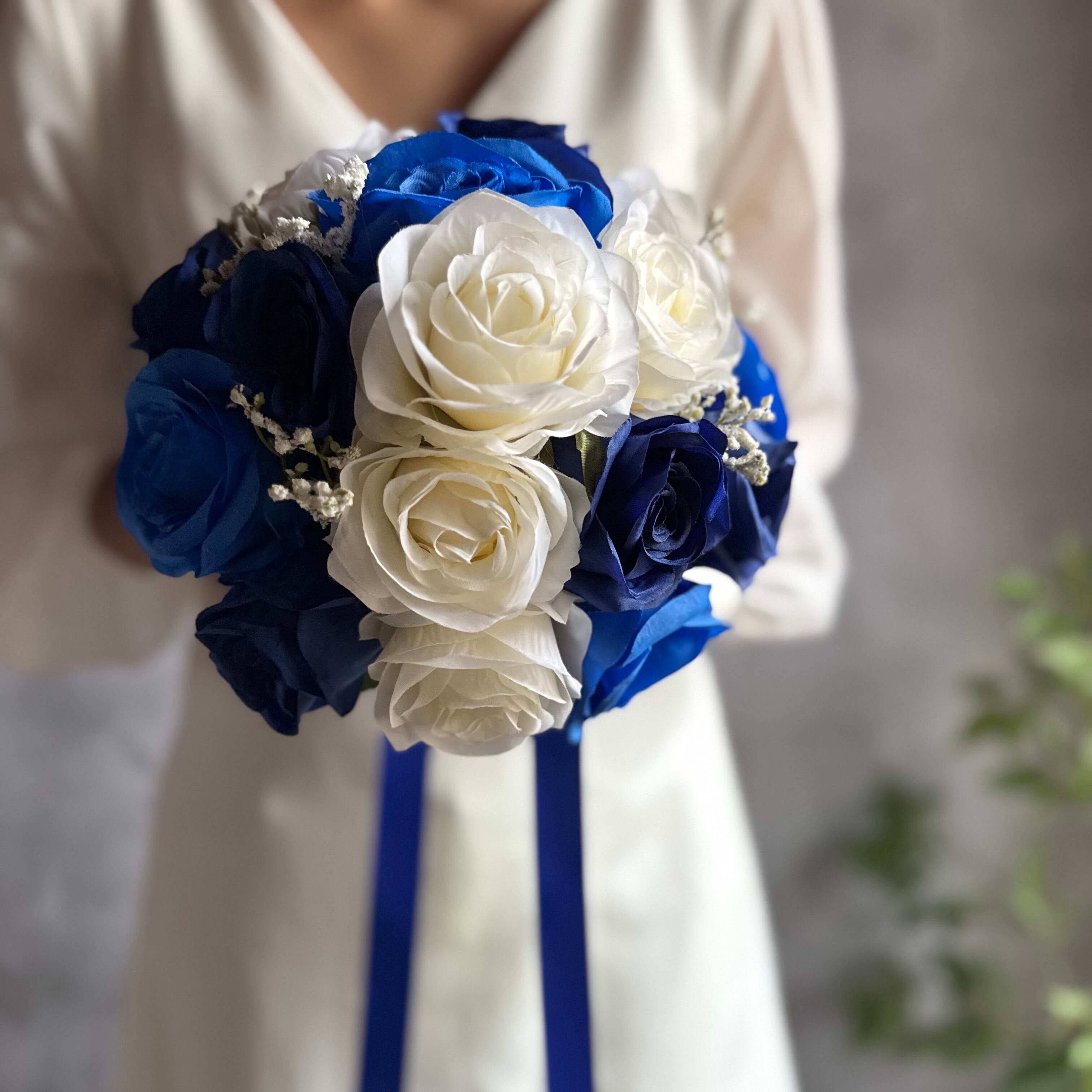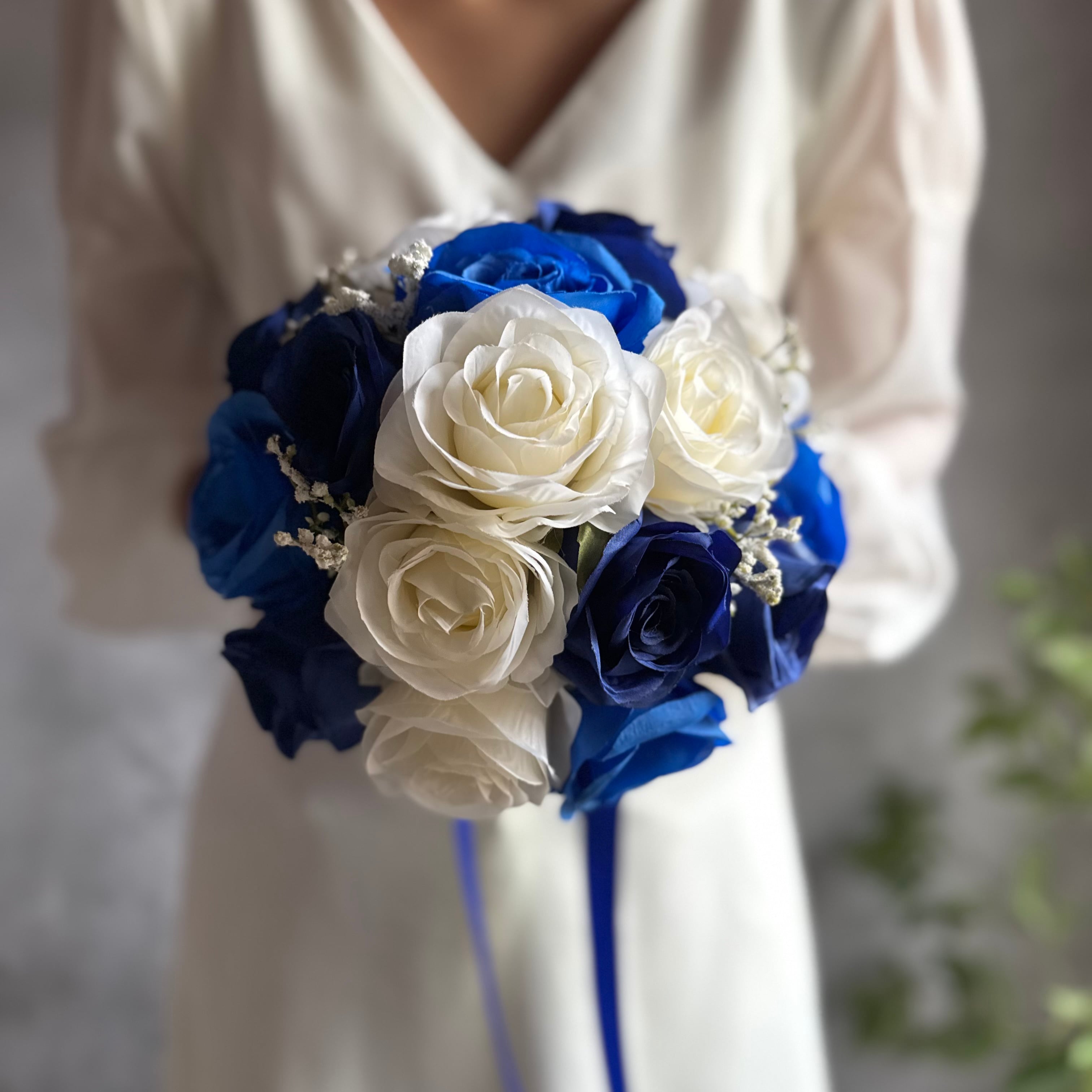アイボリーのバラと生花では難しいブルーのバラ、上品で美しいラウンドブーケ