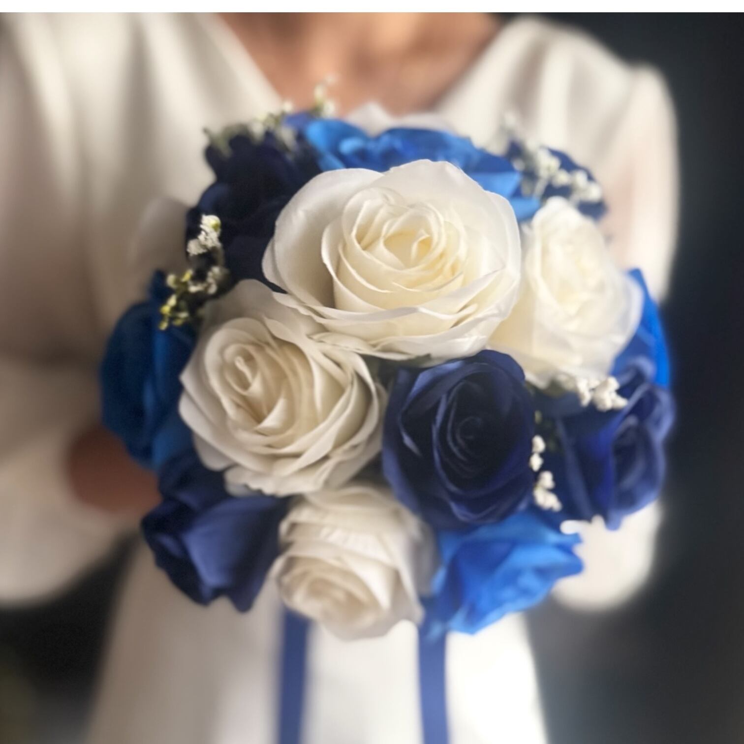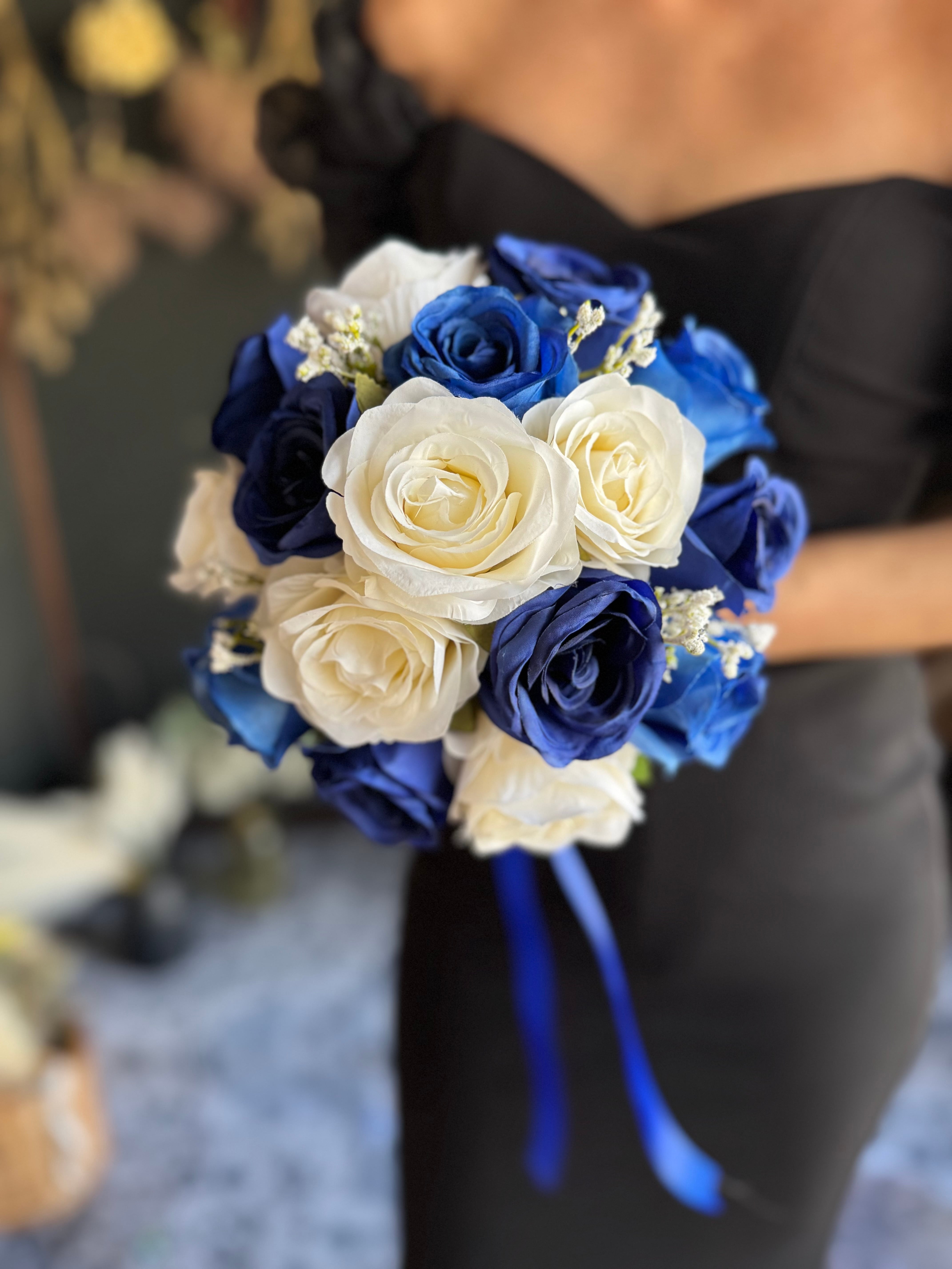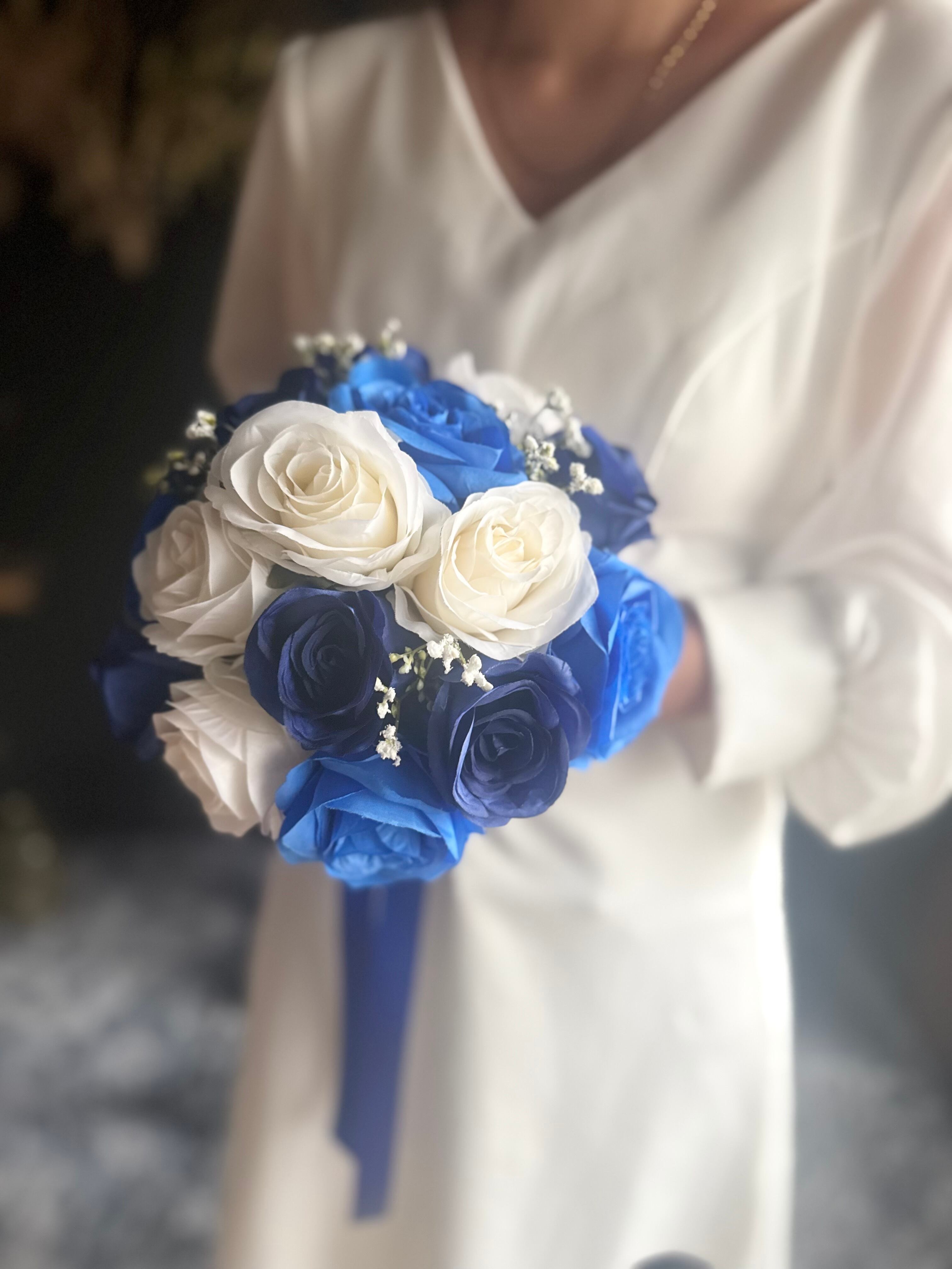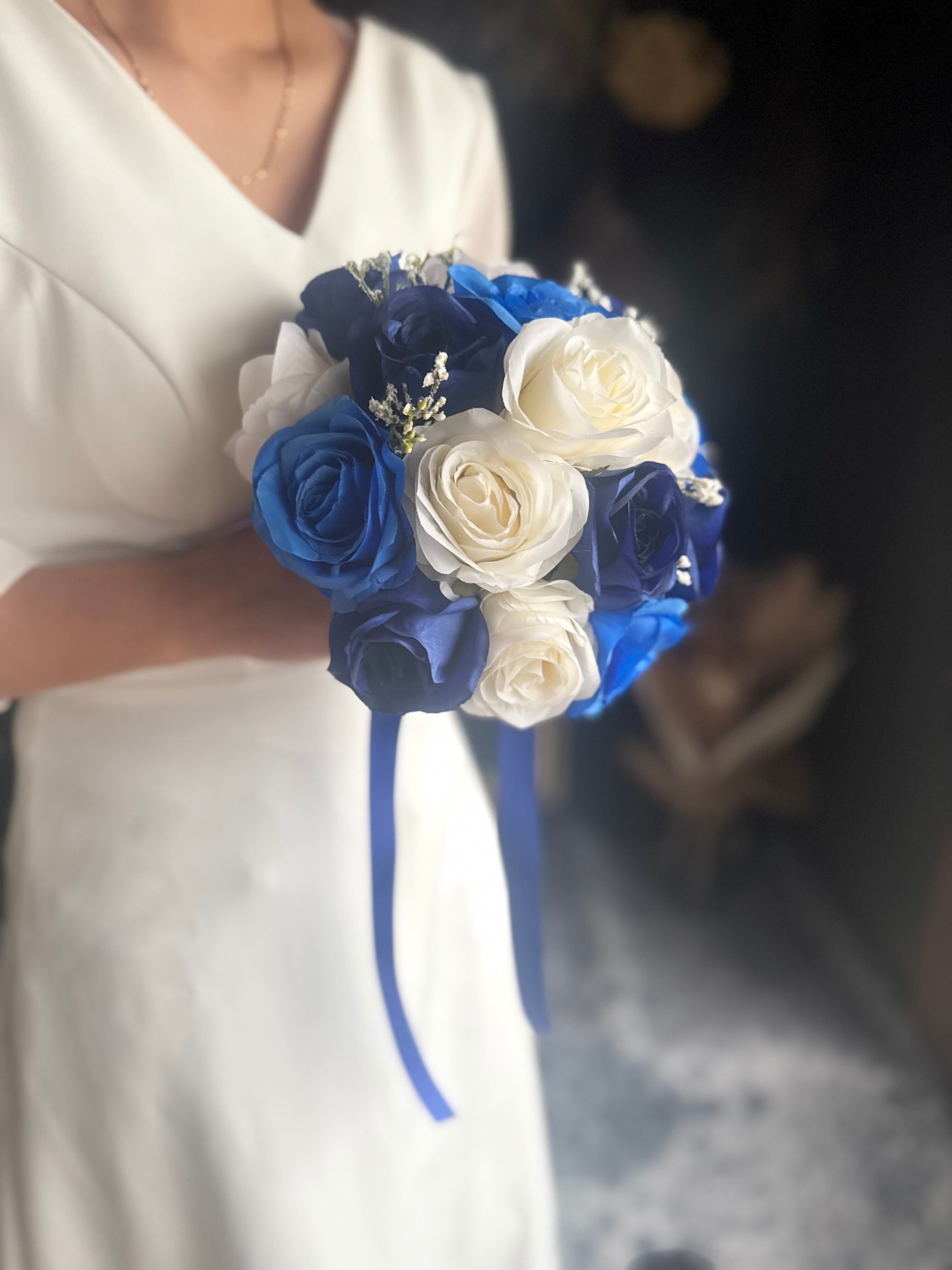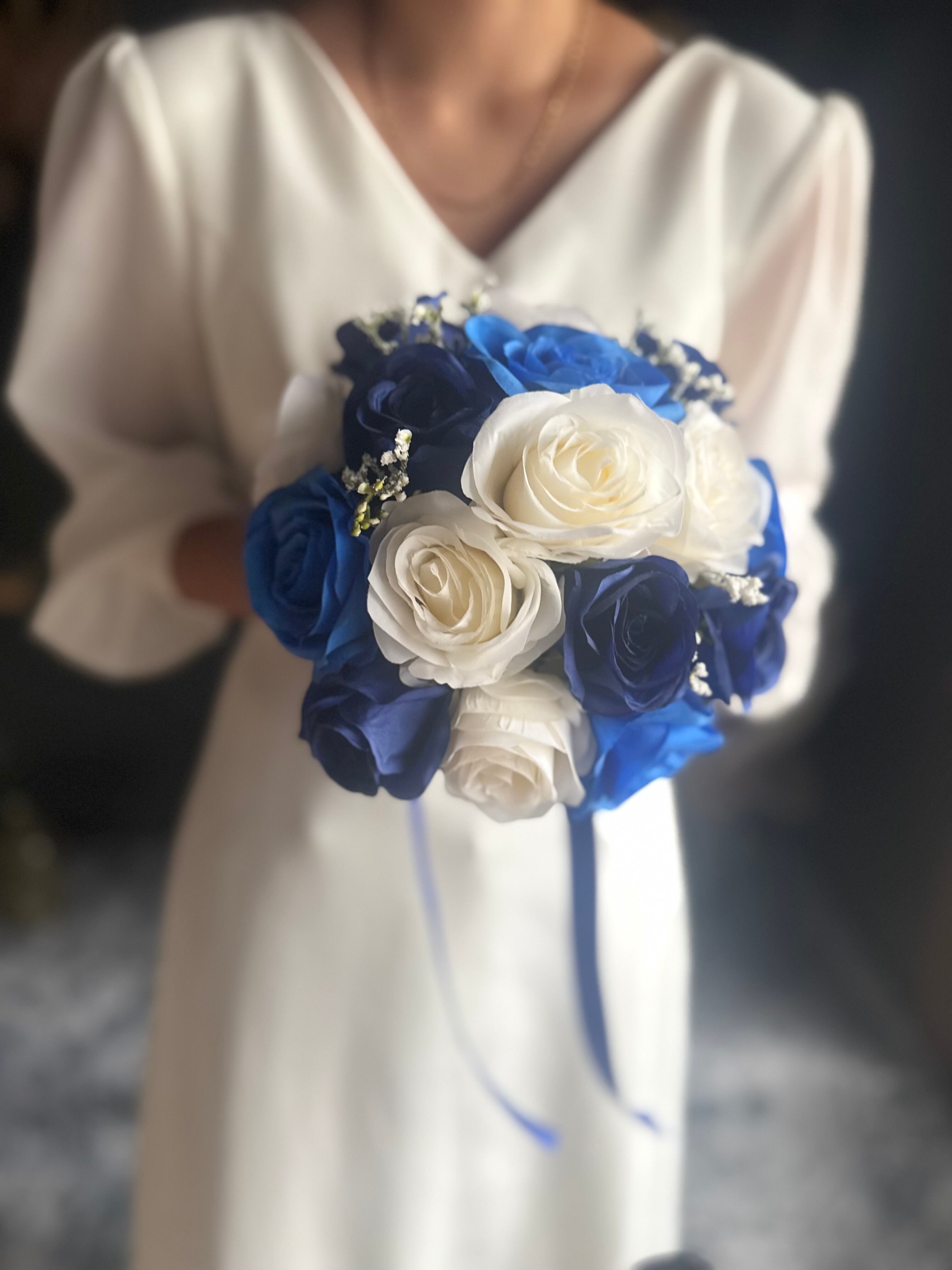 アイボリーのバラと生花では難しいブルーのバラ、上品で美しいラウンドブーケ