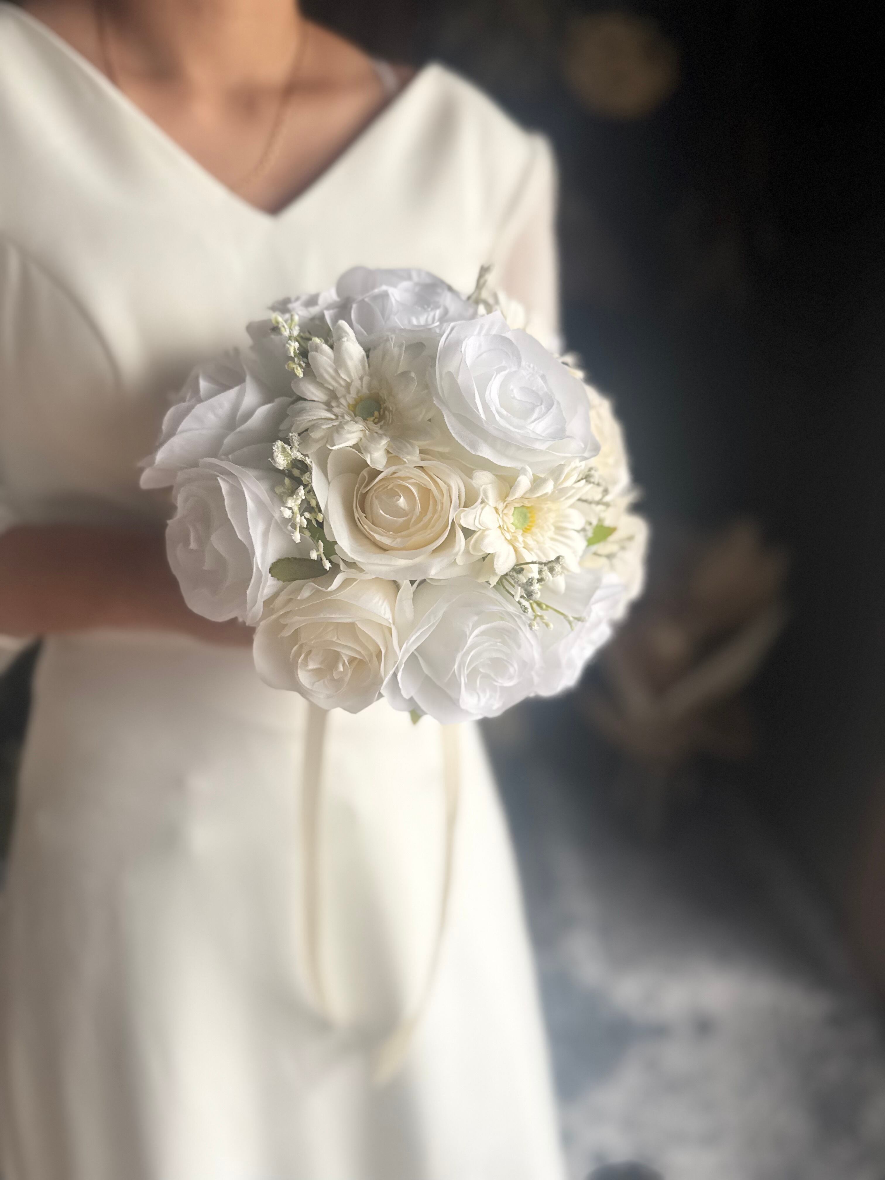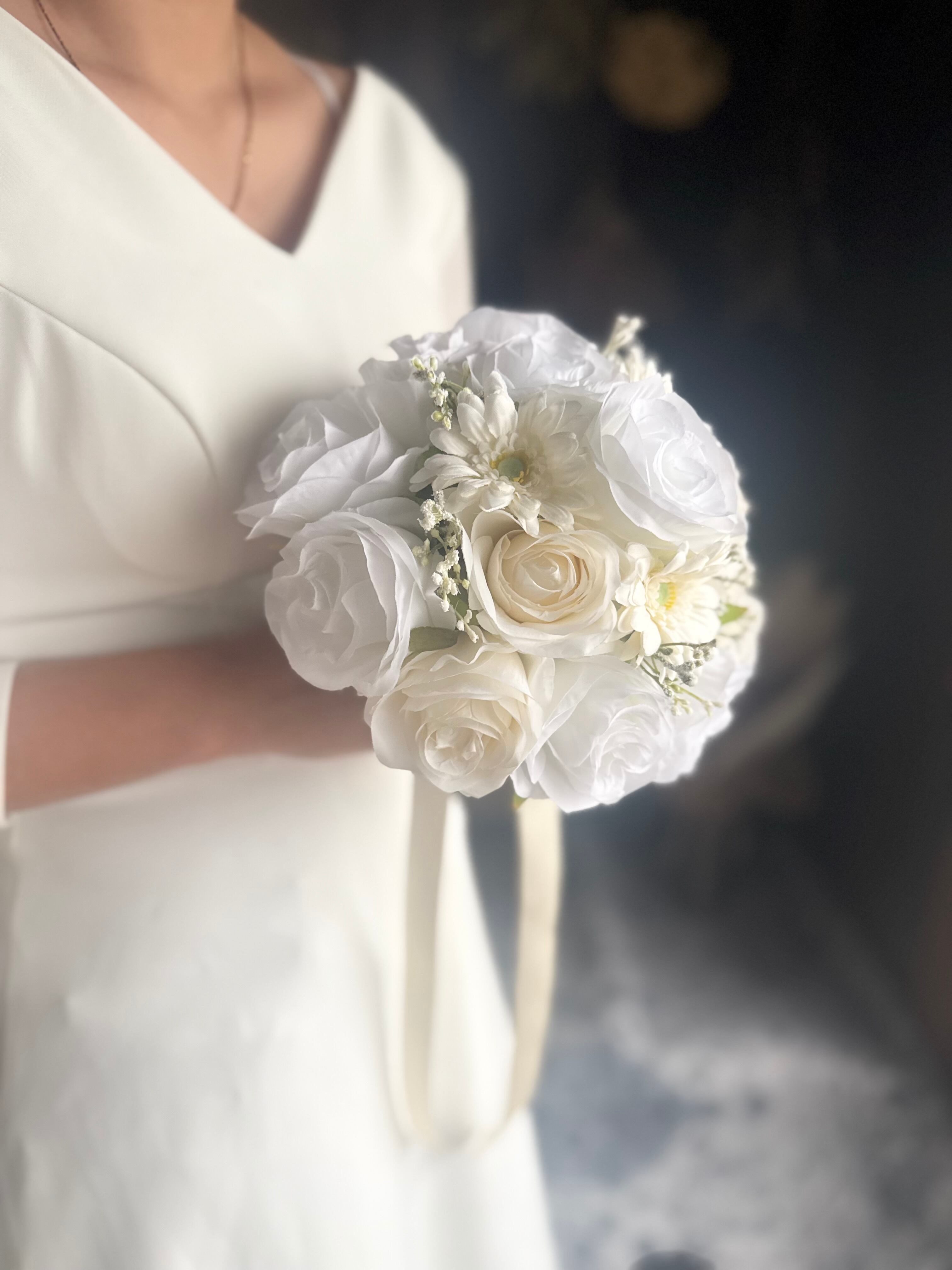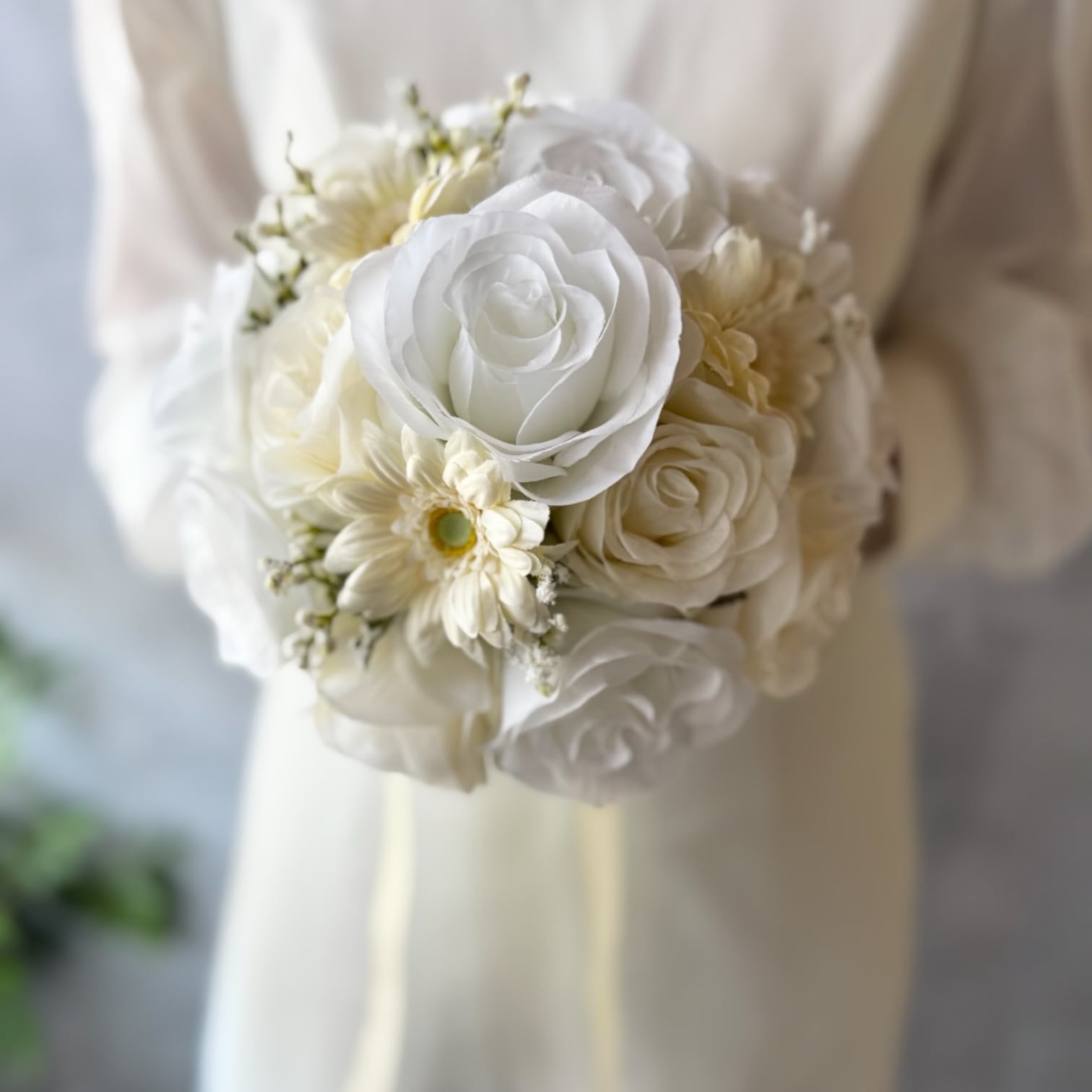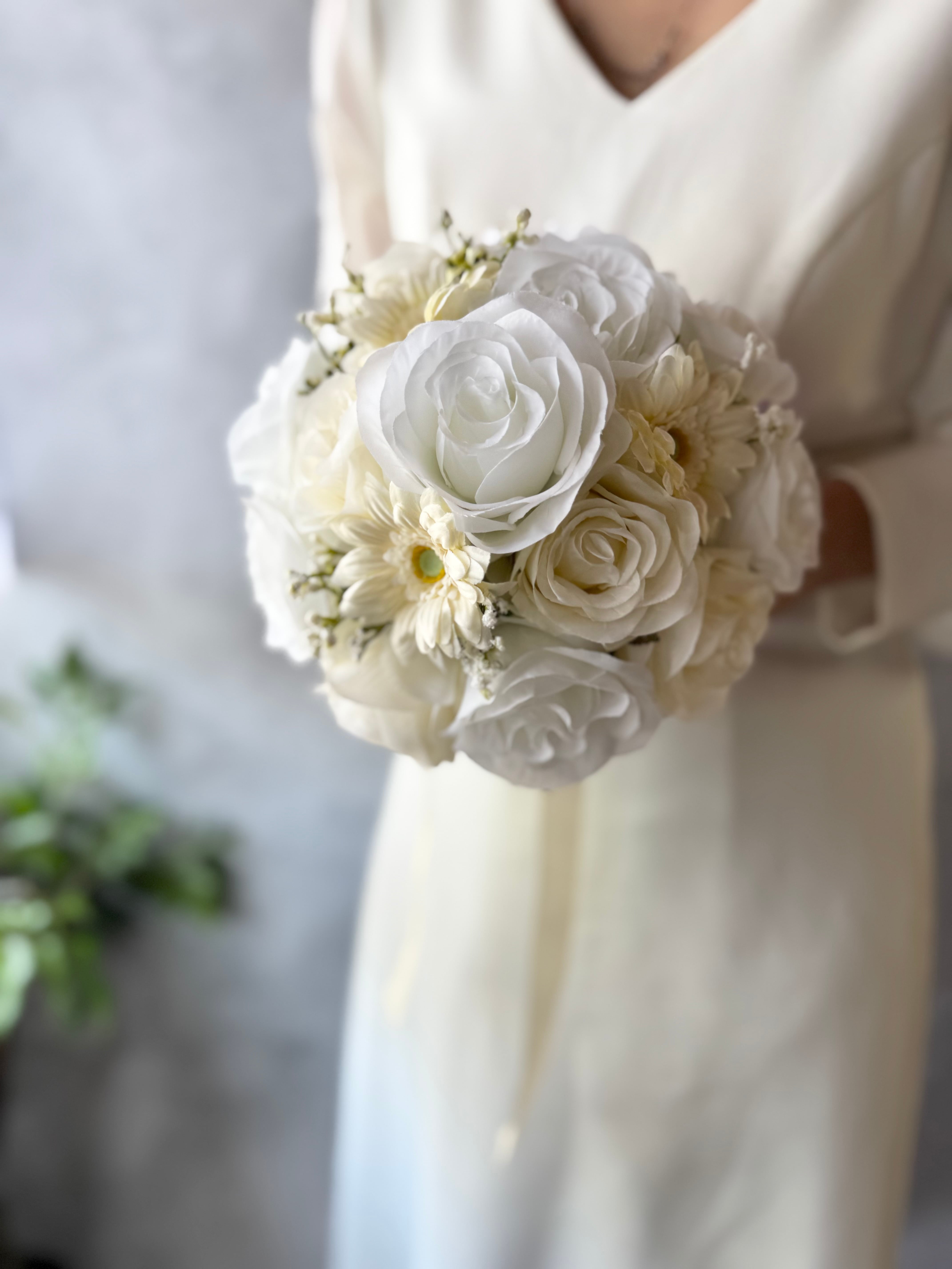 ウェディングにぴったりな可愛いバラとガーベラのラウンドブーケ•*・ 真っ白だけでなく、アイボリーのバラも入っていて、どんなウェディングドレスにも合いやすいデザインです•*・