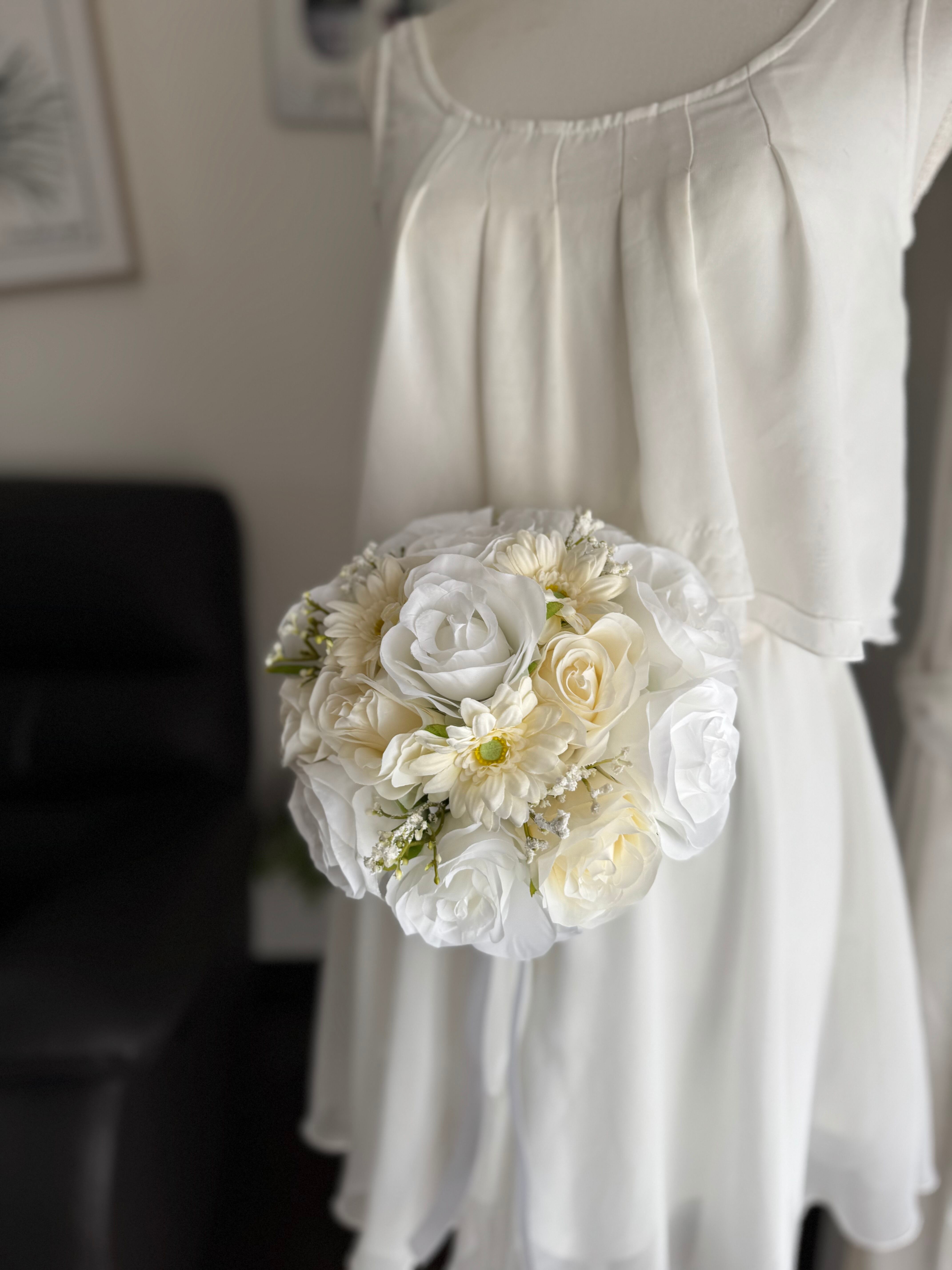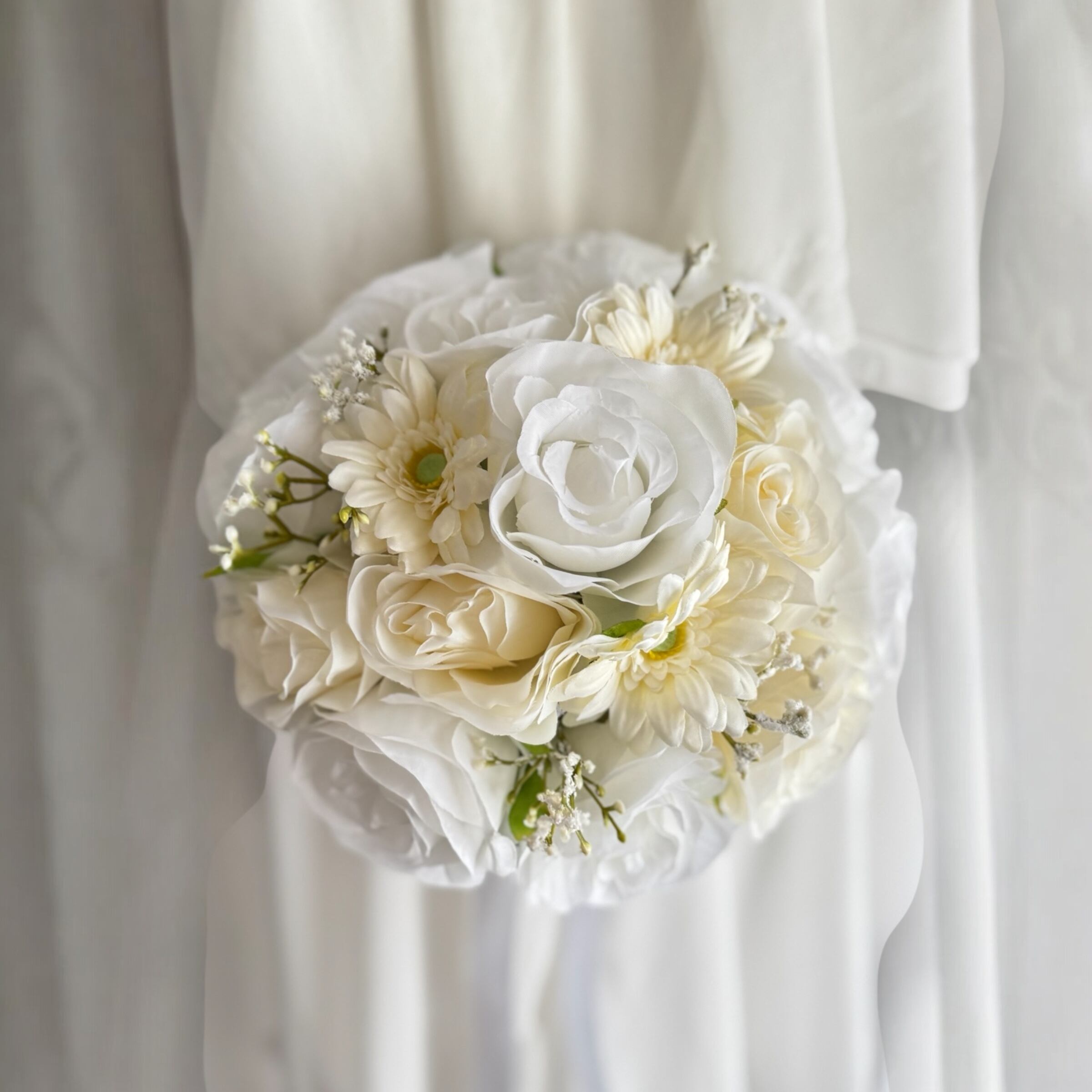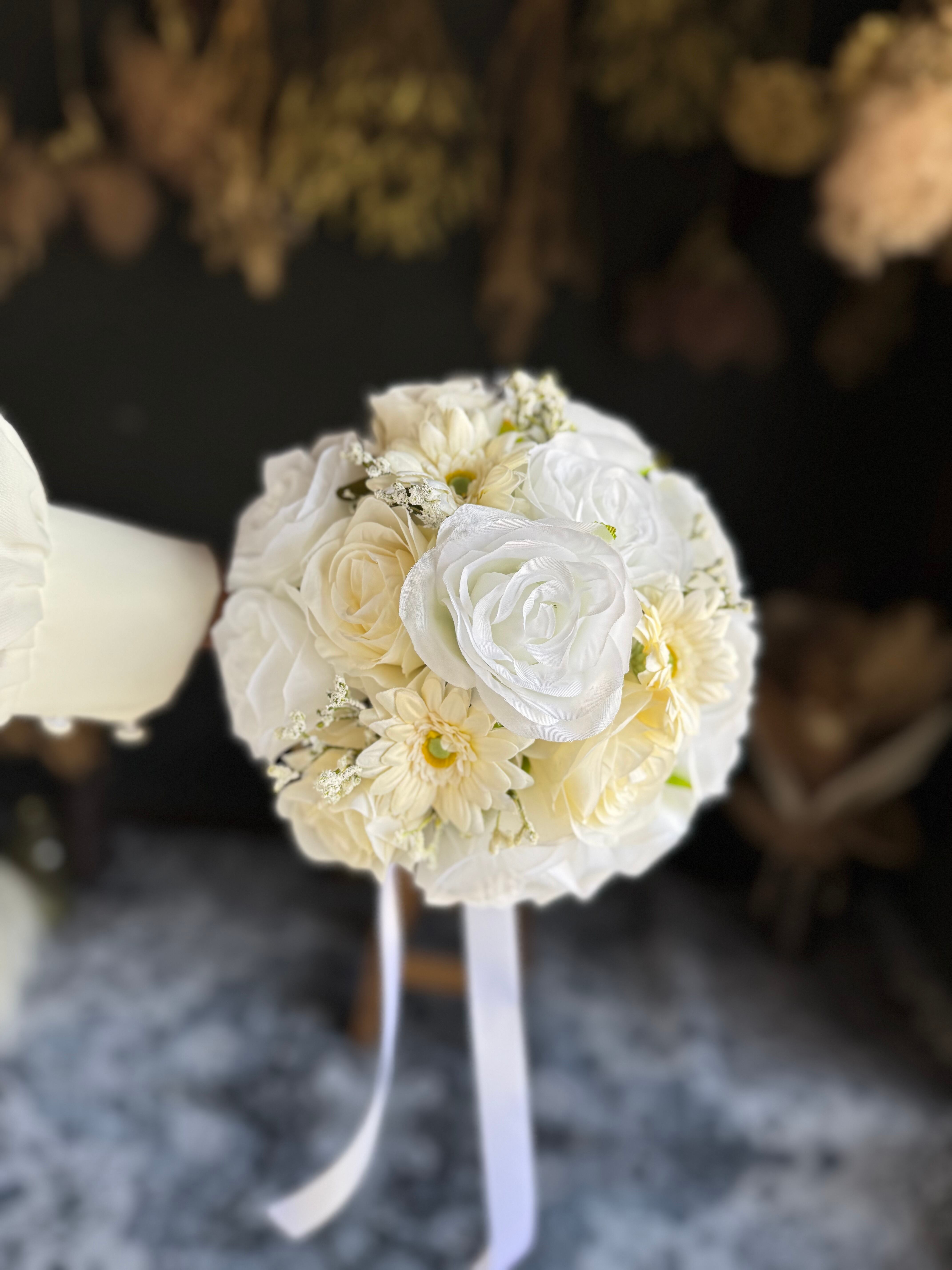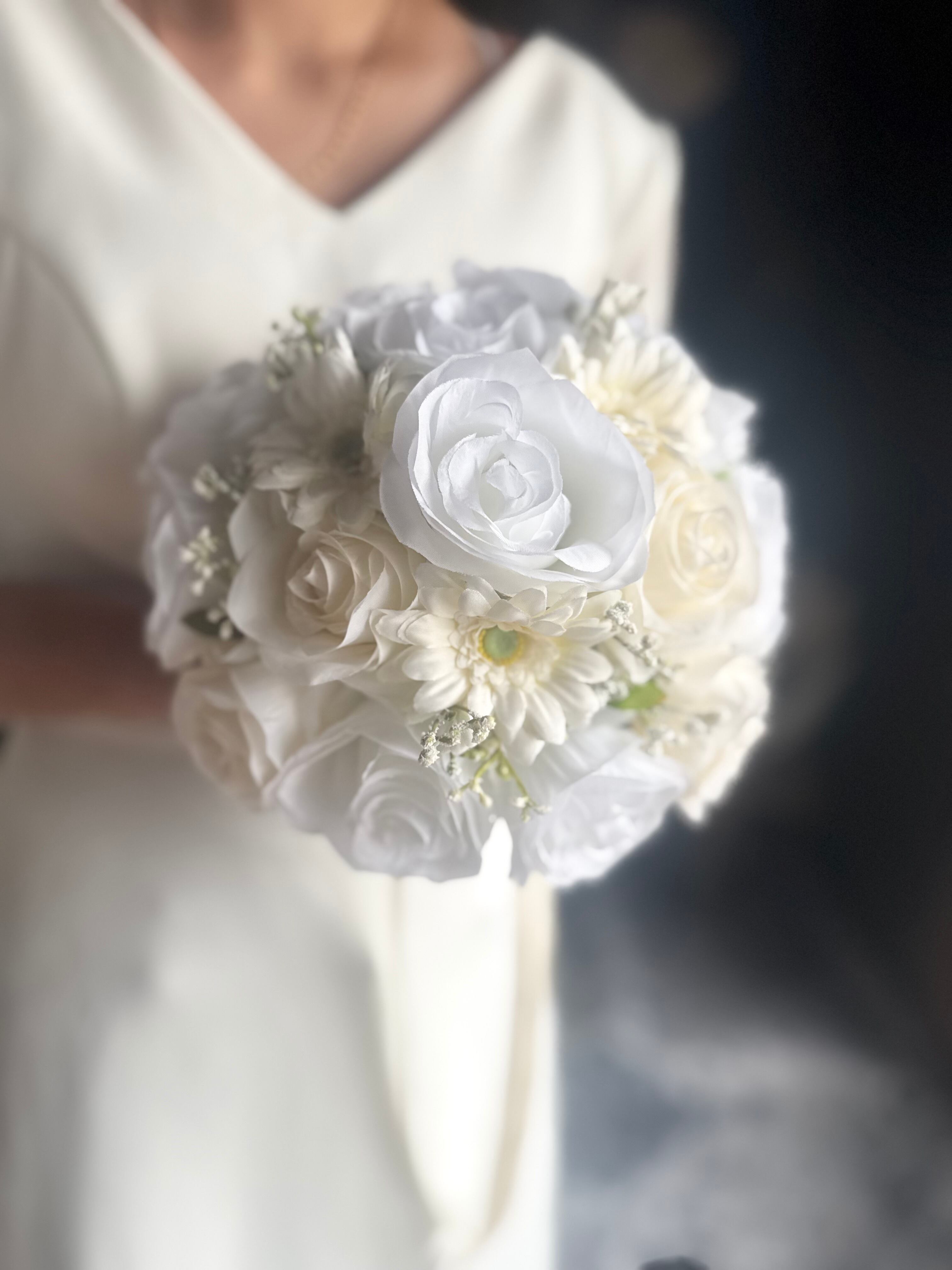 ウェディングにぴったりな可愛いバラとガーベラのラウンドブーケ•*・ 真っ白だけでなく、アイボリーのバラも入っていて、どんなウェディングドレスにも合いやすいデザインです•*・