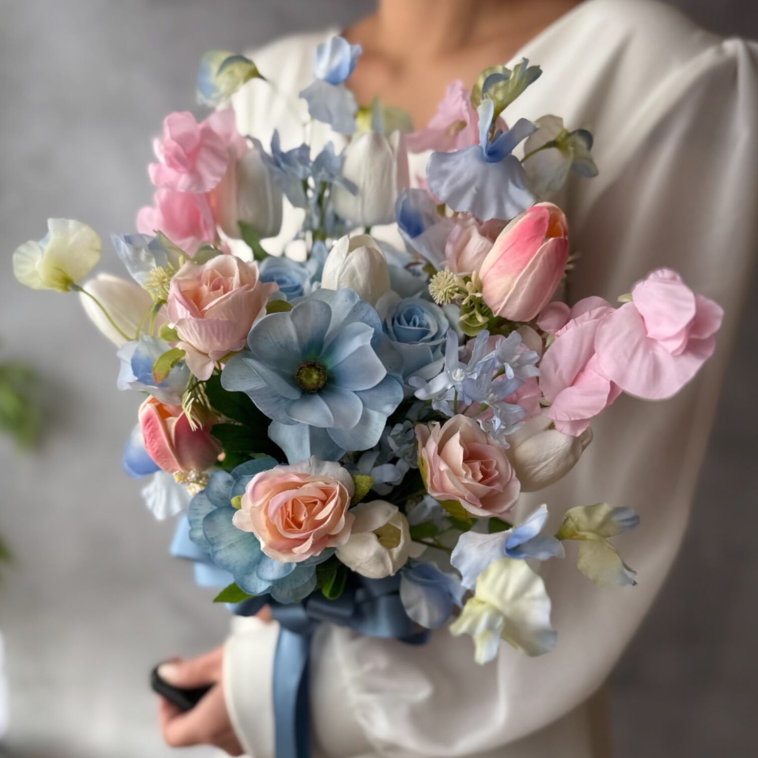 ホワイトを重ねた、やさしく澄んだ色合いのブーケ。