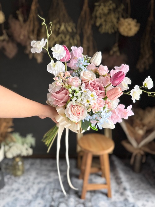 可愛いピンクチューリップにピンク濃淡の花々、水色のアクセントでお花畑のような華やかなブーケ•*・軽く持ちやすく、枯れる事のないアーティフィシャルフラワーのブーケは人気でオススメです•*・