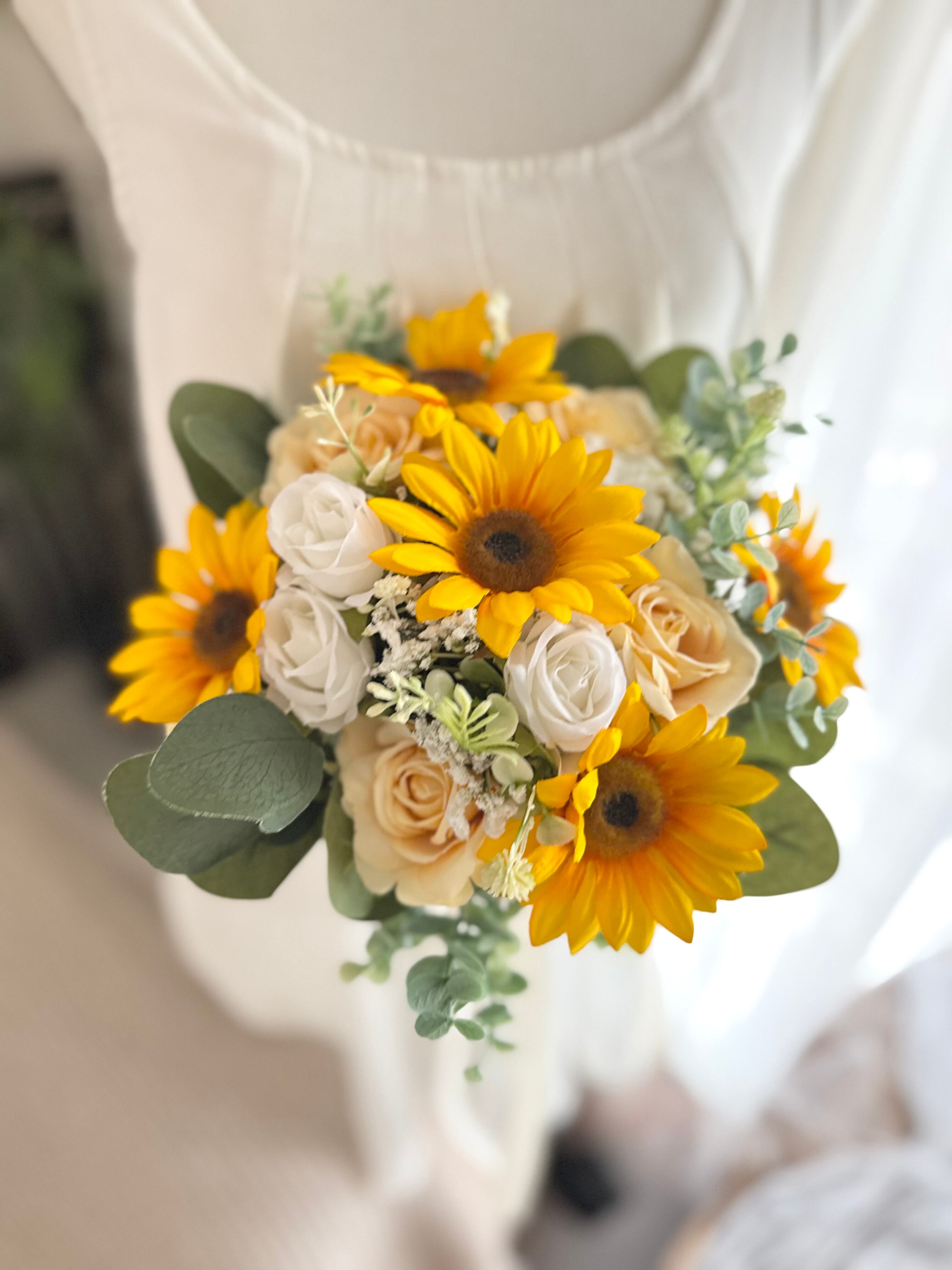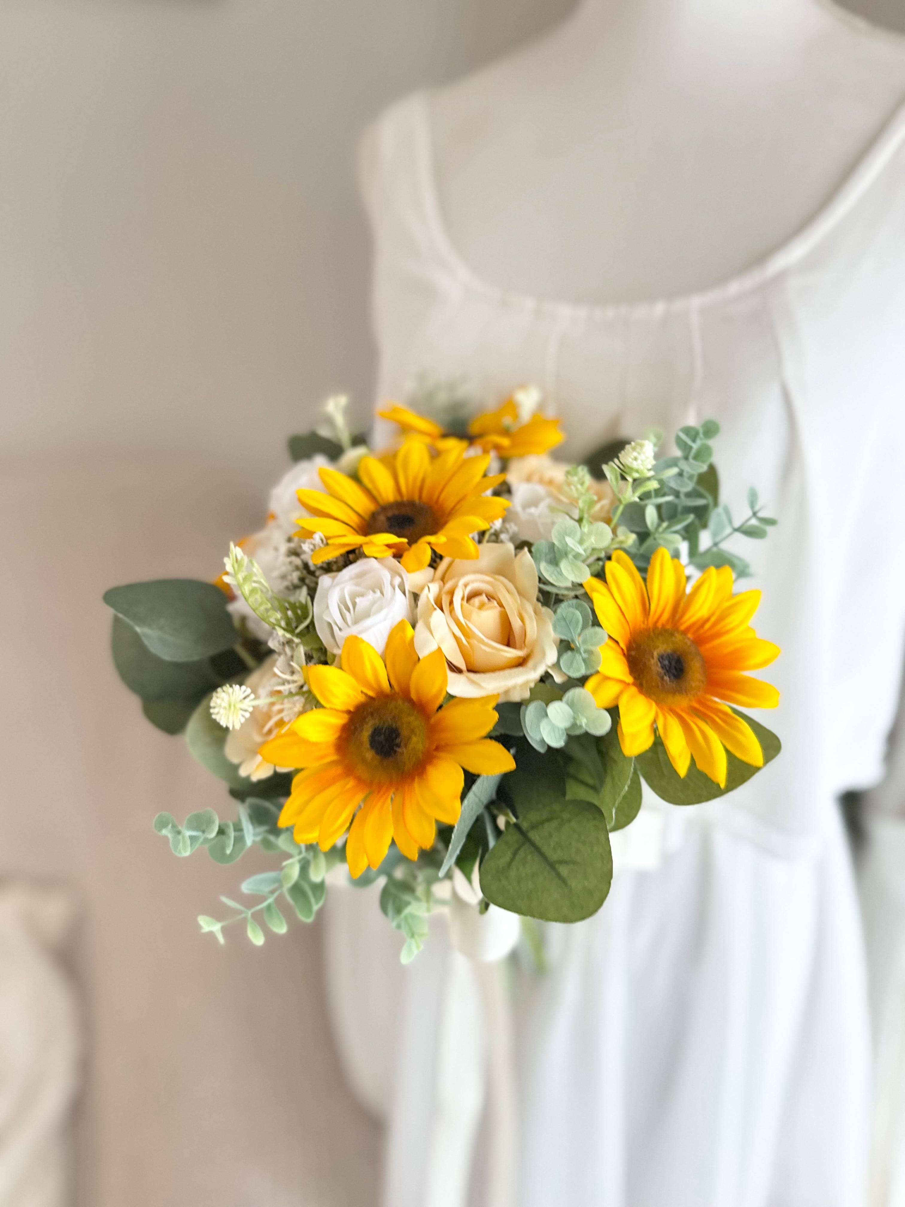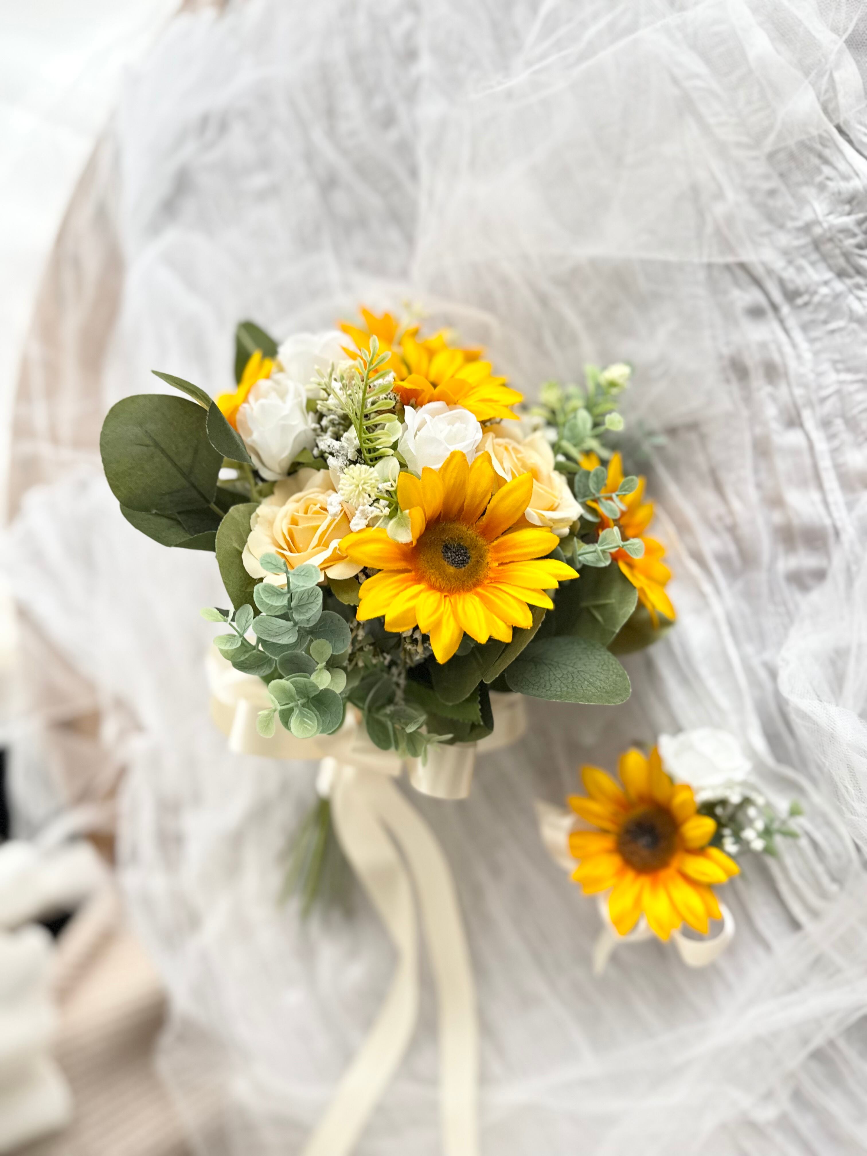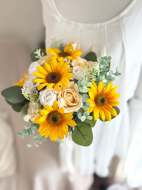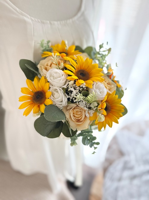 人気のひまわりと清楚なバラが美しいコントラスト、ウェディングブーケにぴったりのデザイン•*・