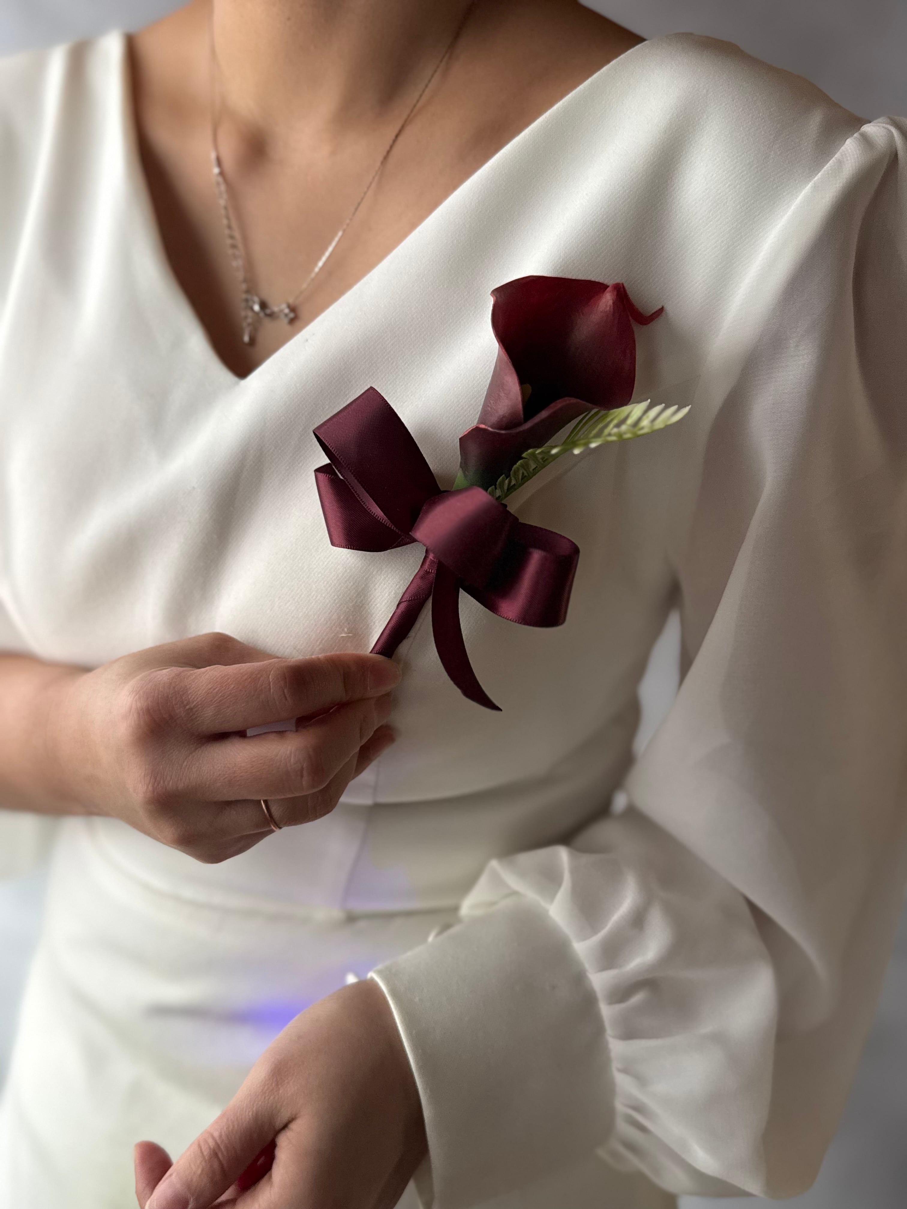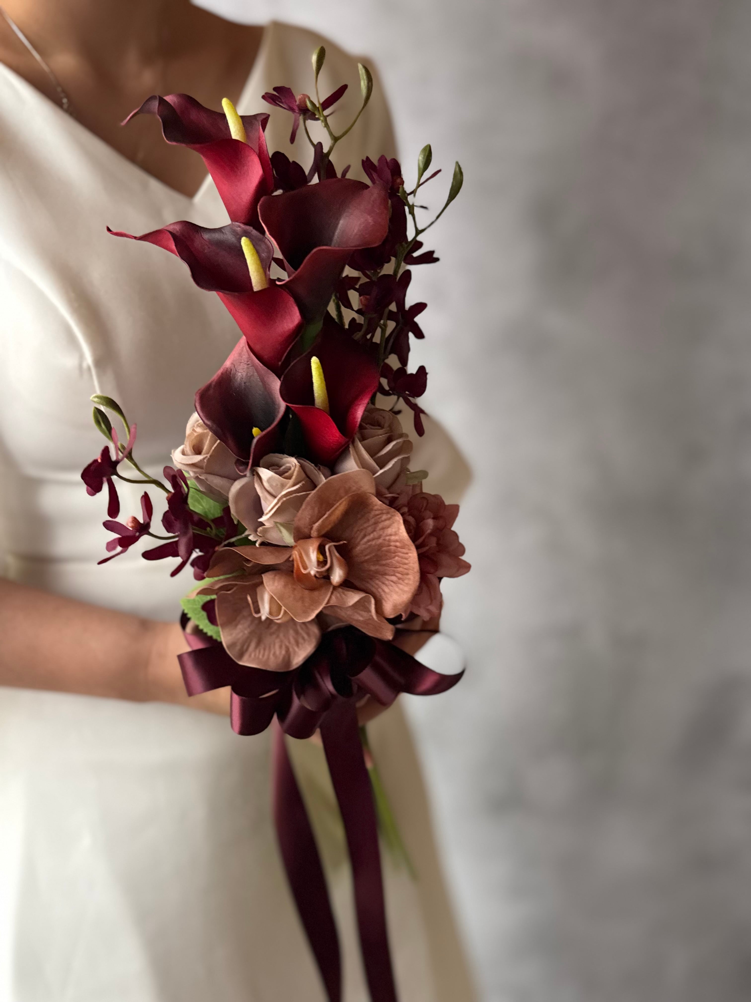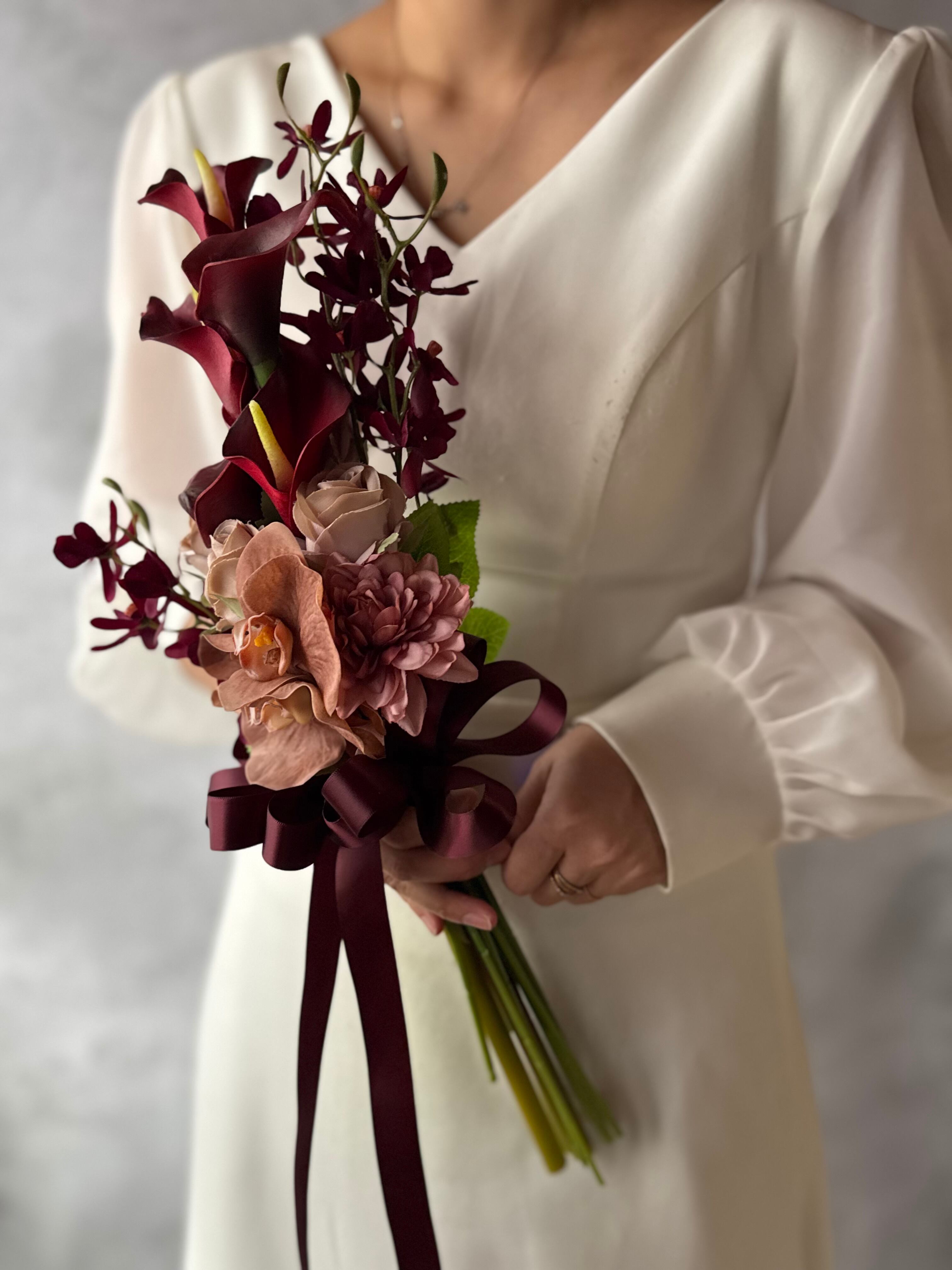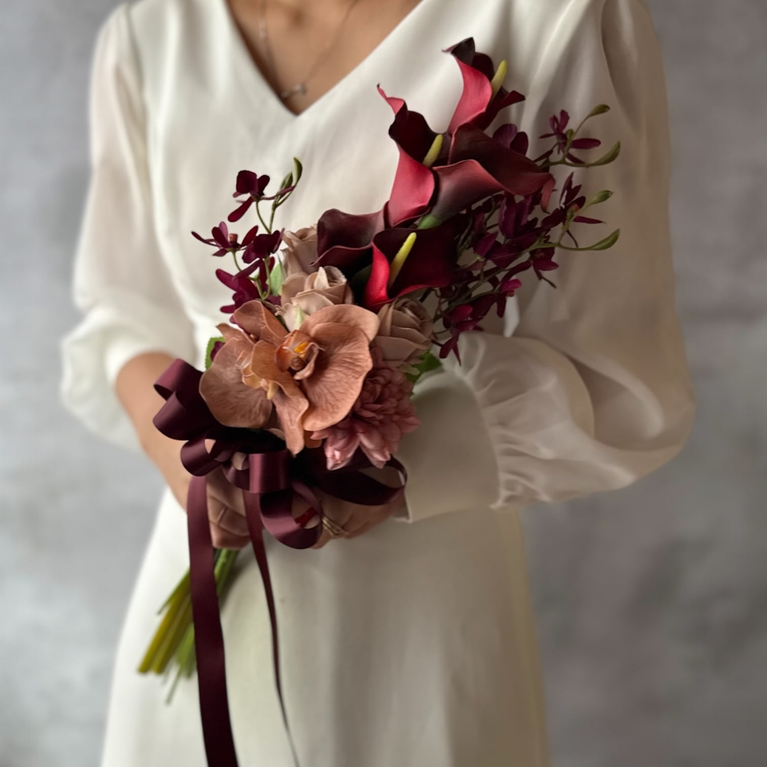 大人カッコいいワインレッドのアームブーケ•*・縦に長くスタイリッシュなアームブーケは上品かつおしゃれな印象に•*・リボン色の変更も可能です•*・