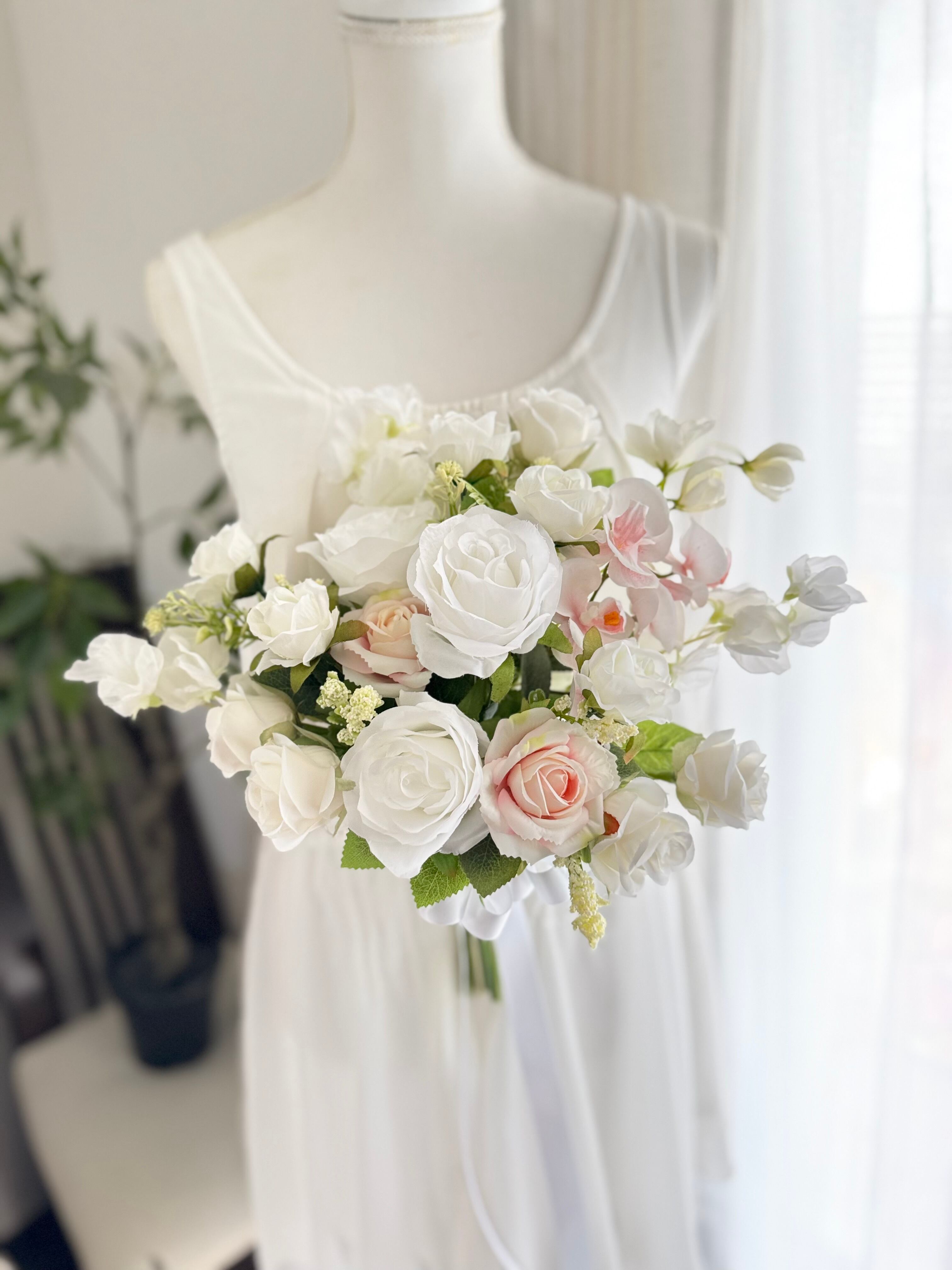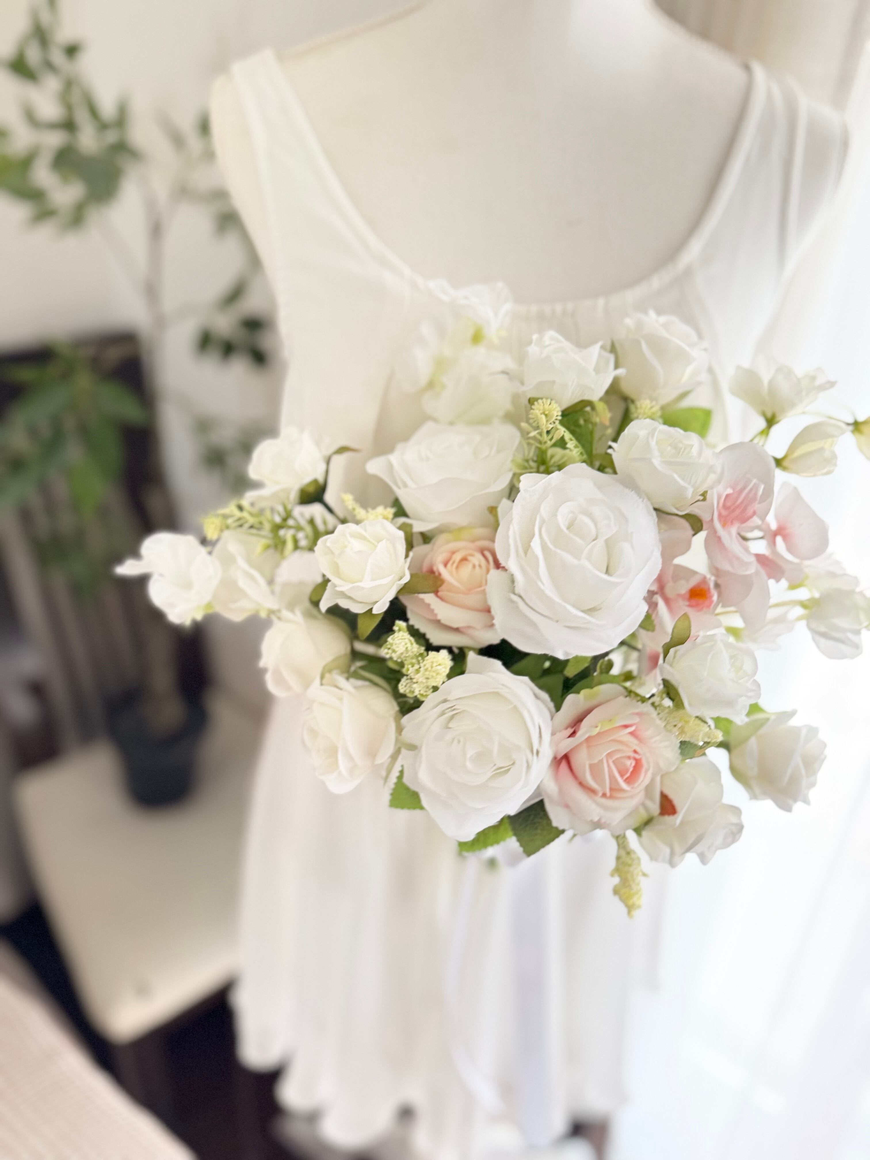 美しい白バラと優雅なピンクの組み合わせが、特別な日に華やかさをプラスしてくれるクラッチブーケです•*・ 存在感がありながら、柔らかい印象を与えるバランスが魅力的•*・ ♪ 特別な日にぴったりの華やかさと、優雅さを引き立てる大人可愛いデザインです♪